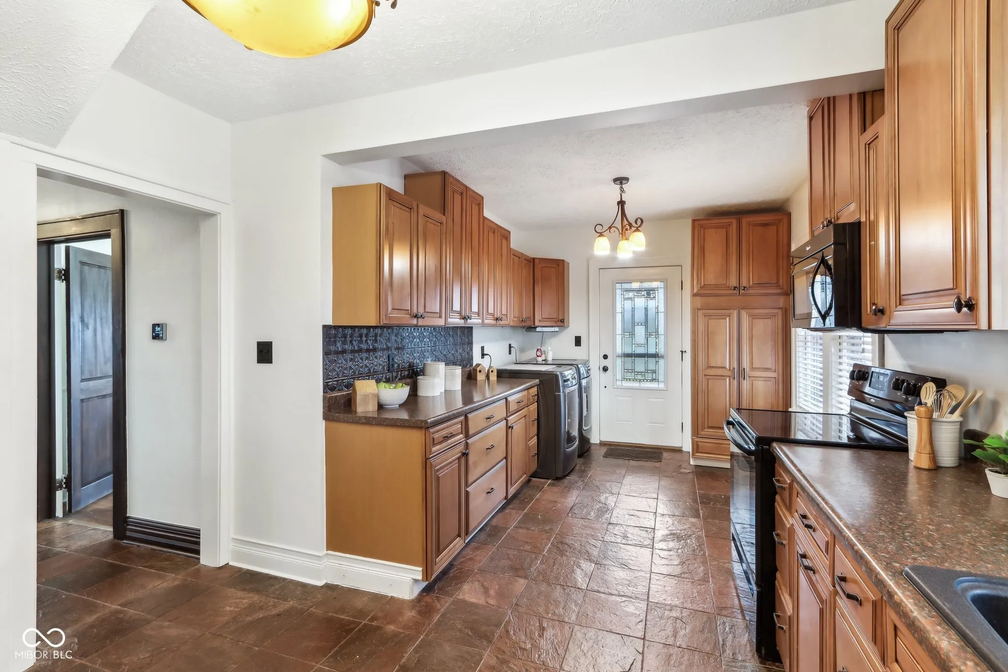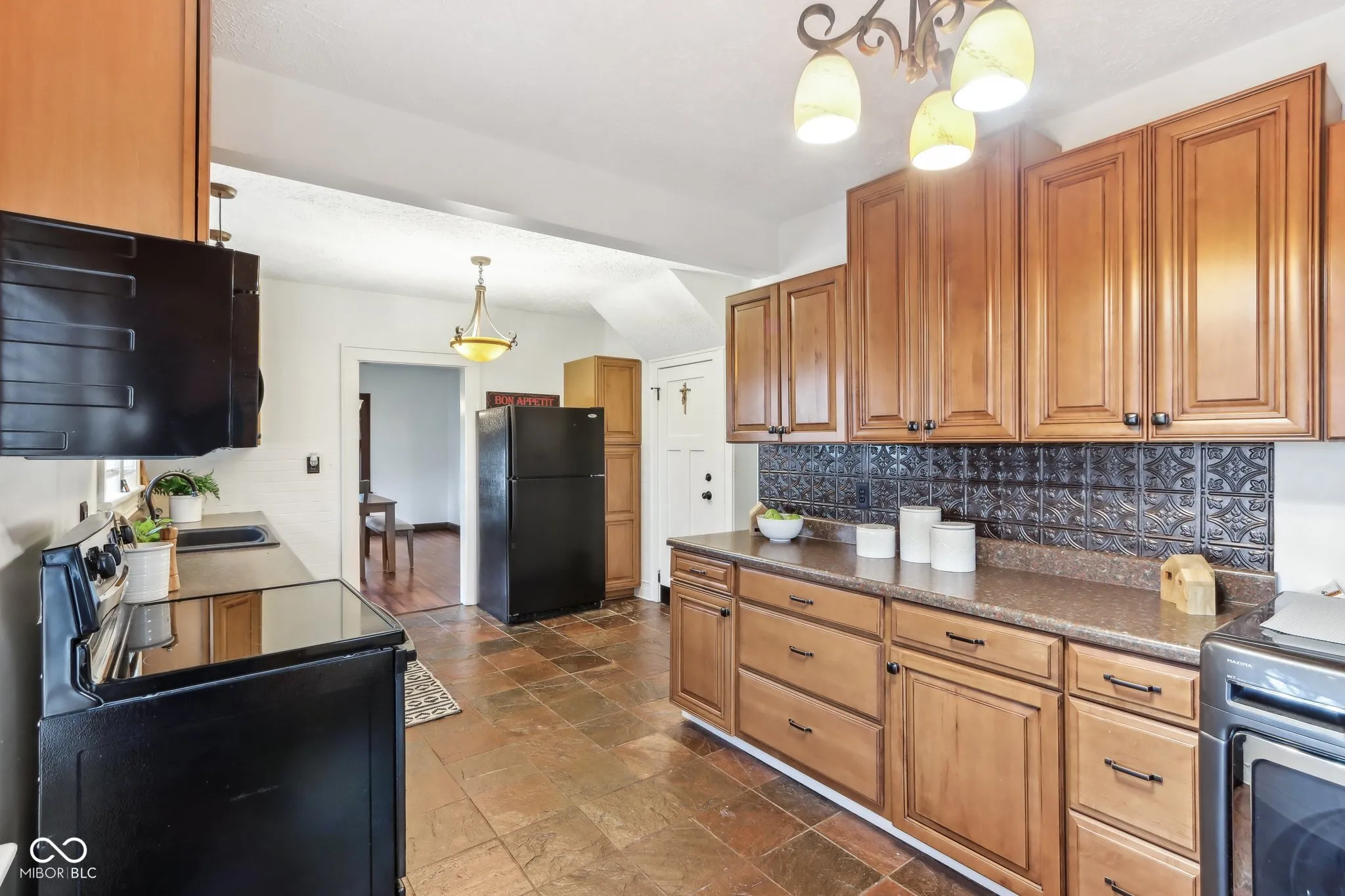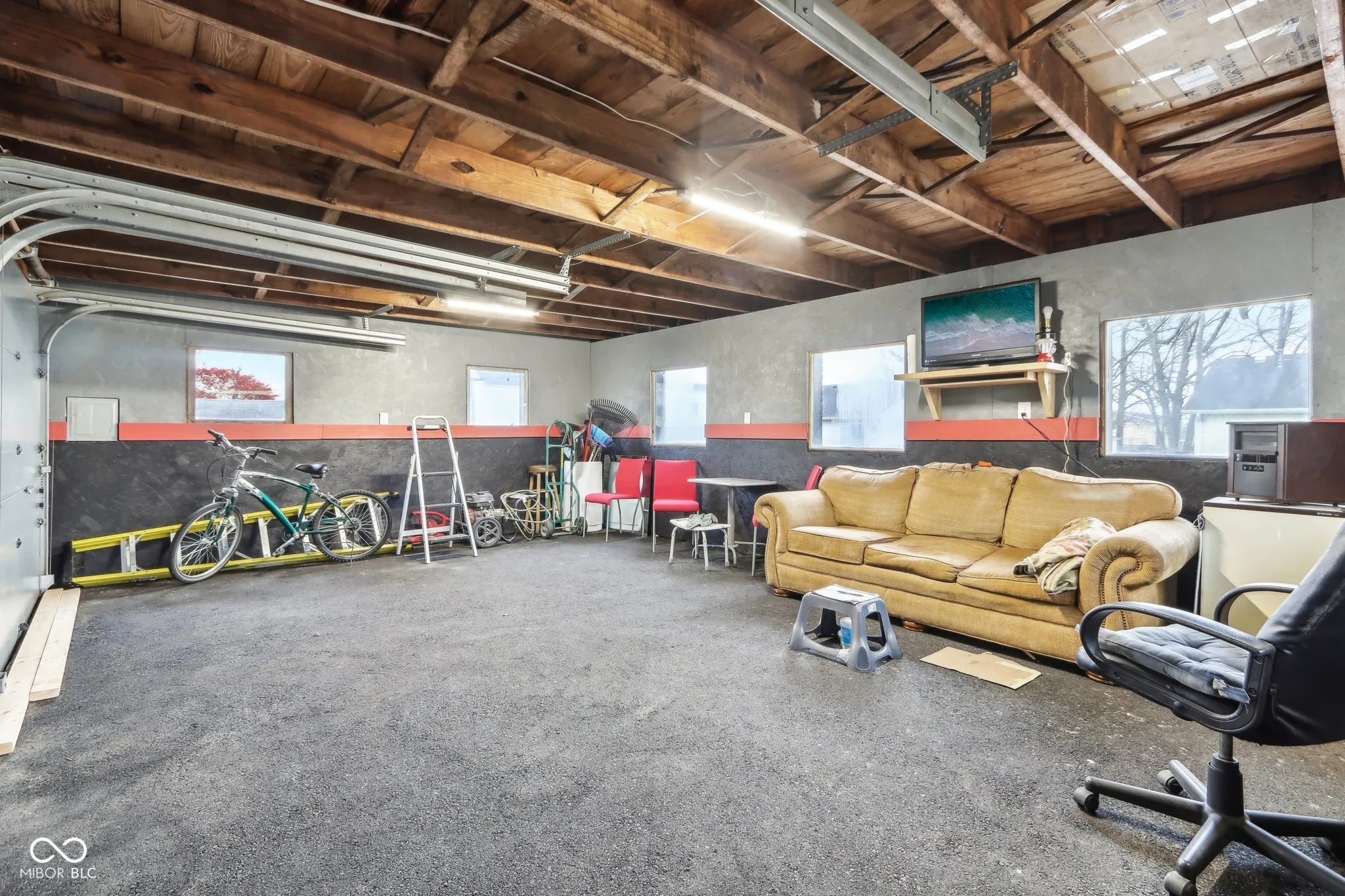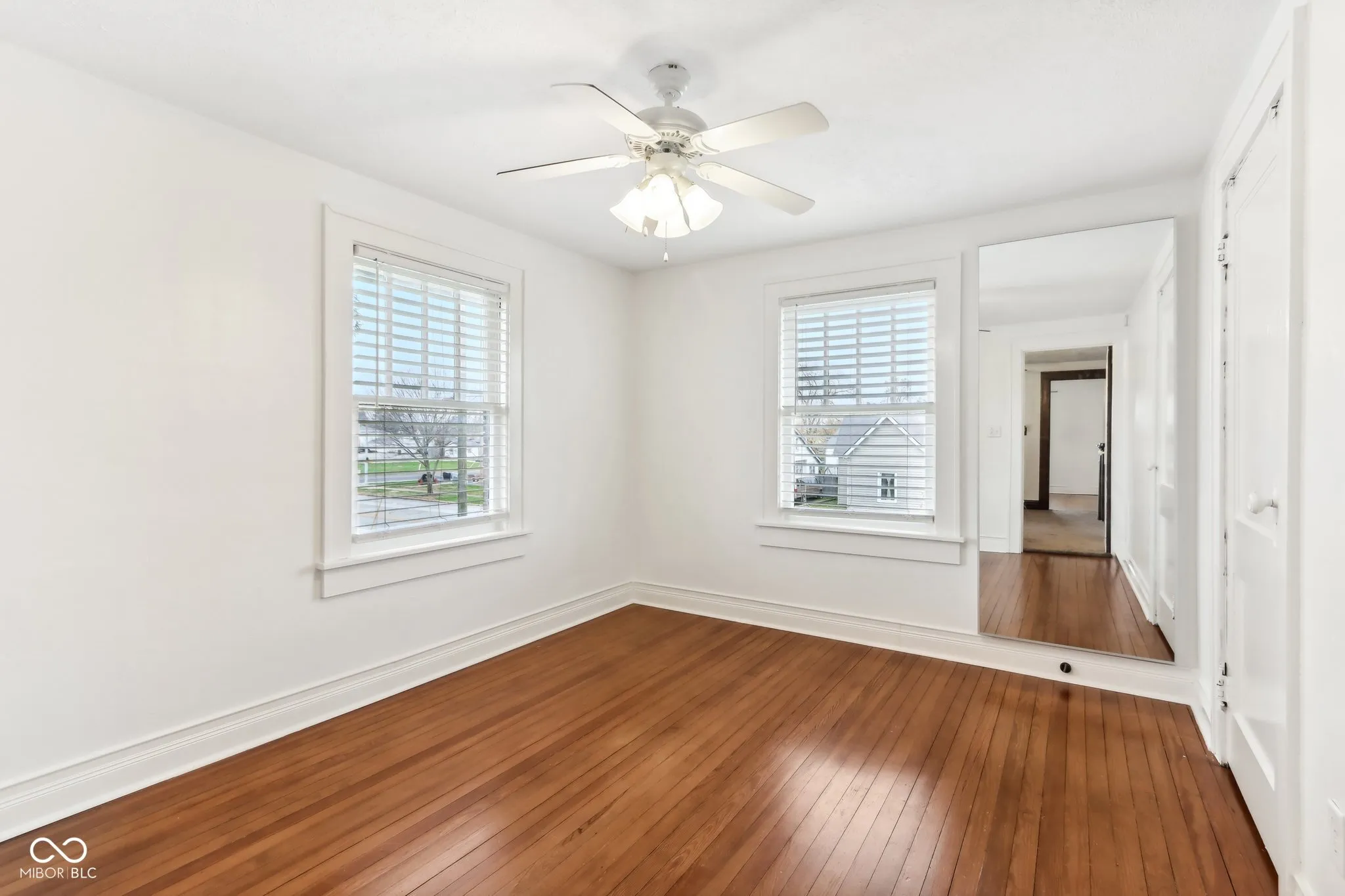 Step into a beautifully updated 1920s home on a half acre lot in the heart of Greenfield, spanning 3,192 square feet with five inviting bedrooms and two bathrooms. The full brick exterior, black trim paint and traditional front porch create a warm welcome. Inside, all original doors throughout and original hardwood floors enhance the secondary bedrooms while the kitchen dazzles with staggered cabinets and natural light. Enjoy cozy evenings in the family room beside the electric fireplace. The private backyard features a deck perfect for entertaining under the pergola and a new privacy fence w/ solar lighting. A finished detached two-car garage serves as a versatile man cave/she shed w/ a loft above for storage. Significant updates include: new ductwork, waterproofed basement with extra washer/dryer hookups, 200 amp electrical service, HVAC 2 years old, new daylight windows. This home elegantly combines charm with practicality and sits on an amazing lot in a great location. Zoned residential can go commercial. Have a work/live space right on Main St! Perfect for a store front office, lawyer, medical, or most small businesses. Schools just blocks away, short walk to downtown with access to the city bike trails.