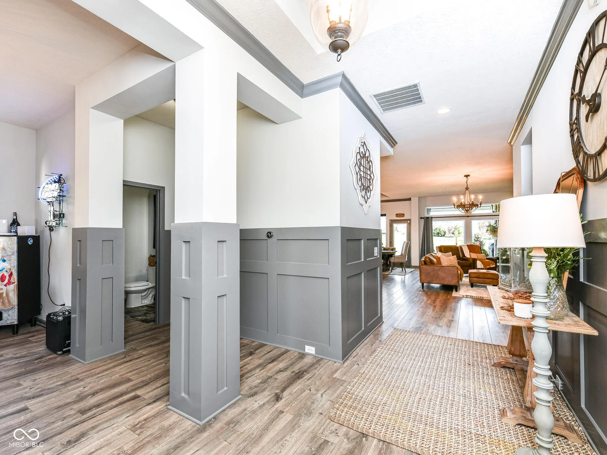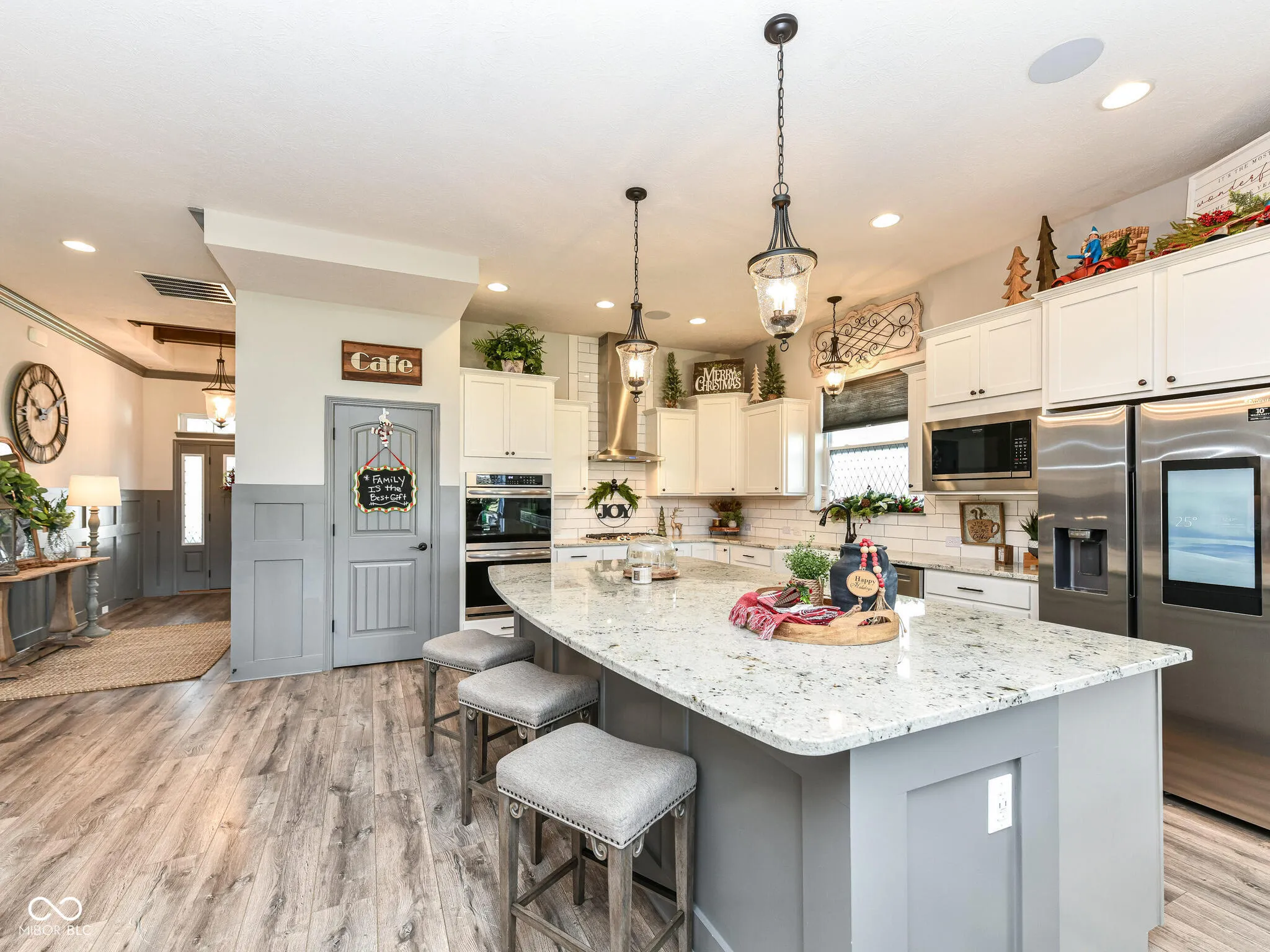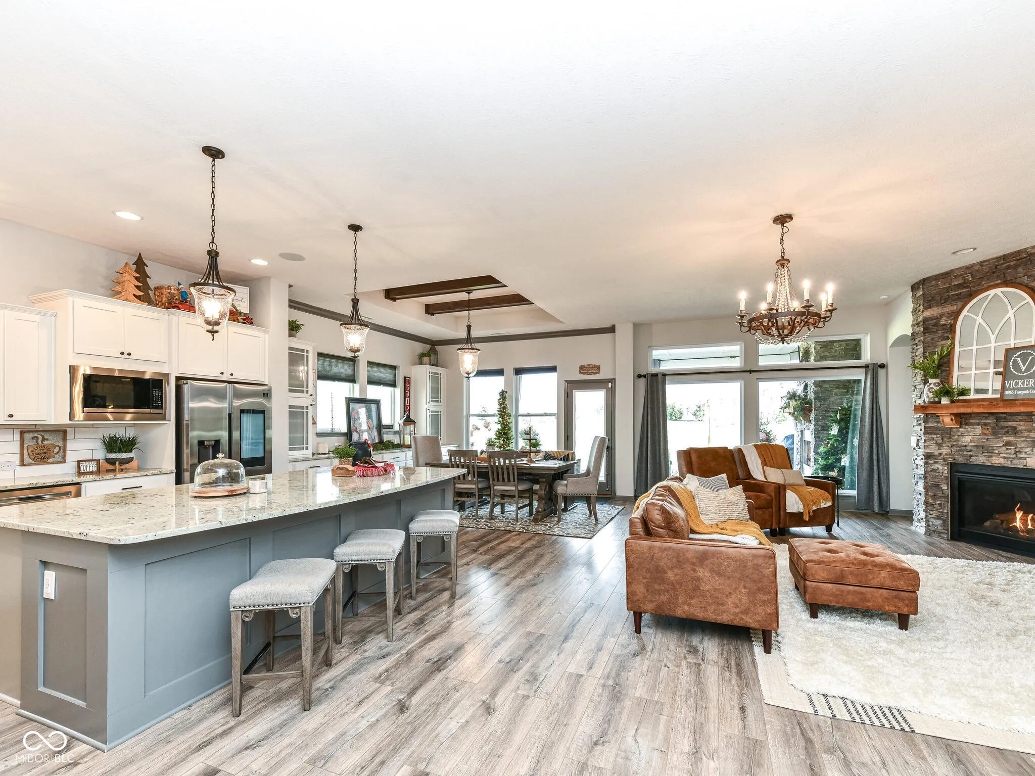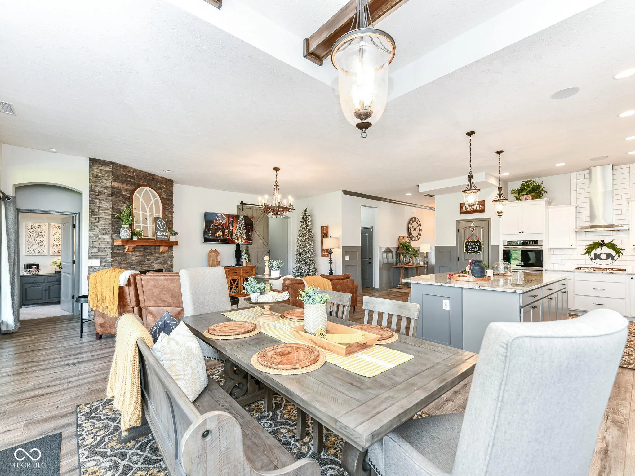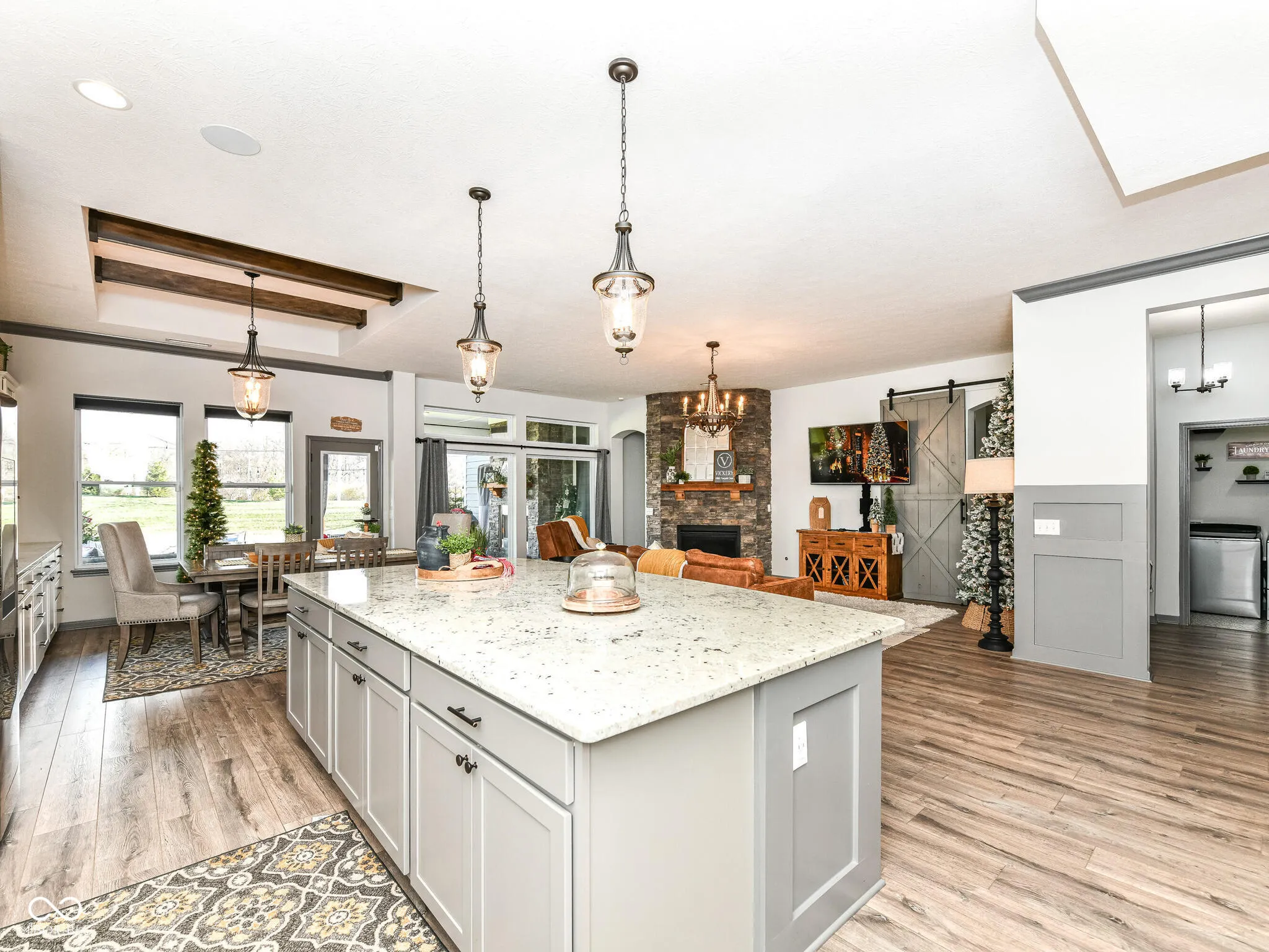 This 4-bedrm, 3.5 bath home is a hidden gem located in highly sought after Flat Fork neighborhood. The open concept, high ceilings, beams, beautiful LVP throughout the main living areas and spacious master bedroom with its luxurious ensuite bathrm are definitely standout features. The kitchen with floor to ceiling cabinets, double ovens, 4-burner gas stove, and farmhouse sink is a dream for anyone who loves cooking and entertaining. The dining room offers a beautiful custom built-in buffet for family gatherings, plenty of room for a spacious dining table. The retreat nestled between 2nd and 3rd bedrooms offers a great space for relaxing with a book or family movie night. The spacious covered patio/backyard living space w/a fireplace provides an inviting spot for entertaining friends and family. Imagine how cozy and enjoyable winter movie nights would be. (gas grilled included, natural gas line connected) It’s impressive how the open concept design and floor-to-ceiling fireplace in the family room add to the charm and warmth of the home. Overall, it a perfect blend of comfort, style, and functionality. Surround sound outside, kitchen, retreat & 4th bedrooms add to the ambiance of the home. Wainscotting, updated lighting, custom doors and so many more added details make this “HOME” anyone’s DREAM home. Bring your family home today. Neighborhood pool. Hamiliton Southeastern Schools. Annexed into Fishers