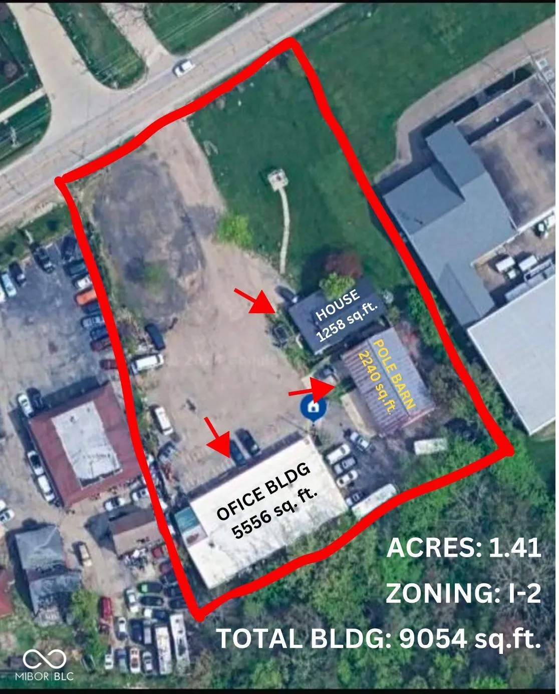 * MULTI TENANT INVESTMENT: *GREAT 1.41 acres, I-2 Zoned Property *Fenced in storage lot on site; flexible Multi tenant arrangements *Large lot with plentiful parking *Property includes One office units of 5556 sq. ft. with 4 individual suites, *2240 sq. ft. Pole barn, and * One 1258 sq. ft. House . Currently 3 office suites are leased for $3000/ mo. and house and pole barn just got vacant with the potential of $3500/ mo. rental income, total potential income $6500 to $7500/ mo.