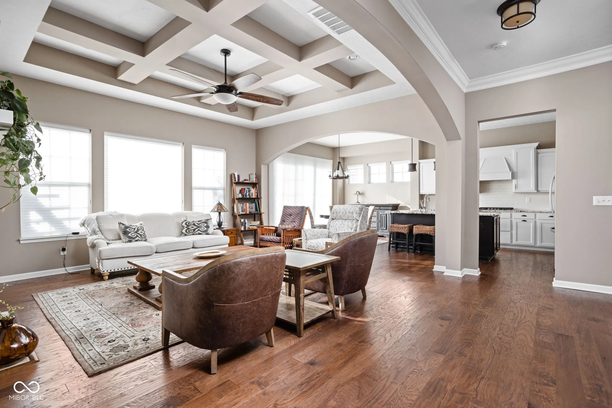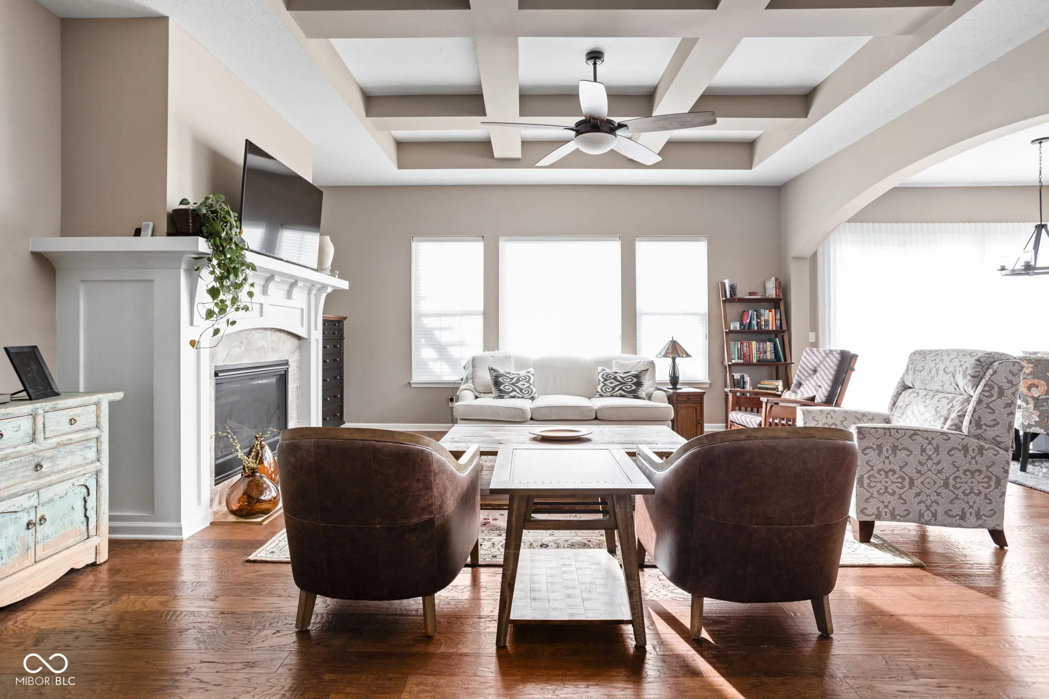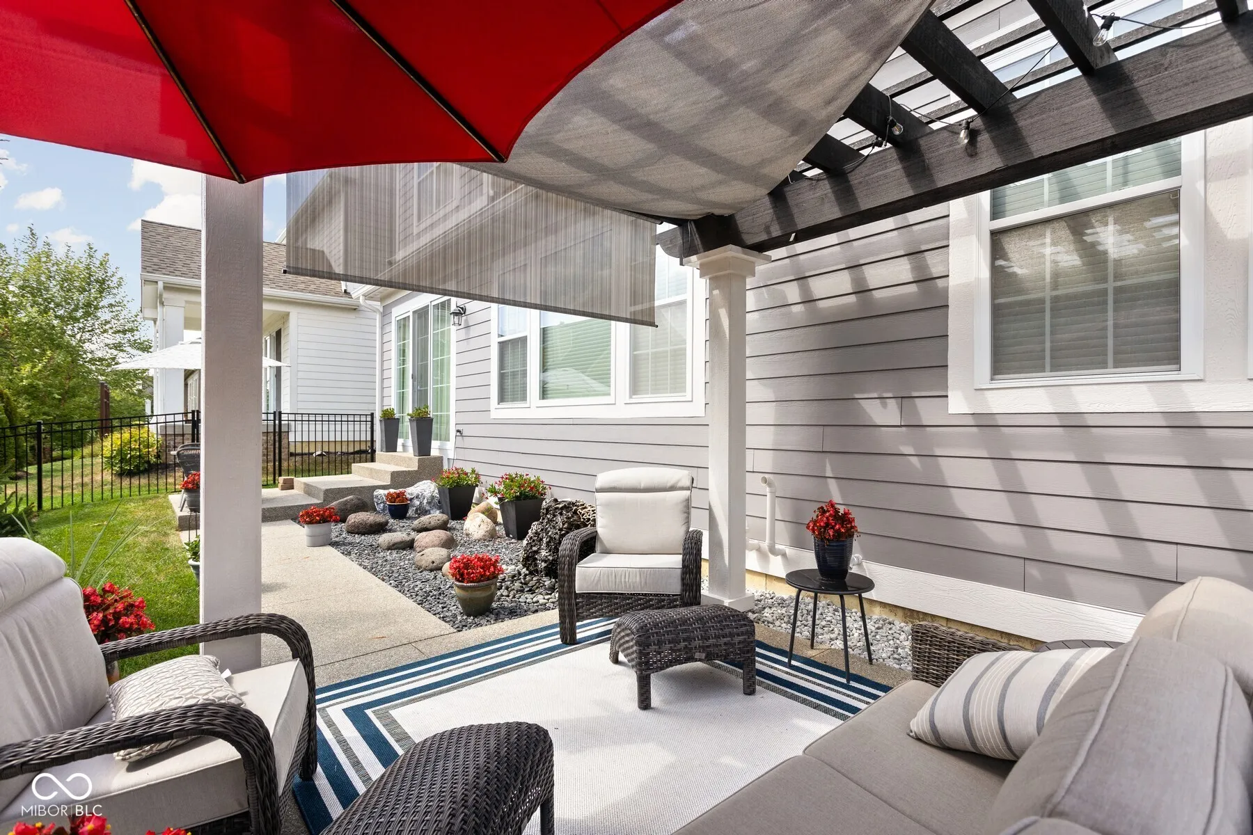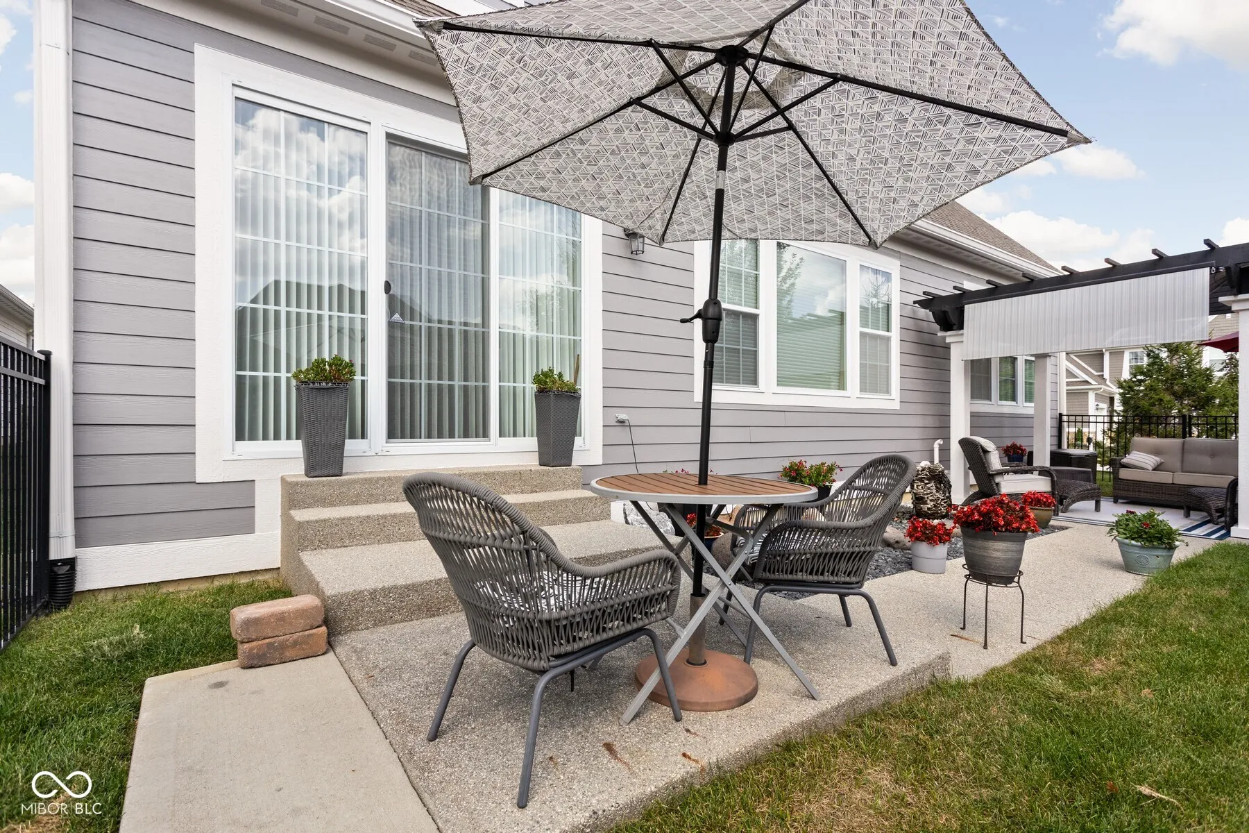 Located in the sought-after Harmony community and situated on a corner lot, this Estridge home was designed for main-floor living. The open floor plan is bright and welcoming, enhanced by large windows, coffered ceilings, a cozy fireplace, and hardwood flooring. The kitchen features crisp white cabinets, granite counters, and stainless steel appliances. A large center island is perfect for prepping your culinary creations or gatherings. The main level primary bedroom is spacious and features tray ceilings. The primary ensuite includes a separate shower and soaking tub. The impressive custom walk-in closet provides plenty of storage and organization. Upstairs, two additional bedrooms offer comfortable accommodations for family or guests. A highlight of this property is the finished basement, equipped with a theater screen and equipment, a wet bar, and a full bathroom, perfect for entertainment or relaxation. Outside, the private, fully fenced yard boasts beautiful landscaping, architectural lighting, a pergola, and a tranquil water feature, creating an ideal backdrop for relaxation or entertaining. Residents of Harmony enjoy access to an array of amenities, including the Harmony Club for neighborhood events and activities, walking trails, parks, green spaces, exercise facilities, a pool, racquet courts, and more, offering a peaceful yet active lifestyle. Close to Wood Wind Golf Course, restaurants, and shopping.