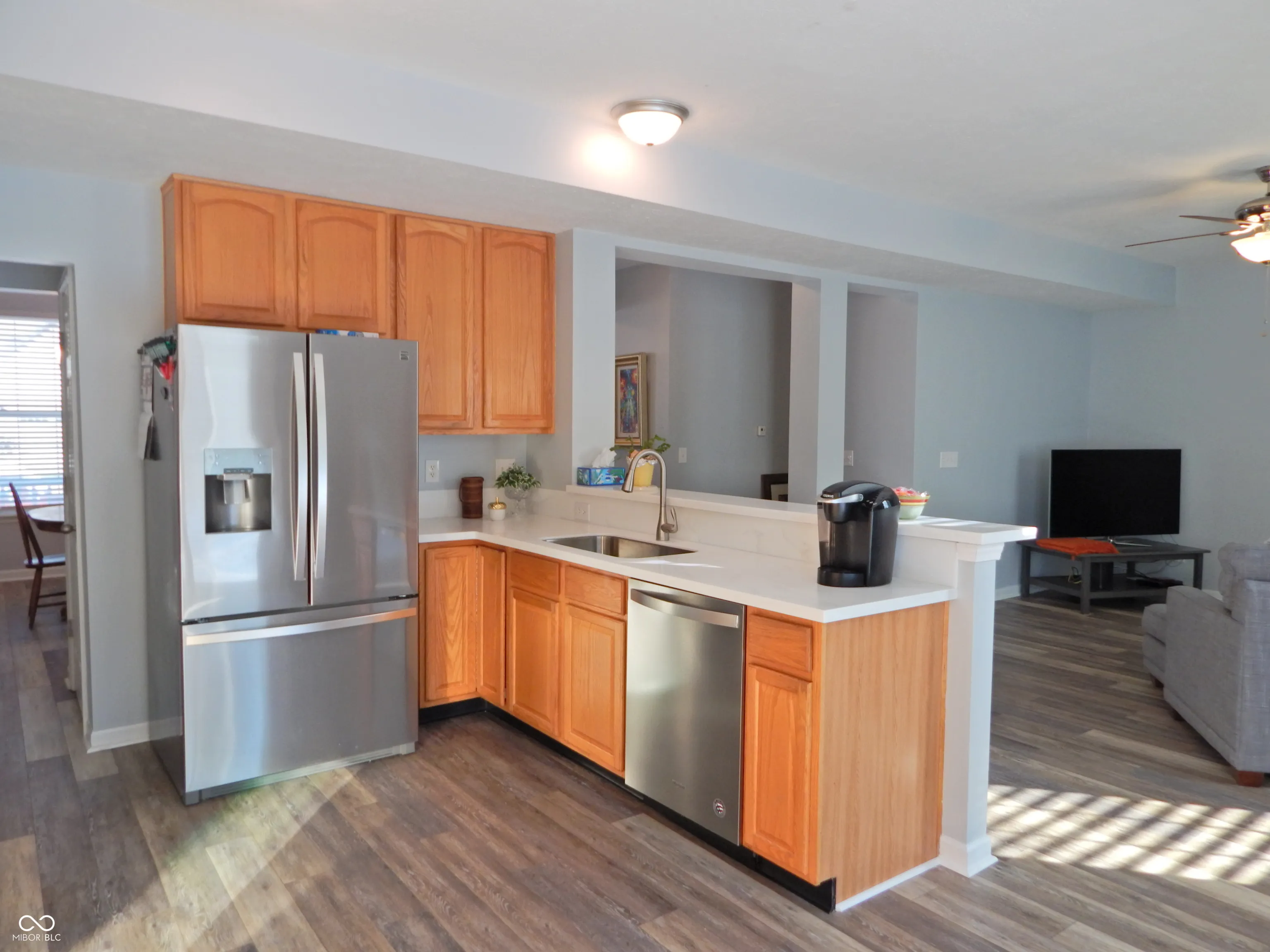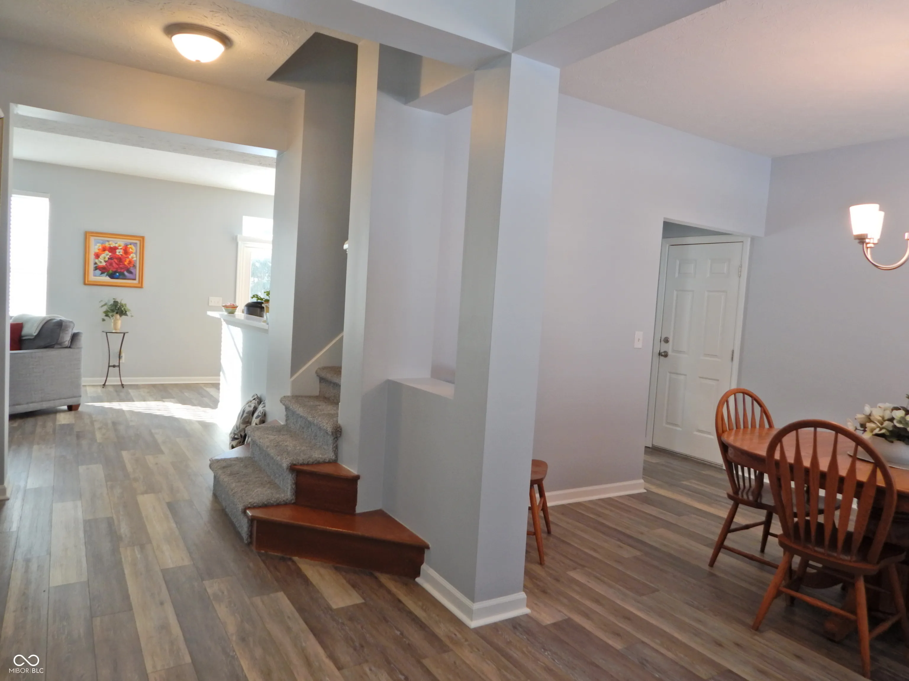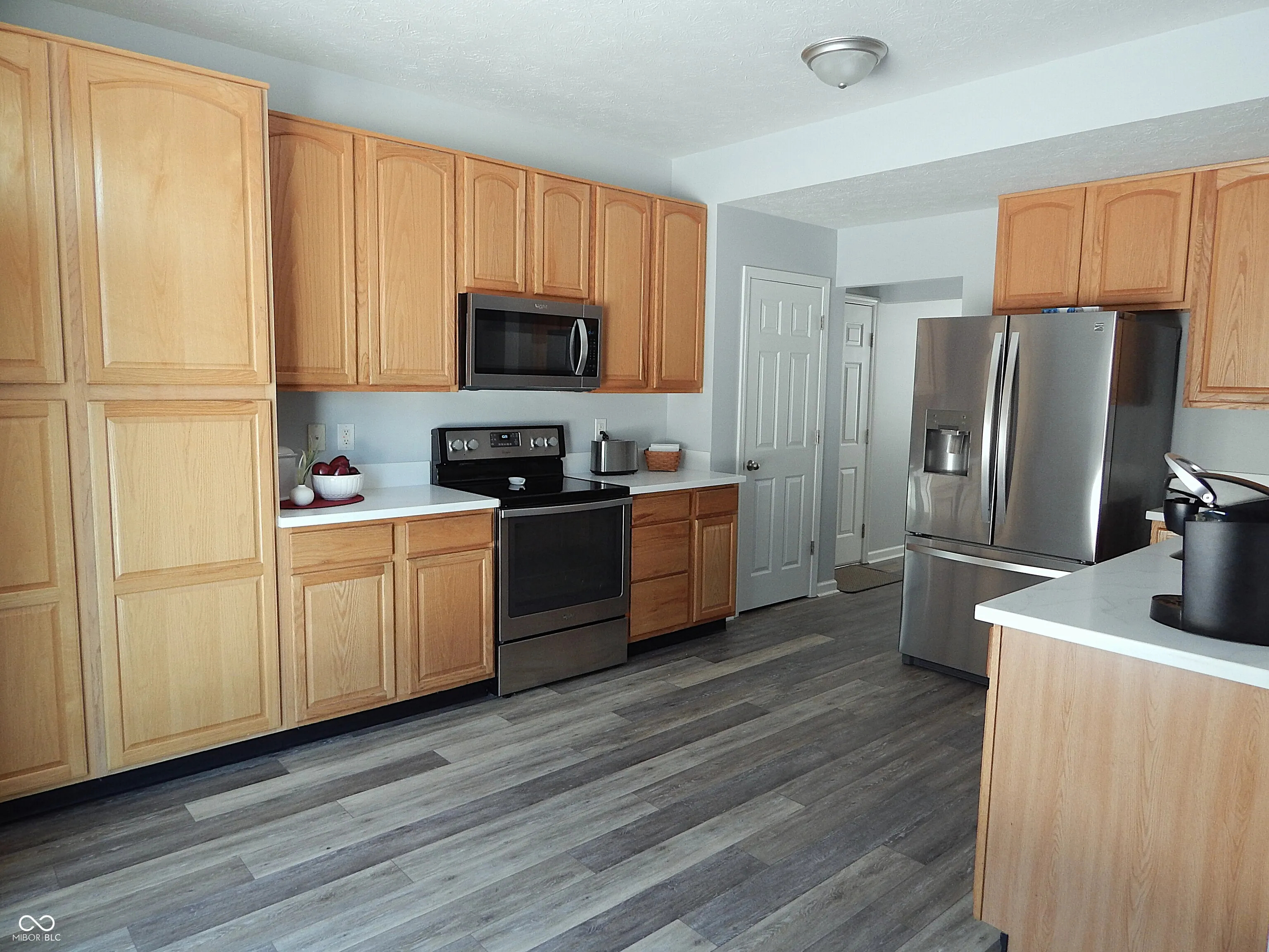 Fresh new look on main floor with newly painted walls and woodwork, luxury vinyl plank, and updated kitchen. New farm style sink, faucet, gorgeous solid surface countertops. Pantry style cabinet added with roll out drawers. Kitchen includes handy trash drawer and 42″ cabinets, pantry closet and open arrangement overlooking the great room. Upper level split bedroom plan with 4 bedrooms features hardwood flooring, central loft with walk in storage closet, and primary bedroom with updated bath and cathedral ceiling. New tiled shower, double vanity and countertop, fixtures, luxury vinyl plank flooring in stylish remodeled bath. Lower level is finished rec room plus storage/utility closet. 12×10 shed is included. The insulated finished garage is divided into 2 car heated space and separate 3rd bay is workshop and storage. HVAC 2020, ROOF 2008. Tree lined backyard and patio. Close to schools and major roads.