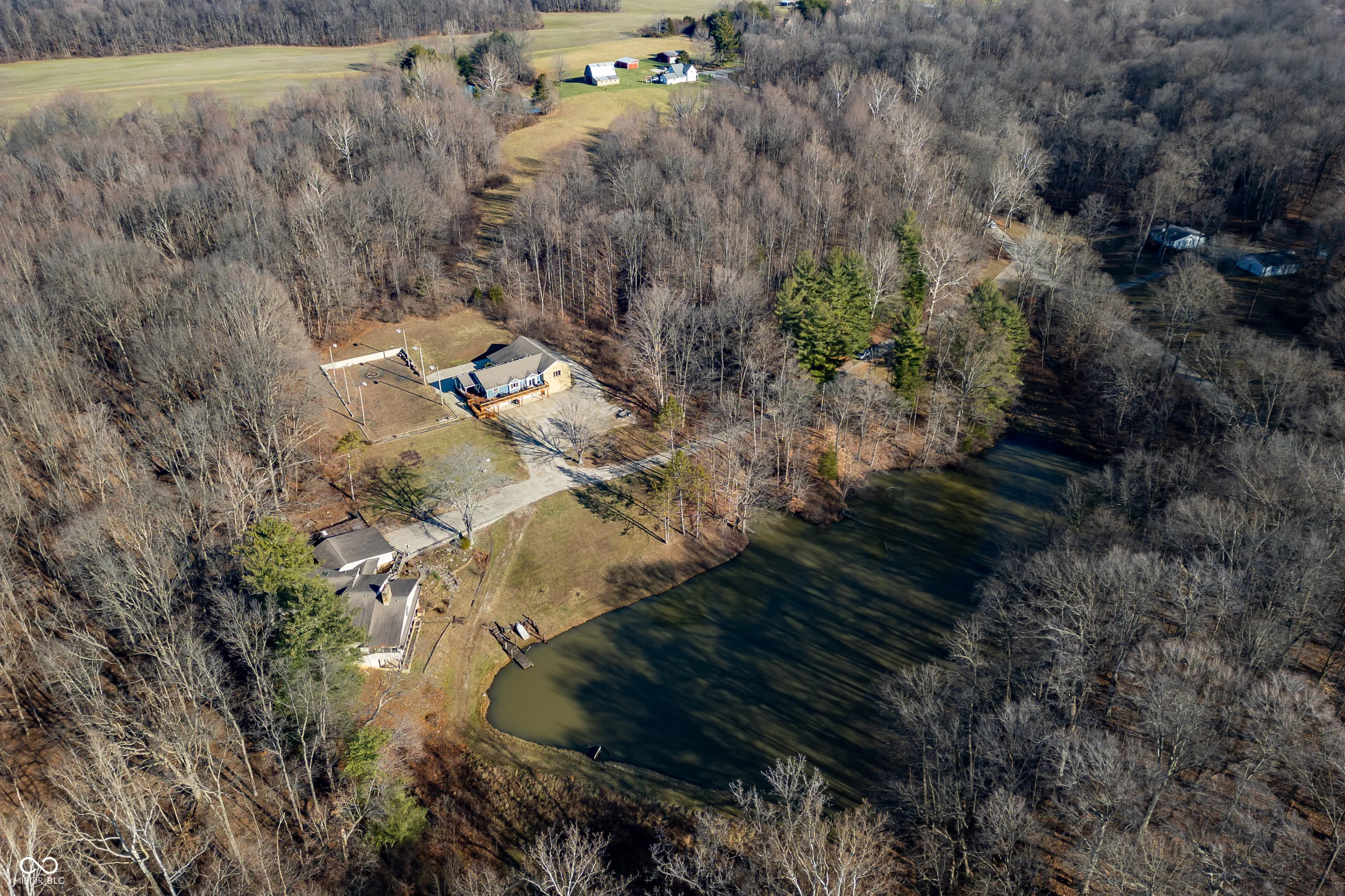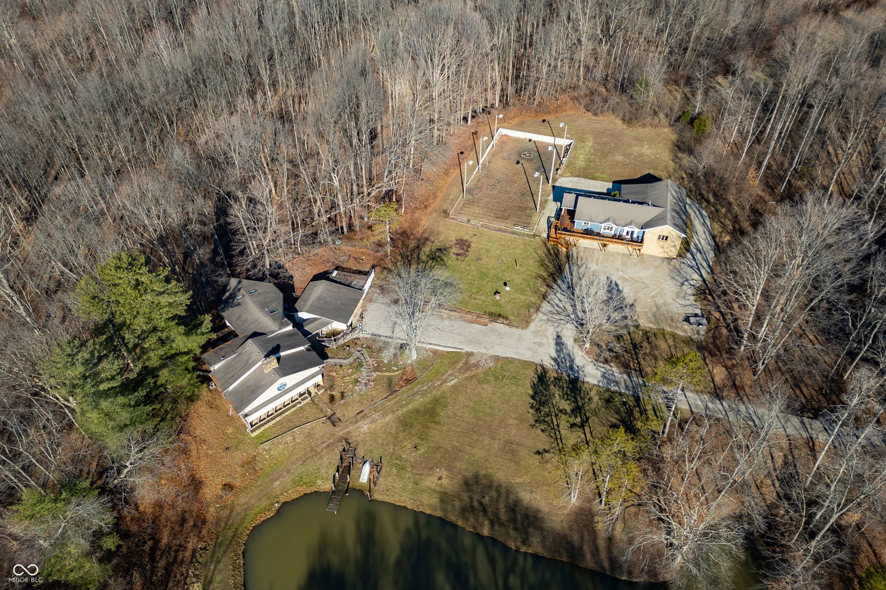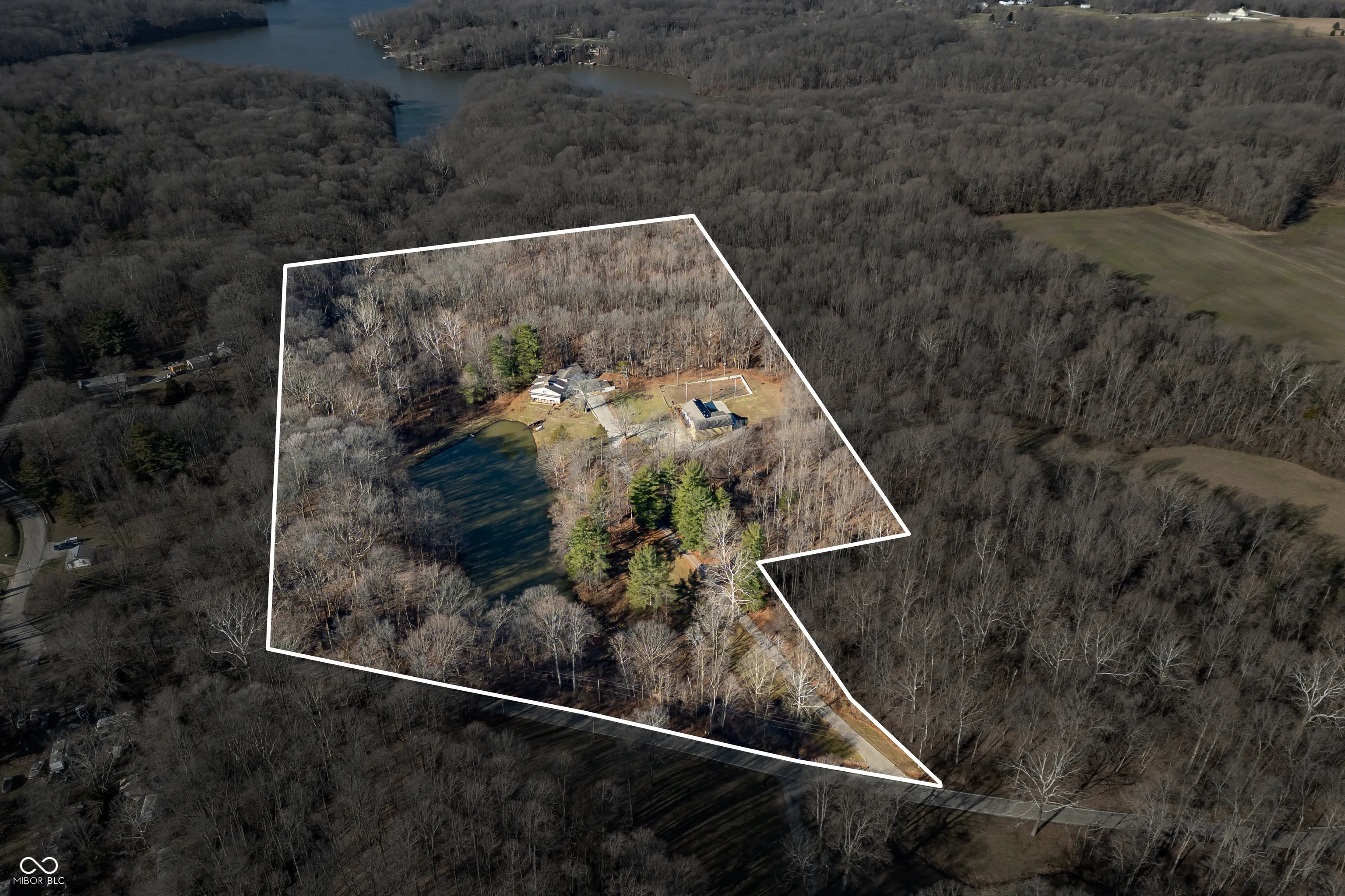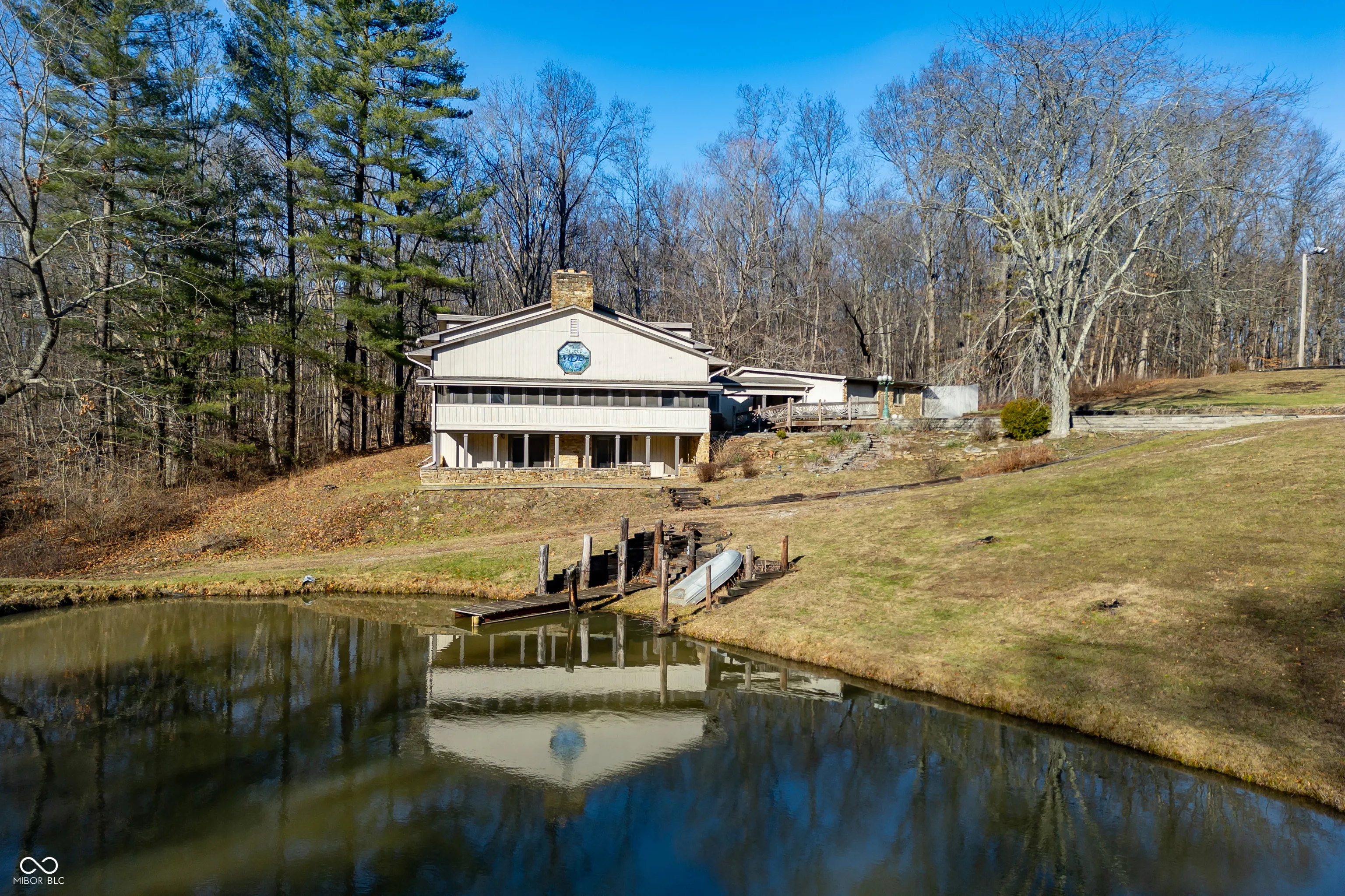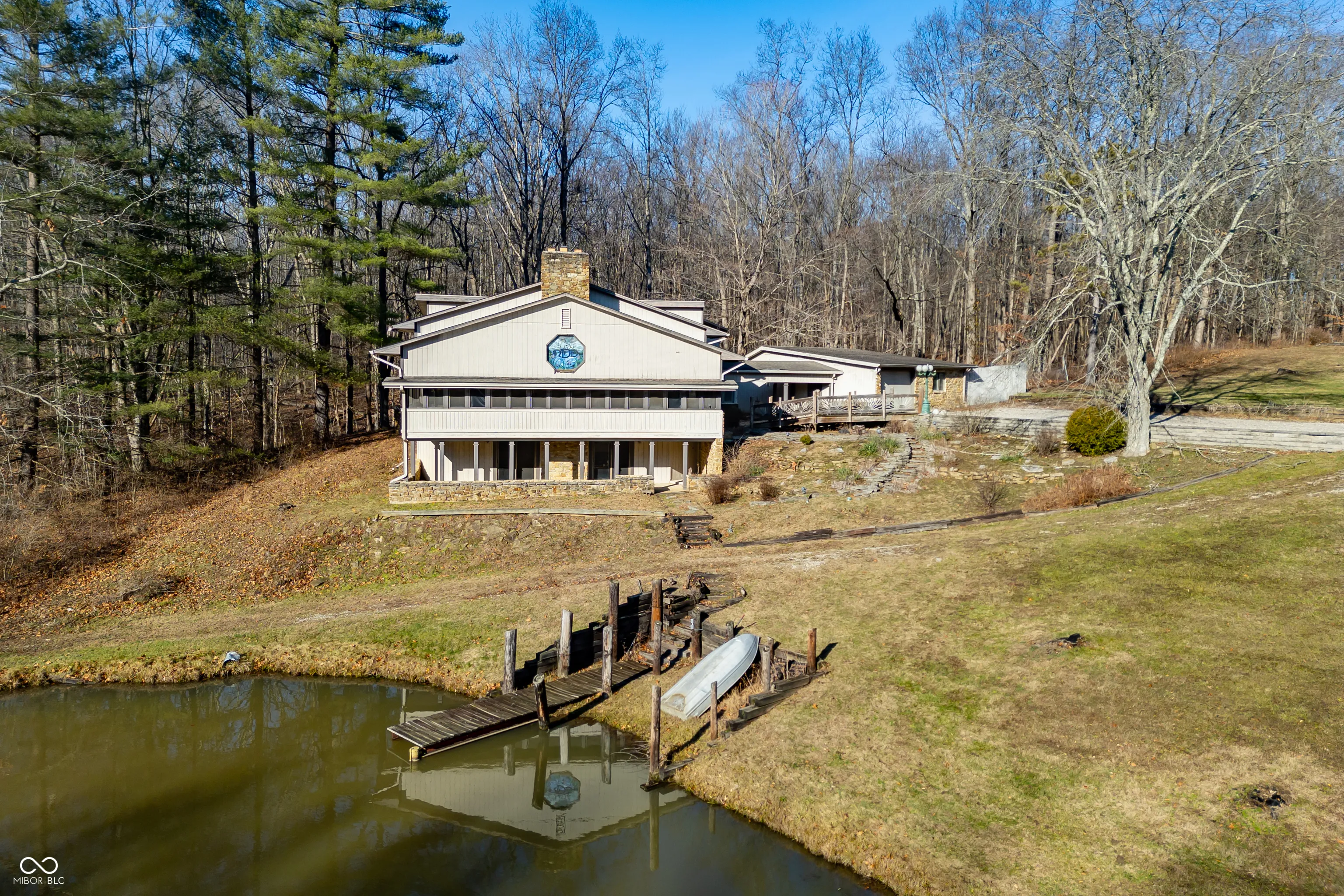 A unique opportunity to own two homes on over sixteen wooded acres. Do you like to entertain? Need in-law or guest quarters? Perhaps an Airbnb on your property? The possibilities are endless. The updated guest house features an indoor basketball, pickleball, or racquetball court. An open-concept great room, kitchen, and dining area are highlighted by an amazing built-in bar. It also includes one bedroom & a new custom bathroom. All of above a four-car attached garage & workshop. Great views of the stocked pond from the wrap-around deck. The main home is over 5,000 square feet with a lodge like feeling featuring vaulted ceilings, wood beams, hardwood flooring, & stone fireplace. The massive master suite includes two full bathrooms, one of which has been completely renovated. Finished walkout basement overlooks the pond and woods. Just waiting on your vision to make this great property your own private retreat.