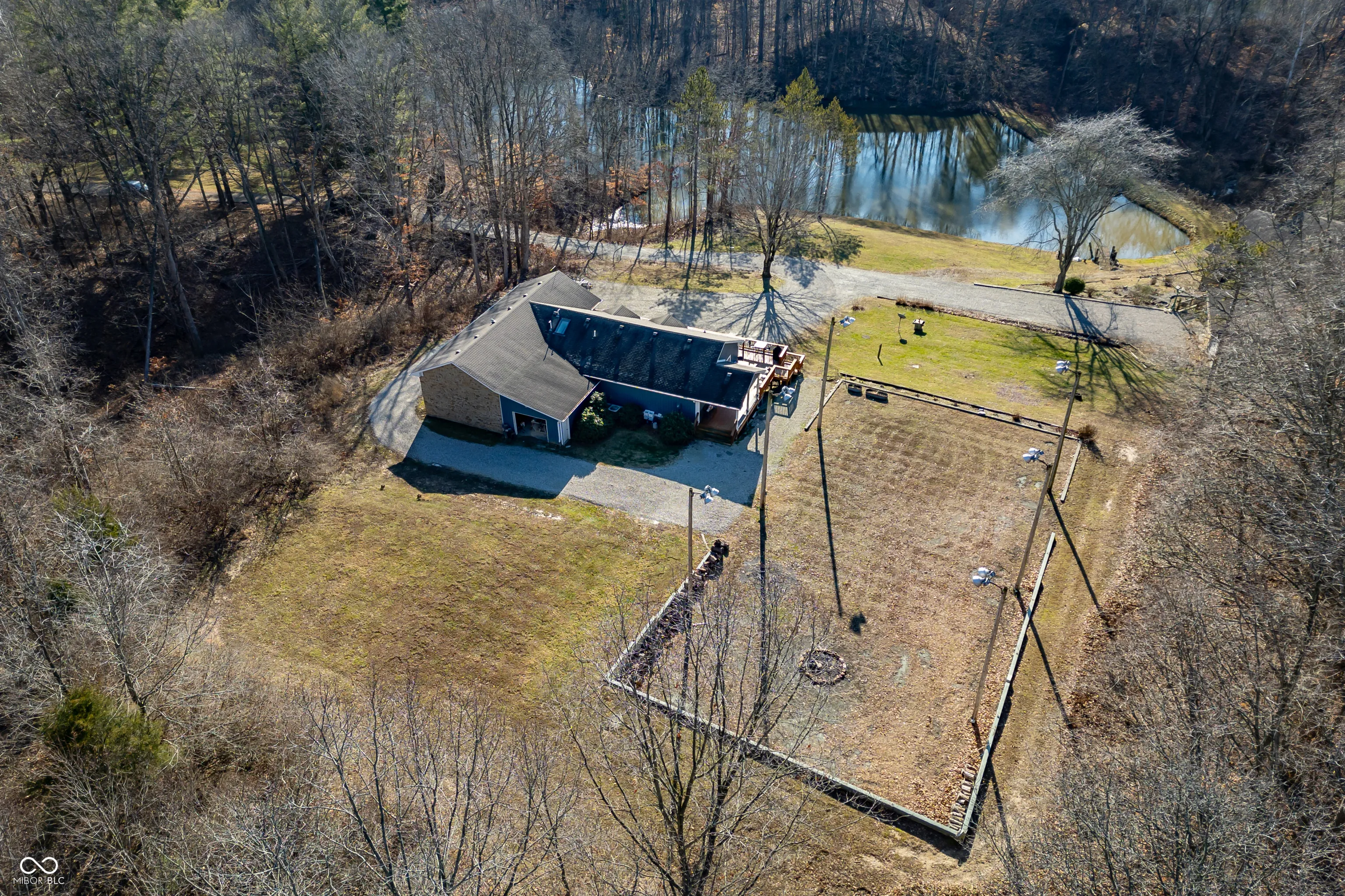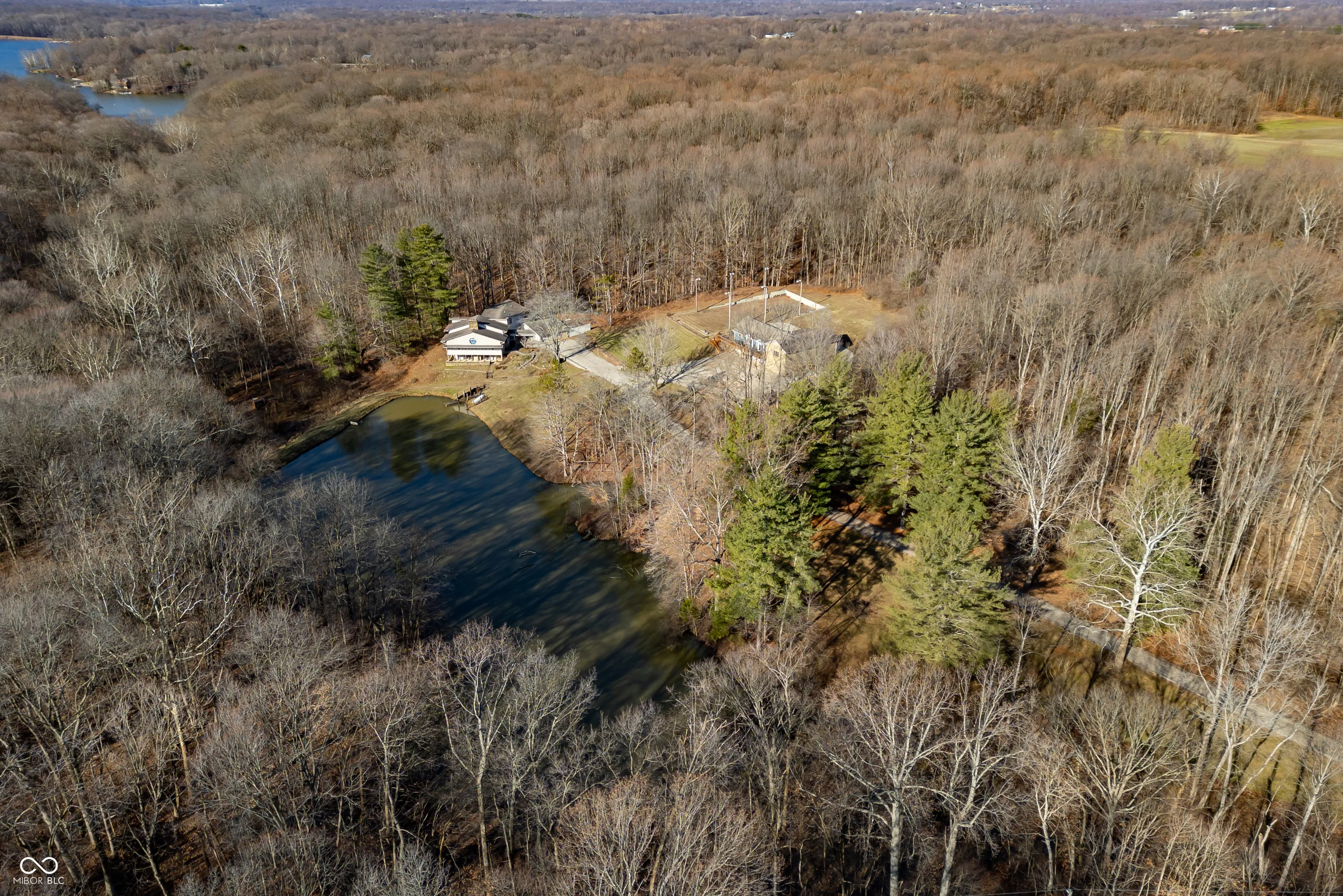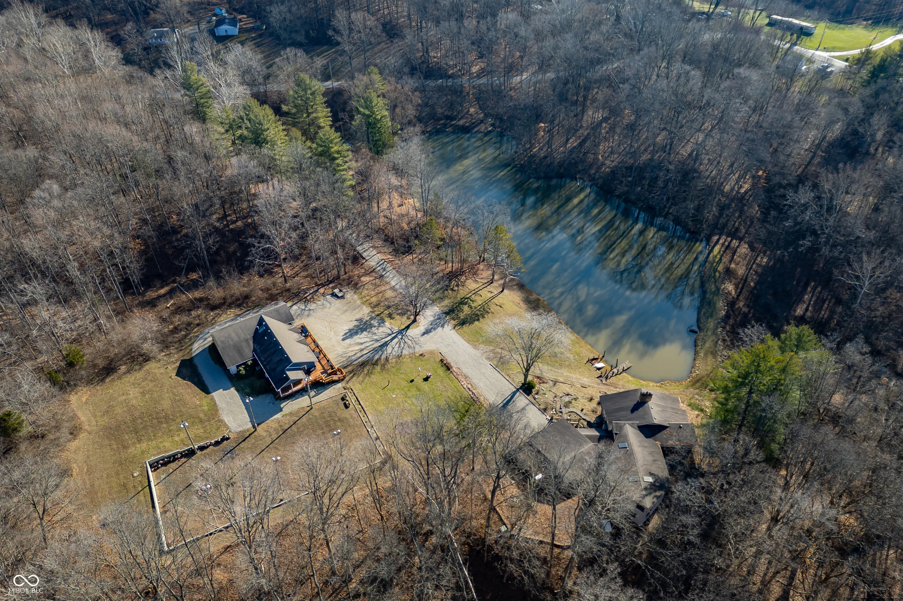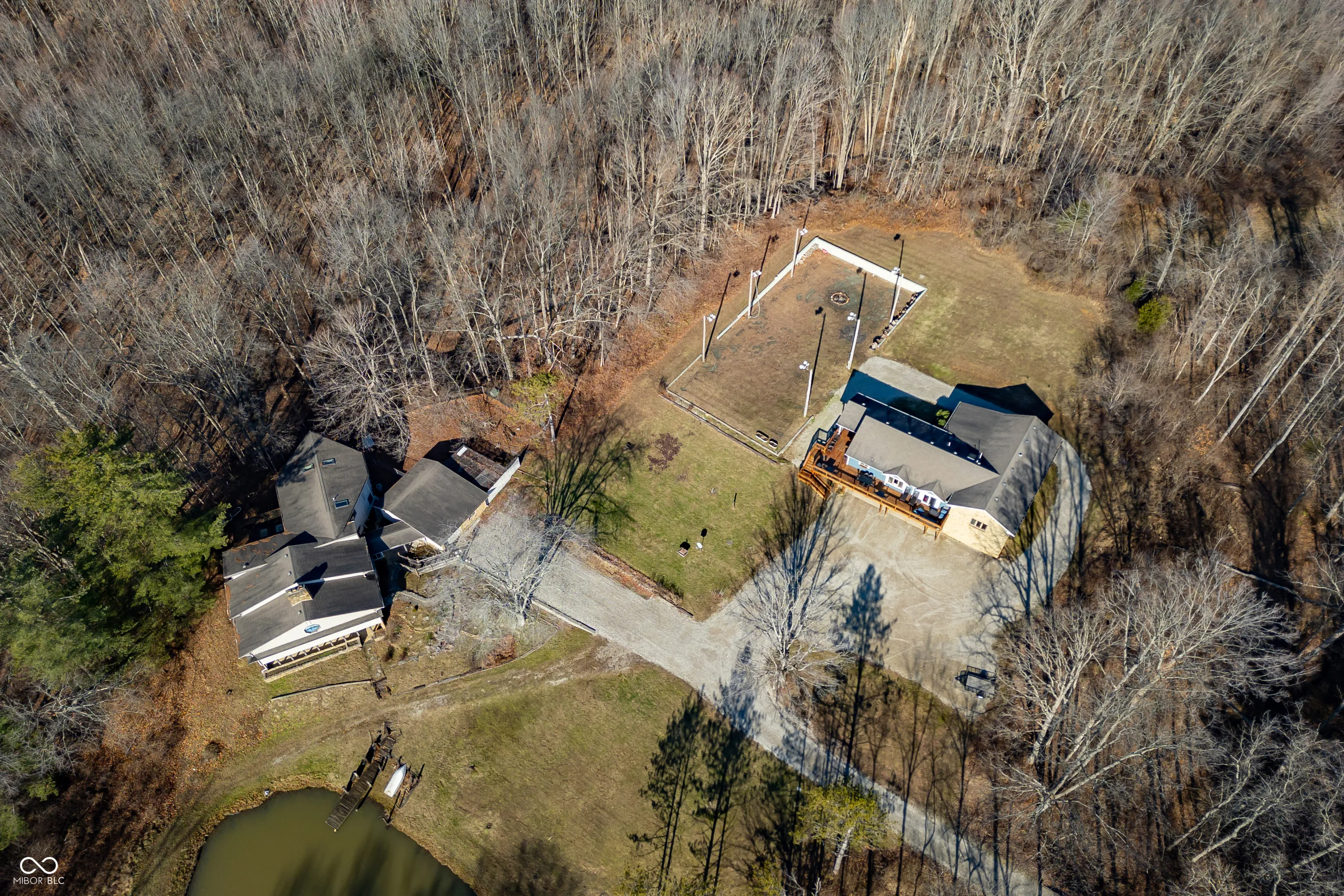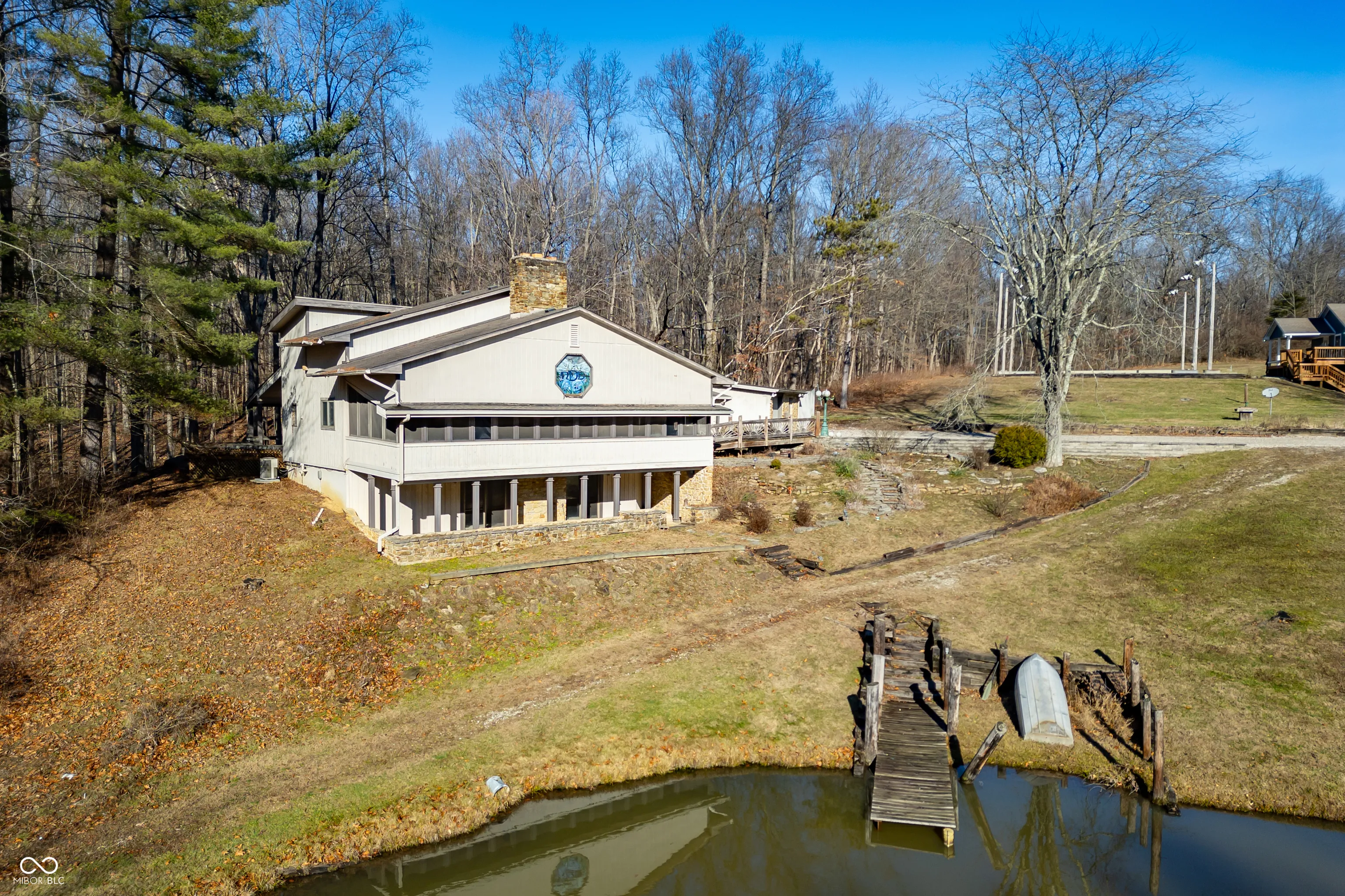 A unique opportunity to own two homes on over sixteen wooded acres. Do you like to entertain? Need in-law or guest quarters? Perhaps an Airbnb on your property? The possibilities are endless. The updated guest house features an indoor basketball, pickleball, or racquetball court. An open-concept great room, kitchen, and dining area are highlighted by an amazing built-in bar. It also includes one bedroom & a new custom bathroom. All of above a four-car attached garage & workshop. Great views of the stocked pond from the wrap-around deck. The main home is over 5,000 square feet with a lodge like feeling featuring vaulted ceilings, wood beams, hardwood flooring, & stone fireplace. The massive master suite includes two full bathrooms, one of which has been completely renovated. Finished walkout basement overlooks the pond and woods. Just waiting on your vision to make this great property your own private retreat.