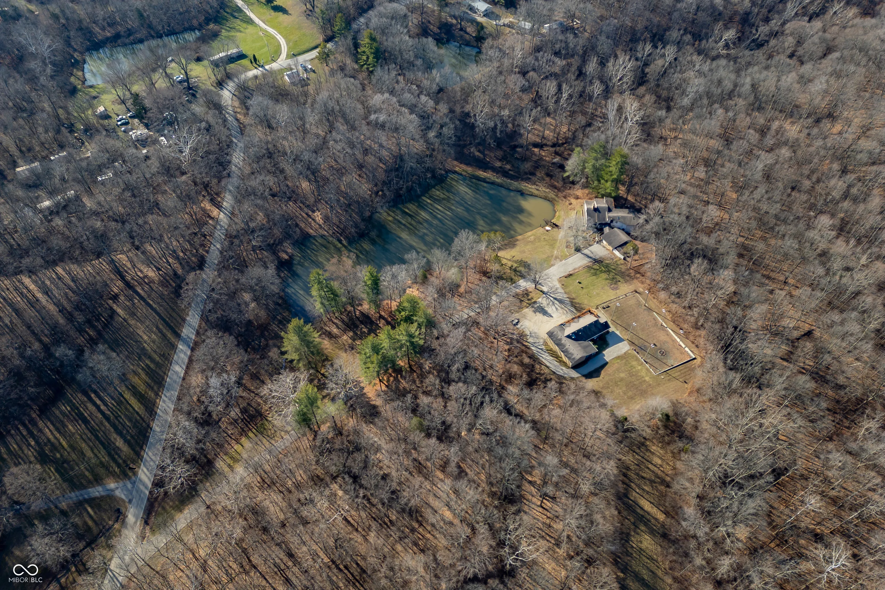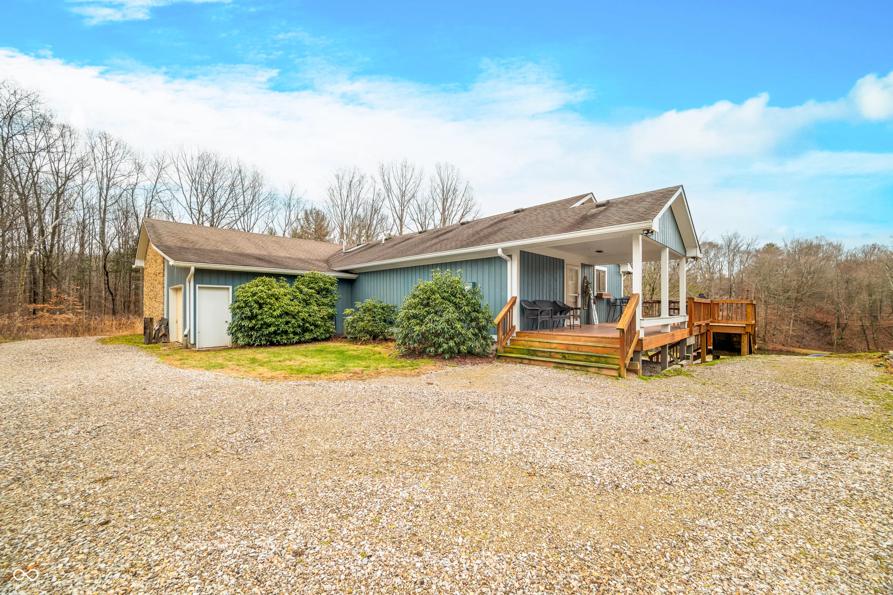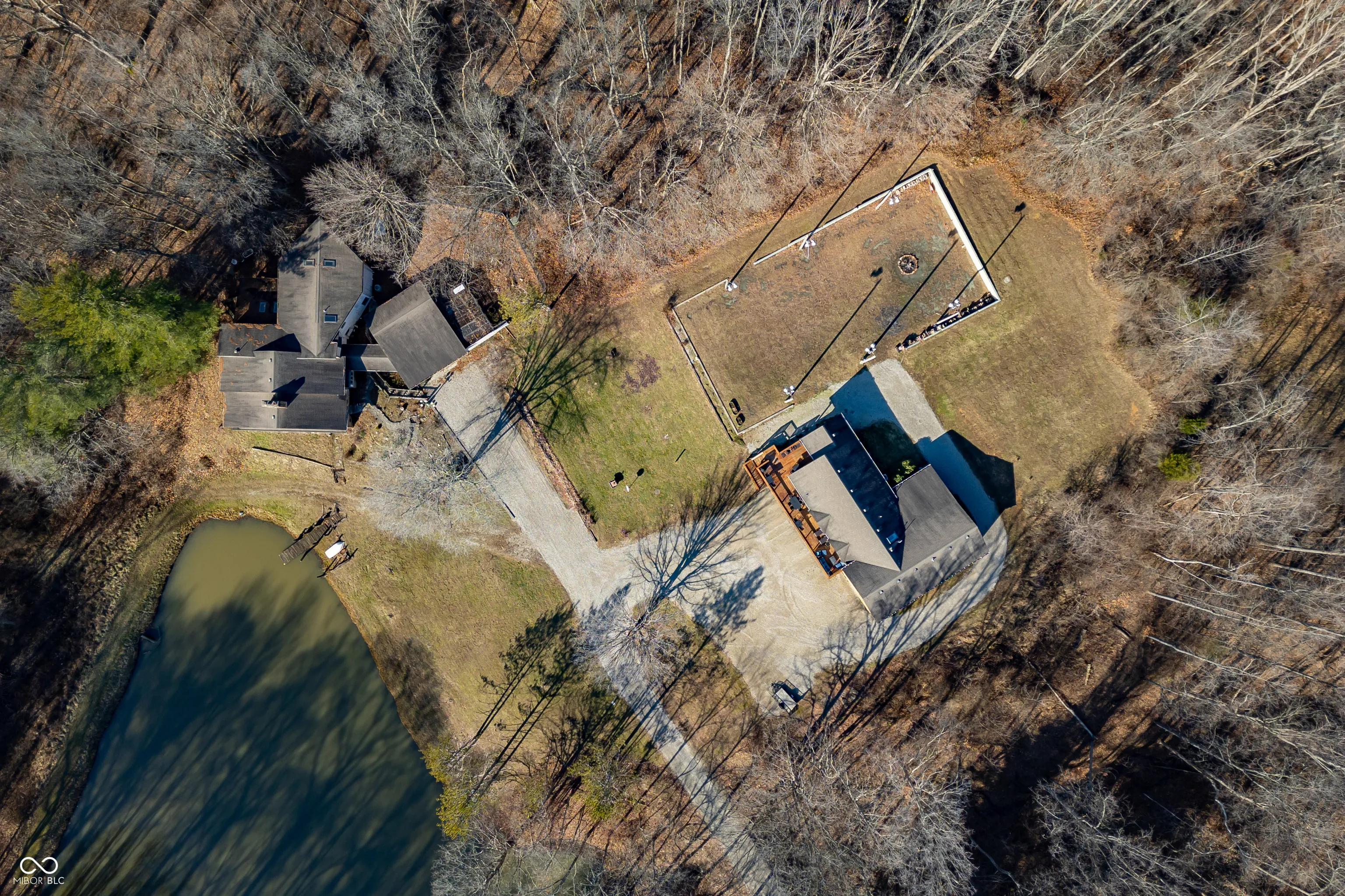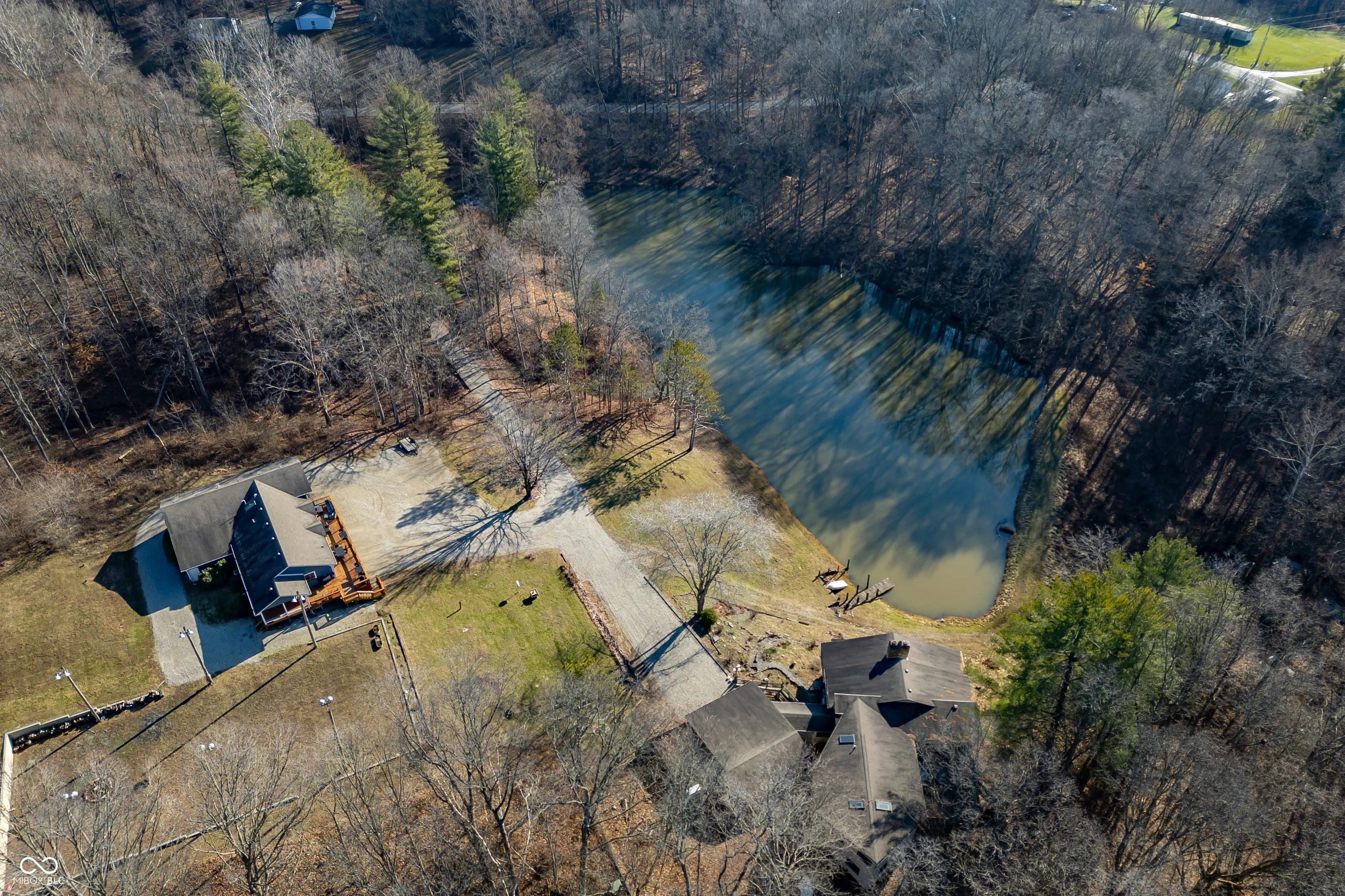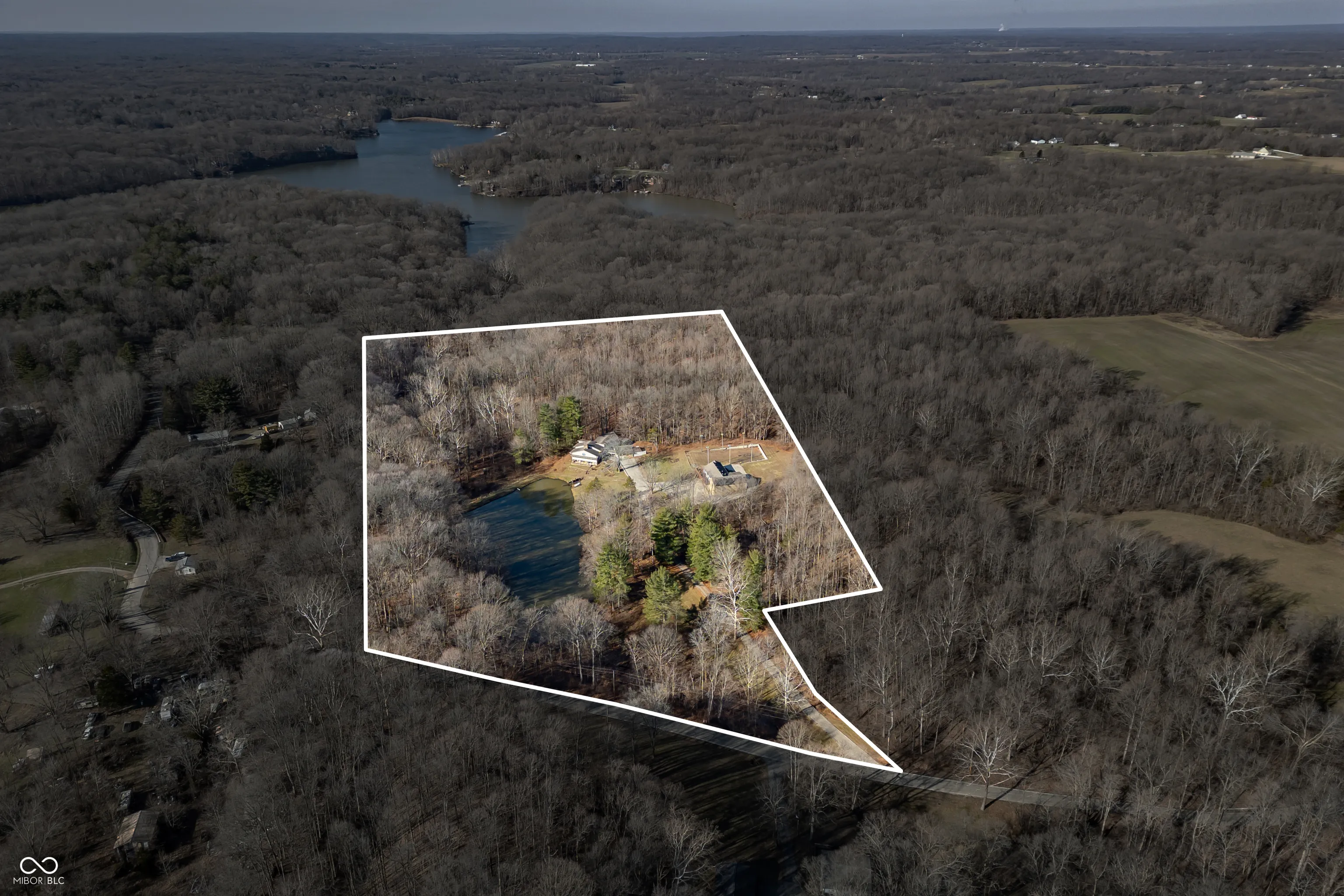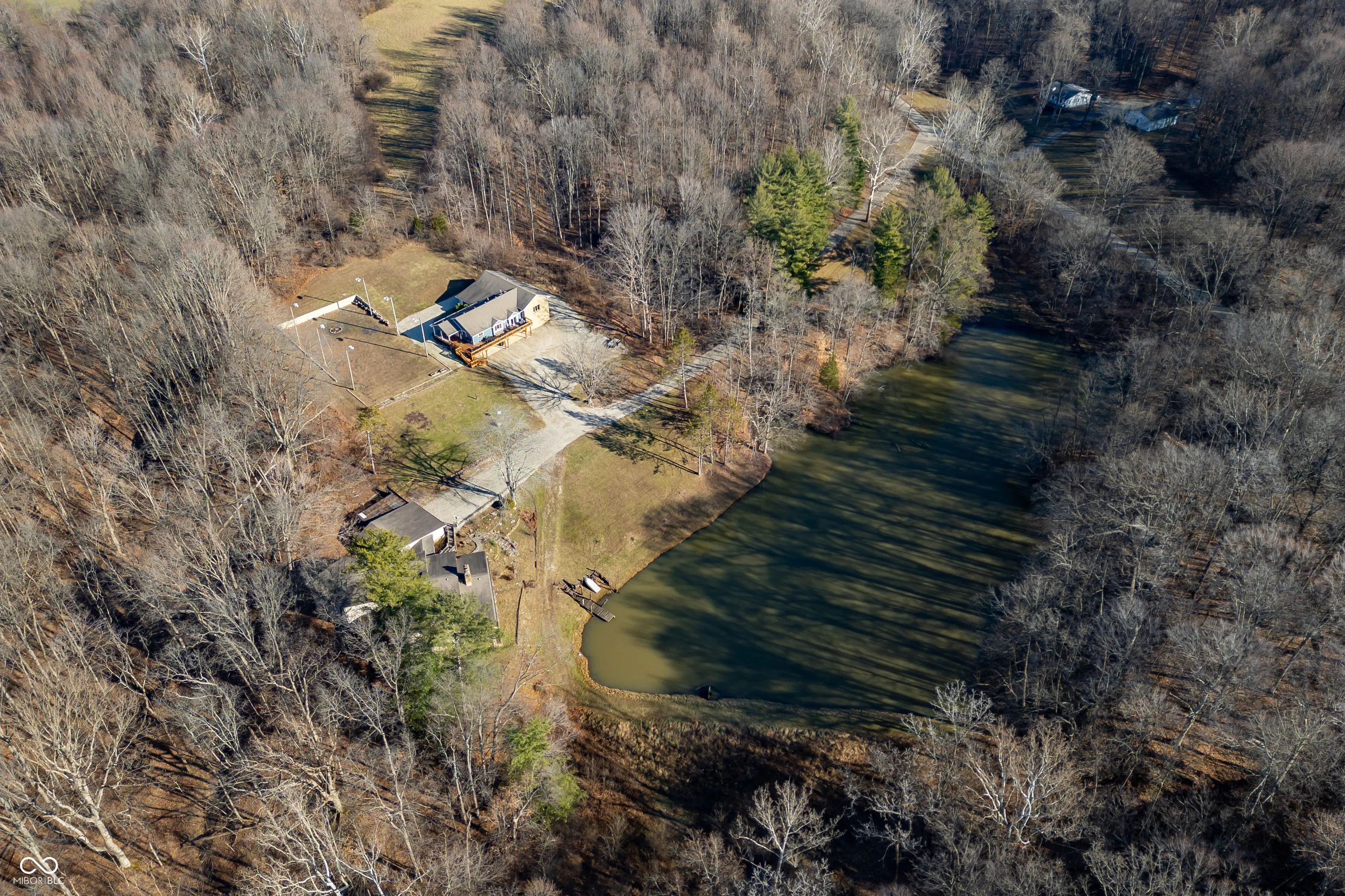 A unique opportunity to own two homes on over sixteen wooded acres. Do you like to entertain? Need in-law or guest quarters? Perhaps an Airbnb on your property? The possibilities are endless. The updated guest house features an indoor basketball, pickleball, or racquetball court. An open-concept great room, kitchen, and dining area are highlighted by an amazing built-in bar. It also includes one bedroom & a new custom bathroom. All of above a four-car attached garage & workshop. Great views of the stocked pond from the wrap-around deck. The main home is over 5,000 square feet with a lodge like feeling featuring vaulted ceilings, wood beams, hardwood flooring, & stone fireplace. The massive master suite includes two full bathrooms, one of which has been completely renovated. Finished walkout basement overlooks the pond and woods. Just waiting on your vision to make this great property your own private retreat.