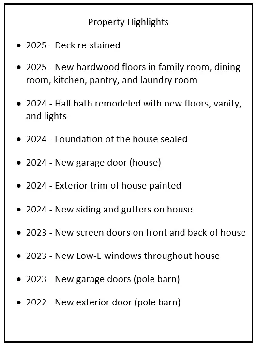 Discover your peaceful retreat in Mooresville nestled on nearly 2 serene acres! This charming ranch home features three inviting bedrooms and two beautifully appointed bathrooms. Enter through the living room, adorned with a vaulted ceiling and a delightful wood-burning fireplace, perfect for cozy evenings. The spacious family room welcomes gatherings, while the kitchen showcases gleaming white cabinets and modern stainless steel appliances. The primary suite is a true sanctuary, boasting a stunning cathedral ceiling. The large pole barn and huge backyard await your creative touch. With no HOA, embrace the freedom to personalize your outdoor space and make this lovely home your own.