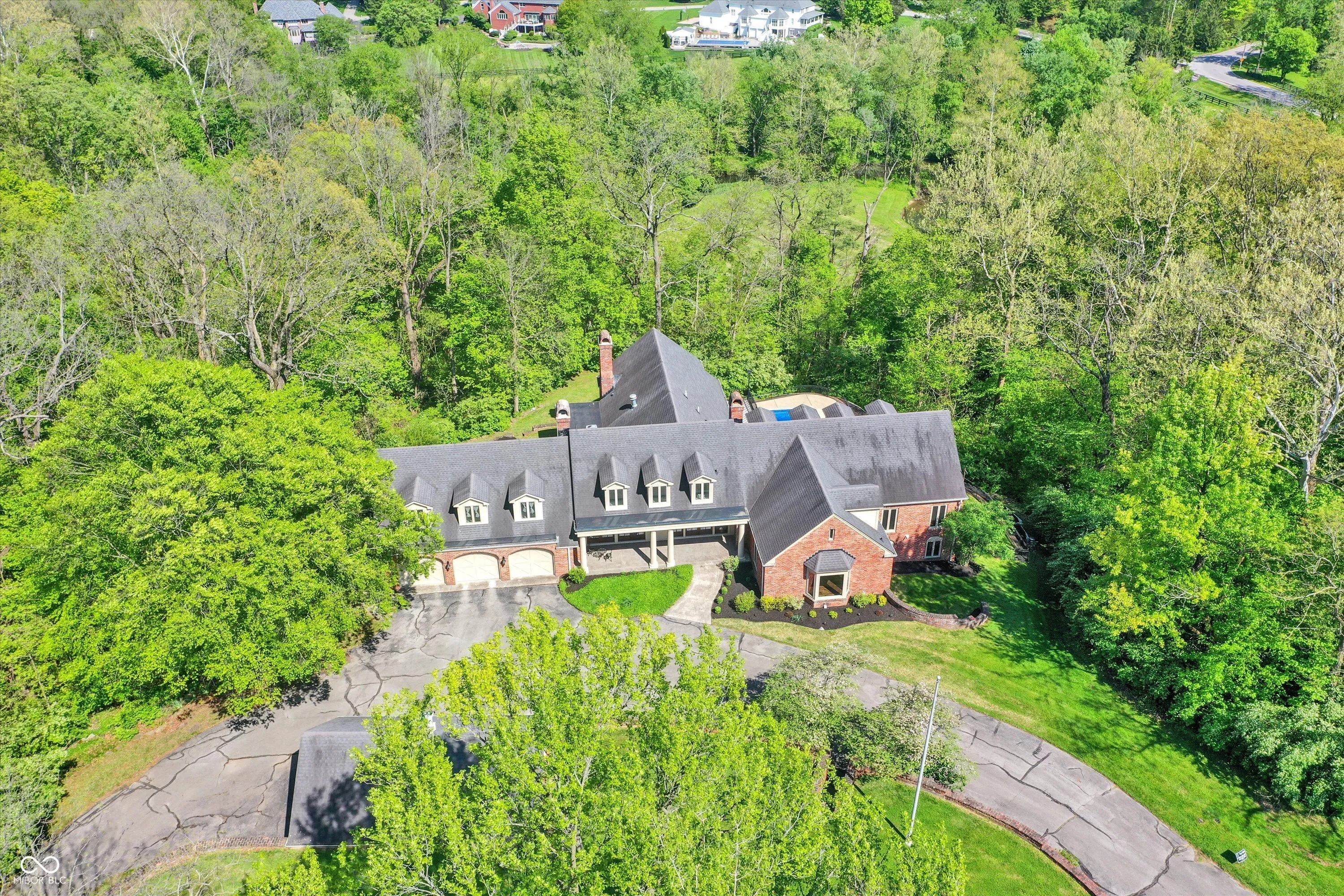 Stunning Estate on the Northside of Indianapolis is nestled on a hilltop 2.34-acre wooded lot in a gated community. This expansive 11,955 SF home features an inviting environment with panoramic views designed to be one with nature. The home is filled with natural light and seamless transitions. The inviting patio entrance takes you into the 4,459 SF main level. The main level features two owners’ suites, den with fireplace, large great room, custom gourmet kitchen (commercial size subzero refrigerator/freezer and 5′ Wolf double oven) and formal dining room with built in cabinets. The upstairs has four bedrooms with three full bathrooms. The lower level has a feature a full kitchen, bar designed after the original Sullivan’s Steakhouse, theater room, game room, sauna and men and ladies’ full bath with showers designed to accommodate the needs of the pool. The private outside setting with full sized Gunite pool and brick paver patio. The estate also features a 3-car attached and 2 car detached garage with endless opportunities. This home can live large or have the intimacy of a smaller home. This is one you will want to see and can get into at a fraction of the cost of building a new home.