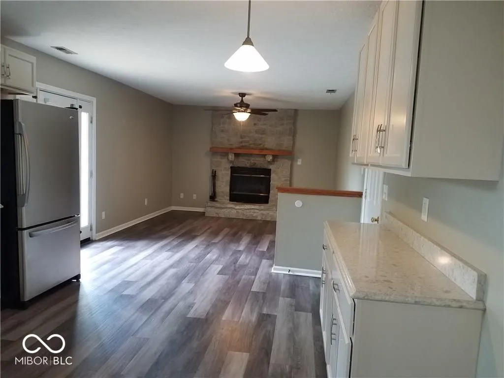 This charming 3 bed 2 bath home features granite countertops with an added butler’s cabinet for extra storage and prep space. The kitchen shines with stainless steel appliances and opens to a spacious family room with a raised hearth stone fireplace and an impressive mantle, perfect for a cozy hearth room. Throughout the entire home, waterproof laminate flooring offers durability and style. Step outside to a custom deck and fully fenced backyard with a 6-foot privacy fence and a mini barn for extra storage. Included appliances: washer, dryer, range/oven, refrigerator, microwave, dishwasher, and disposal-just bring your groceries and move right in!