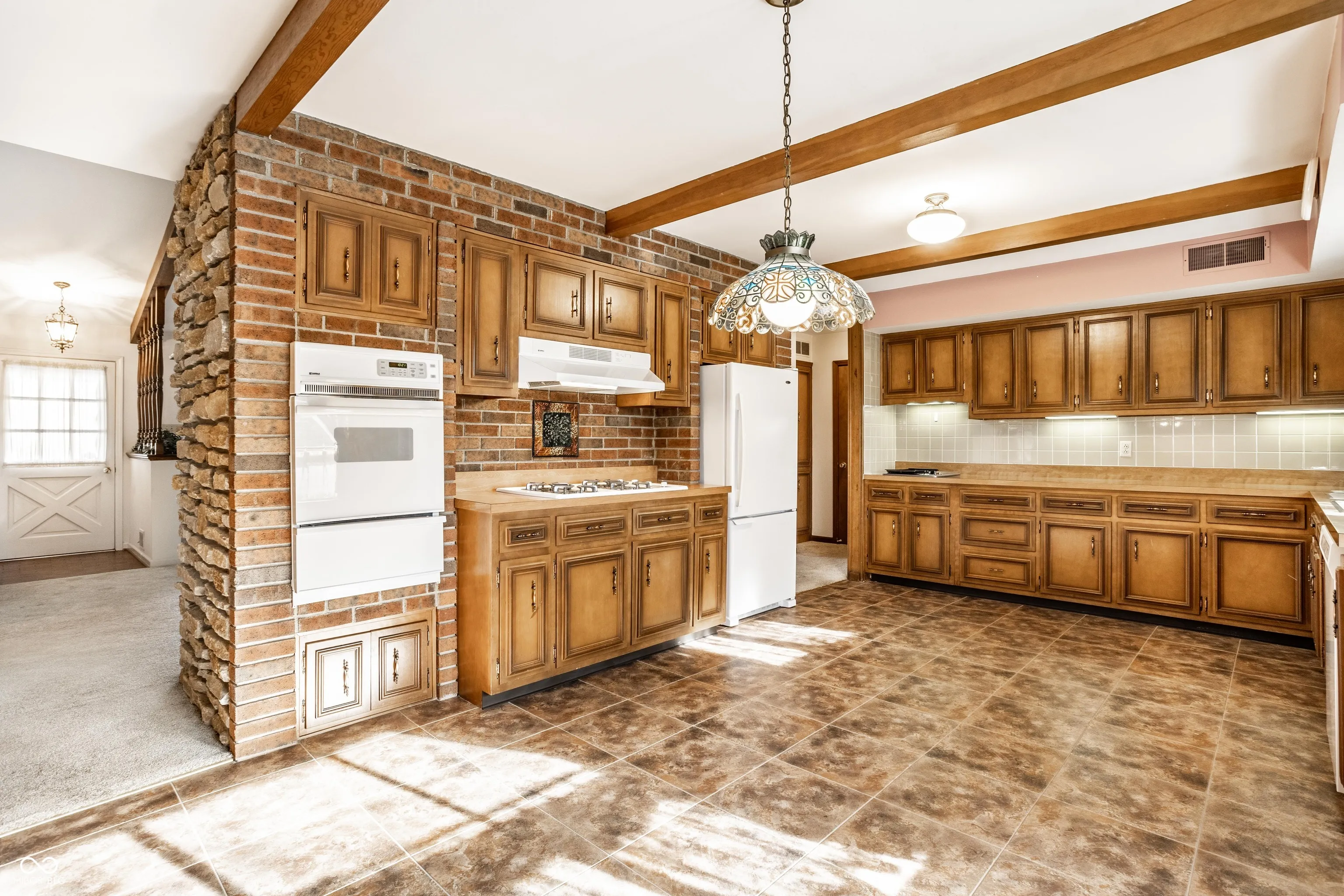 Welcome home to the charming neighborhood of Carefree! This house features an inviting covered front porch, perfect for gathering with friends. As you step inside, you’re greeted by a spacious living room with a picture-perfect bow window, a stunning wood beam vaulted ceiling, and a floor-to-ceiling stone gas log fireplace, creating a cozy atmosphere for relaxation. The eat-in kitchen boasts ample cabinet space and plenty of counter space for meal preparation. Additionally, there’s an office/family room with a built-in desk and easy access to the back patio and garage. The primary bedroom is generously sized and includes a bathroom with a full shower stall, a walk-in closet, and a linen closet. The second bedroom is also oversized, offering two large storage closets for your convenience. Downstairs, you’ll discover a bright rec room filled with daylight windows, a third bedroom complete with built-in bookshelves and a walk-in closet, as well as a laundry area and a third bathroom. Notably, this lower level has its own walk-out door to the backyard. The oversized garage features a floor drain and hose bib, making it easy to wash your car inside, along with convenient pull-down attic access stairs. Situated on .4 acres, this home provides plenty of parking and includes a storage shed for your yard and gardening tools. Enjoy easy proximity to I-69, HWY31, shopping along S Meridian St, Greenwood Park Mall, and highly rated Center Grove schools. This home offers the perfect blend of convenience and comfort.