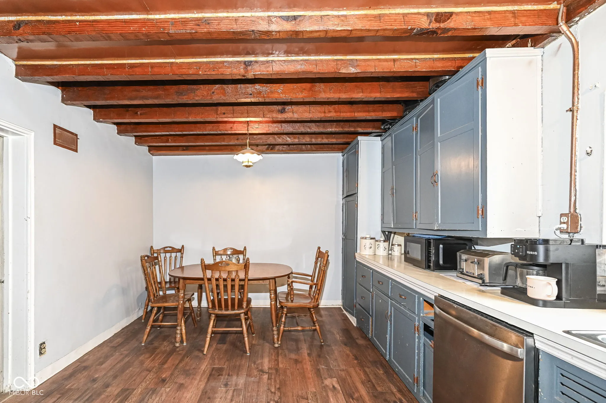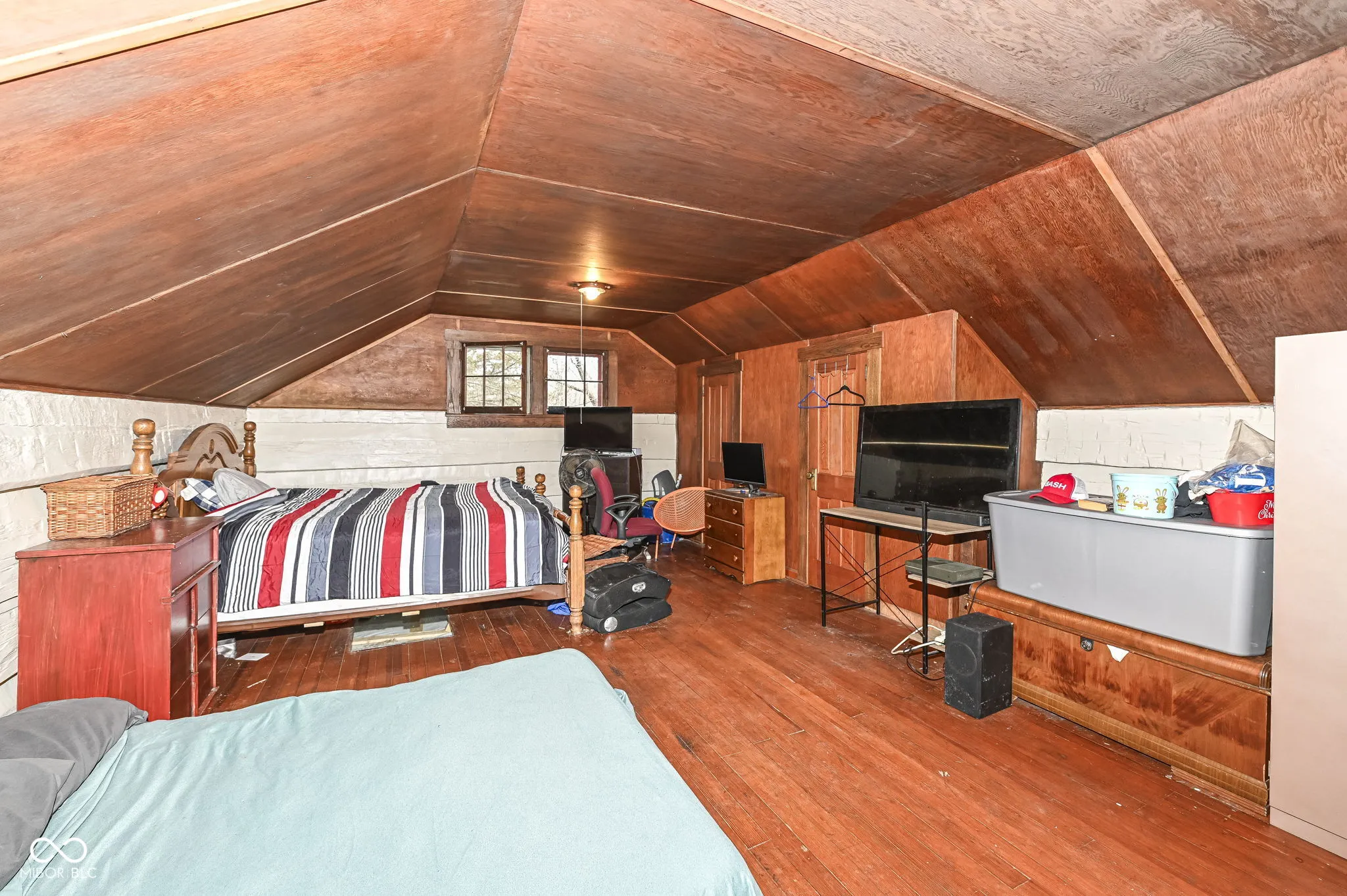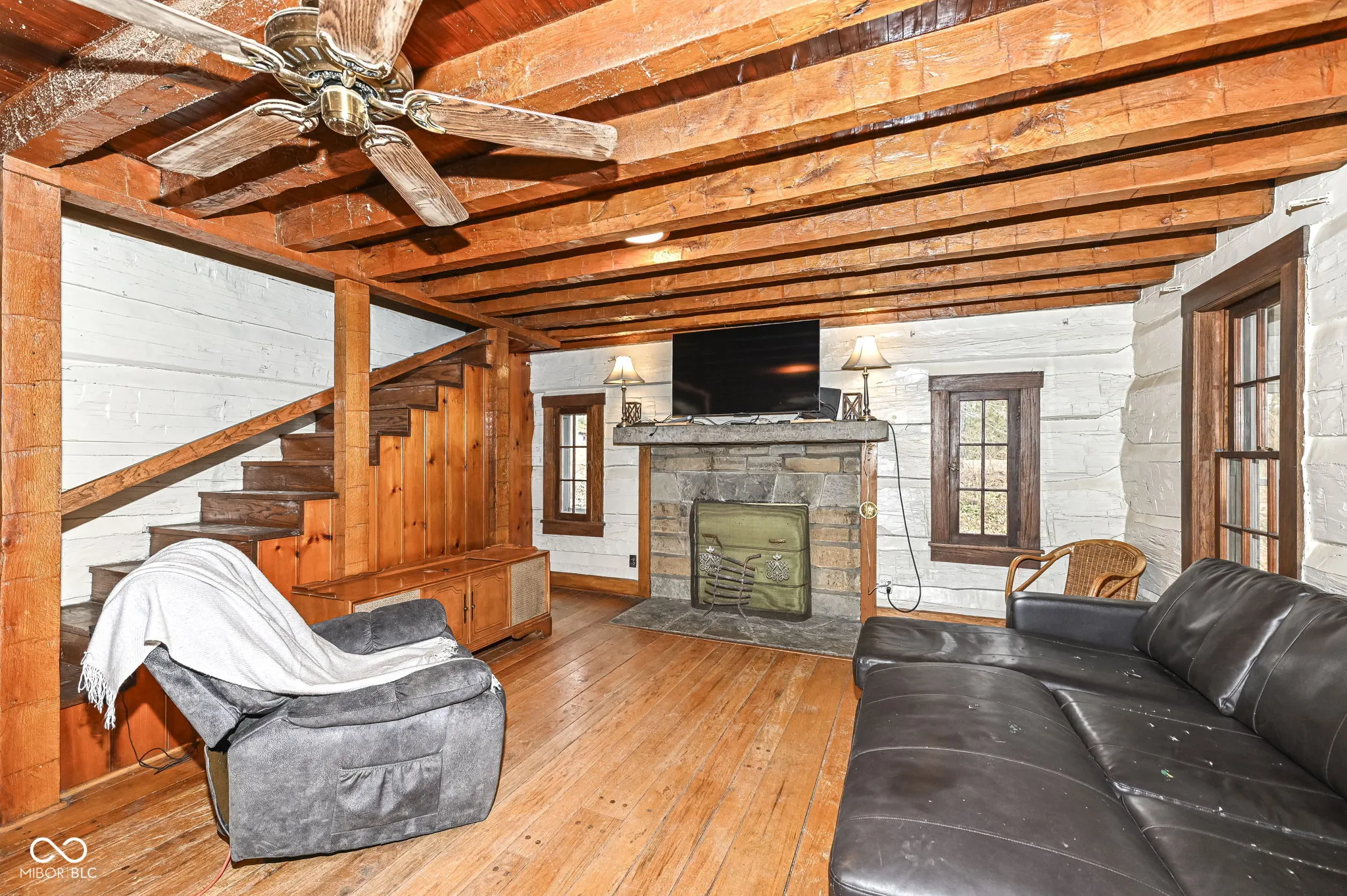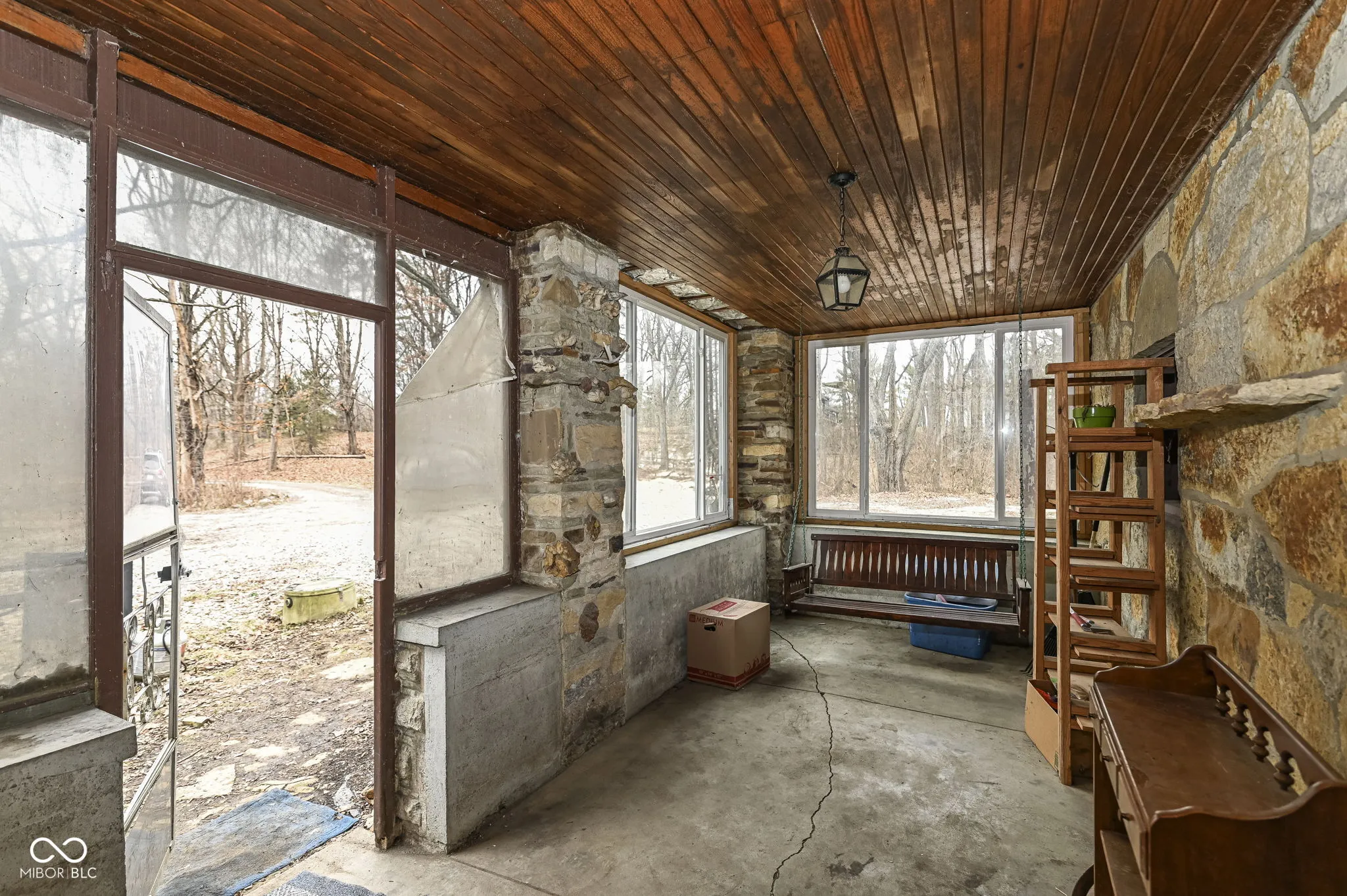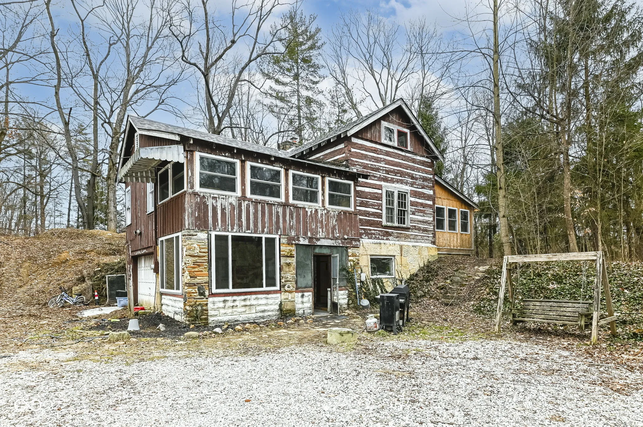 Outstanding Opportunity to enjoy 4.5 Acres in Beautiful Traders Point or to split the parcel and sell some of the acreage as a separate lot or a house with a lot. So many possibilities to create your own private oasis. A meandering creek and towering trees await. The existing home may be torn down or renovated to build your Dream Home. There are no restrictions on modifying the existing home. The center of the home is a log cabin that was transported from Brown County. Additions have been built over time to add bedrooms. Hand-hewn beams and pegwood floors remain. The fireplace boasts a limestone mantel in a spacious Great Room. A charming upstairs loft has the hardwood floors and cool windows of a bygone era. The Primary Bedroom is private and large with vinyl plank floors. Two other bedrooms occupy the other wing of the home. A Country Kitchen greets you as you walk in on the lower level. Ideal Location close to Traders Point Creamery, Shopping and Dining. City Sewer is connected. There is a Well, but city water is available. Gas is also at street. Please do not explore the property without an appointment and the presence of an Agent.