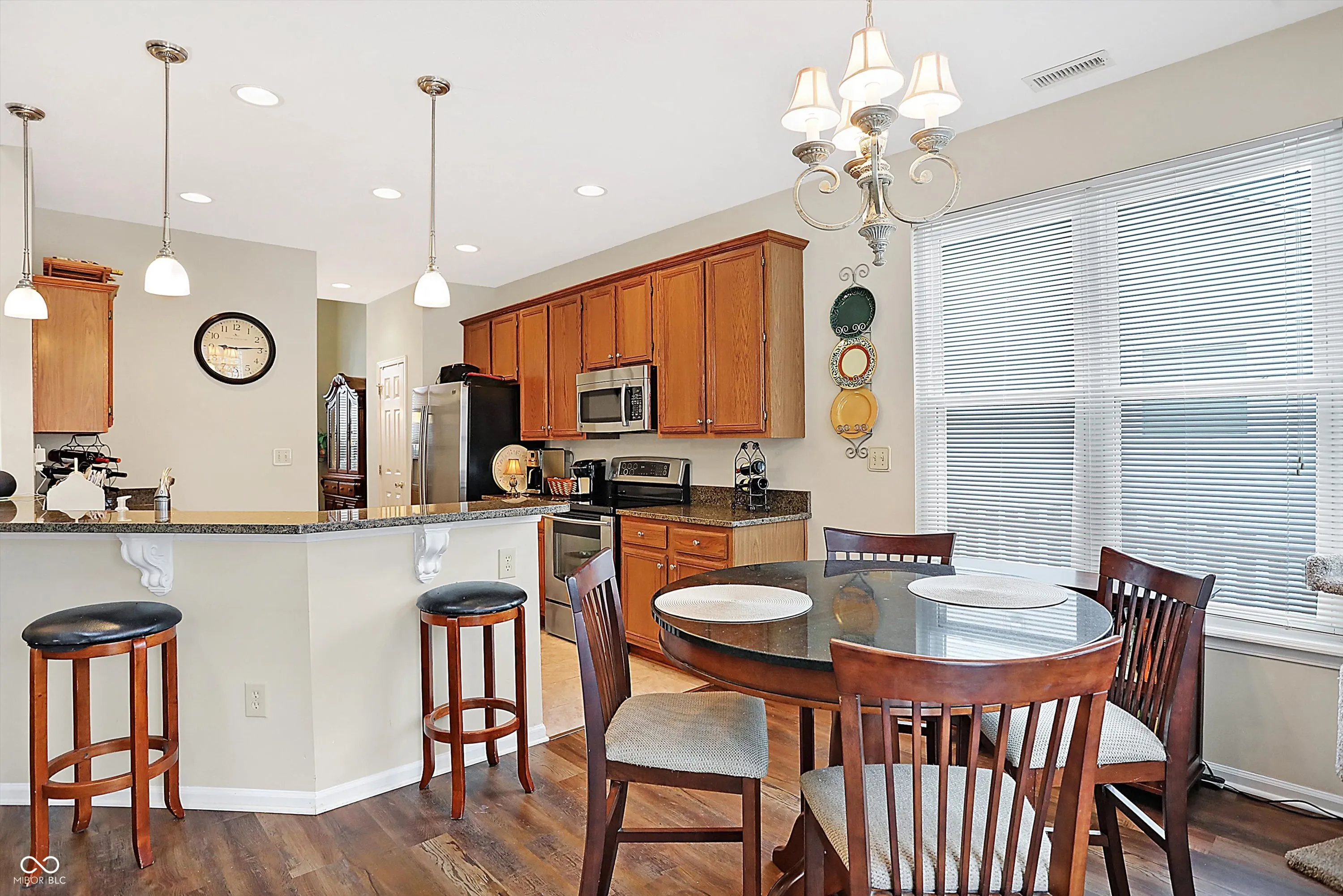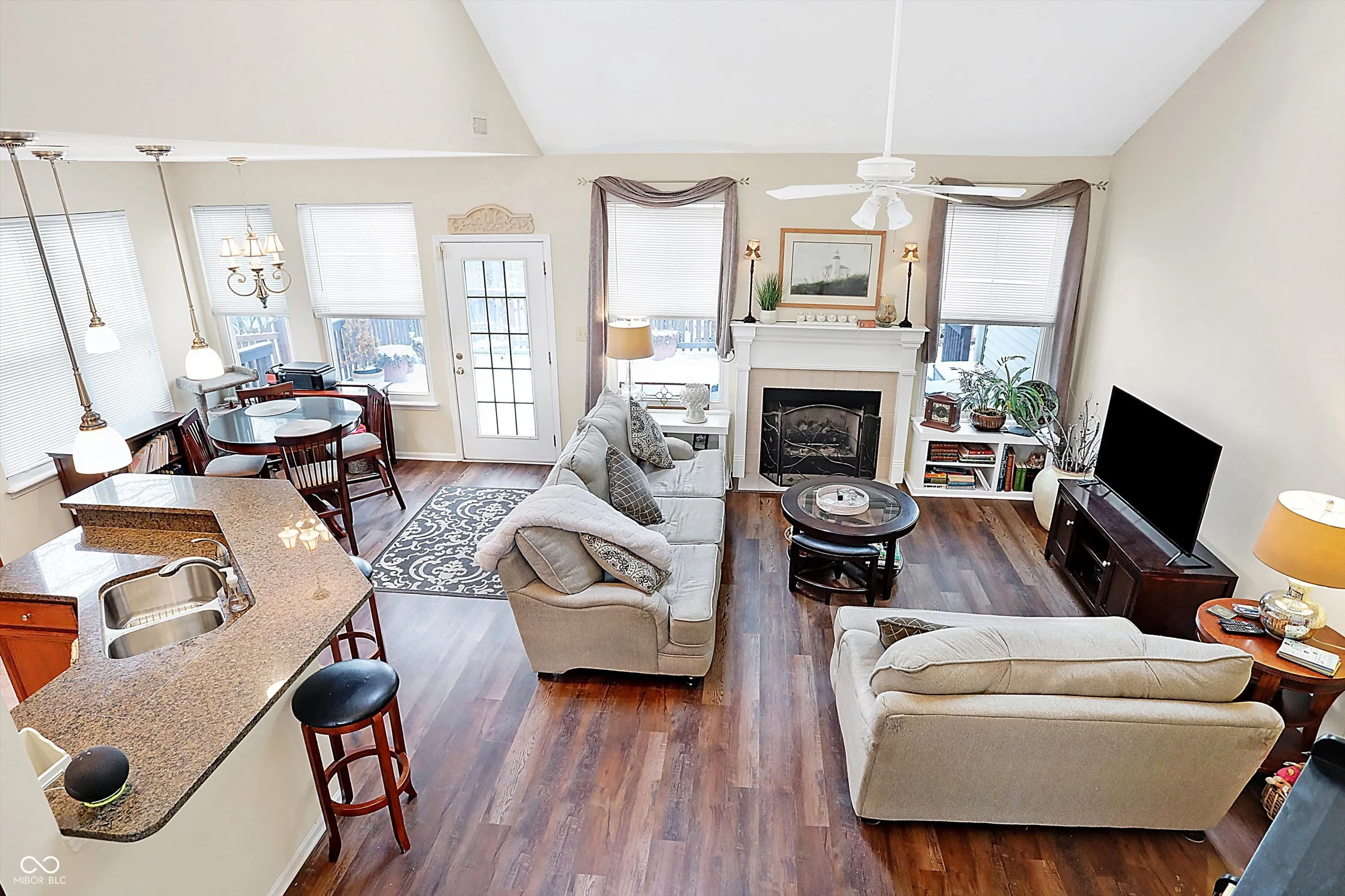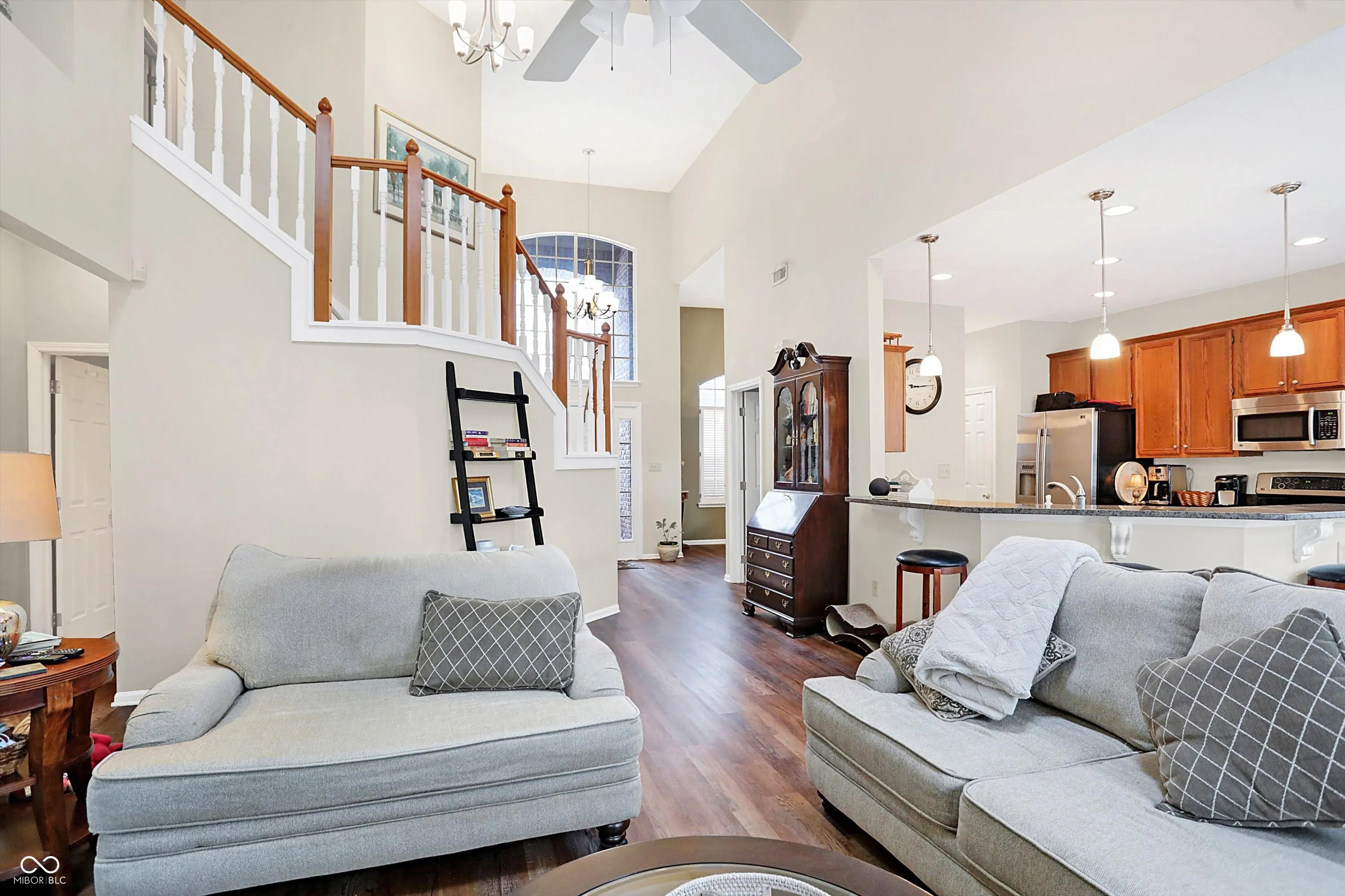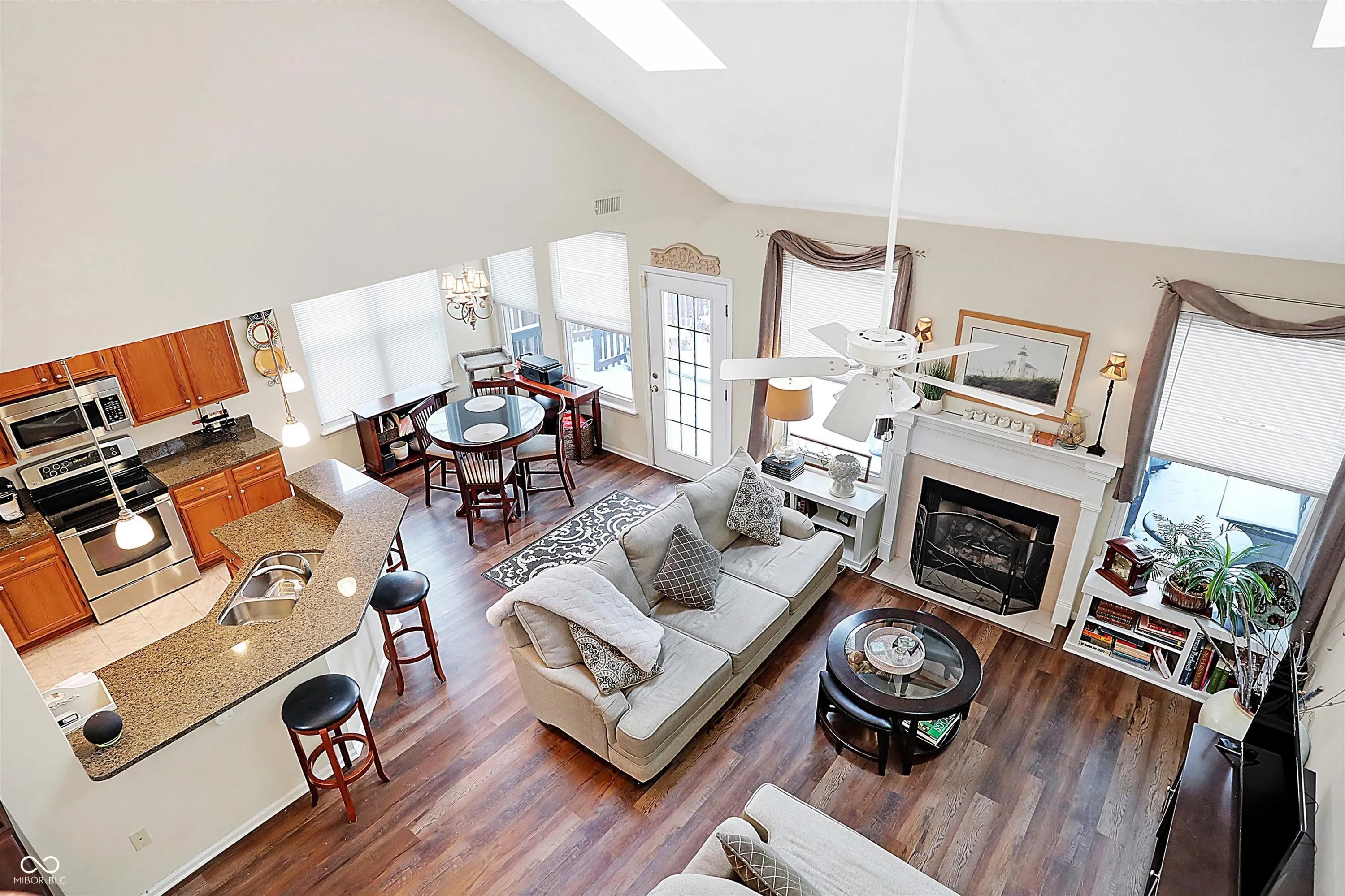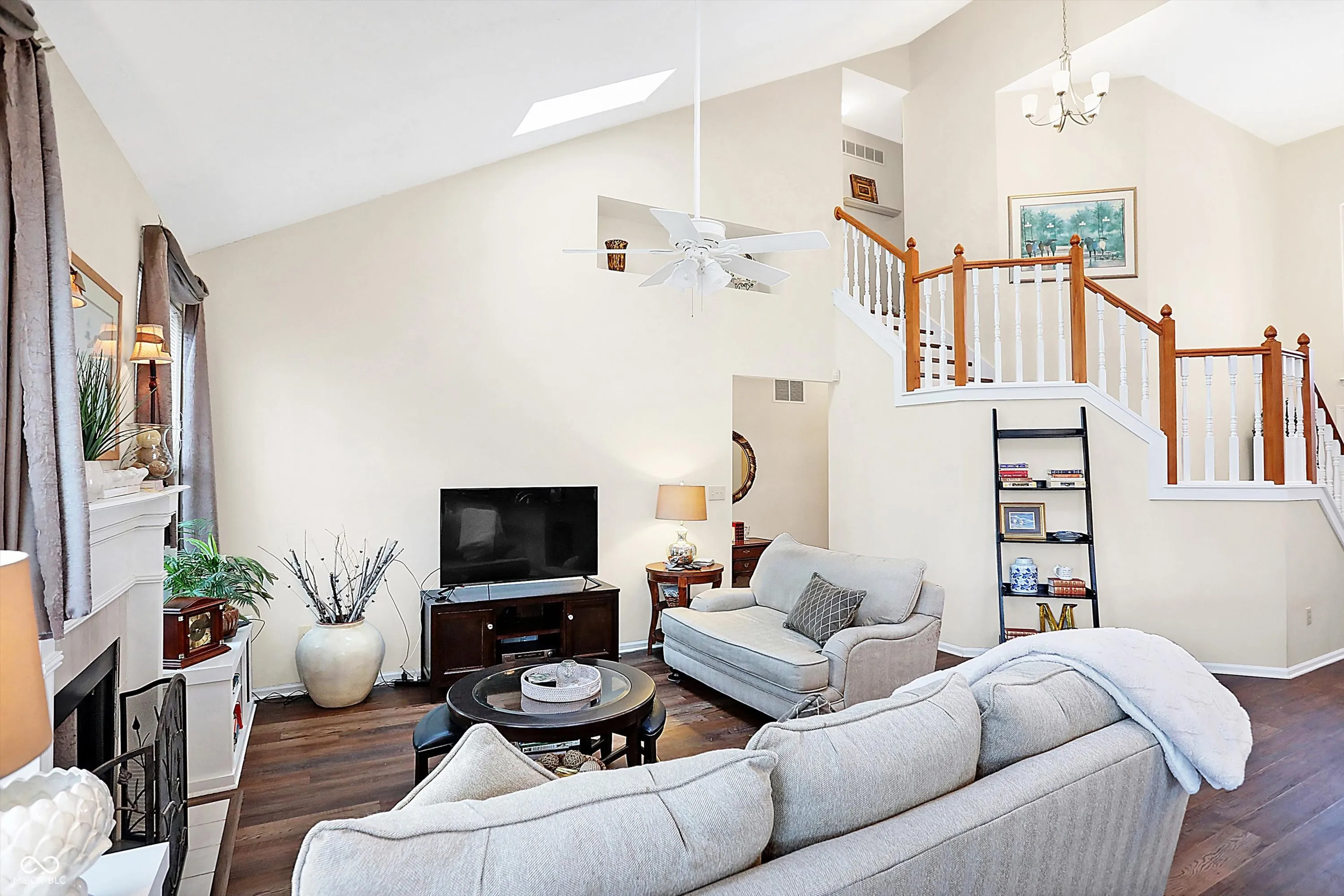 Bright, light & open floorplan w/2 STORY ENTRY, VAULTED CEILINGS, SKYLIGHT WINDOWS & gas FIREPLACE in Great room, 9 ft. ceilings 1st floor, large Dining room w/Huge window, 42′ kitchen cabinets. 1ST FLOOR MASTER SUITE, W/I shower & closet. Newer laminated hardwood floors through house, except one bedroom upstairs. HUGE DECK! Beautiful WOODED back yard on POND! Open concept with the kitchen overlooking the great room .This is one of the best locations in Carmel . Across from Monon Center to enjoy all of the activities and the Mono trail . Easy access to Meridian and 465 .