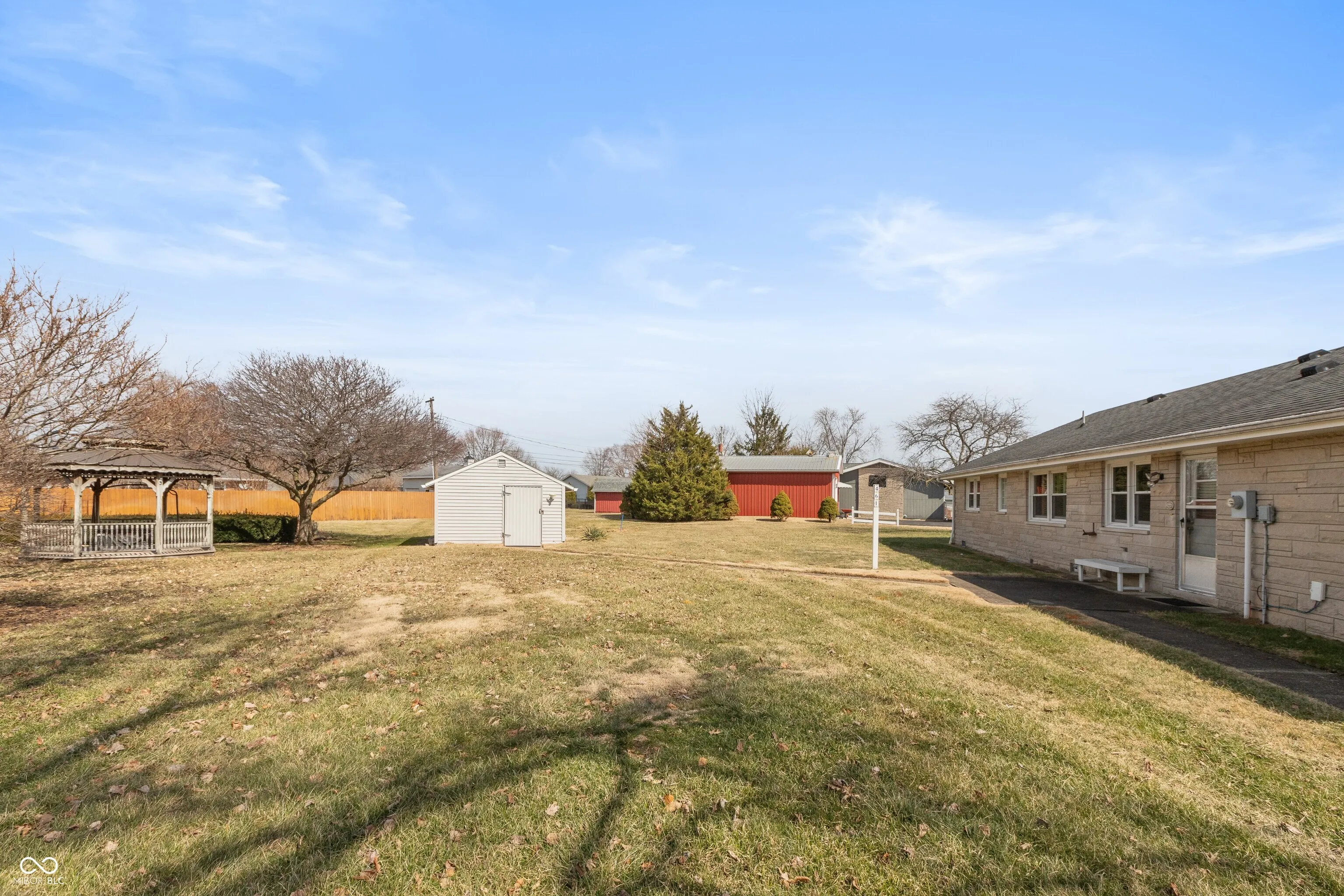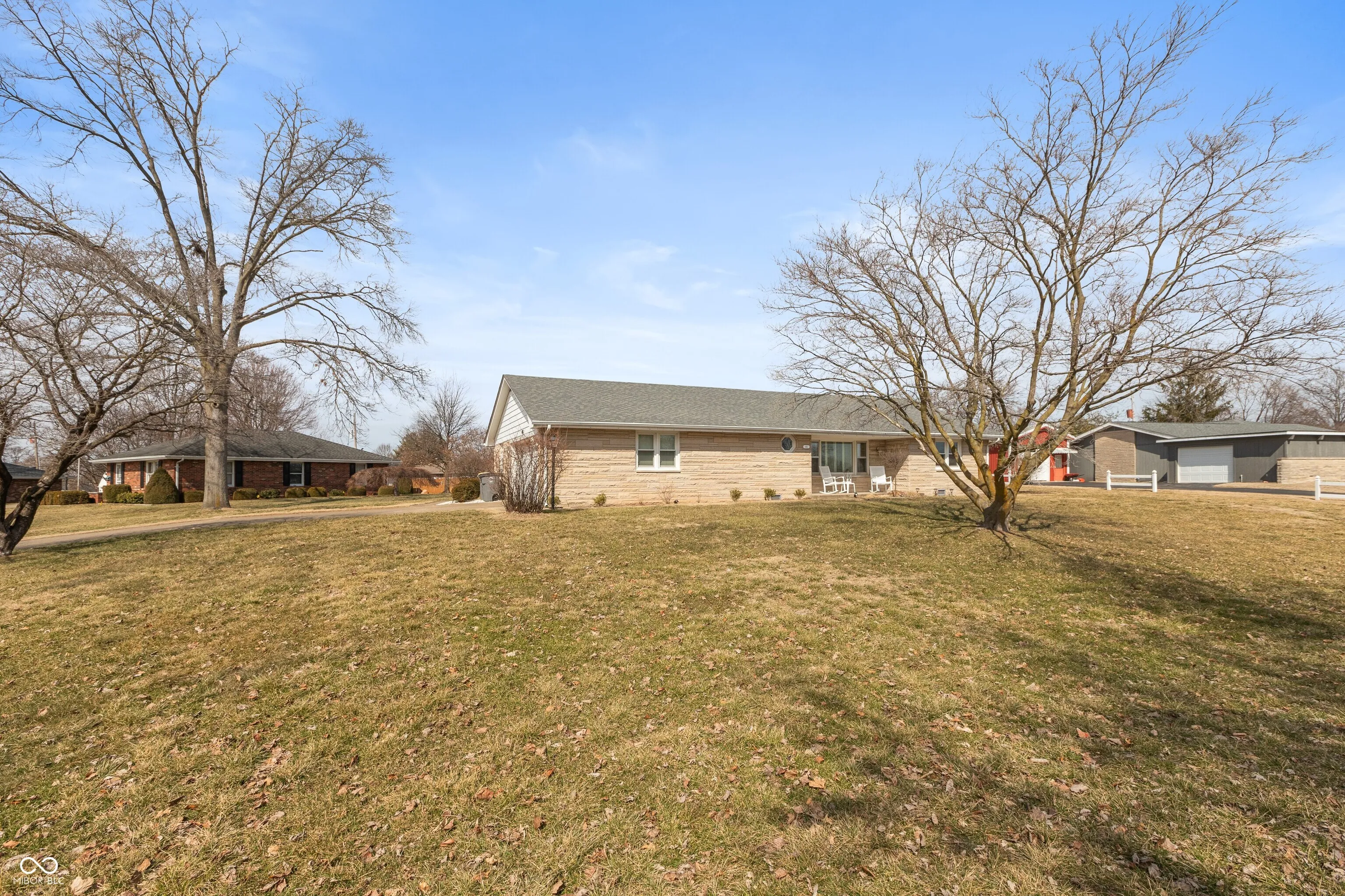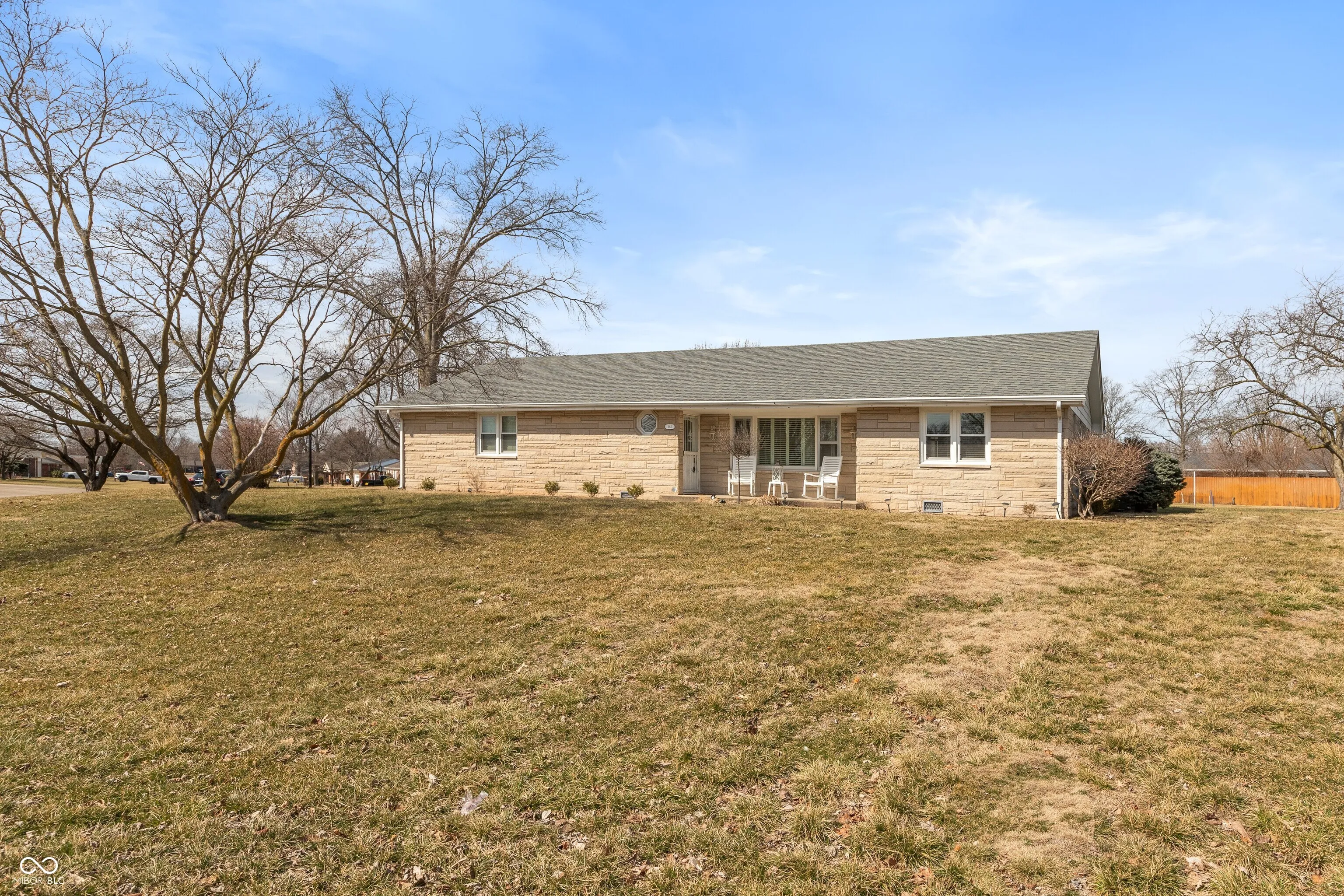 Charming & well -maintained 2 bedroom, 2 bath stone ranch home situated on a large corner lot near Seymour High School; spacious living room with laminate floor; applianced kitchen with granite countertops & tile backsplash plus dining room with built-in shelves; primary bedroom w/ceiling fan features a walk-in closet & private bath; family room with wood-panelled walls & ceiling fan; laundry area with washer & dryer; electric heat plus central air conditioning; 2-car attached garage with opener; front porch; large backyard with concrete patio & 12×16 vinyl-sided storage building; Emerson Elementary School dstrict.