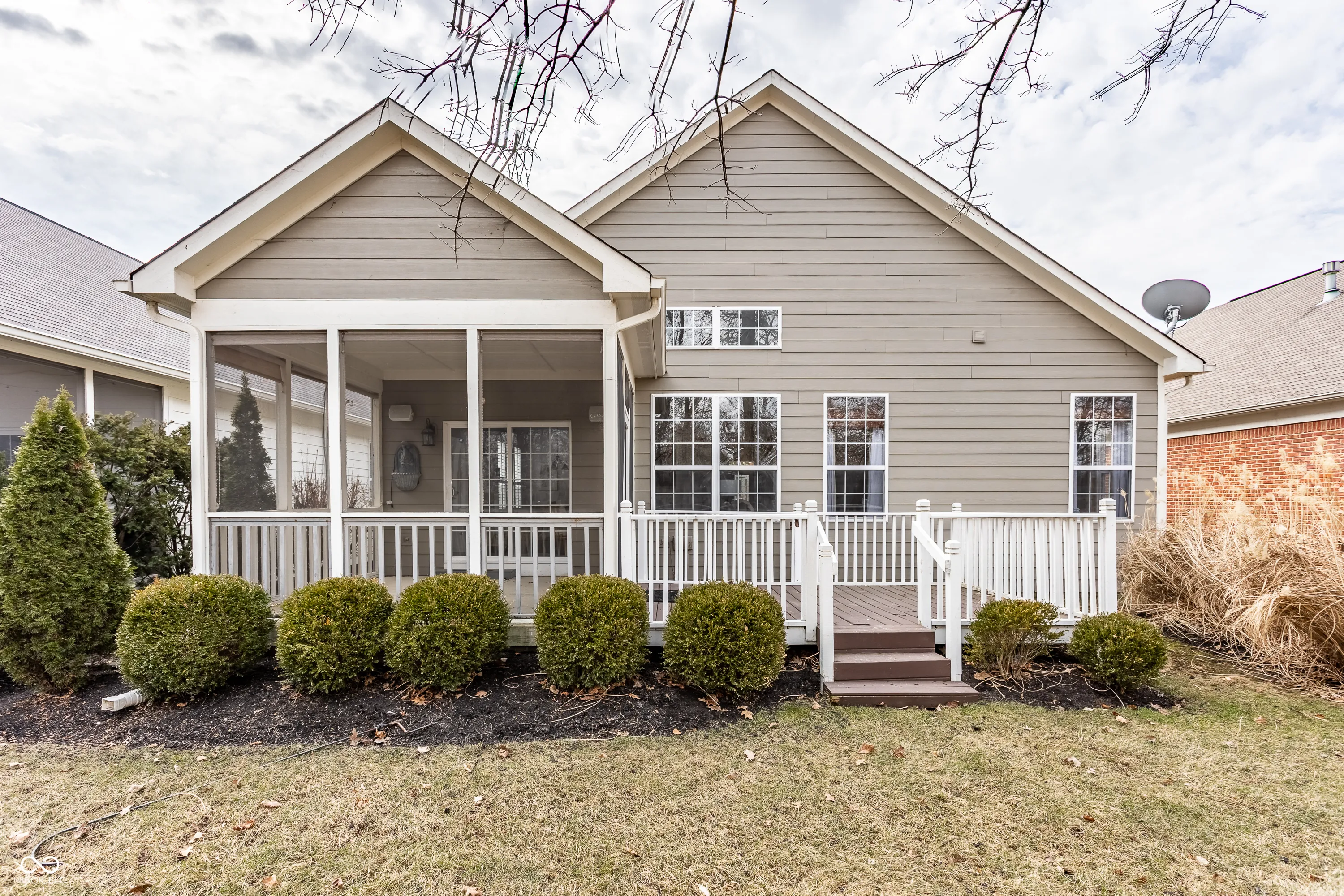 Welcome to 3560 Cardinal Way, a charming former model home that seamlessly blends luxury, style, and maintenance-free living in one of Carmel’s most sought-after communities. Recently painted throughout, the home offers a modern, chic canvas, ready for your personal touch. The open floor plan boasts 9-foot ceilings, a vaulted great room, and elegant tray ceilings, creating an airy, sophisticated ambiance. A gourmet kitchen with premium finishes flows effortlessly into the great room with a cozy fireplace, perfect for entertaining. The primary suite is a private retreat with expansive windows overlooking the fenced backyard with no rear neighbors. Enjoy serene mornings on the wood deck or unwind in the screened-in porch. The fully finished lower level offers two additional bedrooms, a full bath, a guest suite with a walk-in closet, a kitchenette, and a versatile gym or office space-all designed for comfort and functionality. Additional highlights include elegant wainscoting, dining room columns, premium tile finishes, engineered hardwood floors, and an irrigation system. This exquisite villa strikes the perfect balance between sophistication and easy living, offering a rare opportunity to embrace a refined lifestyle in the heart of Carmel.