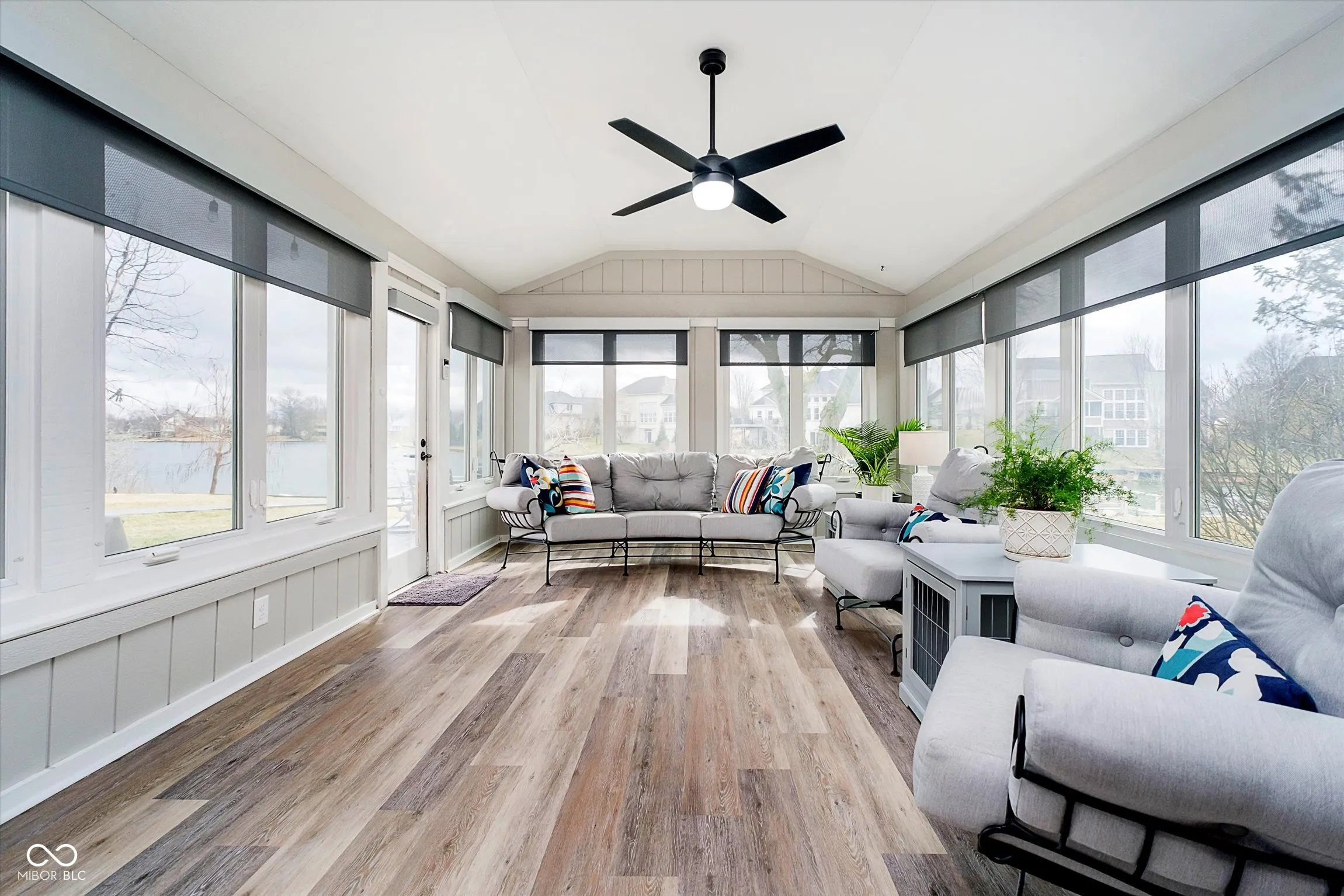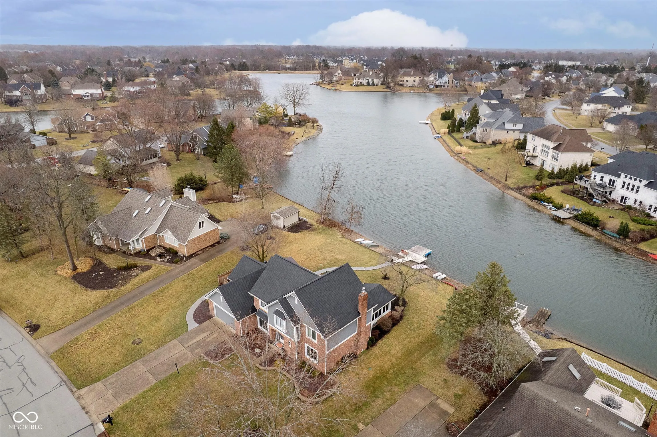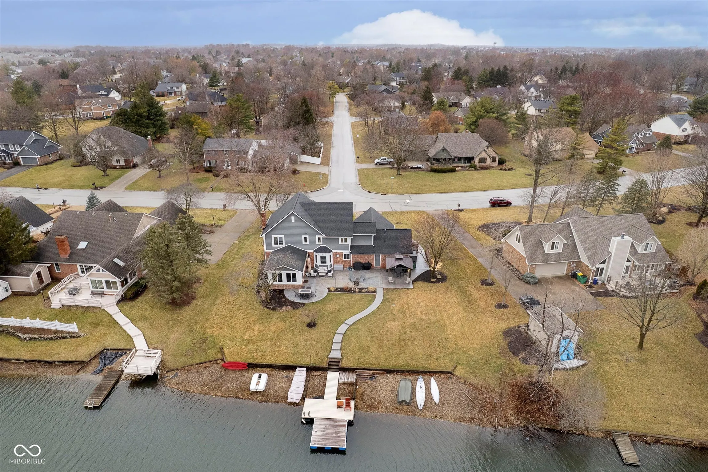 LAKE FRONT w/ dock, nearly .5 acres, 4 BR & 2.5 BA Carmel home (Westfield Schools) in sought after Village Farms neighborhood. Rare find in this location – check out virtual tour link in listing to view aerial flyover & interior highlight video! Impressive poured patio w/ pergola, multiple entertaining zones, sidewalk & steps leading to dock access for 15-acre stocked lake. New roof, gutters, exterior paint, water softener. Professional landscaping & exterior lighting, 6-zone irrigation, storage shed. Enjoy water views from spacious Sunroom w/ new LVP floors, remote blinds, & mini-split HVAC. Completely remodeled Kitchen has new cabinets, granite counters, tile backsplash, upgraded stainless appliances, gas range, pantry w/ roll out shelves, & custom island w/ storage that doubles as eat-in dining table. New 3/4″ white oak engineered hardwoods on main level, Mudroom w/ boot bench (additional laundry hookups behind bench), utility sink, & cabinets, and updated Powder Room. Family Room w/ new gas insert fireplace, tile surround, floating shelves, custom millwork, new carpeting. Private main level Home Office w/ sliding doors & formal Dining Room. Primary Suite has a vaulted ceiling, walk-in closet, ensuite bath. Upstairs Laundry. 3 more spacious BRs w/ ceiling fans & big closets. Walk-in attic storage. Finished 2+ car garage w/ heater & separate workshop & storage area. Enjoy fishing from floating dock, paddle board, paddle boat, or just relax! HOA amenities include pool, tennis, walking paths, clubhouse.