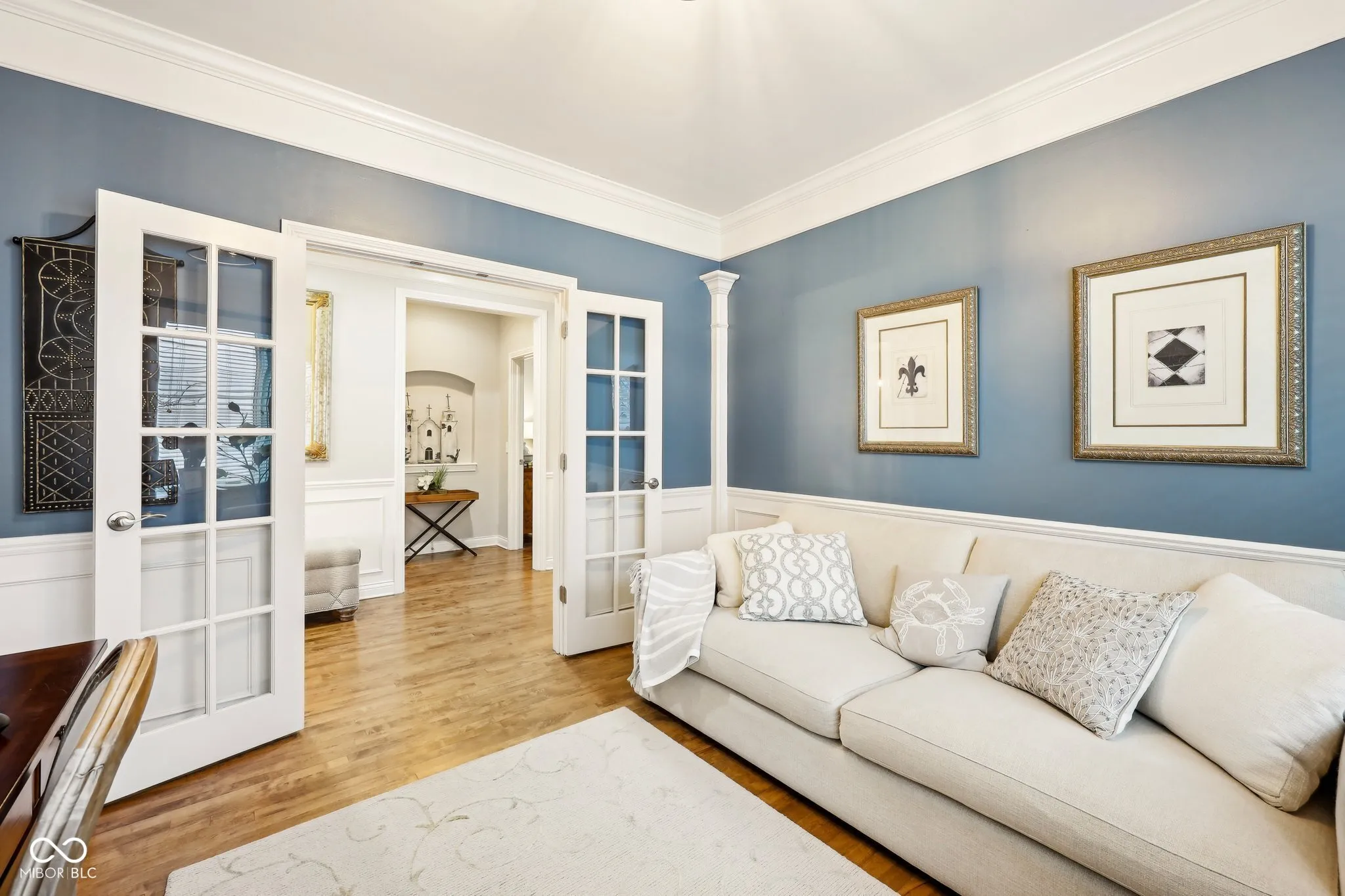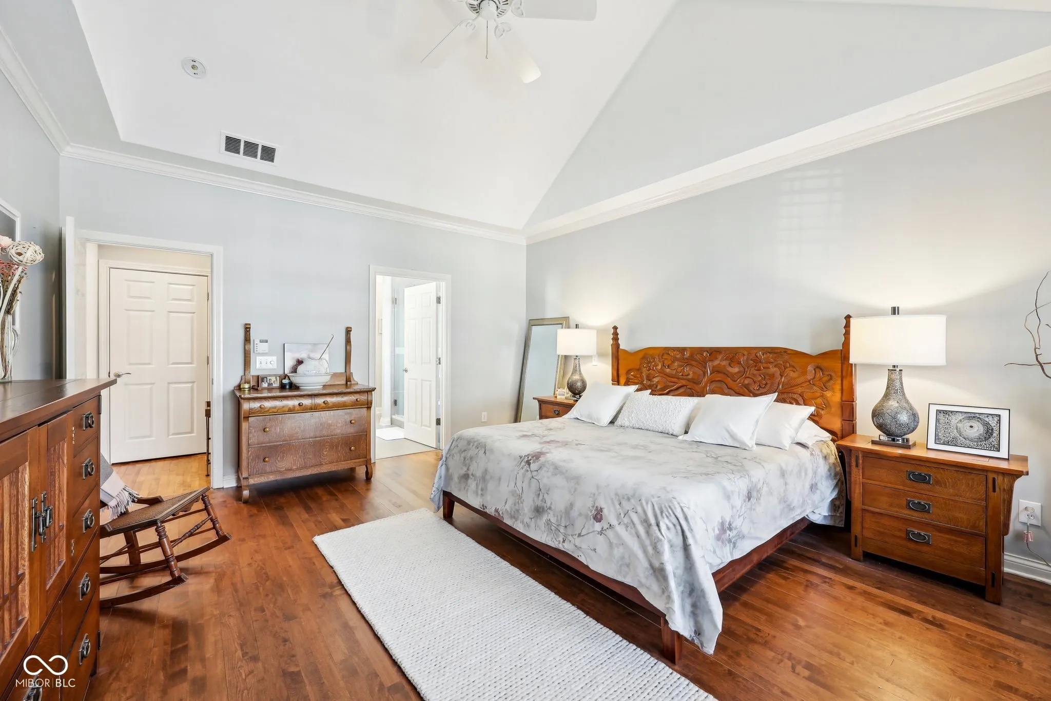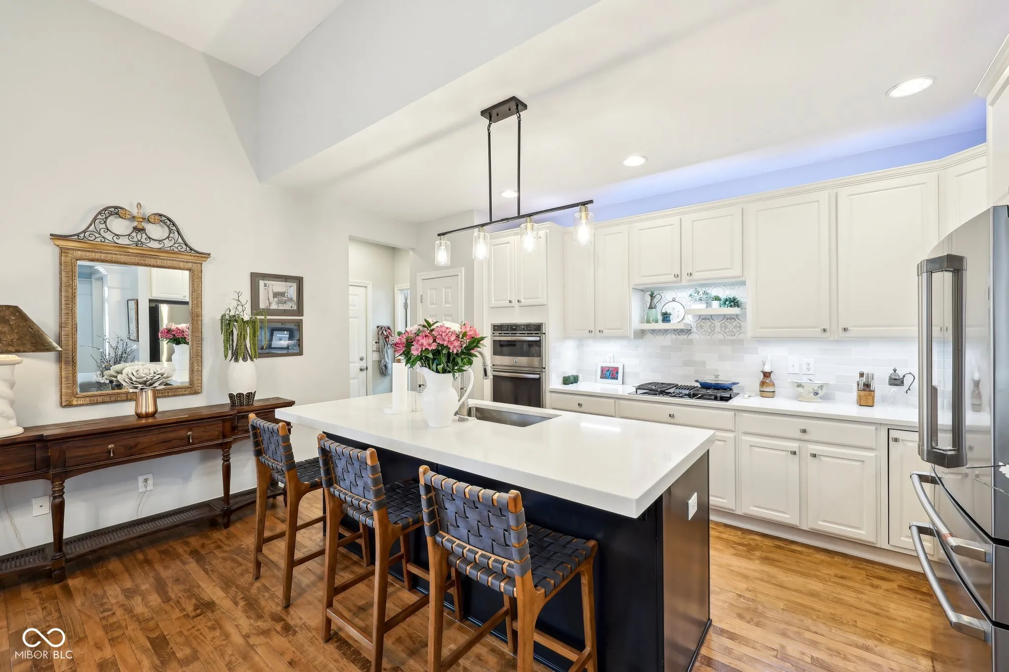 Stunning low maintenance ranch home with basement in Indy’s premier gated luxury neighborhood of Sycamore Springs! This meticulously maintained home boasts a beautifully remodeled kitchen, complete with a new kitchen island, quartz countertops, decorative custom tile backsplash, stainless appliances, gas cooktop, microwave/built-in oven, and 4 drawer refrigerator. Hardwood flooring throughout and designer lighting fixtures add a modern touch. The open floorplan features cathedral ceilings filled with natural light, perfect for entertaining. The private outdoor space is perfect for alfresco dining or relaxing with friends and family, with an updated paver patio off the sunroom. The spacious primary suite is a tranquil retreat, complete with a luxurious tile shower, separate dressing area, and large walk-in closet. The 2nd bedroom and full guest bath offer a private space for guests, and the private office/flex room offers flexibility and is well appointed with wainscotting and tons of natural light. The great room is warm and inviting, with a gas fireplace and soaring ceilings. Convenient laundry room is equipped with a sink and washer/dryer. Finished oversized 2-car rear entry garage provides great storage space. The HOA fee covers all lawncare, home exterior, pool, fitness center, snow removal, and more, making this a truly low-maintenance home. Just minutes from Keystone at the Crossing and Indy’s Finest Restaurants, this home offers the perfect blend of luxury, convenience, and relaxation. Don’t miss out on this incredible opportunity to own a luxurious home in Sycamore Springs, with its highly rated schools, beautiful parks, and vibrant community!