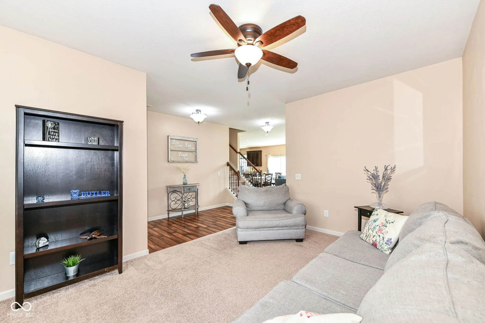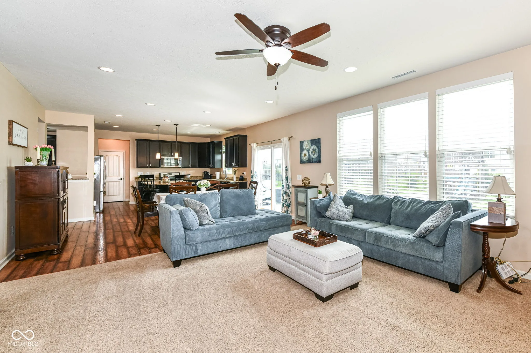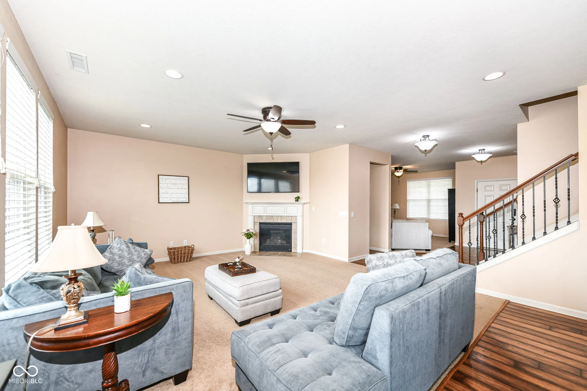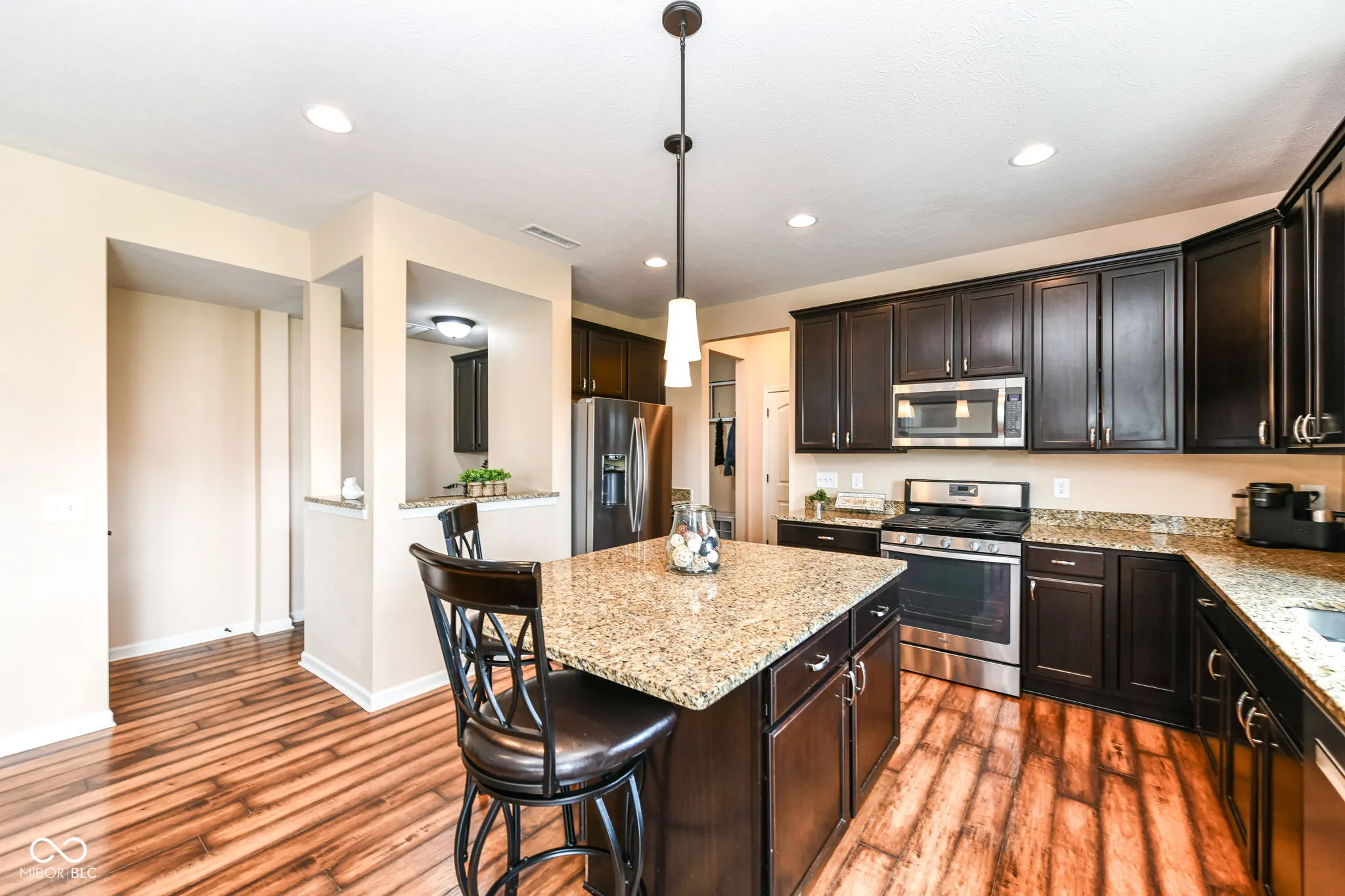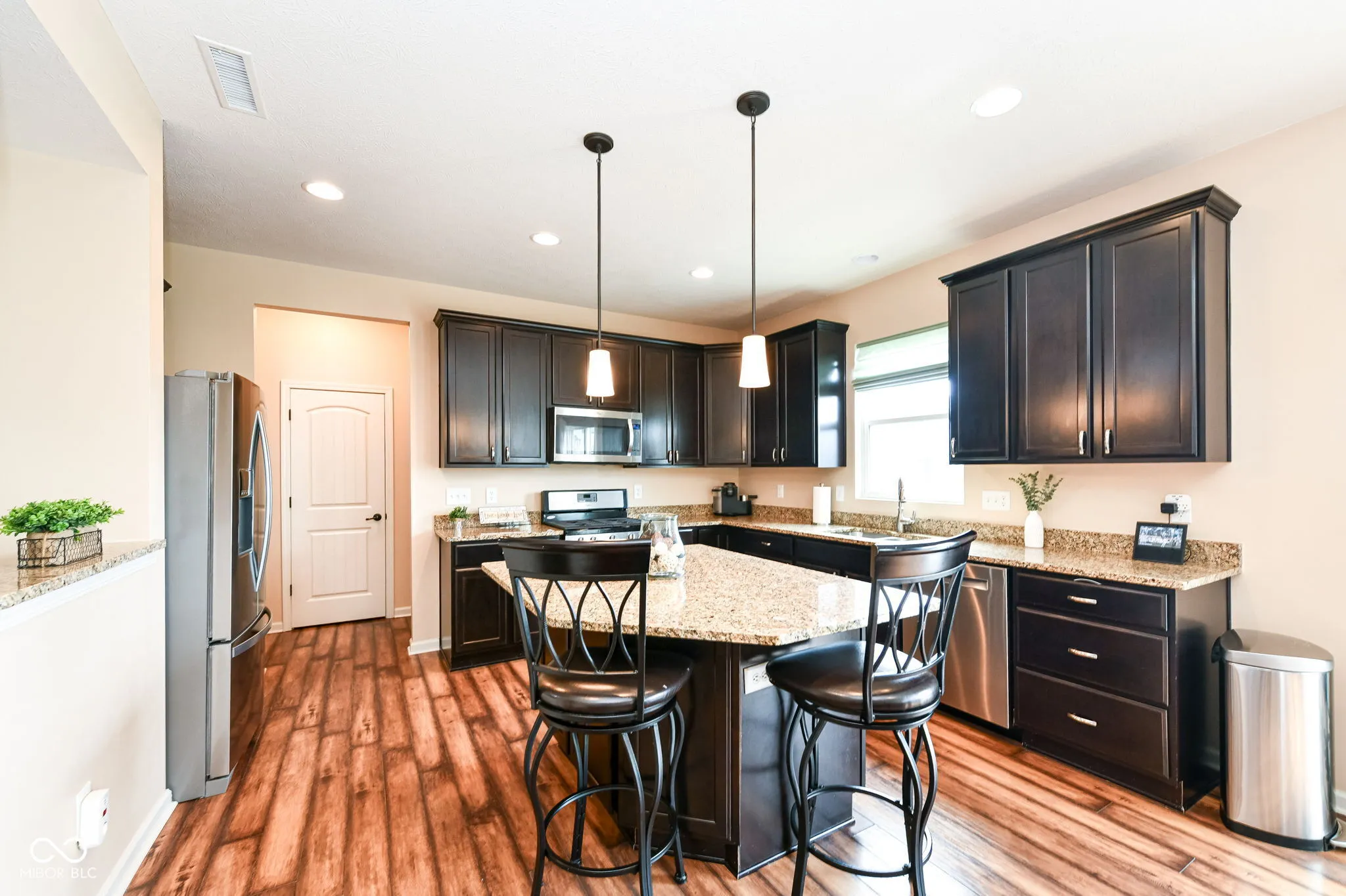 Immaculate home in popular Maple Knoll shows pride of ownership! Great curb appeal with multiple roof peaks and spacious front porch. Step inside the flexible Den/Study or Living Room that lies on the right; open concept floorplan features spacious Family Room with Fireplace that is open to large Kitchen featuring Lots of cabinets, warm granite countertops and an oversized pantry that will delight any cook! Pulte Planning Center directly off of the kitchen is so handy! Large upstairs laundry with lots of storage space; spacious Primary Suite includes separate tub/shower and walk in closet. Three additional bedrooms share the hall bathroom. AND a 19×19 upstairs Rec/Play Room has flexible functions – let your imagination be your guide! Fully fenced rear yard (2017) plus new patio (2021) = great entertaining and relaxing space. New roof (2024), Water heater (2024). Neutral blinds throughout. Washer/Dryer included and garage fridge and swing set to remain. Oversized garage with bump out is virtually same size as 3 car; great for bikes, lawn equipment, you name it!