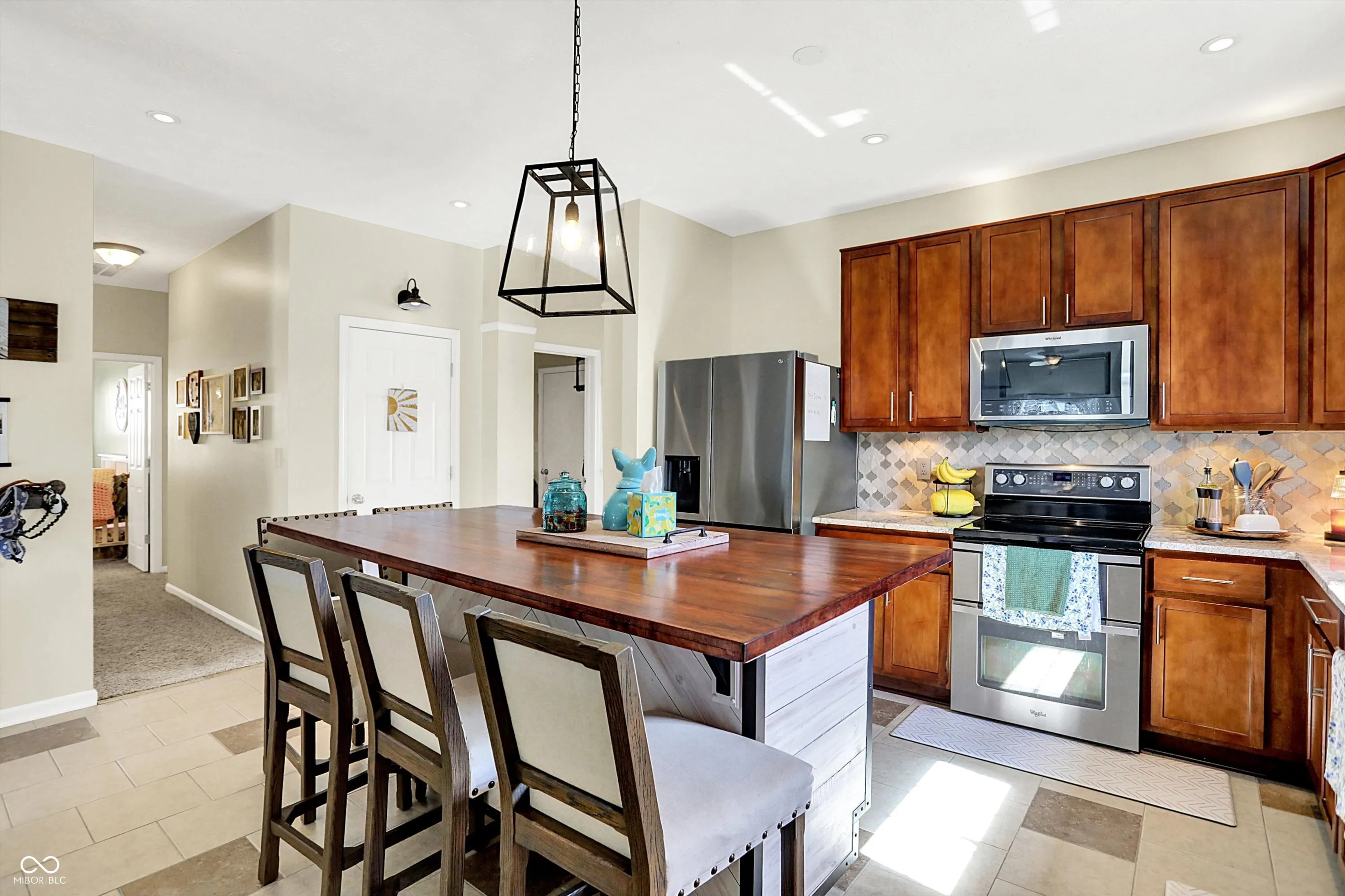From the front door to the back yard party spot you will find an inviting space with neutral decor ready for you to call home. This three bedroom two full bath ranch has been nicely maintained as you can see. The formal dining at the front of the house would make a great office or craft room. Eat in kitchen boasts granite countertops, tile backsplash, double oven range, custom made island with loads of storage and seats FIVE, barstools included. There are several shelves throughout the home that will remain as does the large clock on living room wall made by a prior owner. The laundry includes the front load washer and dryer as well as the shelf that they sit on and wall mount cabinets. Split bedroom floorplan offers some privacy. The Primary bedroom has a cool wood barn door, vinyl plank flooring, walk in closet and private bath including a step in shower. The 2 secondary bedrooms have cozy carpeted floors. Main bath has a custom painted wall. This place is just so clean. Privacy fenced in back yard has a nice patio with a concrete bar, built in grill and prep space as well as a pergola that will stay. Garage is finished out, garage door opener and some ceiling storage racks will stay.