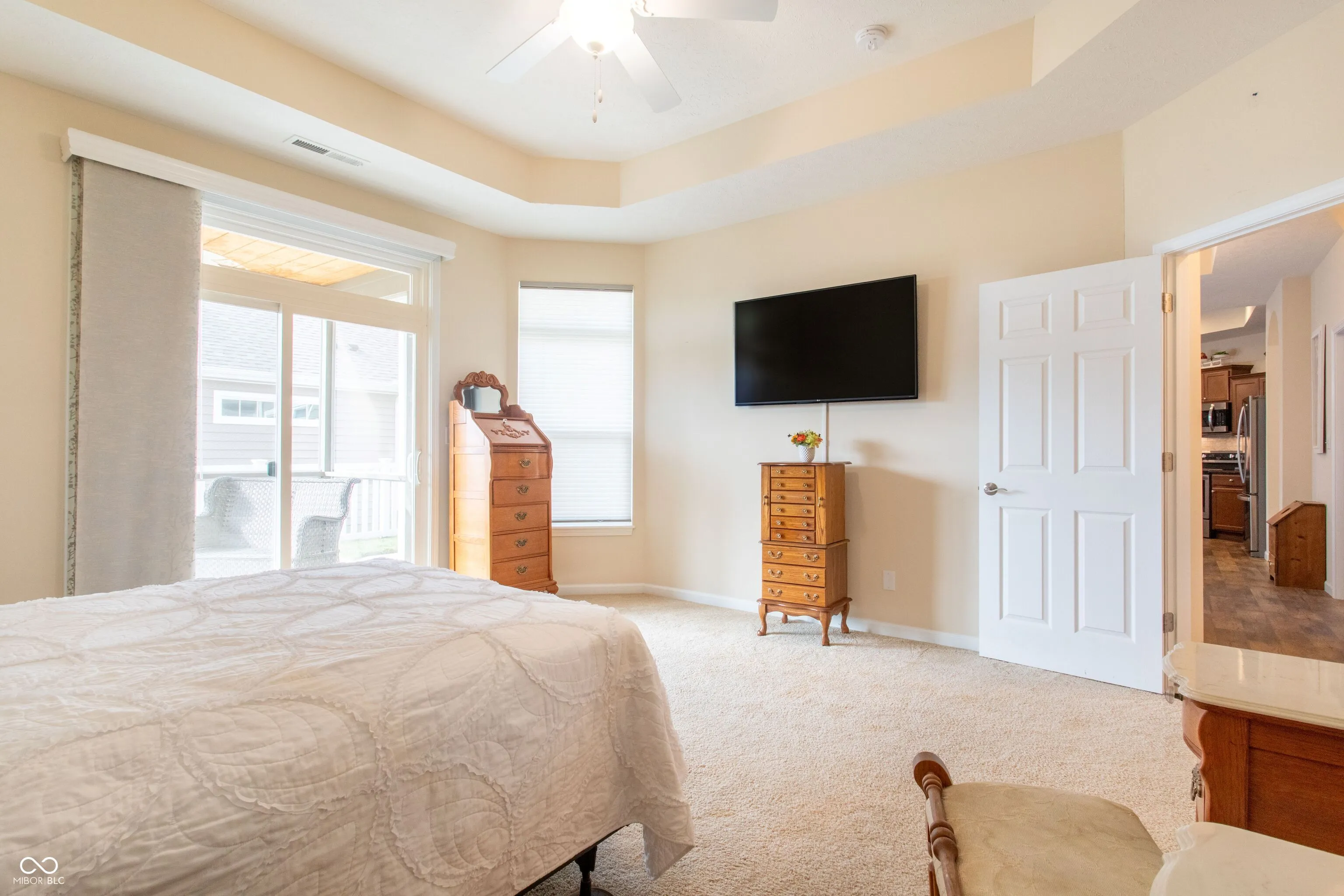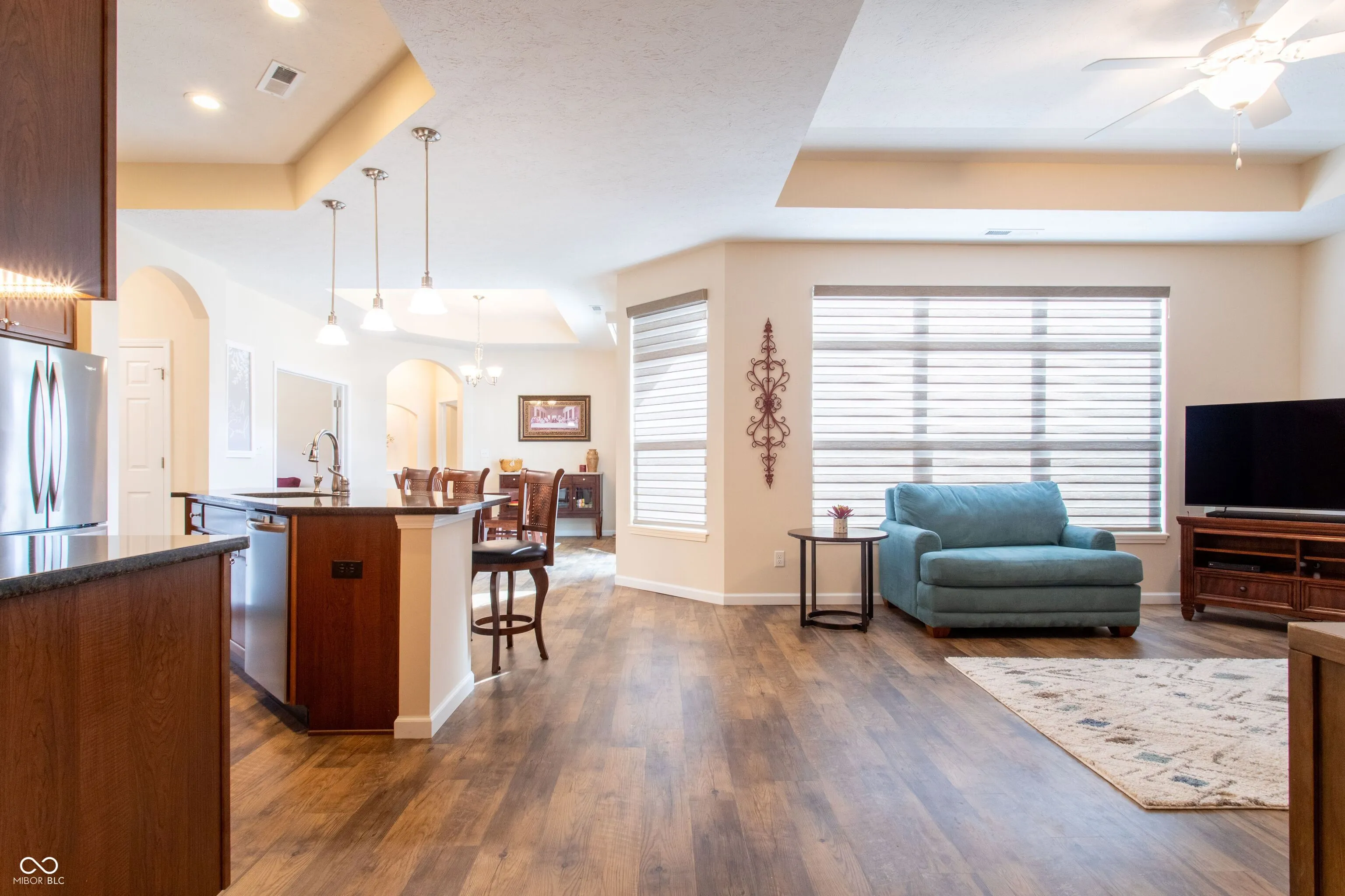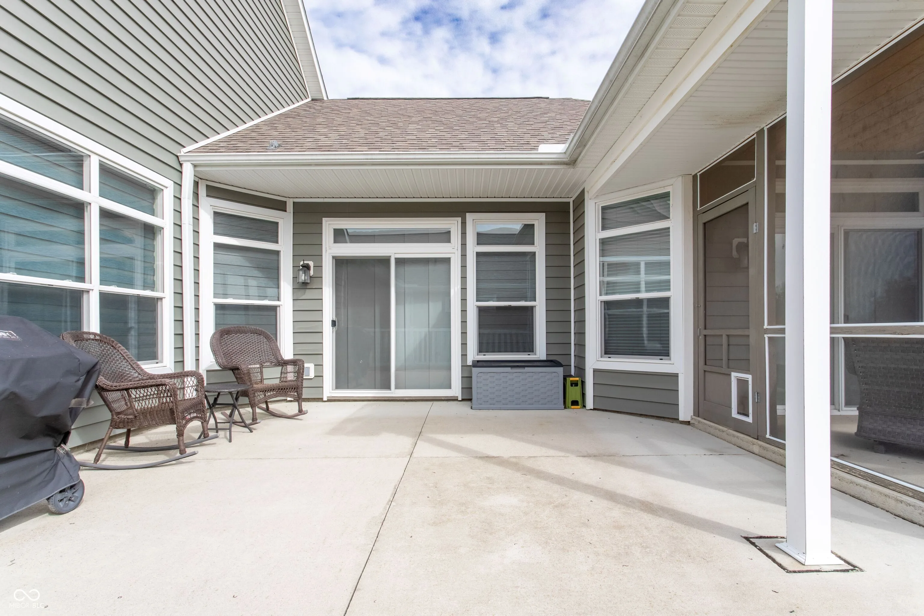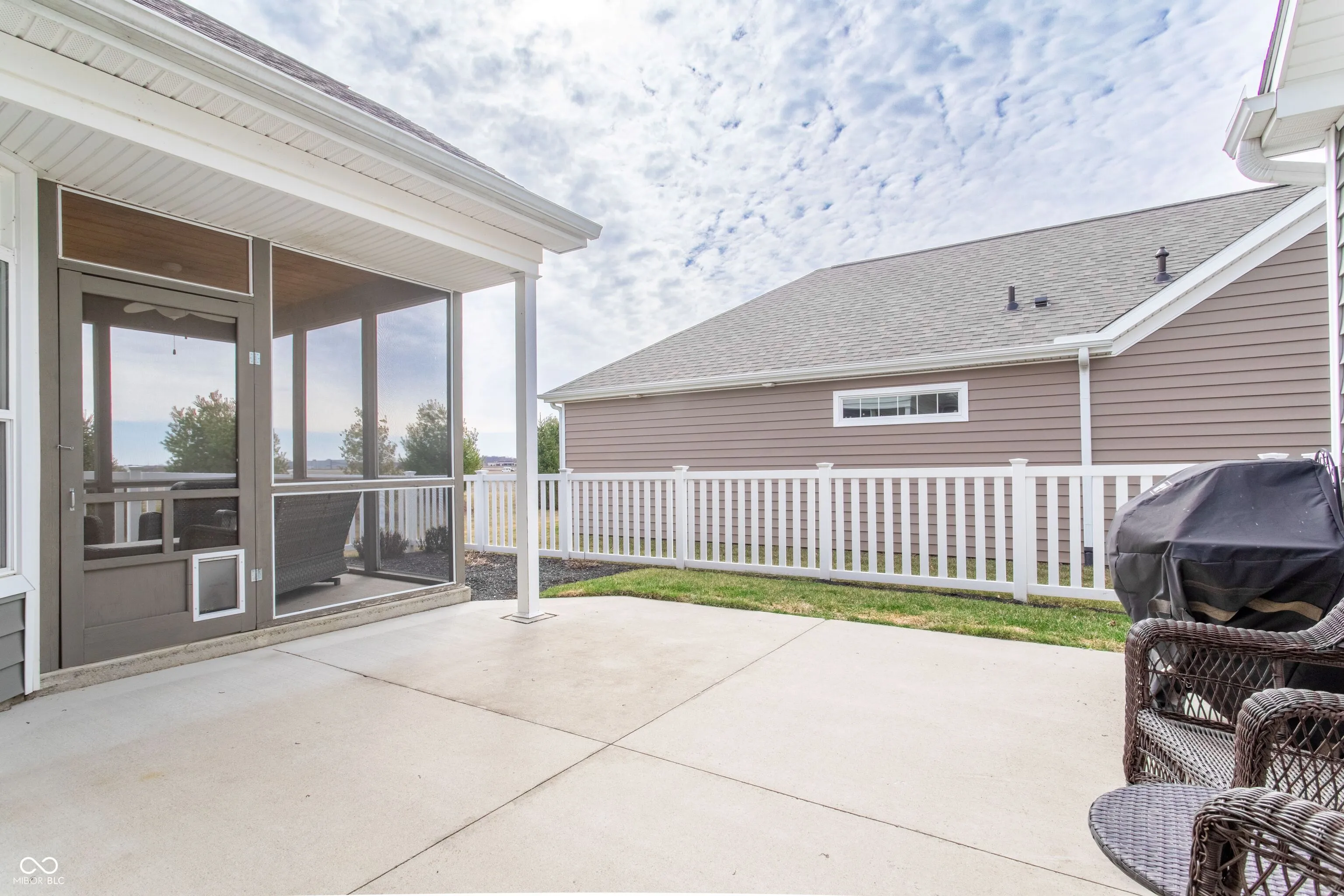 This is the easy life!! Low Maintenance living in this impeccably kept 2bed/2bath + office home with spacious outdoor patio plus a screened porch that backs up to field. This lot location is ideal and has a quiet peaceful feel. 9ft ceilings throughout. Large windows with a ton of natural light and custom remote controlled blinds. Luxury flair with 9ft ceilings, granite countertops, organizers in every closet, on demand hot water heater, water softner, walk-in shower. Open Floor plan is beautiful and spacious and highlights the outdoor patio area which is fenced-in making perfect for small pets.