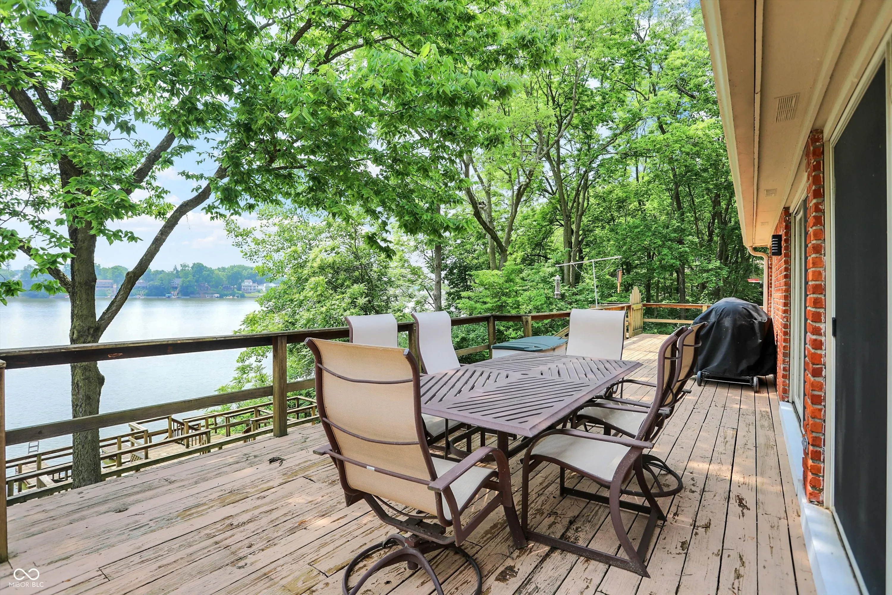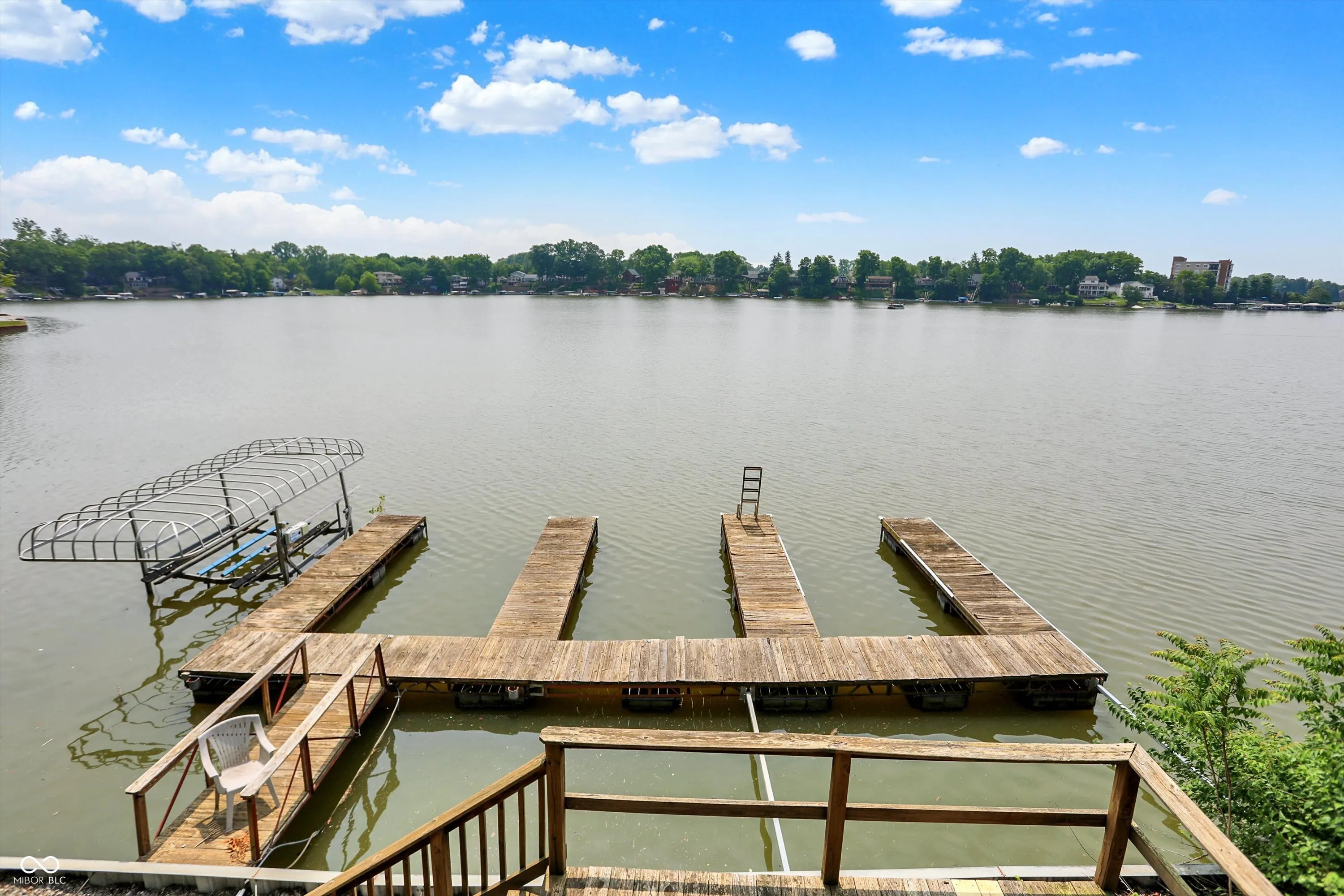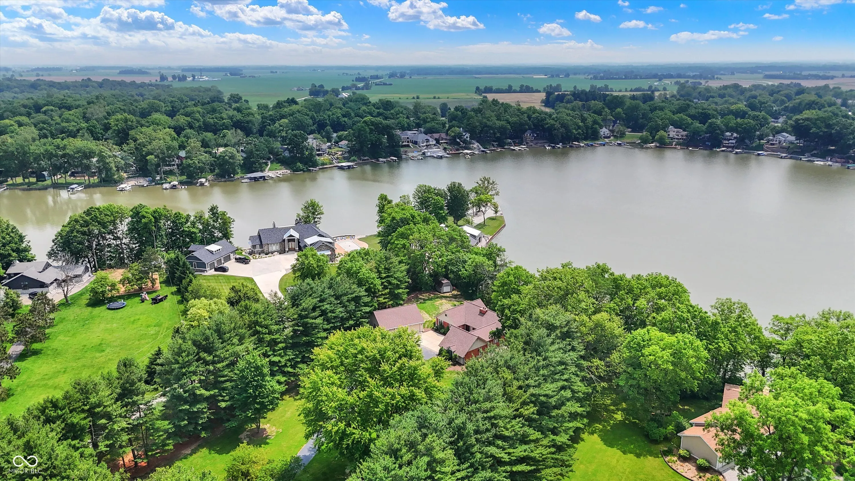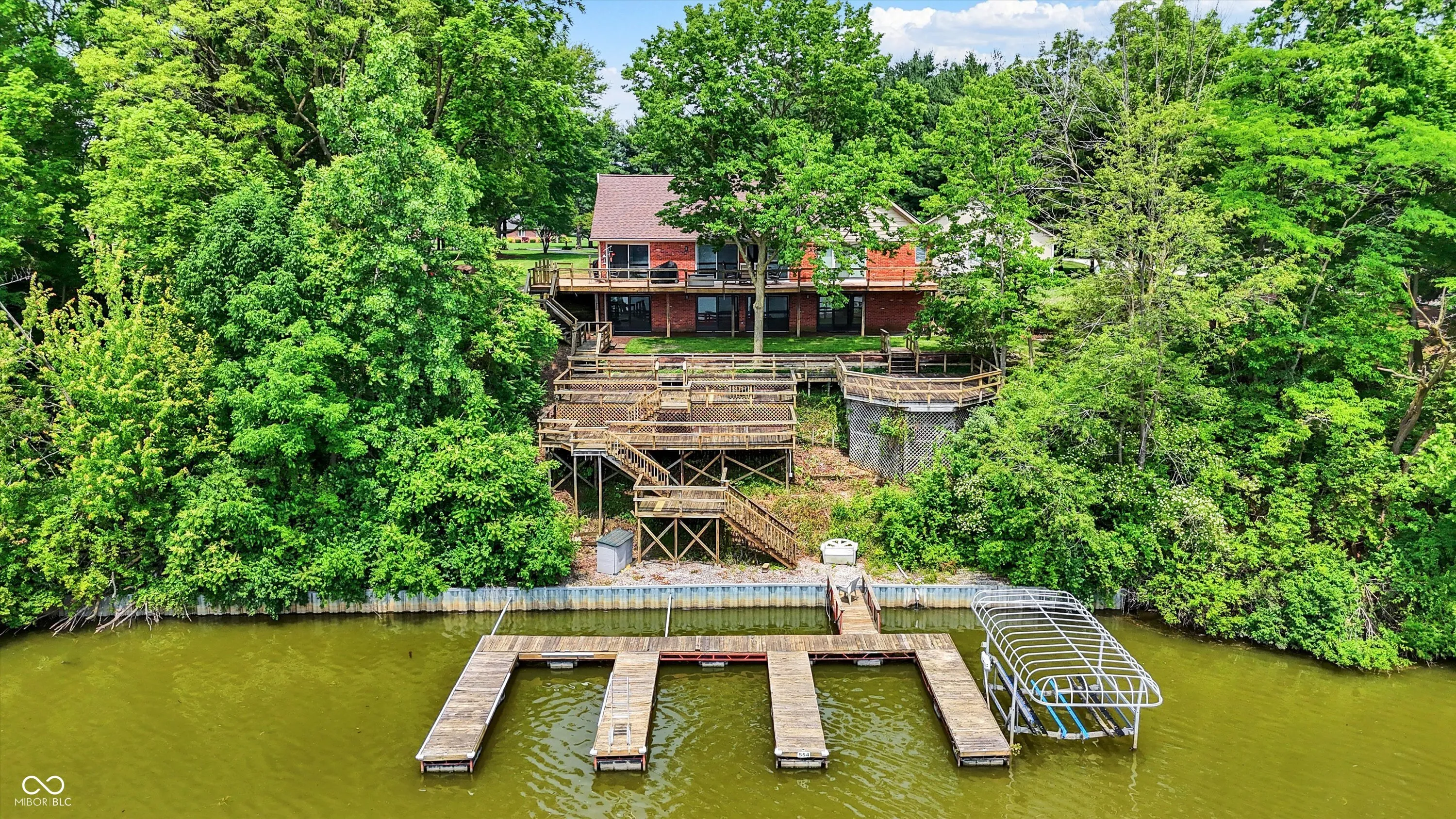 MORSE LAKE WATERFRONT HOME boasts panoramic water view with stunning sunrises! Situated on tree-lined 1.8 acre lot with a whopping 246′ of lake frontage with steel seawall! This beautiful sprawling ranch brick home with finished walk-out lower-level features spacious cathedral ceilings, two fireplaces and a main floor master suite. Center island kitchen and dining room have handsome hardwood floors. Full walk-out lower-level offers well-equipped wet bar with suede finished granite countertops, recreation room, family room with fireplace and a half bath. Tons of room for craft/hobby/exercise room/storage. Geo-thermal HVAC system is connected to commercial grade water heater for nearly free hot water. Zeolite water softener. New hail-proof Owens Corning roof in 2022 and new gutters. Exterior outlet wired for a generator. 2 car attached garage PLUS 3 car detached garage with workshop & HVAC! 4 boat slips with deep water, extra wide 120 ft 4000 lb power lift. Storage shed. Nearby Harbor Trees Golf and Beach Club offering swimming pool, dining, exercise and golf. Also, nearby are Bear Slide and Pebble Creek golf clubs and lots of restaurants. What a great opportunity to begin a legacy of lake house memories for your family! Needs some updates, but priced accordingly. A full price offer would include mower, tractor and pool table.