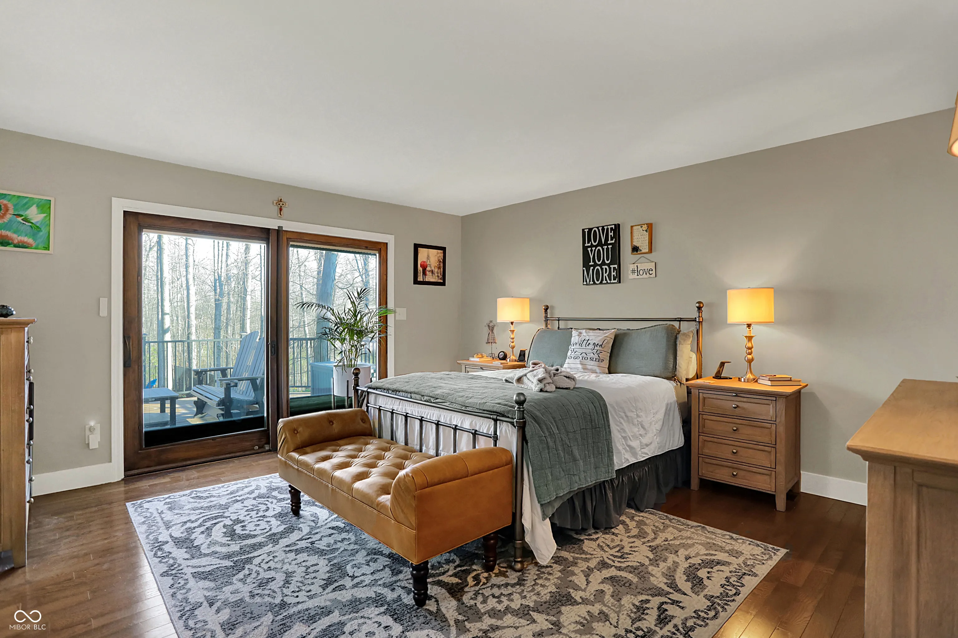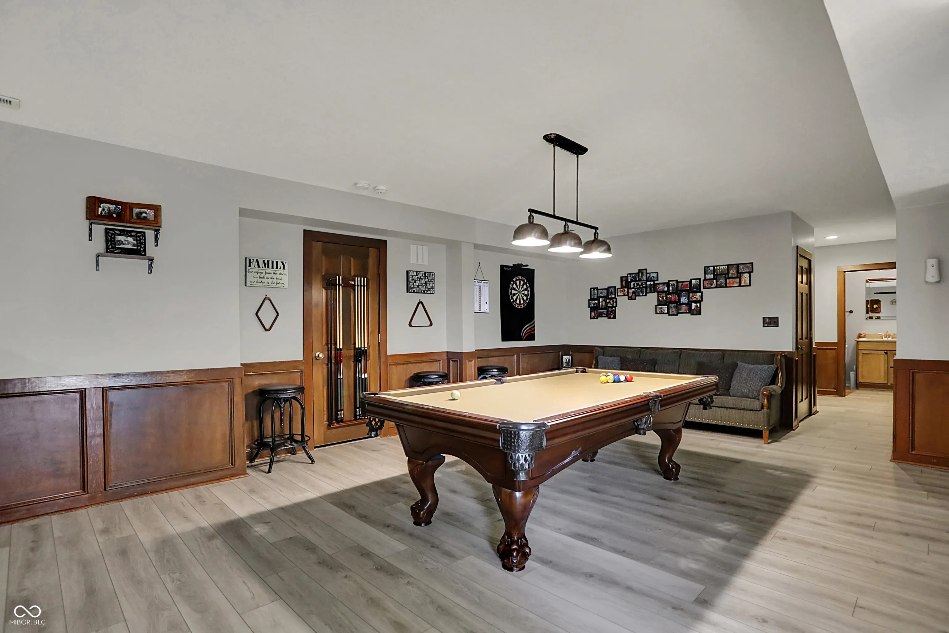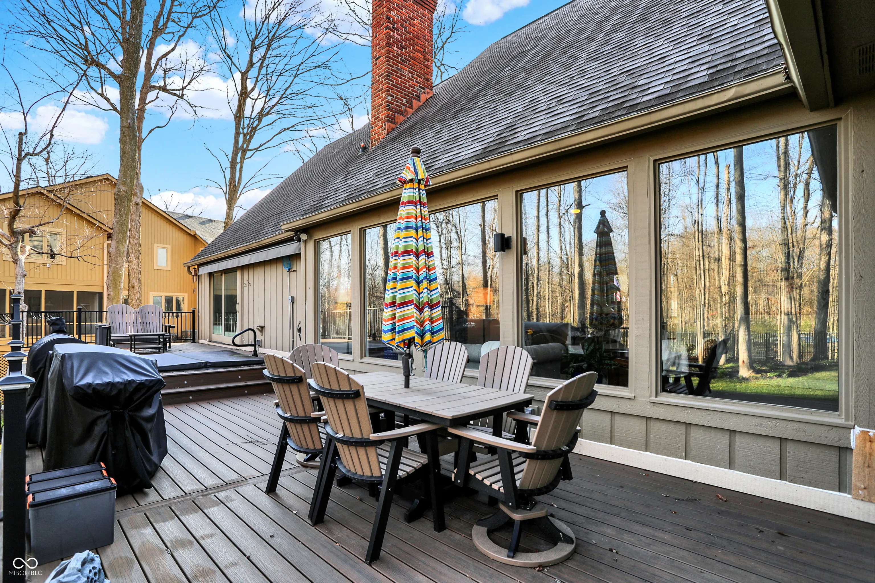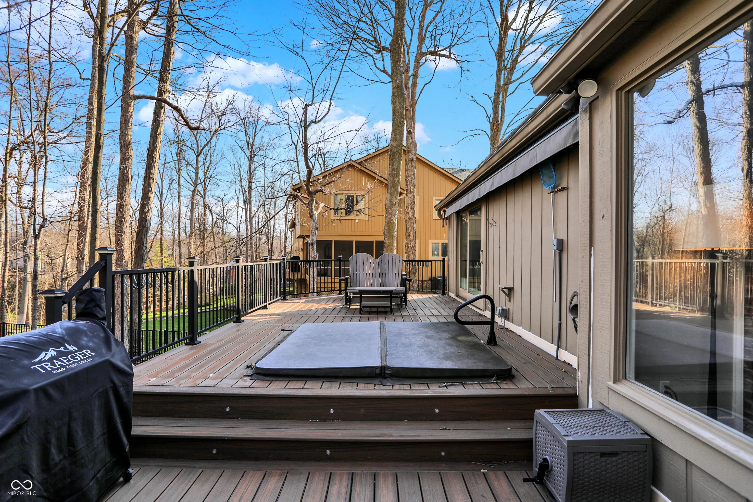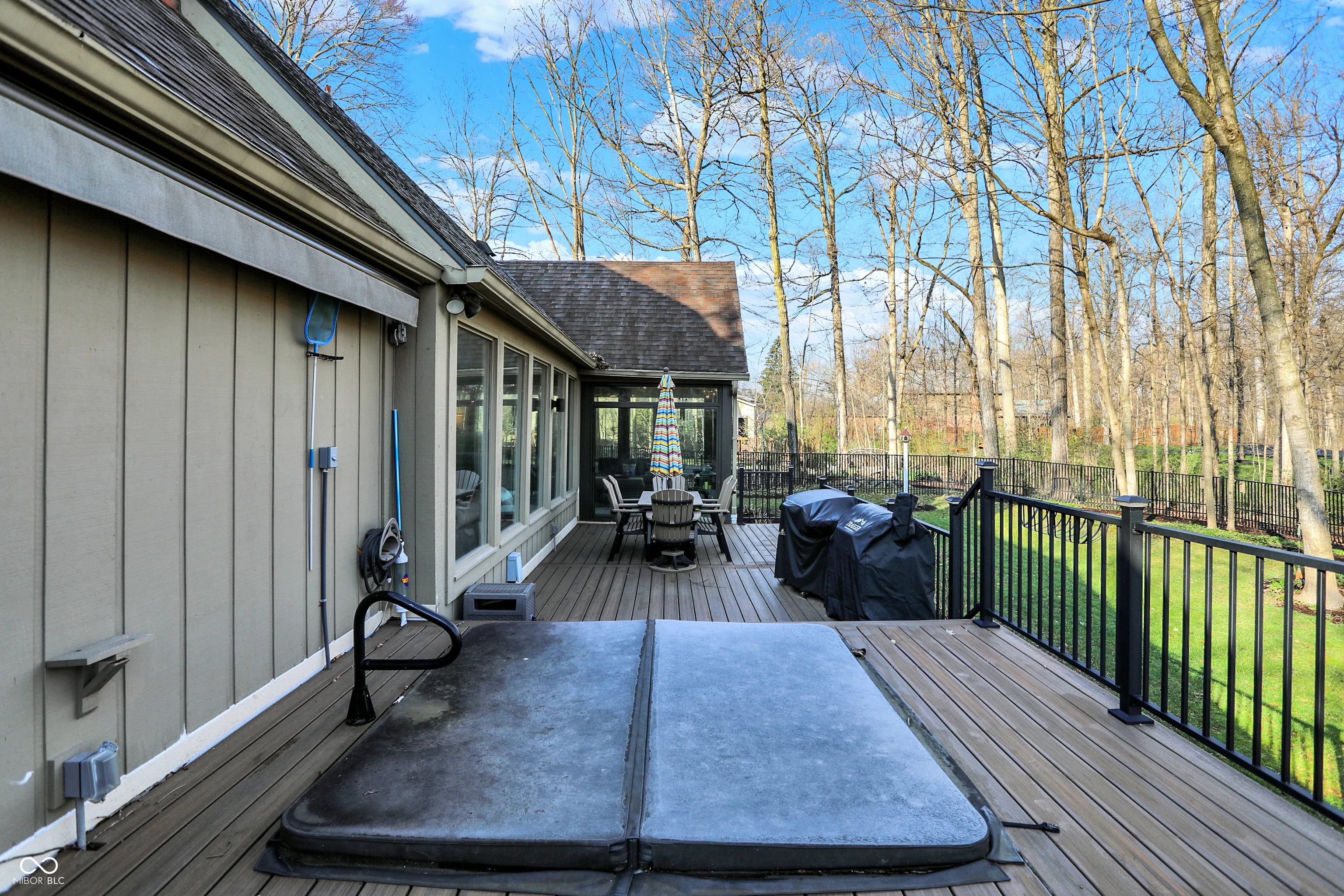 Spectacular custom ranch on cul-de-sac with peekaboo water views across the street in sought after waterfront neighborhood is sure to check all the boxes! Inviting front porch, walkout basement, and fully fenced wooded yard could be yours! Large floor to ceiling windows offer beautiful views of the mature trees in back yard from the moment you enter the home. Enjoy a built in coffee machine in well appointed kitchen. Hardwoods throughout main, upstairs attic space is plumbed for future bath and offers excellent storage. Master bedroom offers ensuite, walk in closet, and sliders to deck along with new motorized awning for extra shade. 4 BR, 2.5 baths, 3 car garage, basement bar and pool table areas, along with a cozy family room with fireplace and custom blinds make for a great family movie night! Outside, you will find a three seasons room with gas stove/fireplace, tiled floors and gorgeous views. In addition, the deck was recently upgraded to offer Trex decking around existing hot tub, offering low maintenance outdoor living, and below the deck/at the walkout sliders you will find some outdoor storage. Easy commute via 96th/Fall Creek access. This neighborhood will immediately feel like home, with its spacious front and rear yards and abounding character!