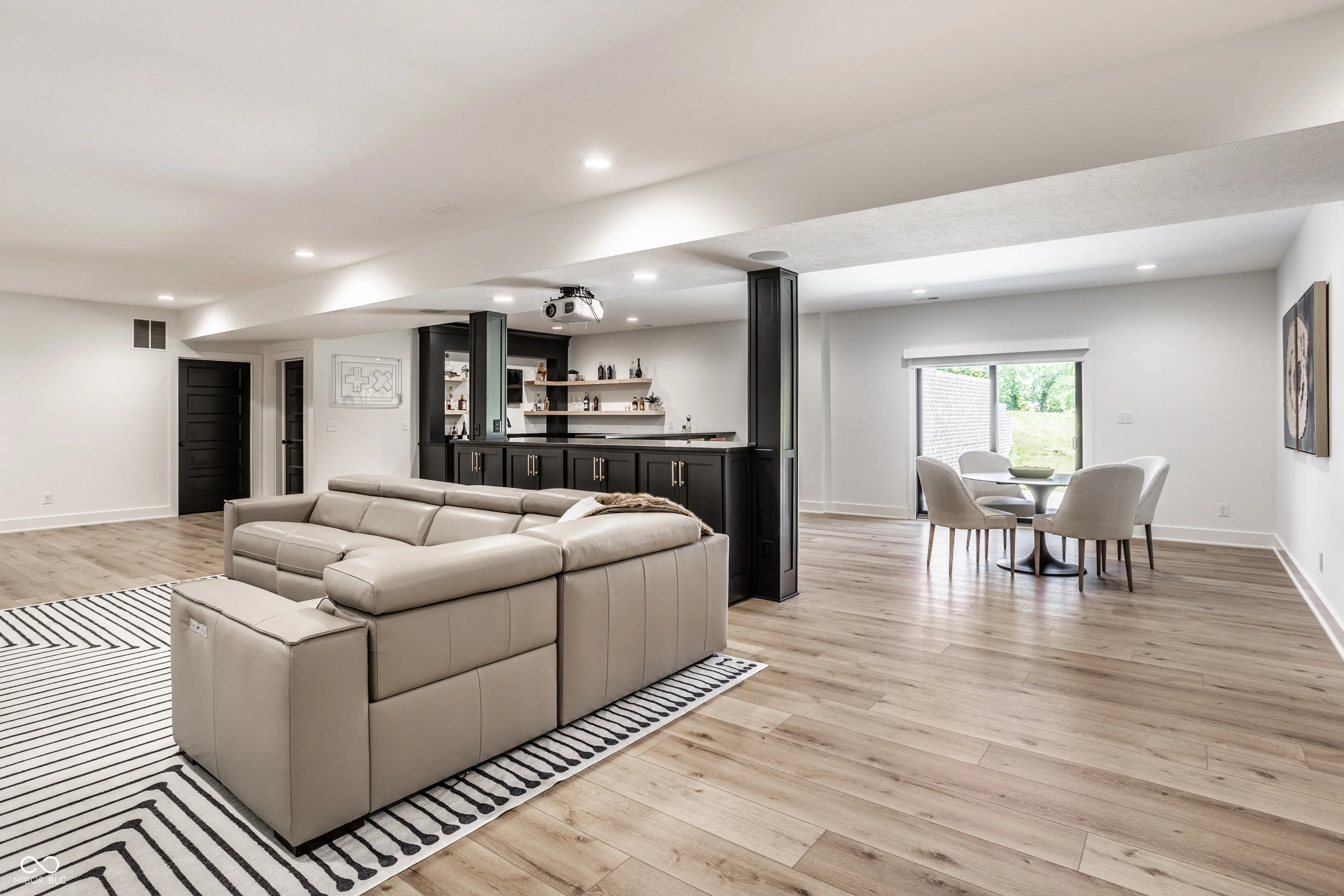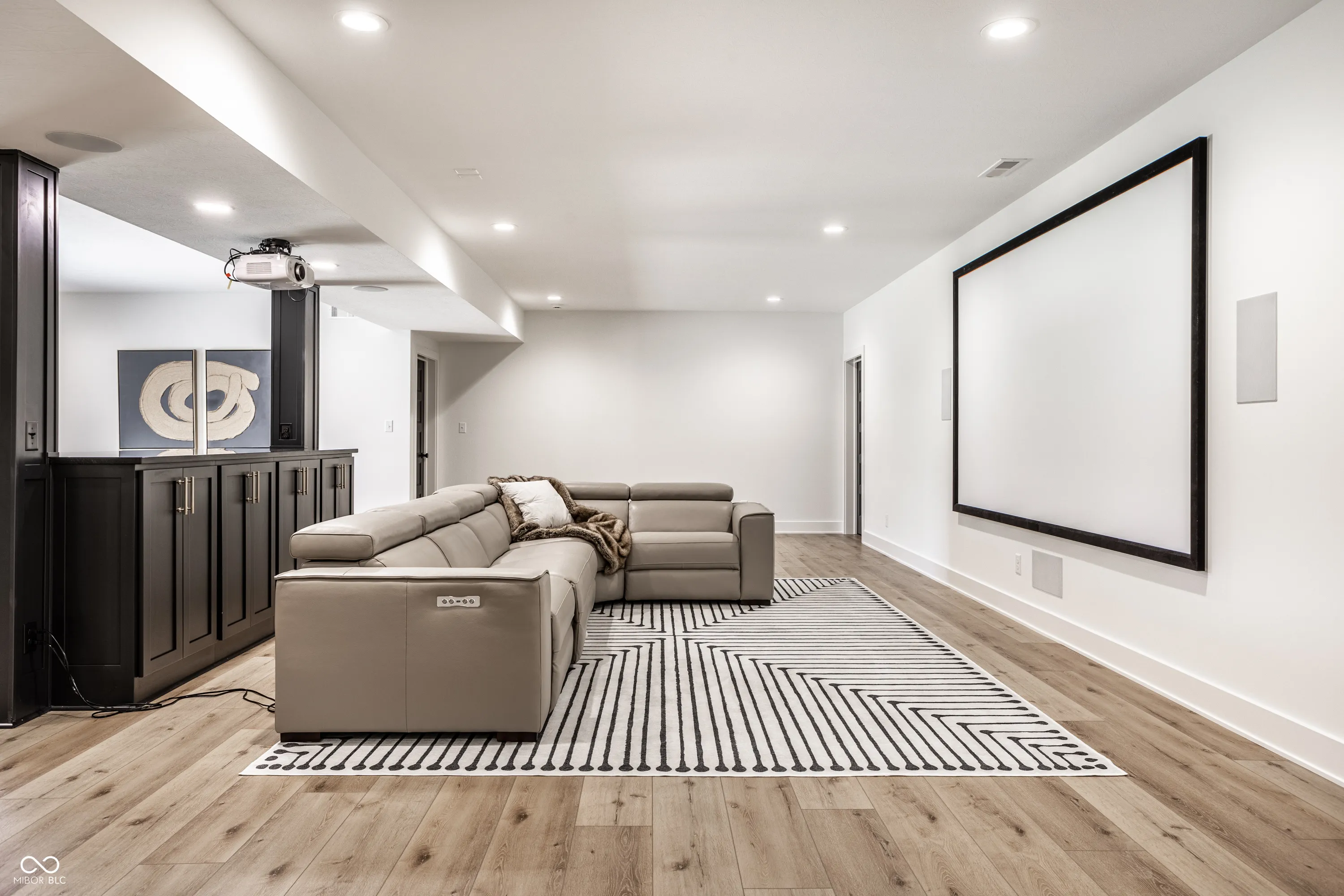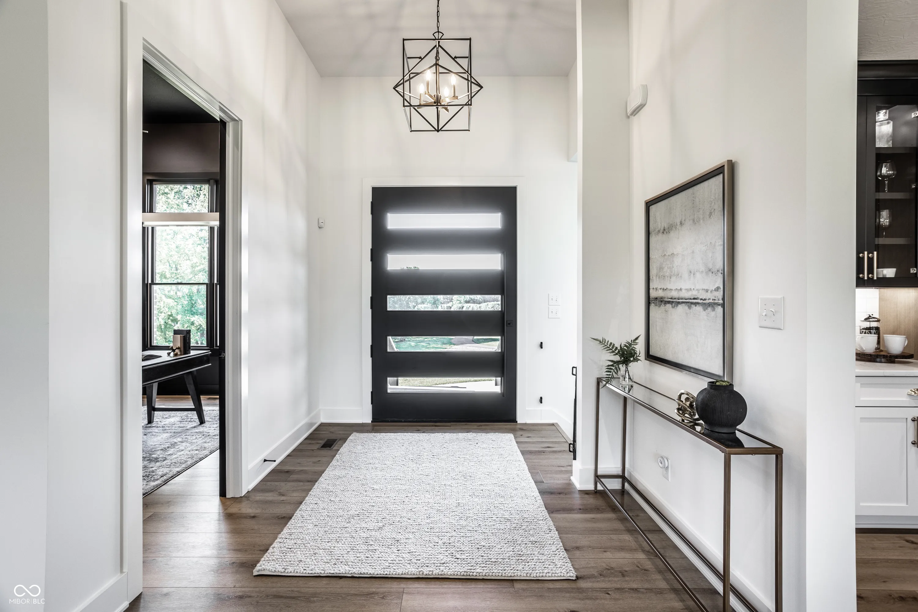 Welcome to an extraordinary modern estate in the prestigious Center Grove School District. This stunning 2023-built residence, set on a sprawling 6-acre property directly across from Center Grove High School, offers an exquisite blend of elegance and timeless design. As you approach the home, a custom 5-foot-wide pivot front door welcomes you, leading into a cozy, moody office with floor-to-ceiling custom built-ins and a breathtaking view of your front acreage, creating an inspiring workspace. The heart of the home features custom white oak cabinets and a unique arched pantry door, adding a touch of sophistication to the modern kitchen. The open-concept great room, adorned with a linear fireplace and large sliders, flows seamlessly onto a beautiful patio with a custom wood-paneled ceiling adding a distinctive charm. The primary suite is a true sanctuary offering a modern spa-like bathroom with a soaking tub under a chandelier, an oversized shower with dual shower heads, and a rain shower, providing ultimate relaxation. The harmonious blend of white, black, and oak tones throughout the home creates a beautiful and modern aesthetic. Descending into the walk-out basement, this expansive area includes a large entertainment space with a projector that stays with the home, perfect for movies and sports, a complete bar area, and a sizeable patio for outdoor enjoyment. Combined with the whole house speaker system, this estate is entertainment-central! Not to mention over 1,000 sq ft of unfinished space to add a gym, 5th bedroom, etc! The four-car garage offers an EV charger, ample space for vehicles and storage, and is ideal for car enthusiasts or large families. Don’t forget about the custom dog wash area in the garage as well! The expansive 6-acre property is like nothing else. Its the one you’ve been waiting for! Pictures 54-61 are virtual reality renderings of possibilities, not present and not included in sale.