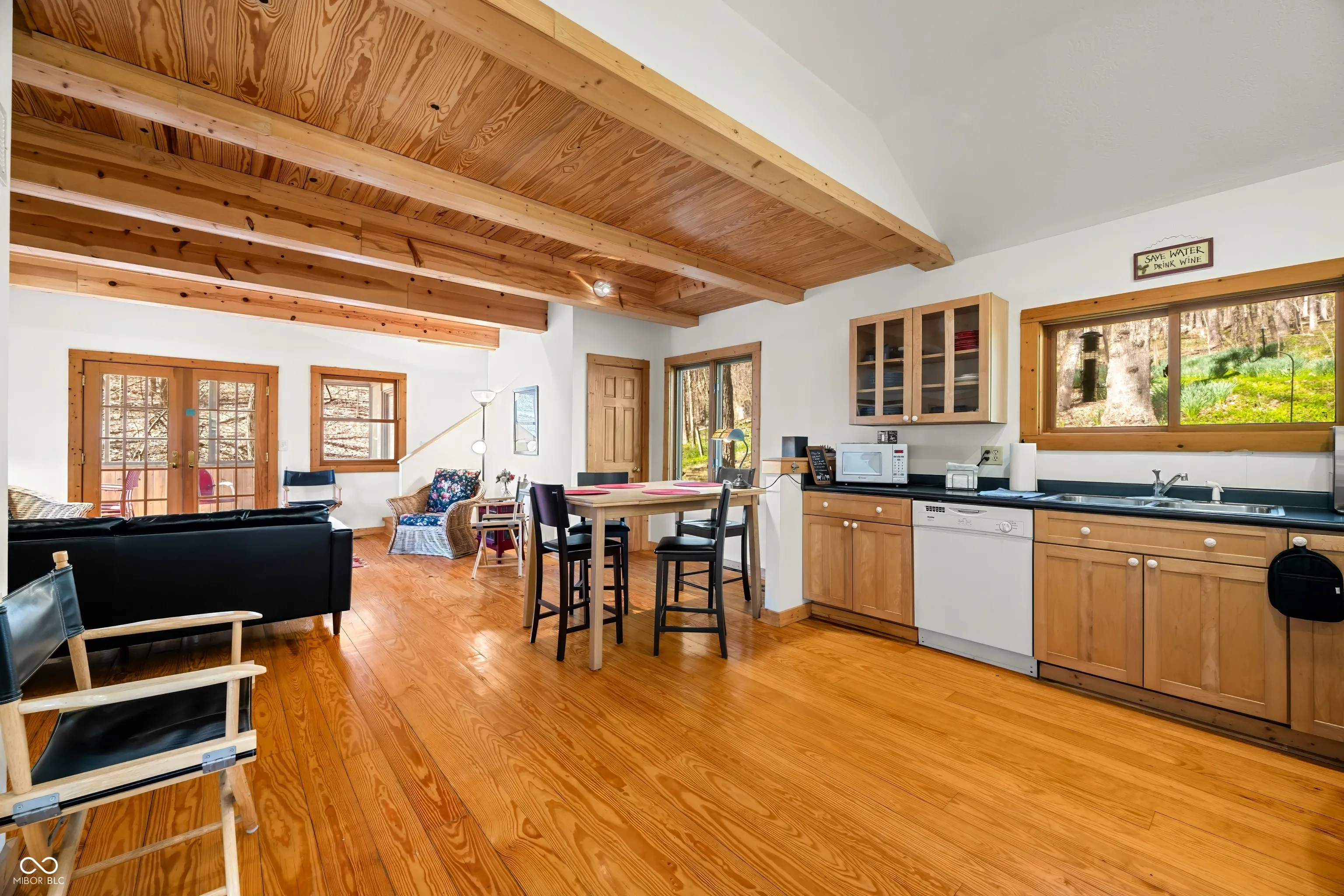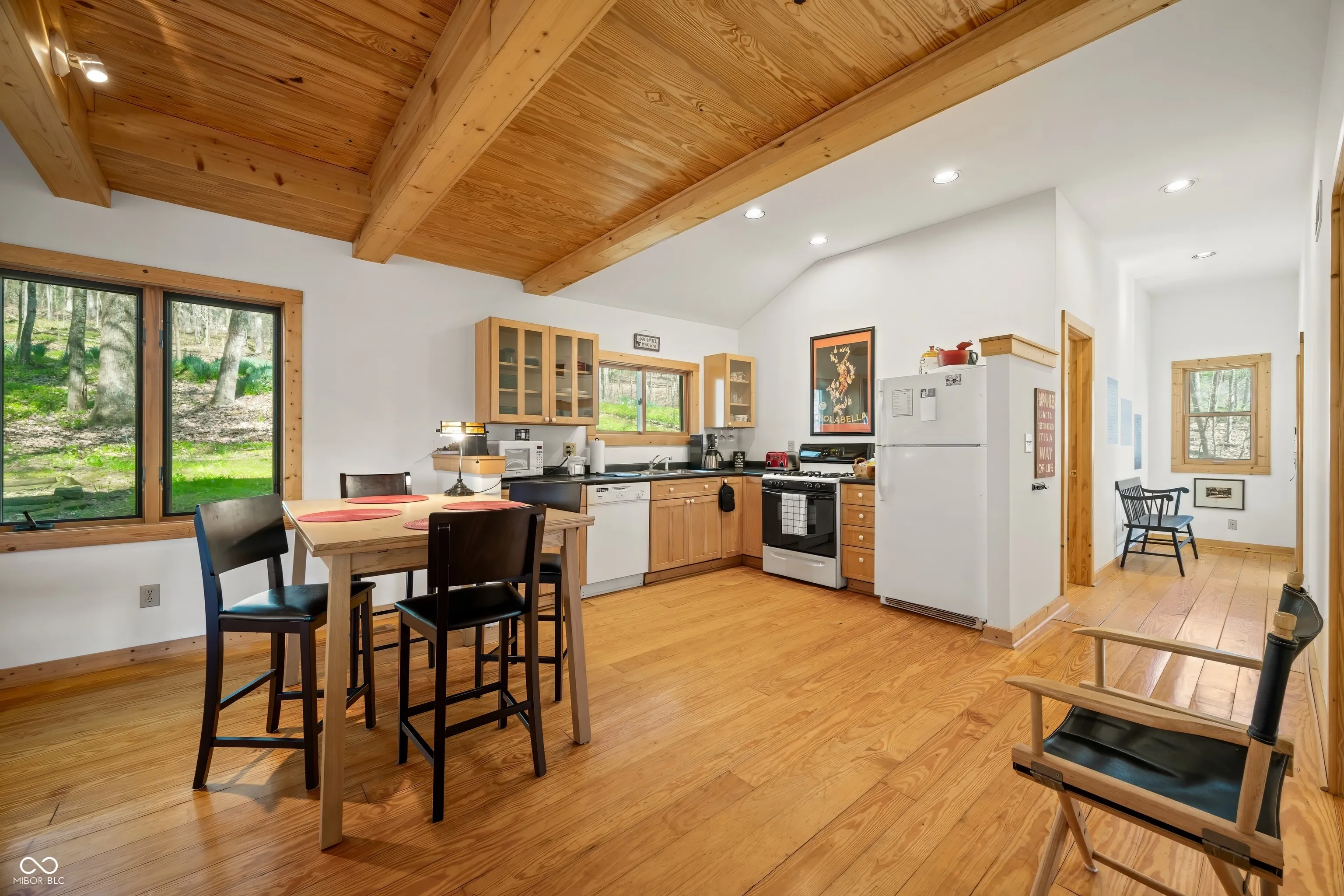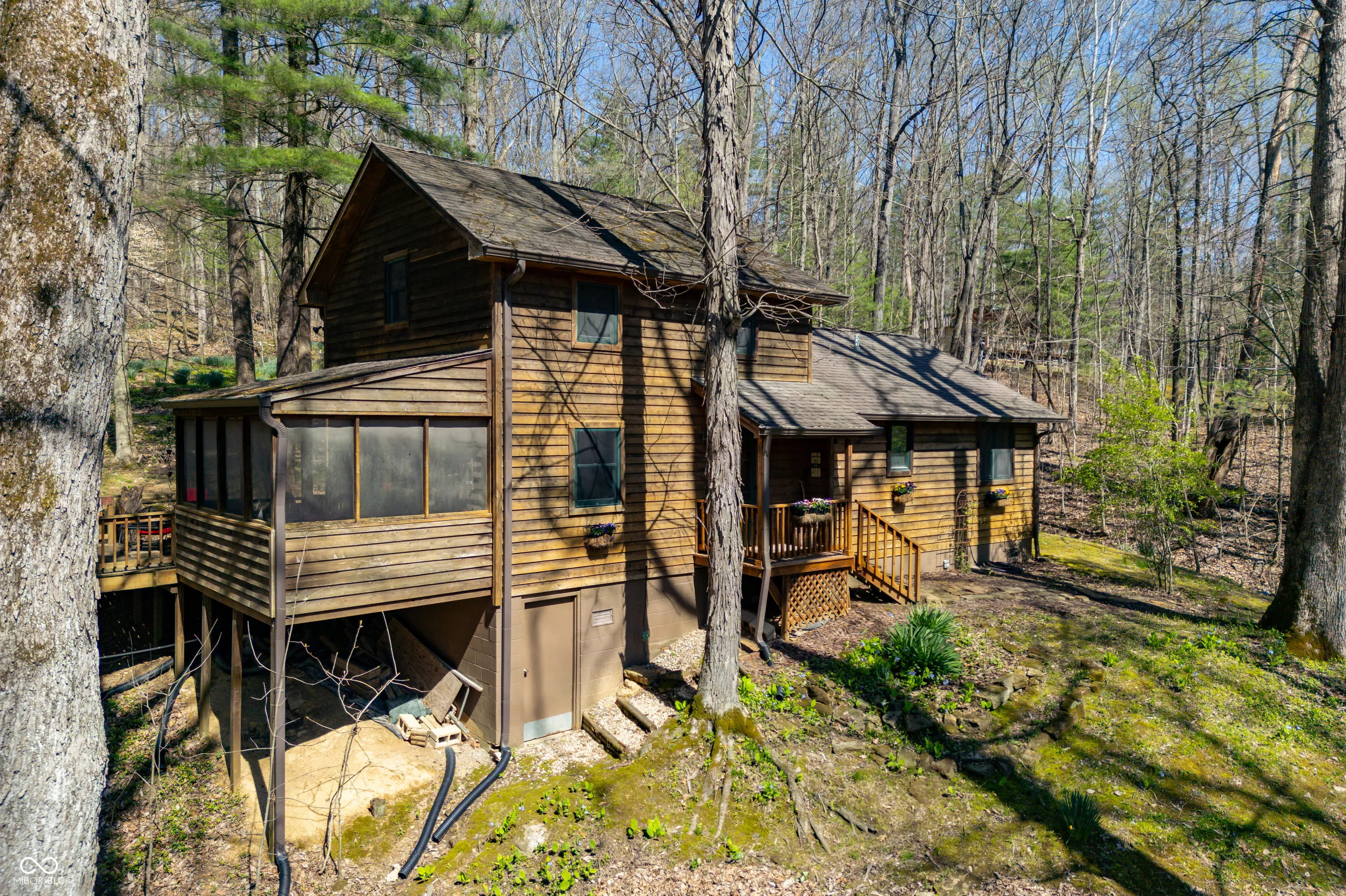 This is the one that you have been waiting for. Well maintained 2 bedroom / 2 bath home. Nestled in the woods and located on an easy to maintain two acre parcel just up the road from Yellowwood State Forest / Yellowwood Lake and positioned between Nashville and Bloomington. Wonderful place to get away from all the stresses of life and relax with nature. Inviting covered porch leads to the open living / dining / kitchen area for socializing and catching up friends and family. Well appointed kitchen with glass front cabinets, gas stove, dishwasher and refrigerator. All appliances included as well as furniture and housewares. Bright and light interior with recessed lighting. Raised ceilings. Pella windows. Solid six panel wood doors. Wood trim. Hardwood floors in most rooms. Spacious main level bathroom with tile flooring. The bonus room houses the washer and dryer and is set up for pantry and storage use. Nice sized bedroom on the main level. Primary bedroom upstairs with attached private bathroom with tub. The screened porch and wood deck provides ample space for grilling and eating outdoors. Warm up around the fire pit and roast a few marshmallows or enjoy your favorite snacks and beverages. Daffodils in the fenced back yard area help welcome in Spring along with bluebells in the front yard. The property is turn key ready. Make your appointment to see this beauty today!