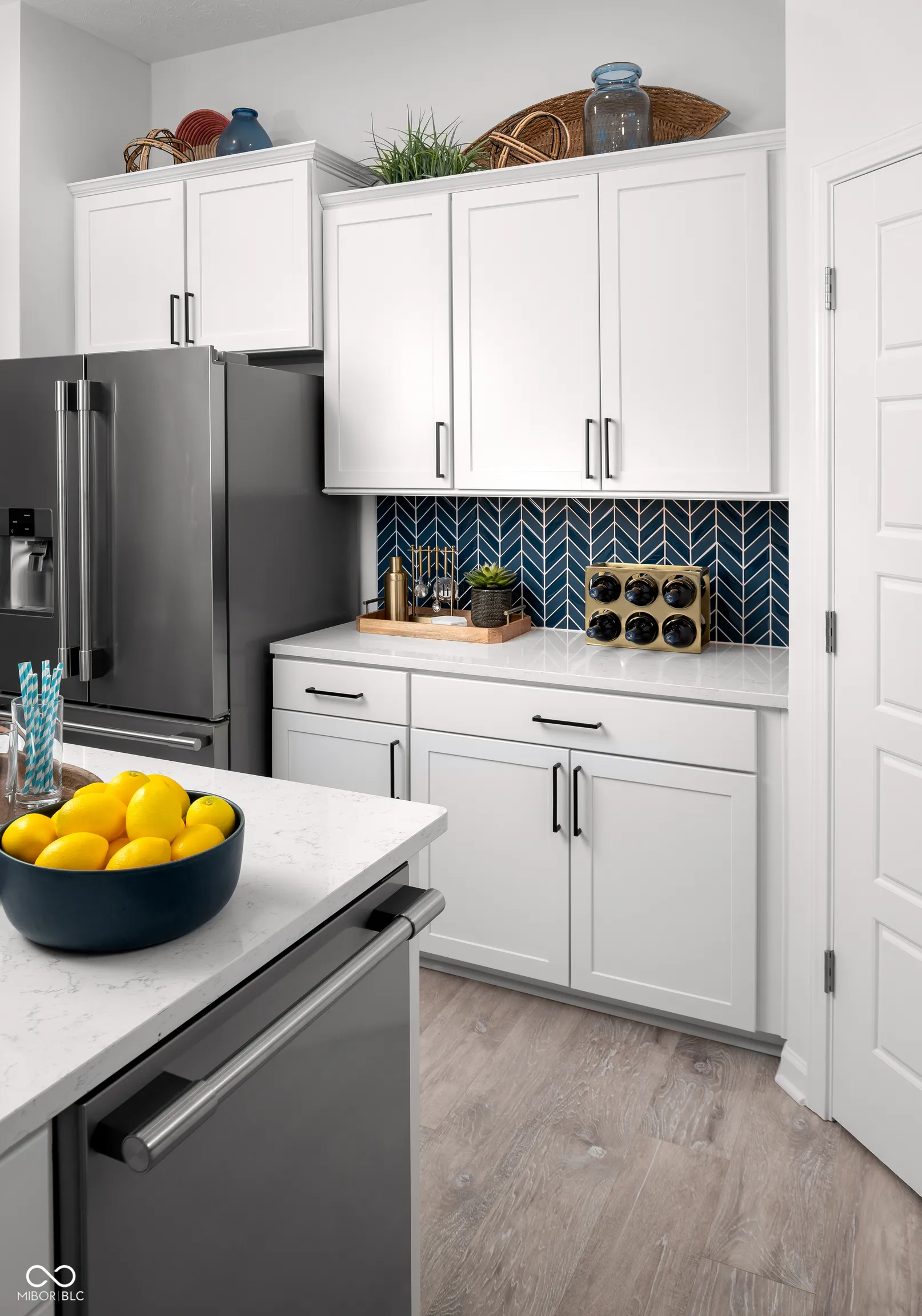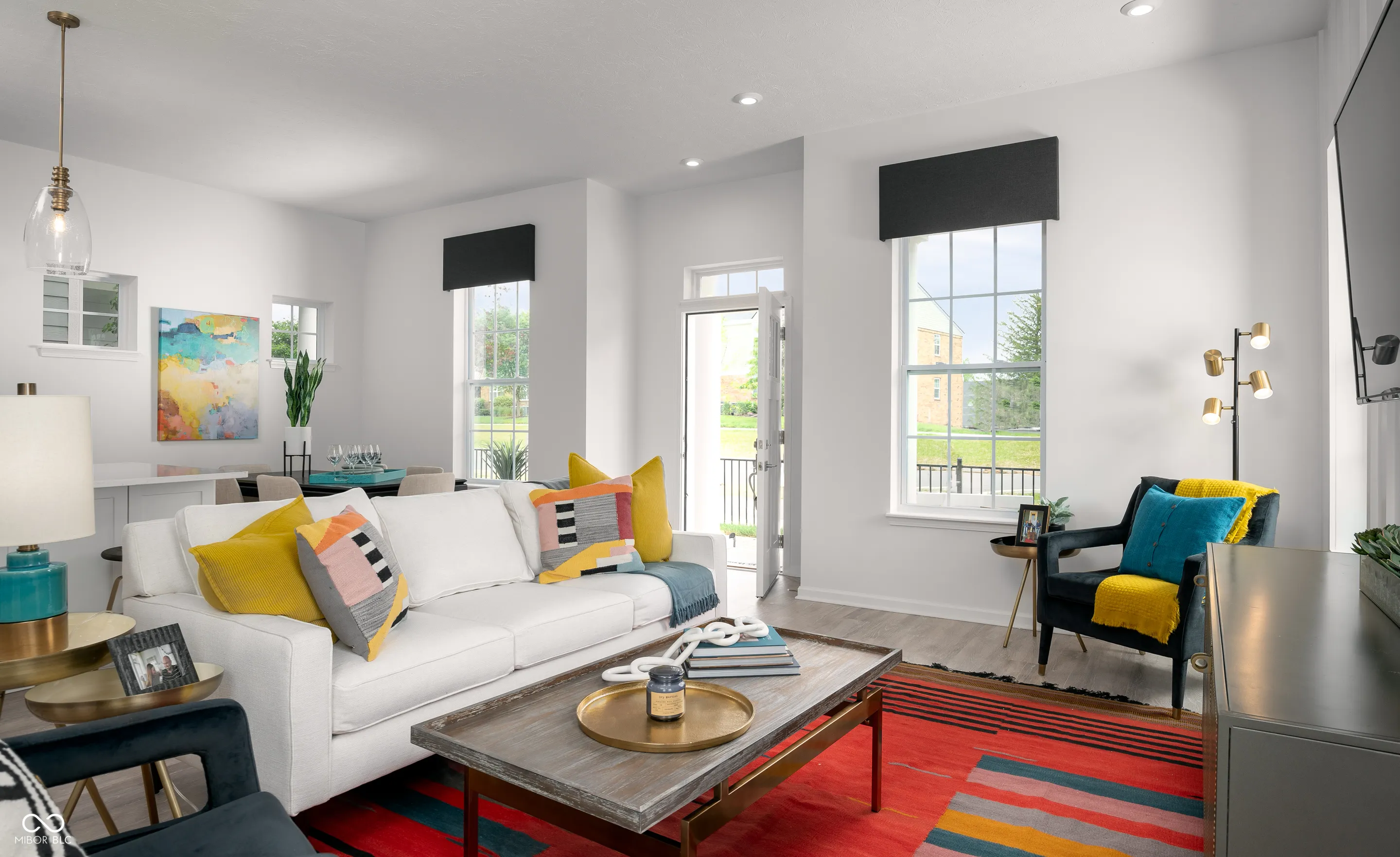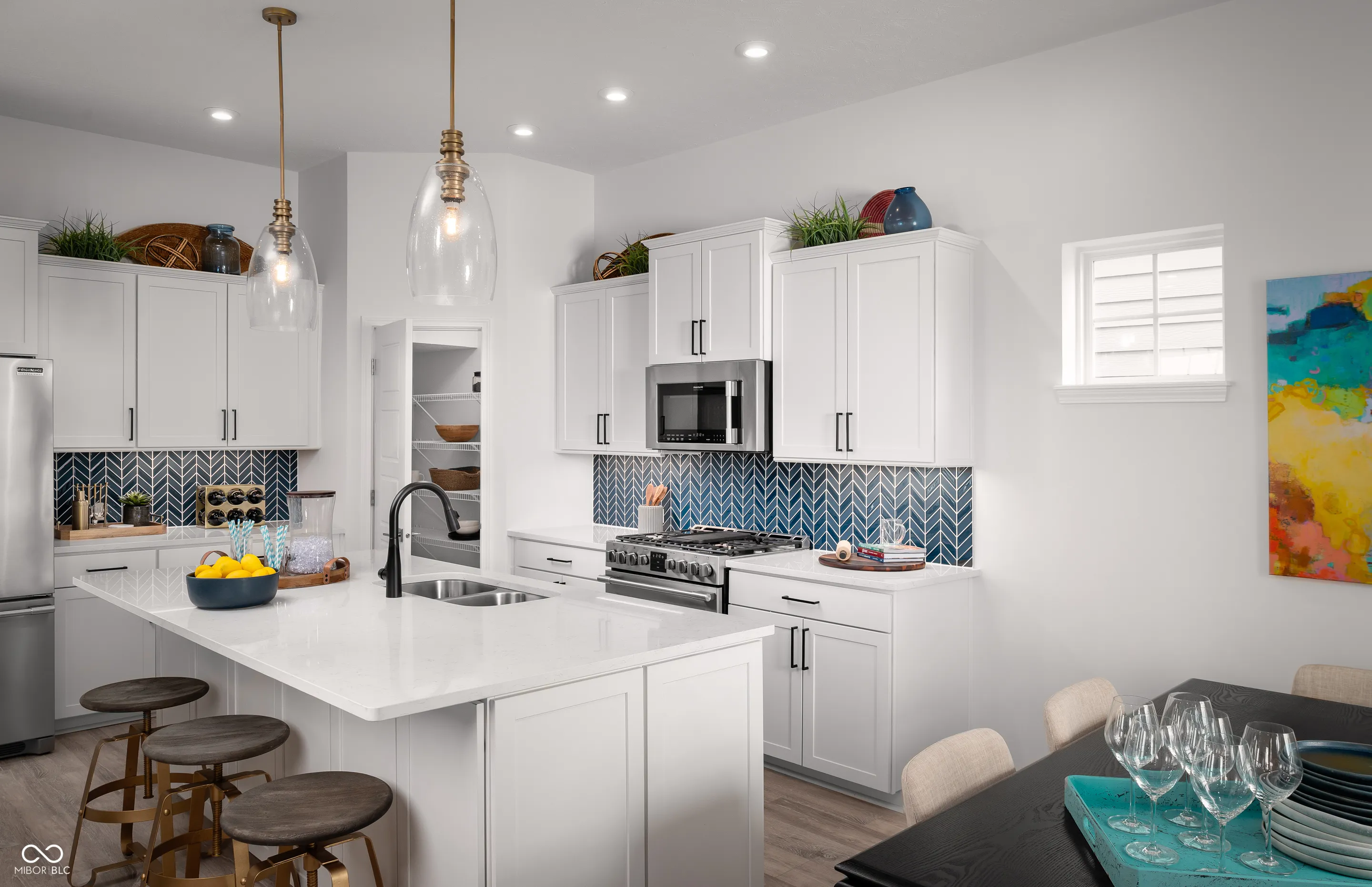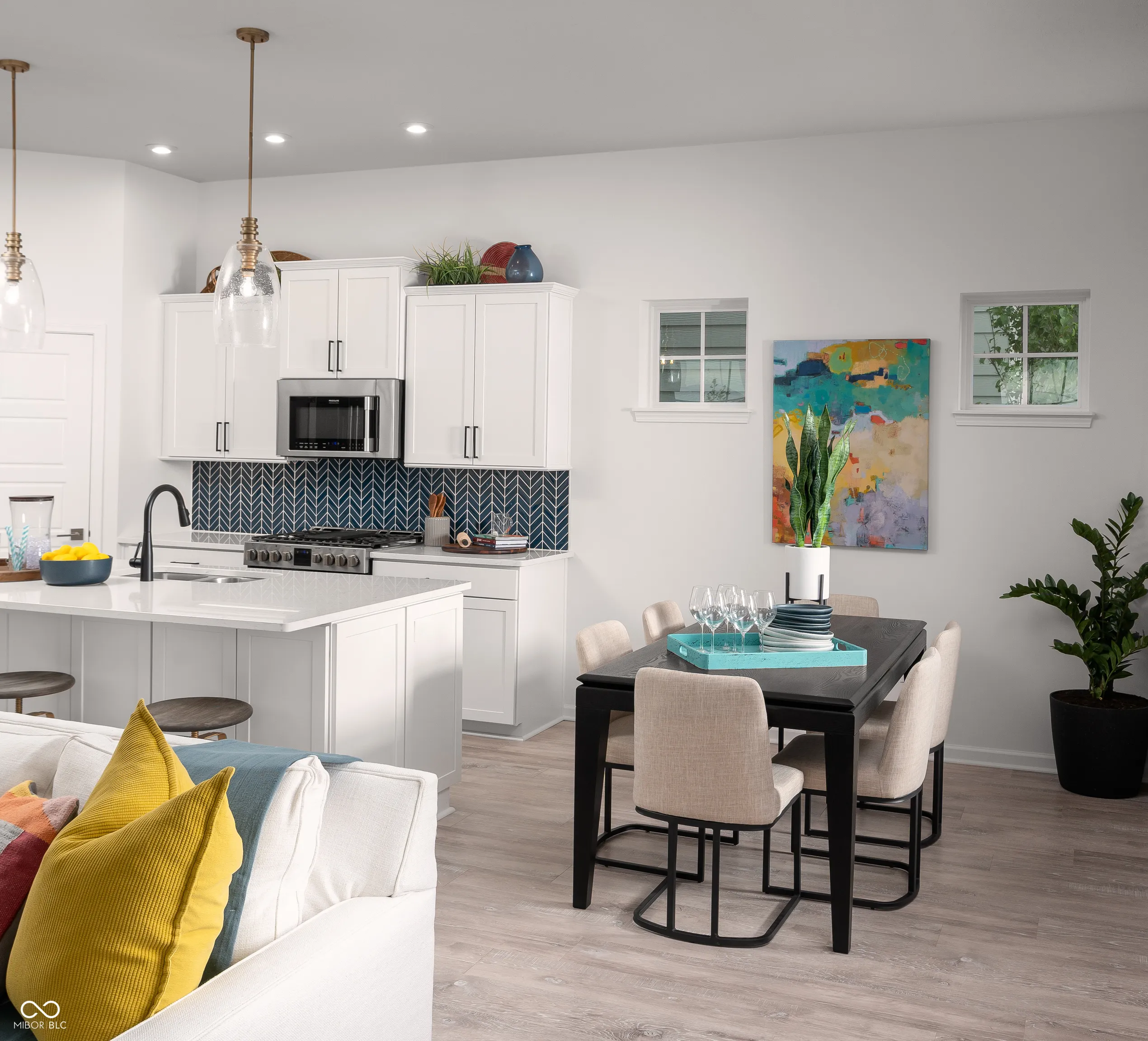 Beautiful, vibrant and filled with light model home in the heart of Carmel! This Startex floor plan will delight with 3 bedrooms, 2 and a half baths and a two-car 10′ ceiling finished garage. The garage comes with sound surround, extra lighting and windows with blinds, two remotes and one of a kind designer decorative faux brick wall. The spacious main level features 10′ ceilings and comes with an abundance of beautiful white quartz counterspace throughout and a large matching white quartz kitchen island to gather around with friends and family with great views throughout. This home features trendy kitchen cabinets, captivating kitchen backsplash, luxury laminate wood flooring in main areas, stainless steel appliances with gas range. Main bedroom comes with tray ceiling and a large balcony. Super shower, mini business/music center in the loft area and walk in laundry are just some of the additions. Our homes feature 9′ and 10′ ceilings throughout the entire home! Furniture and decor are included! There are too many upgrades to list! Come and see it asap! Community pool and a pool house are our top amenities, and you will be within walking distance to the Palladium, Monon Trail, Farmer’s Market, gourmet restaurants, Arts and Design District and all that downtown Carmel has to offer!