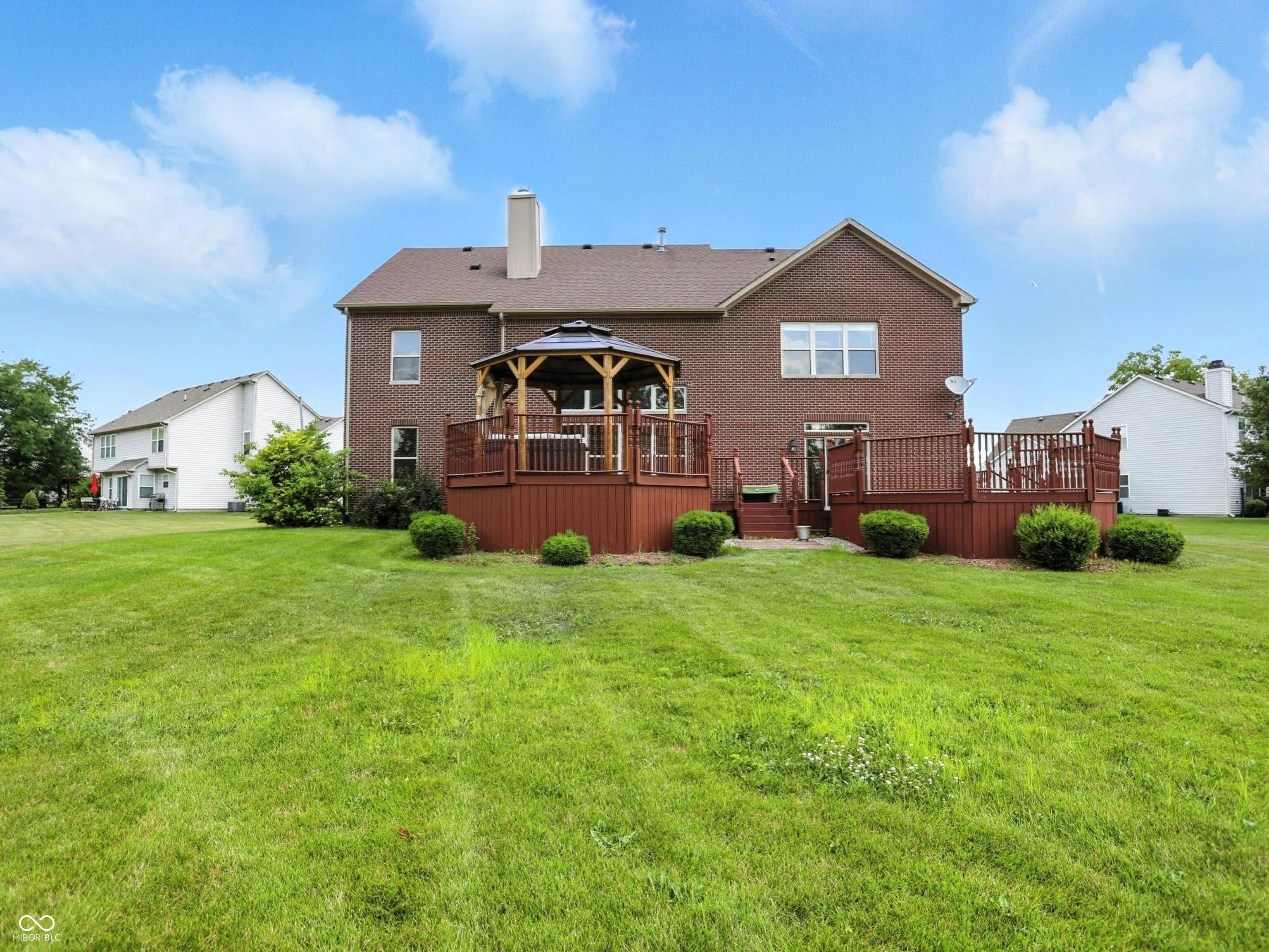 Entering this light, bright & spacious, custom-built brick home, you notice the details right away- Arched entries & windows, wood trim & crown molding, Brazilian hardwood floors, a soaring 2nd story ceiling, with an open walkway above. Separating the main level office & great room is a double-sided fireplace that extends all the way up to the 2nd story. Custom built-in bookshelves flank each side of the fireplace in both the office & great room. The kitchen boasts plenty of space for hanging out & cooking with family, w/ granite countertops, tiled backsplash and raised-panel oak cabinets. Exiting the kitchen, one can relax out back on one of the dual raised decks, under the gazebo. The huge .87 acre lot provides lots of opportunity for creating additional outdoor areas to enjoy. The open walkway connects the upper-level bedrooms and lets in light. Bedrooms 2 & 3 share a Jack-n-Jill bath, while the 4th bedroom has its own full bath, ensuite. Relax in the Primary bedroom w/ vaulted ceilings & a modern accent wall. The adjoining master bath has a dbl-vanity, a separate tiled shower w/glass doors, a jetted tub and an impressive walk-in closet. The fully finished basement w/ 9ft. ceilings and egress windows, includes a large main room, 2 bedrooms, 1 full bath, and a room w/closet that can be used for storage, media room or playroom. The home is equipped with a sprinkler system, tankless water htr, dual furnace & AC, like new carpet, alarm system, & more.