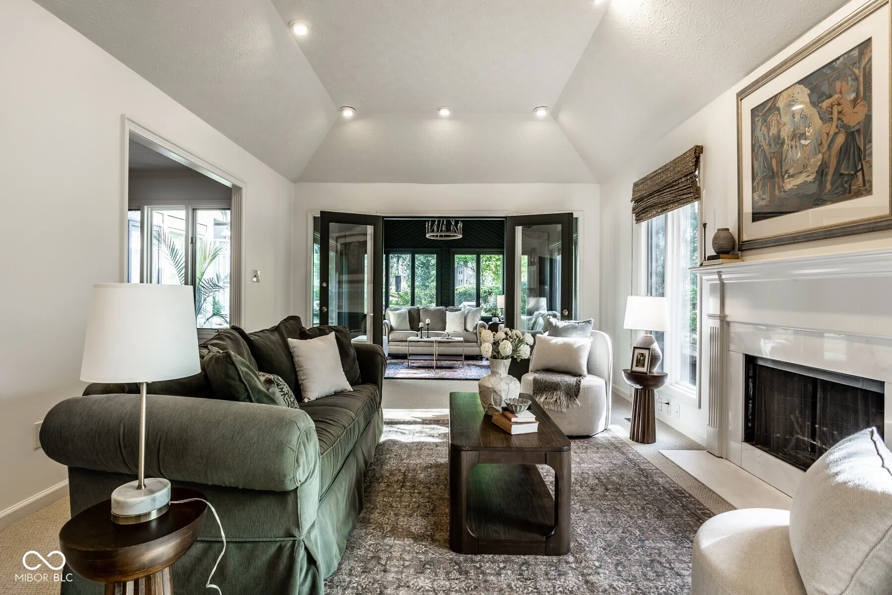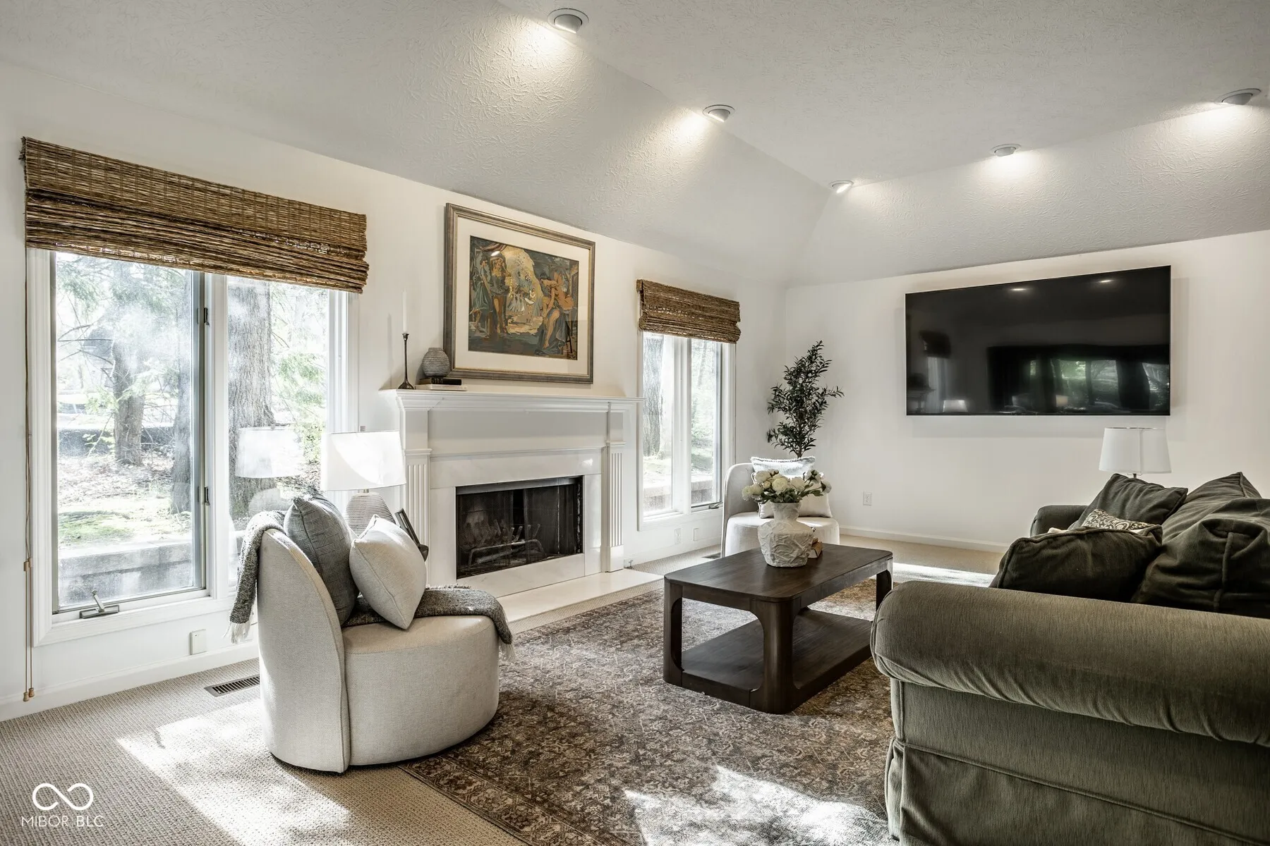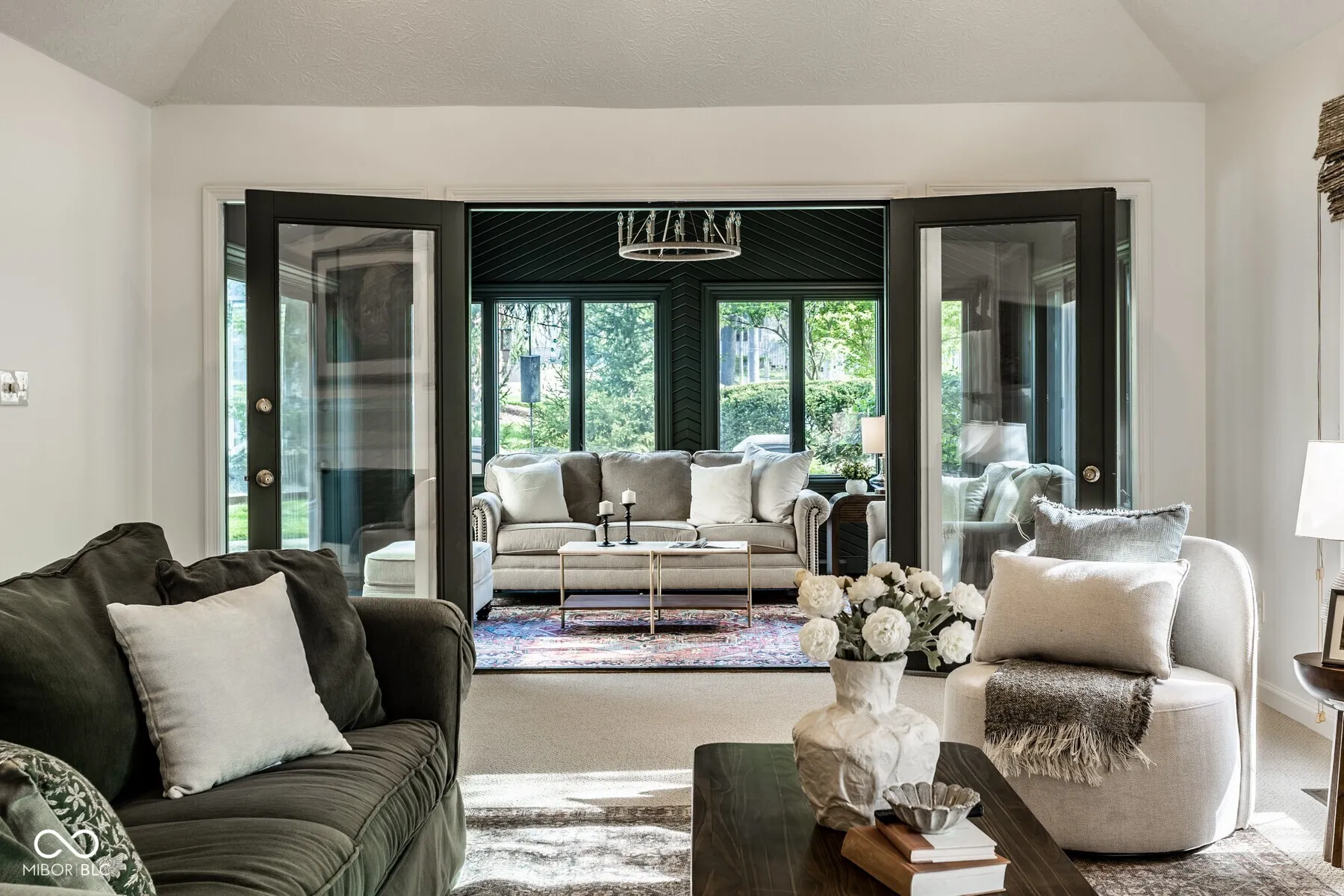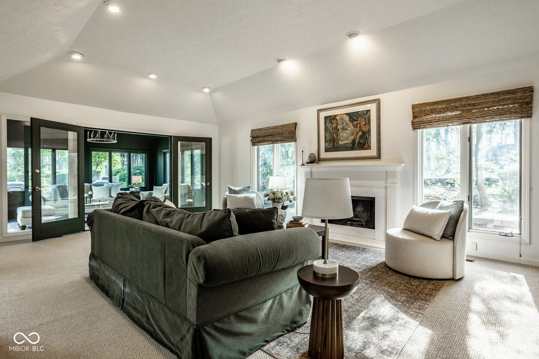 Nestled in the serene community of Springmill Lakes at Tamarack, this elegant end unit is undoubtedly one of the most beautiful in the area. Overlooking the lush Tamarack Nature Preserve, the home offers a perfect blend of traditional charm and modern functionality, surrounded by walking paths, dense woods, and privacy. The inviting entry opens to a newly painted warm interior with gorgeous hard wood flooring and new carpeting. Designed for one floor living, the floor plan facilitates a natural flow from one room to the next, making it ideal for entertaining and comfortable living. The great room, with its abundant natural light, raised ceiling, and wood-burning fireplace, extends into a stunning four-season sunroom that opens onto a private patio nestled among mature trees-a true retreat for relaxation and outdoor enjoyment. The kitchen is a culinary delight, complete with quartz countertops, tile backsplash, stainless steel appliances, and ample preparation spaces. Adjacent to the kitchen, a spacious breakfast room with a bay window offers serene views of the wooded private yard. The full dining room is perfectly suited for hosting dinner parties and special occasions. This floorplan also includes a separate stunning den with paneled walls and built in bookshelves. This home features three bedrooms and three full baths, with the master bedroom offering vaulted ceilings, two walk-in closets, and expansive windows that invite in the natural beauty of the surroundings. The second floor houses a versatile third bedroom or flex space with additional storage options, along with a full bath. New carpet and fresh paint throughout the home add to the pristine feel of the space. Additional conveniences include a large laundry room in the back hall leading from the finished garage, adding to the thoughtful layout of this stunning property.