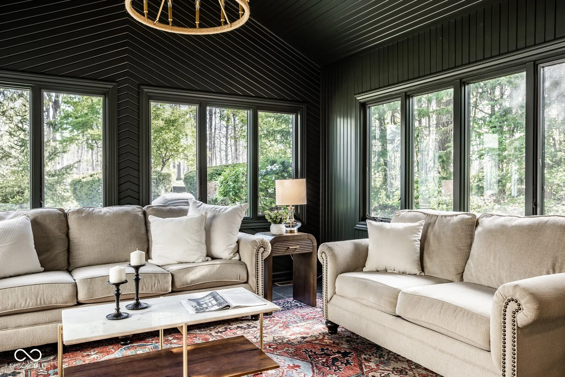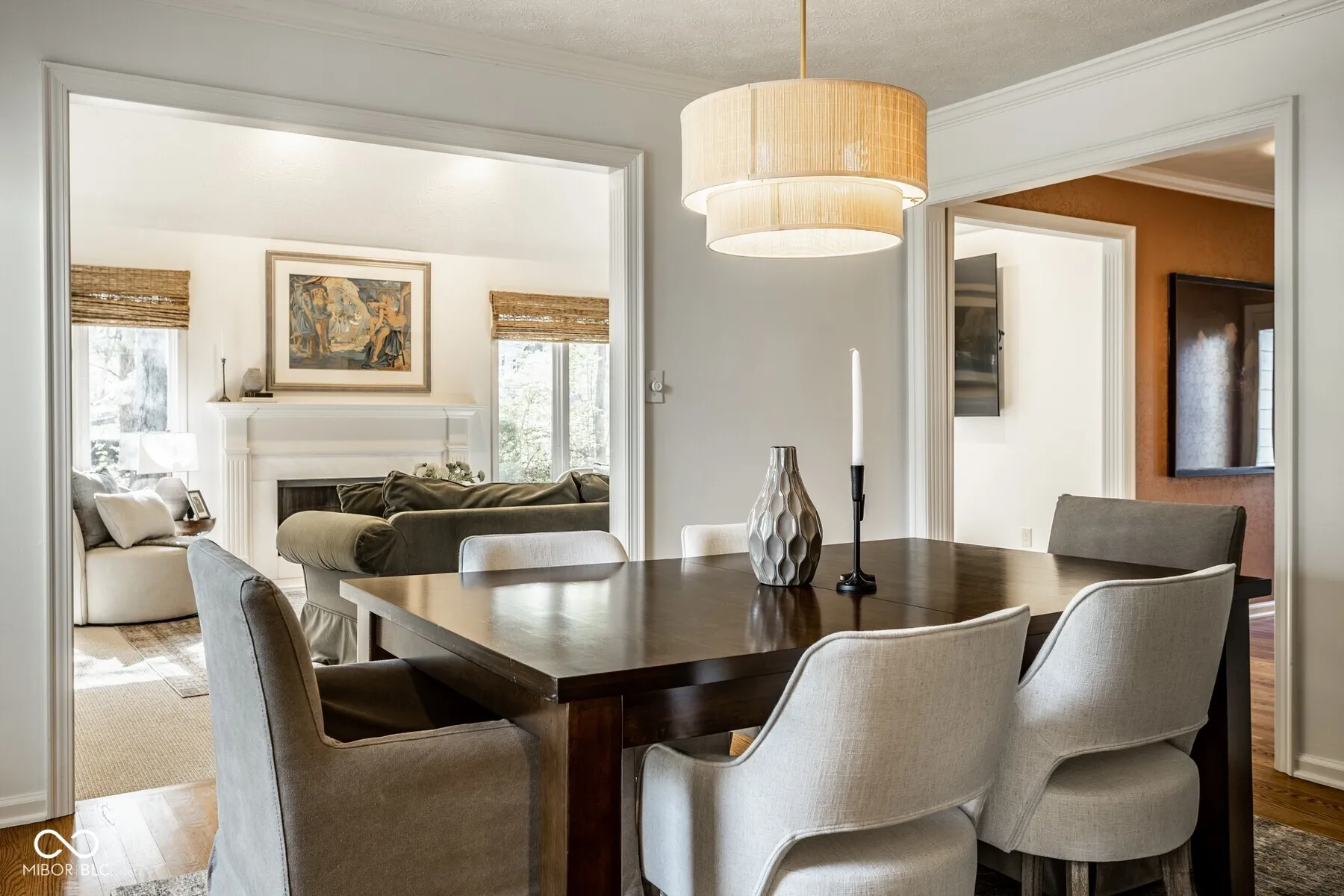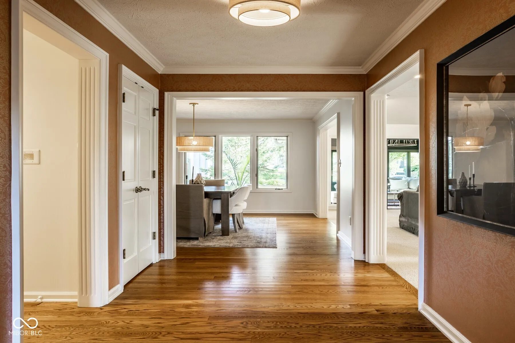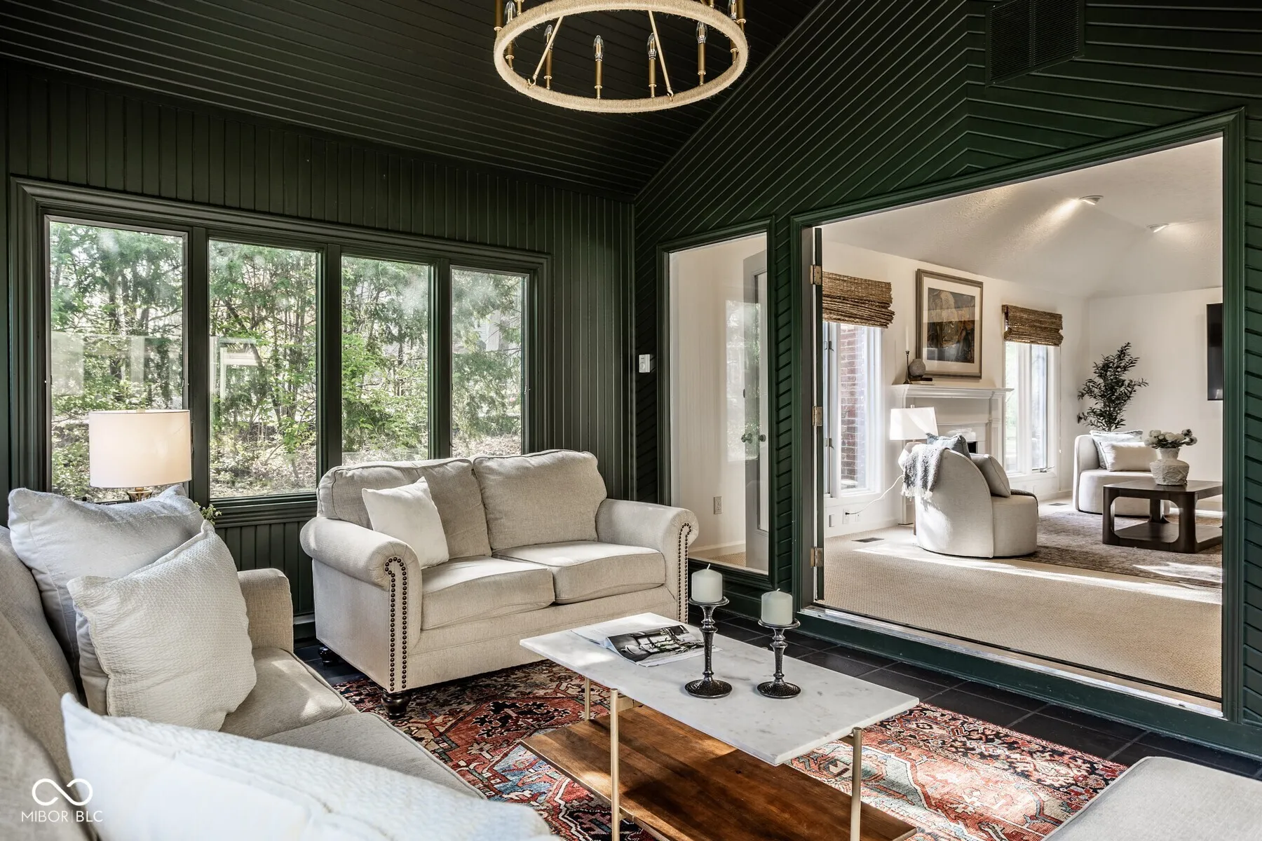 Nestled in the serene community of Springmill Lakes at Tamarack, this elegant end unit is undoubtedly one of the most beautiful in the area. Overlooking the lush Tamarack Nature Preserve, the home offers a perfect blend of traditional charm and modern functionality, surrounded by walking paths, dense woods, and privacy. The inviting entry opens to a newly painted warm interior with gorgeous hard wood flooring and new carpeting. Designed for one floor living, the floor plan facilitates a natural flow from one room to the next, making it ideal for entertaining and comfortable living. The great room, with its abundant natural light, raised ceiling, and wood-burning fireplace, extends into a stunning four-season sunroom that opens onto a private patio nestled among mature trees-a true retreat for relaxation and outdoor enjoyment. The kitchen is a culinary delight, complete with quartz countertops, tile backsplash, stainless steel appliances, and ample preparation spaces. Adjacent to the kitchen, a spacious breakfast room with a bay window offers serene views of the wooded private yard. The full dining room is perfectly suited for hosting dinner parties and special occasions. This floorplan also includes a separate stunning den with paneled walls and built in bookshelves. This home features three bedrooms and three full baths, with the master bedroom offering vaulted ceilings, two walk-in closets, and expansive windows that invite in the natural beauty of the surroundings. The second floor houses a versatile third bedroom or flex space with additional storage options, along with a full bath. New carpet and fresh paint throughout the home add to the pristine feel of the space. Additional conveniences include a large laundry room in the back hall leading from the finished garage, adding to the thoughtful layout of this stunning property.
