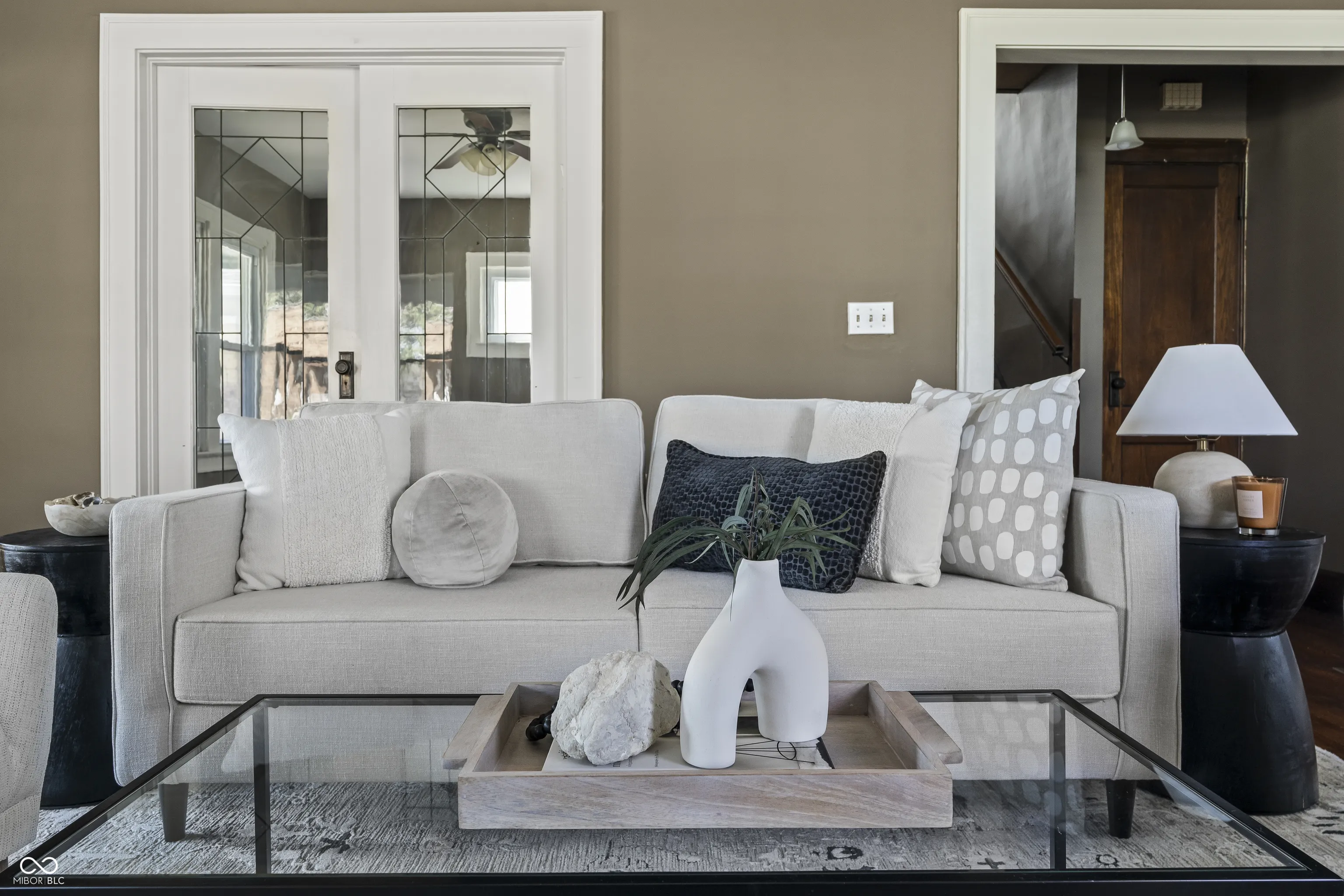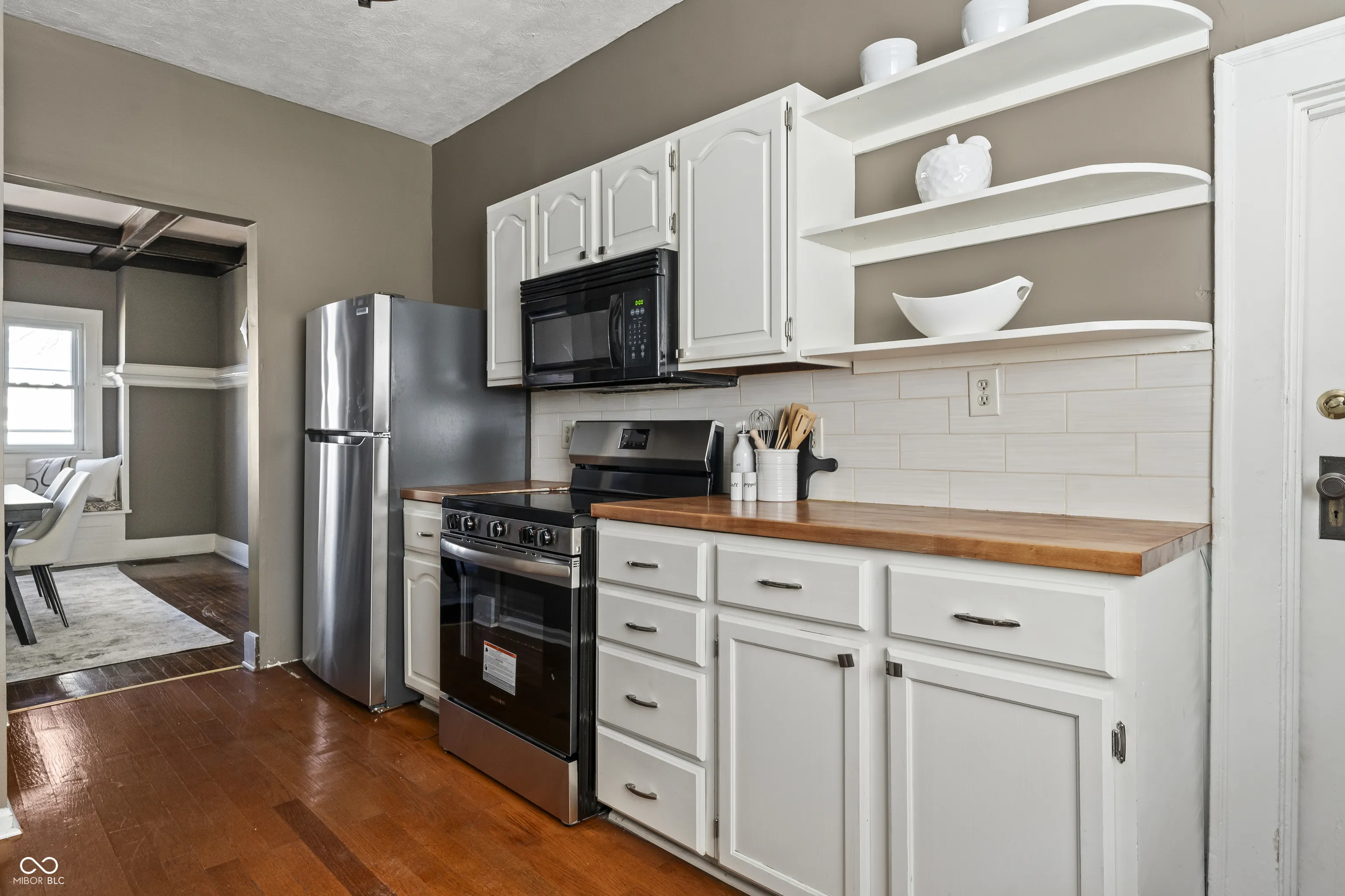 Nestled in the heart of Mapleton-Fall Creek, this immaculate 4-bedroom, 4-bath home blends timeless character with modern updates. Original hardwood floors, solid wood doors, and stunning leaded stained glass French doors set a warm, historic tone throughout. A charming wraparound front porch invites you in, leading to a beautifully flowing layout that includes a private office, a cozy living room with a white brick fireplace, and a formal dining room featuring a built-in reading bench beneath oversized windows. Exposed beam tray ceilings and abundant natural light enhance the home’s inviting atmosphere. The updated kitchen is a standout, with two-tone cabinetry, open shelving, subway tile backsplash, stainless steel appliances, and a classic farmhouse sink. Upstairs offers four spacious bedrooms and a tiled full bath, while the third floor provides a private retreat with its own bedroom and full bath. A finished basement adds valuable flex space and a fourth full bath. Outside, enjoy the rare convenience of a two-car garage, all set on a quiet, tree-lined street. Just minutes from Broad Ripple, Downtown, the Monon Trail, Blue Mind Roasting, Newfields, the Children’s Museum, & Goose the Market-this location offers the perfect mix of city access and neighborhood charm.