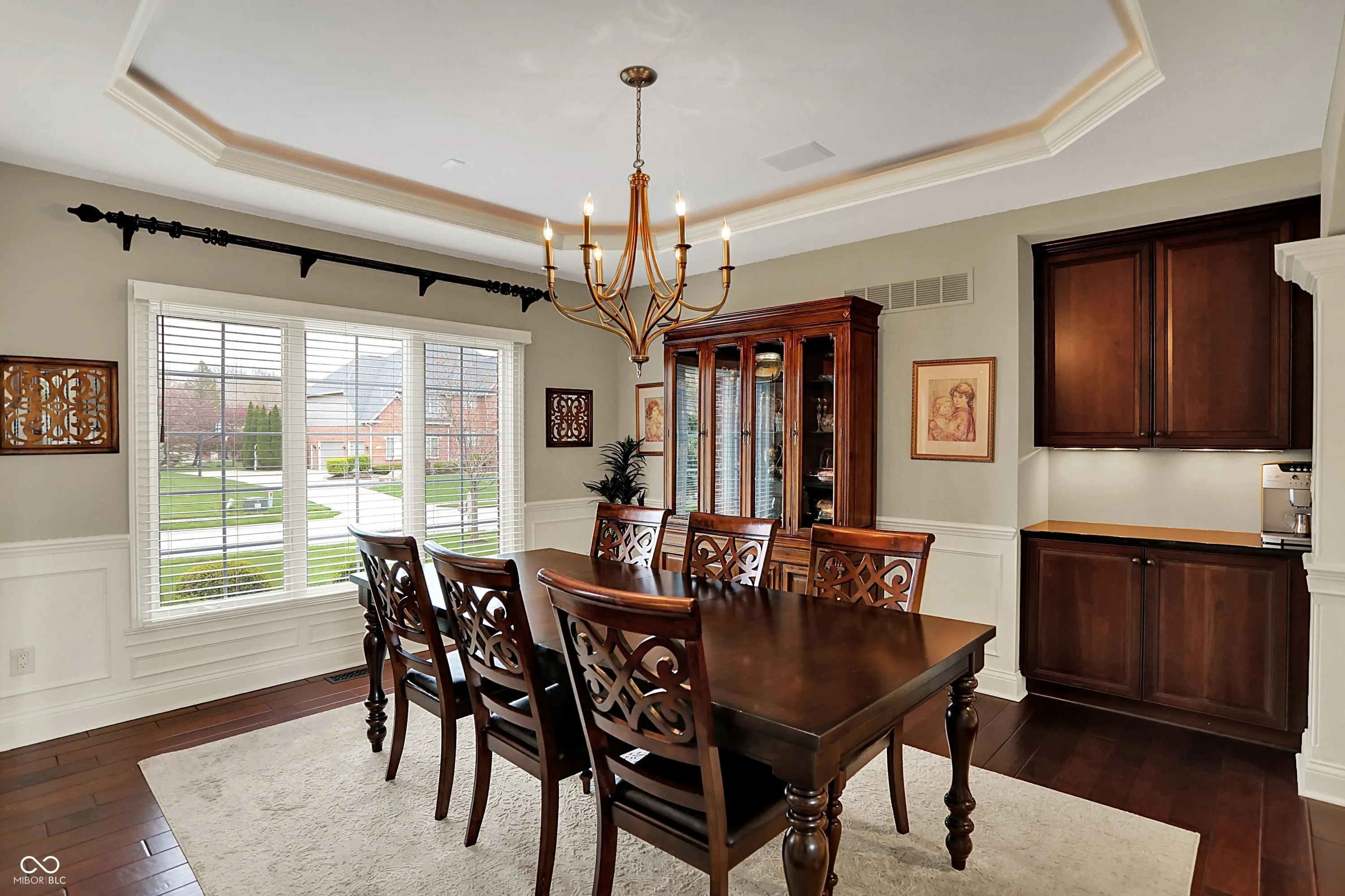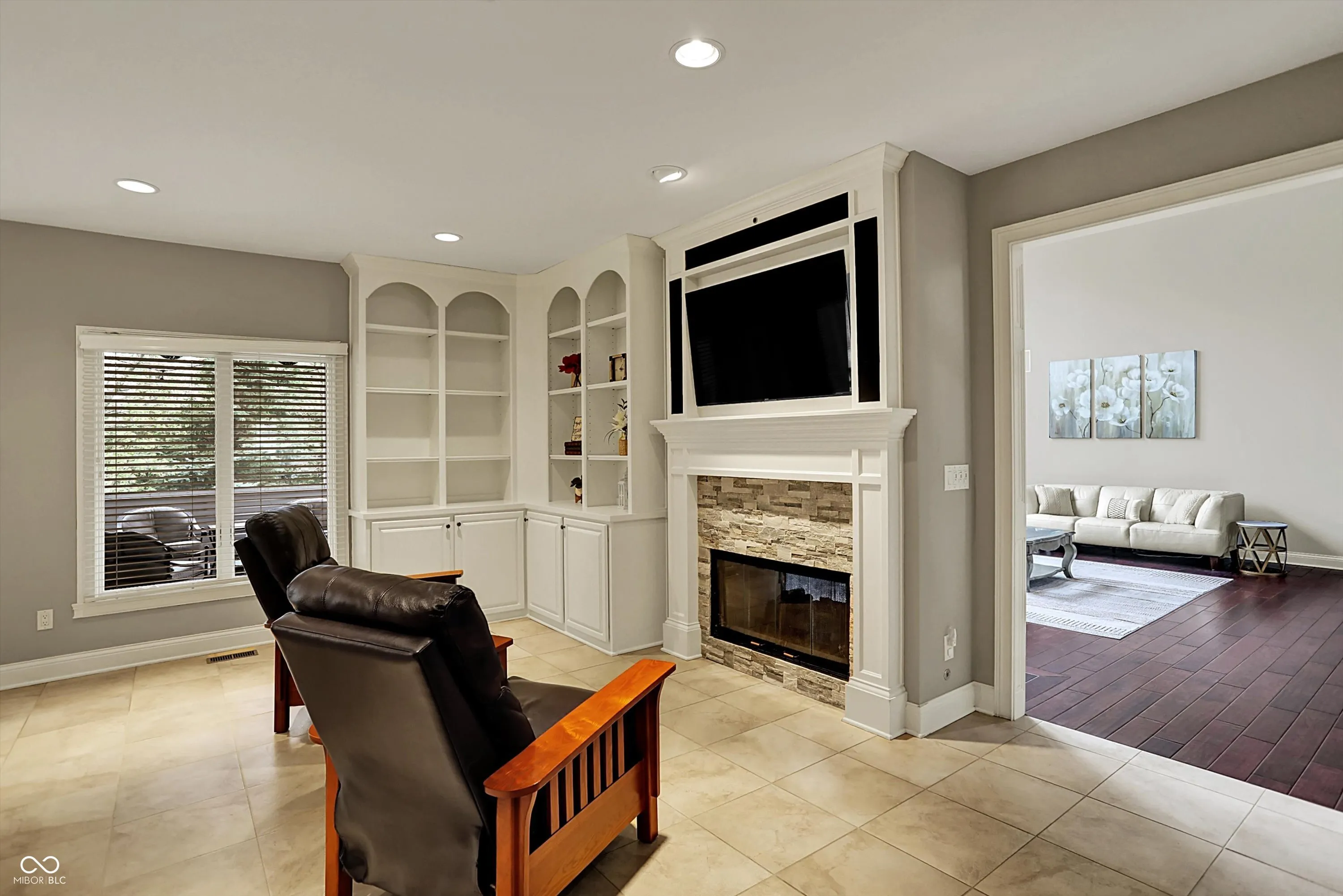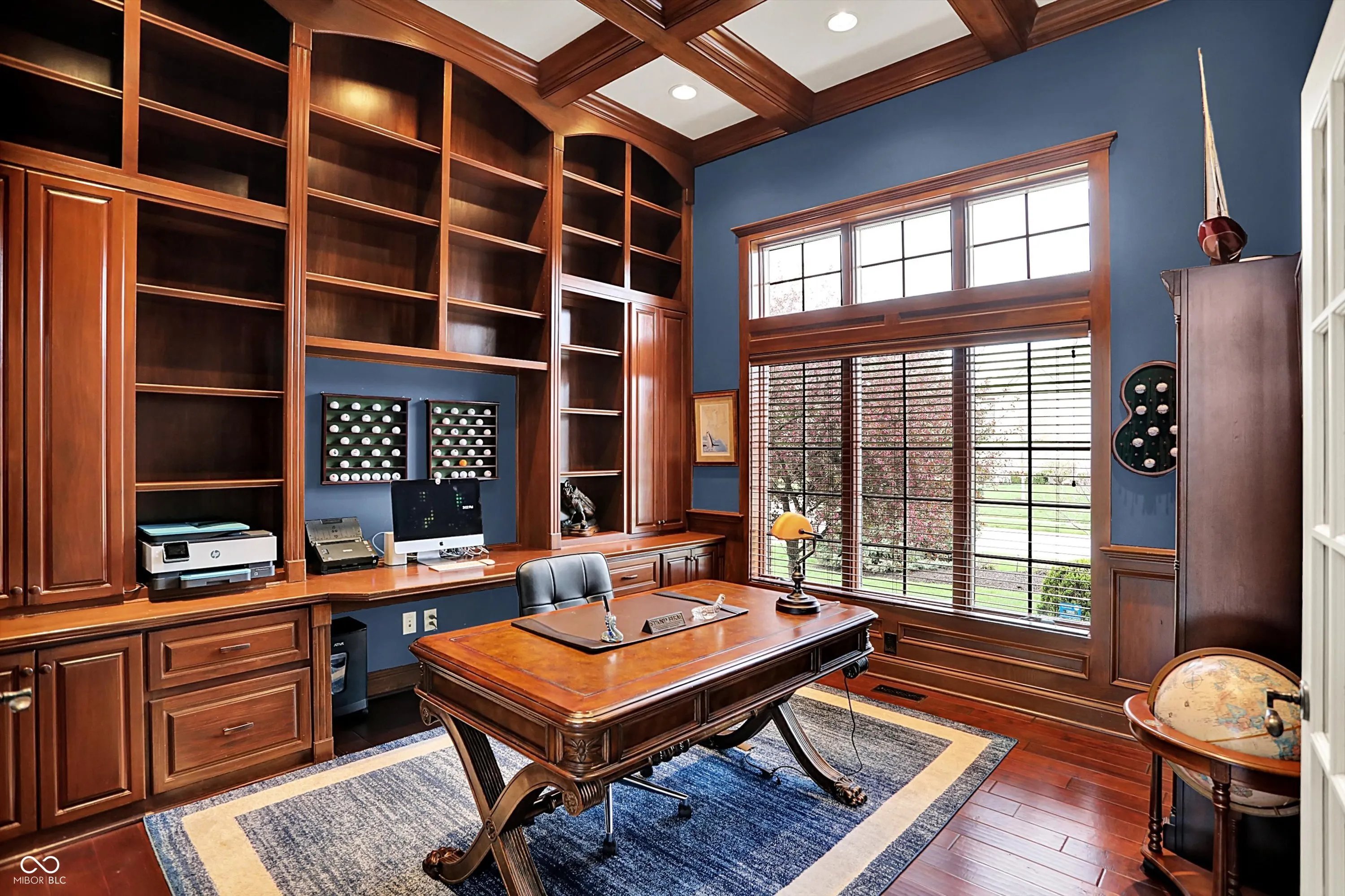 Welcome to this exceptional custom-built residence that seamlessly blends luxury, functionality, and design. Nestled on a picturesque corner lot, this home impresses from the moment you enter with a grand two-story foyer and great room featuring 25-foot ceilings, floor-to-ceiling windows, and a two-sided gas fireplace that sets the tone for upscale living. The gourmet kitchen is a chef’s dream, complete with granite countertops, a large island, stainless steel appliances, double ovens, an oversized walk-in pantry and a sunlit breakfast room. The cozy hearth room featuring stone surround fireplace and built-ins is an inviting space to relax. The formal dining room has a lighted tray ceiling and a built- in serving buffet. The main level den showcases rich coffered ceilings, built-in bookcases and cabinetry, and French doors. Luxurious primary suite features tray ceilings and dual walk-in closets. A spa like primary bathroom boasts dual vanities, a relaxing garden tub, and a walk-in steam shower. Three additional bedrooms upstairs are generously sized, all with walk-in closets. The second bedroom has an ensuite bath, while the third and fourth share a Jack-and-Jill bathroom. A large laundry room on this level adds everyday ease and convenience. The finished basement is an entertainer’s haven, complete with a pub style wet bar with a wine chiller, beverage center, dishwasher, and an expansive wine room. You’ll also find a spacious family room, a game room, a fifth bedroom, a full bathroom, and a large unfinished storage area. Outdoor living shines with a screened-in porch, a sprawling paver patio with a stone wood-burning fireplace (gas starter), and a built-in grill station. The fenced-in backyard offers privacy, mature trees, and a peaceful view of tranquil pond. Additional features include a four-car garage, new roof (2019), and close walking proximity to the community pool and amenities. Don’t miss your chance to own this incredible home!