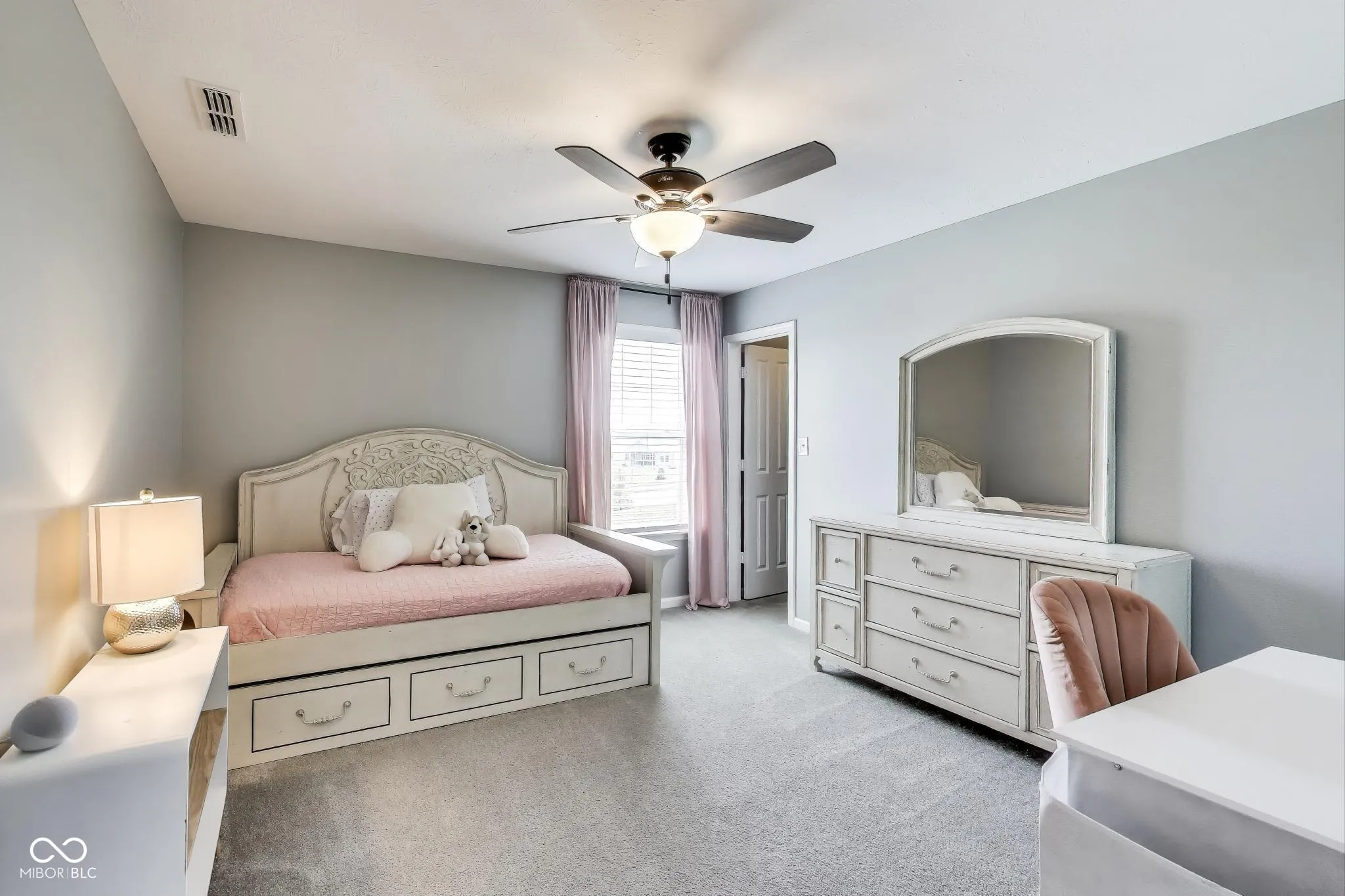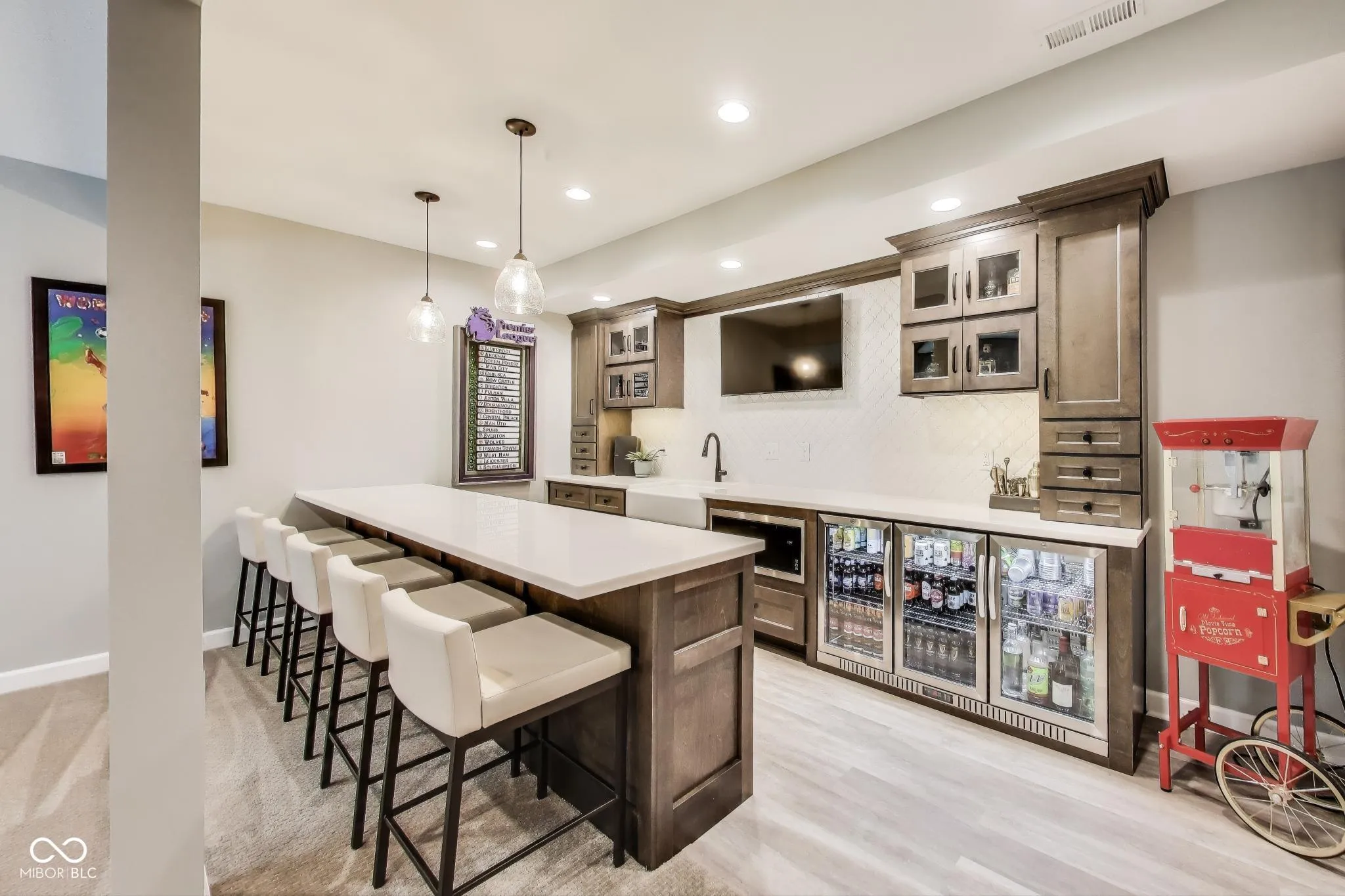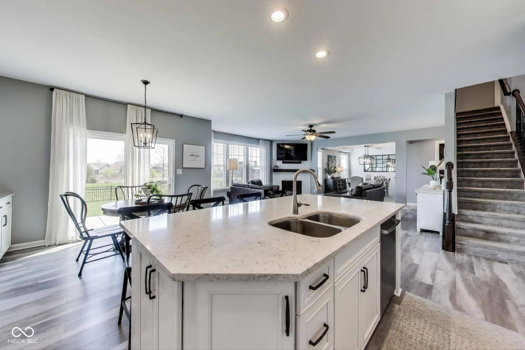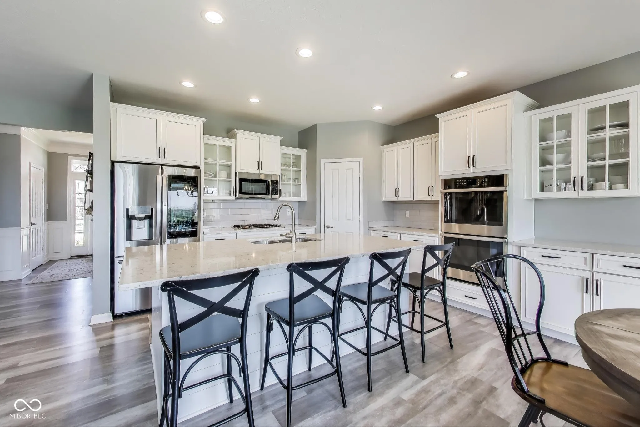 Welcome to 3997 Spylaw Road-a beautiful home located in the Estate Homes Collection of the sought-after Morningside community in Center Grove. This 5-bedroom, 3.5-bath home features a luxurious, family-friendly layout with thoughtful design and high-end finishes throughout, including custom blinds, built-in closet systems, and extensive upgrades that elevate the home to a level more closely resembling a custom-built home. The main level features 9′ ceilings, a formal dining room, a private office, and a versatile flex room, each enclosed by 8′ solid pine French doors with 12-pane glass, adding charm and architectural interest. The chef’s kitchen is a true showpiece, featuring quartz countertops, stainless steel appliances, dual ovens, soft-close cabinetry, and 37″ upper cabinets with crown molding and select glass-front doors with decorative grids. The oversized island spans over 8 feet and includes seating for four, perfect for casual meals and entertaining. Upstairs, you’ll find a spacious loft open to the level below, four bedrooms, and a serene primary suite with dual sinks and generous proportions. A dedicated laundry room is conveniently located upstairs for added function and ease. The full finished basement offers even more to love, with 9′ ceilings, plush premium carpet, a professional-grade home gym, a private sauna, and a beautifully designed entertaining space. The custom 11′ bar island features Corian countertops, a farmhouse sink, soft-close cabinetry, under-cabinet lighting, and a built-in fridge, with seating for five, making it the perfect gathering spot. Step outside to a 26×21′ exposed aggregate patio, a Goalrilla basketball goal, and a fully fenced backyard with three 5′ gates- all backing up to a peaceful nature preserve. The home also includes a finished 3-car side-load garage with built-in cabinets, trim, lighting, and blinds. -The home’s ideal east/west orientation for great natural light. Walk the trails to Kephart Park, Taxman, & Coffeehous