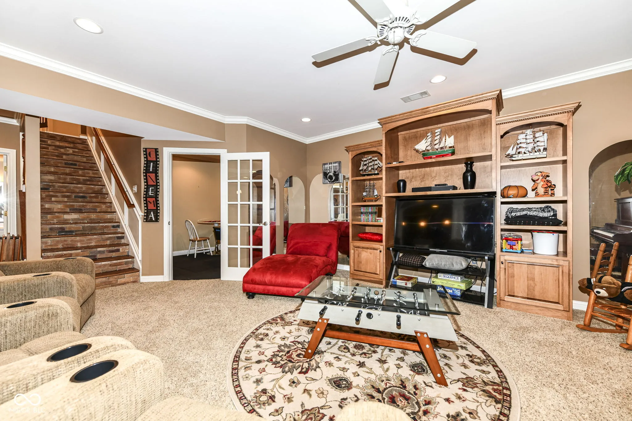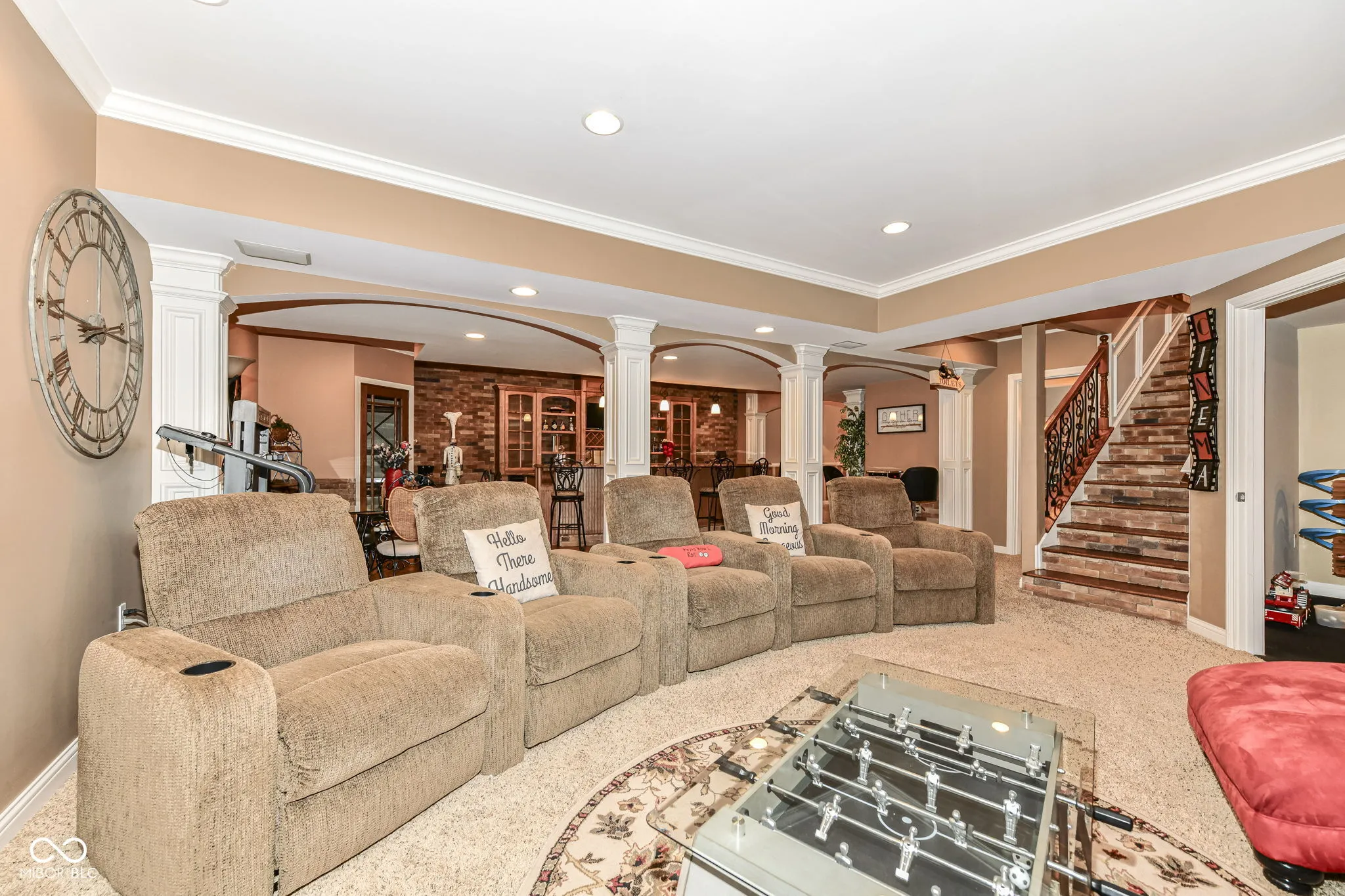 Wow – a simply lovely custom built home in Potters Woods! Welcoming entrance leads to a sitting/living/music room. Office to your right is complete with exquisite built in desk and shelving. Throughout the main level beautiful hardwood floors, gorgeous trim and lovely details. Your new large kitchen features a center island, two ovens and beautiful vent hood. Your entire family will love gathering around this space that is connected to a family room with vaulted ceiling and fireplace. Plenty of room for your large gathering table and just steps to your landscaped backyard (including evening lighting! As a HUGE bonus the primary bedroom is on your main level and features a great walk in closet and spa like ensuite! Your second level allows space for the whole family with generously sized bedroom all with wonderful details including a jack and jill bath, a bedroom with access to attic storage (no more pull down stairs) and of course everyone loves a closet that is the size of a bedroom! But, wait there is more! Your new lower level has a complete kitchen, wine room, billiards room, home theater set up and a work out room! Really your new home has it all! As an added bonus your home is located in a wonderful neighborhood that is close to walking trails and everything Noblesville has to offer! Welcome HOME!