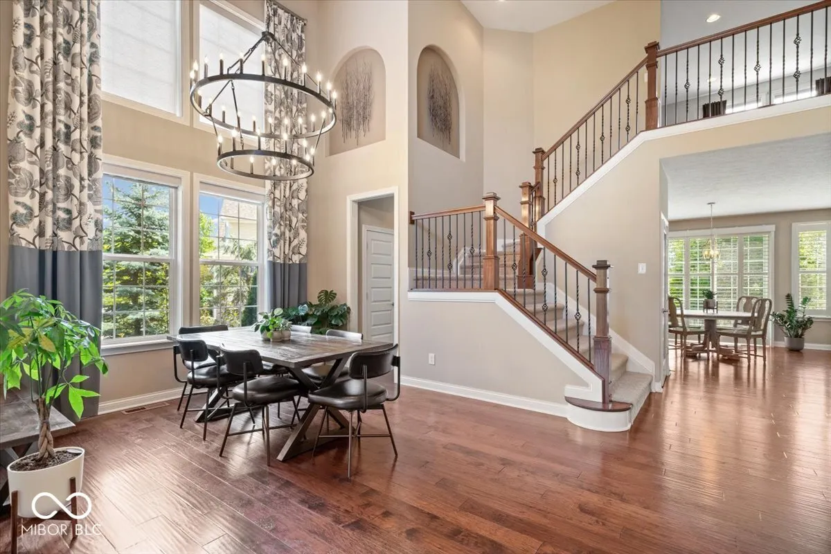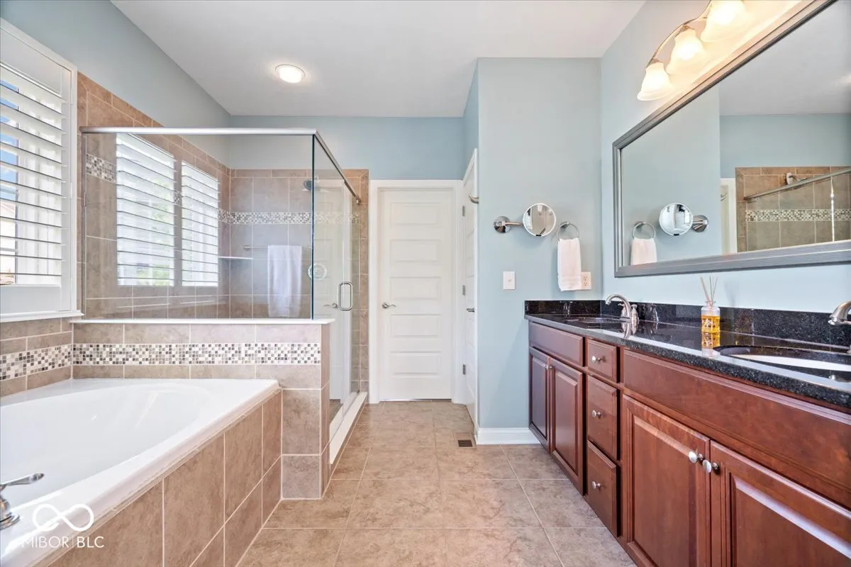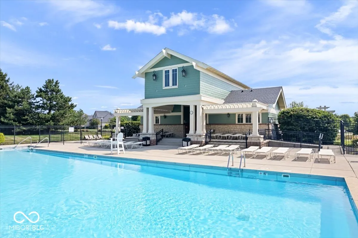 Elegant West Carmel residence situated on a beautifully landscaped corner lot. The main level features both a spacious primary suite and a private guest suite, ideal for multigenerational living. Rich hardwood floors run throughout the first floor, complementing the grand entry with soaring ceilings and an abundance of natural light. The upper level offers three additional bedrooms and a versatile loft space. The expansive lower level is designed for entertaining, with a large game area, media zone, additional guest room, and full bath. Enjoy outdoor living on the paver patio overlooking the yard. Neighborhood amenities include a community pool.