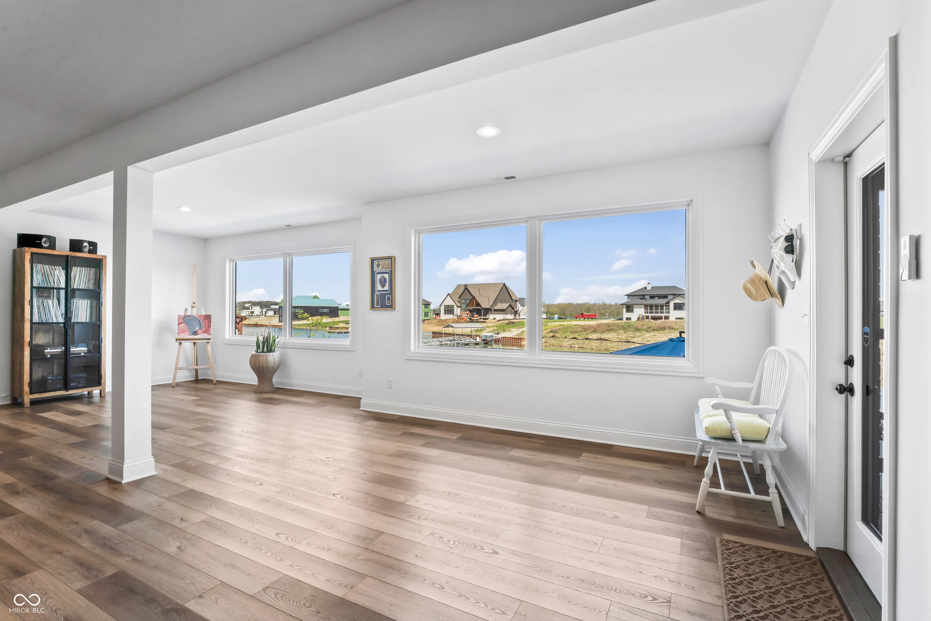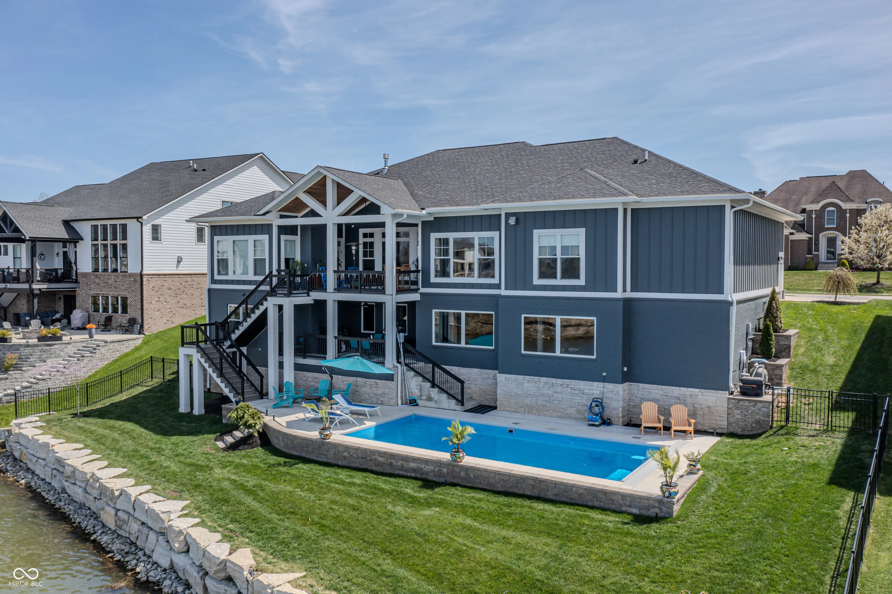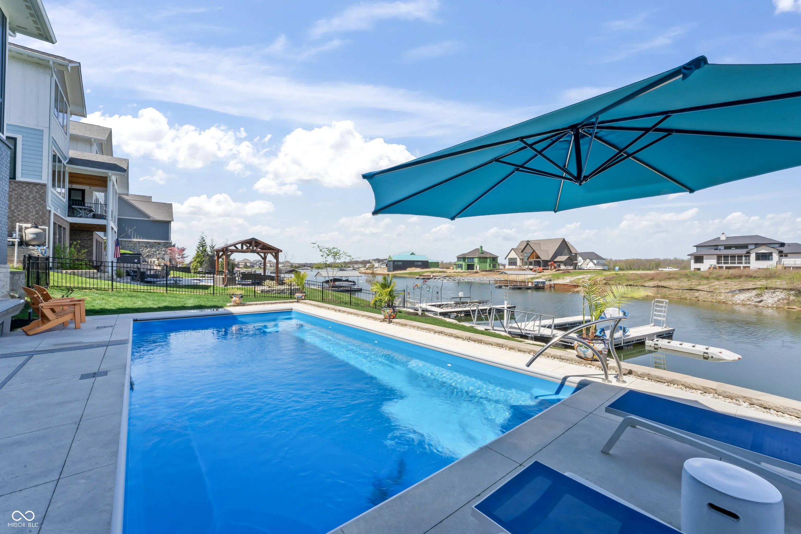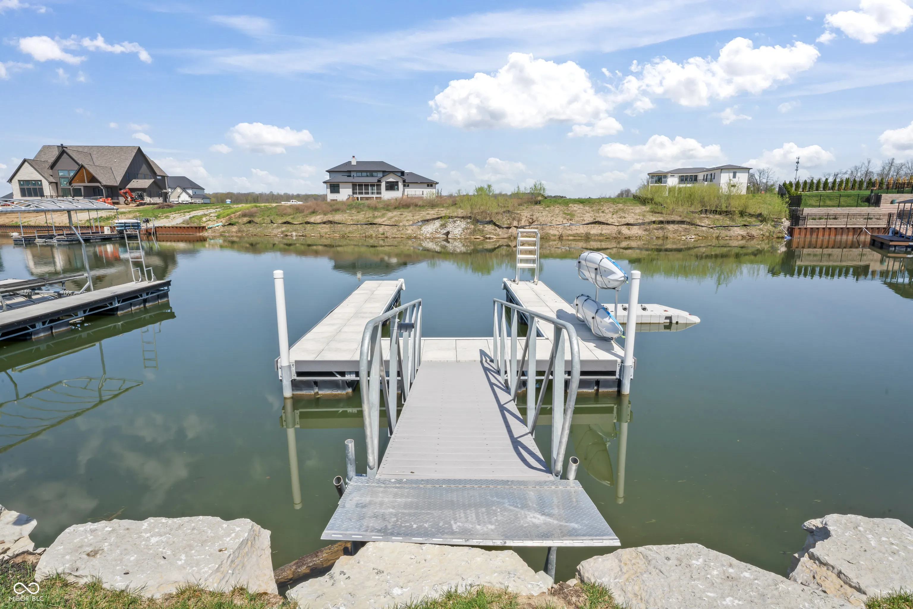 Absolutely stunning & almost brand new, this luxury waterfront home offers exceptional living in a highly sought-after community within award-winning HSE schools. Like new, this property features one of the widest water frontages in the neighborhood & includes a deeded boat dock for lake life from day one! With 5 bedrooms (3 upper & 2 in basement), a RARE 4-car garage, & premium finishes throughout, this custom home is designed for both style & function. The heart of the home is a chef’s kitchen featuring high-end appliances & ample space for entertaining. Enjoy an open floor plan with custom beams accenting the great rm, cozy fireplace, large dining room all overlooking a brand new backyard oasis, and evening sunset views. Primary bedroom tucked away on main level features private access to covered porch for morning coffee. Bedroom 2 has full bath and lots of natural light. AMAZING pantry off kitchen with huge laundry rm w wet sink tucked away off 4 car tandem garage entrance with n Convenient mudroom with locker system connects garage and main living of the home. 3rd bedroom or second office with full attached bathroom completes this side of the home. The walkout lower level is impressive & open featuring 4th bedrm with large walk in closet & connected full bath. Rec room, 5th bed/exercise room, AND spacious wet bar and large entertaining area leads to covered patio. Enjoy lake and pool life under the shade on main level patio or relax outdoors with a saltwater heated pool & a fully fenced yard-all with breathtaking sunset views over the water. This is lakefront living at its finest! Turn key & new without the wait or the hassle of making a house a home-mature landscaping installed, retaining wall, pool & surround, retaining wall, boat dock. Ready for your easy button-One owner bought fall of 2022 -see attached upgrade list of after builder upgrades. Why buy a $1m lot & wait 24 months to build? Start easy living now.