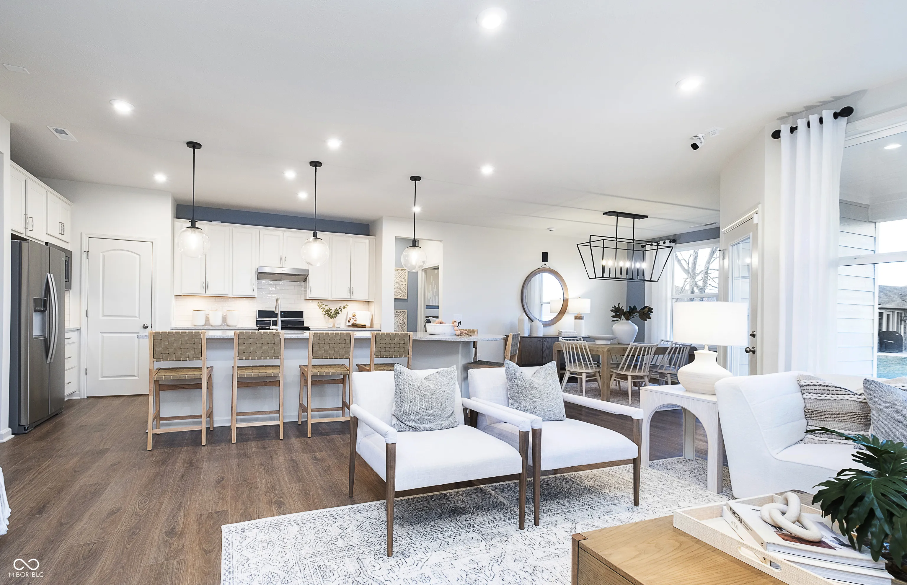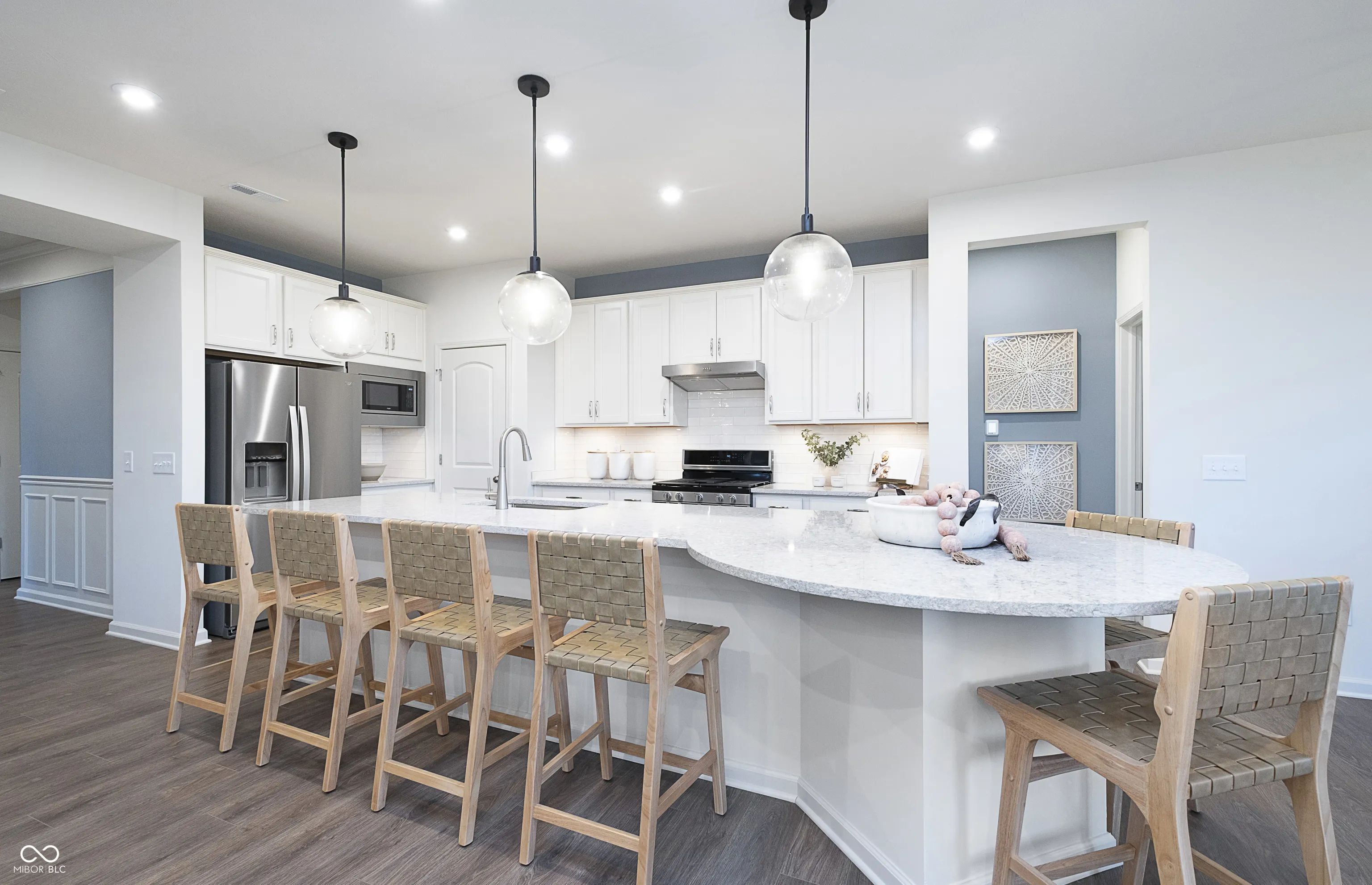 Experience the best of single-level living in this former model home, perfectly situated in the desirable Promenade community and offering a thoughtfully designed ranch layout with a 3-car garage. Designed for those who appreciate single-story living, this home is perfect for entertaining and daily living alike. The heart of the home is the open-concept kitchen, featuring 42″ White cabinets, Gray Lagoon countertops, island and gas appliances. With an abundance of counter space and a walk-in pantry, this kitchen is as functional as it is beautiful. The open layout seamlessly connects the kitchen to the gathering room with fireplace and cafe, where you can enjoy meals or relax . The flex room features doors for added privacy, offering versatility to use as a home office or den. The Owner’s Suite is a private retreat, featuring an en-suite spa like oversized tiled shower with frameless door, dual sink comfort height vanity with Frost White quartz top and walk-in closet. A secondary bedroom is thoughtfully positioned near a convenient full bath, offering privacy and comfort for guests or family members. The Promenade neighborhood offers direct access to the popular B&O Trail, walking paths, and a convenient location along Northfield Drive, less than a mile from Ronald Reagan Parkway. Residents enjoy proximity to Downtown Brownsburg, shopping, dining, and entertainment, with easy access to I-465 via I-74. Brownsburg Schools and included high-speed internet and TV through HOA fees make this community an ideal place to call home.