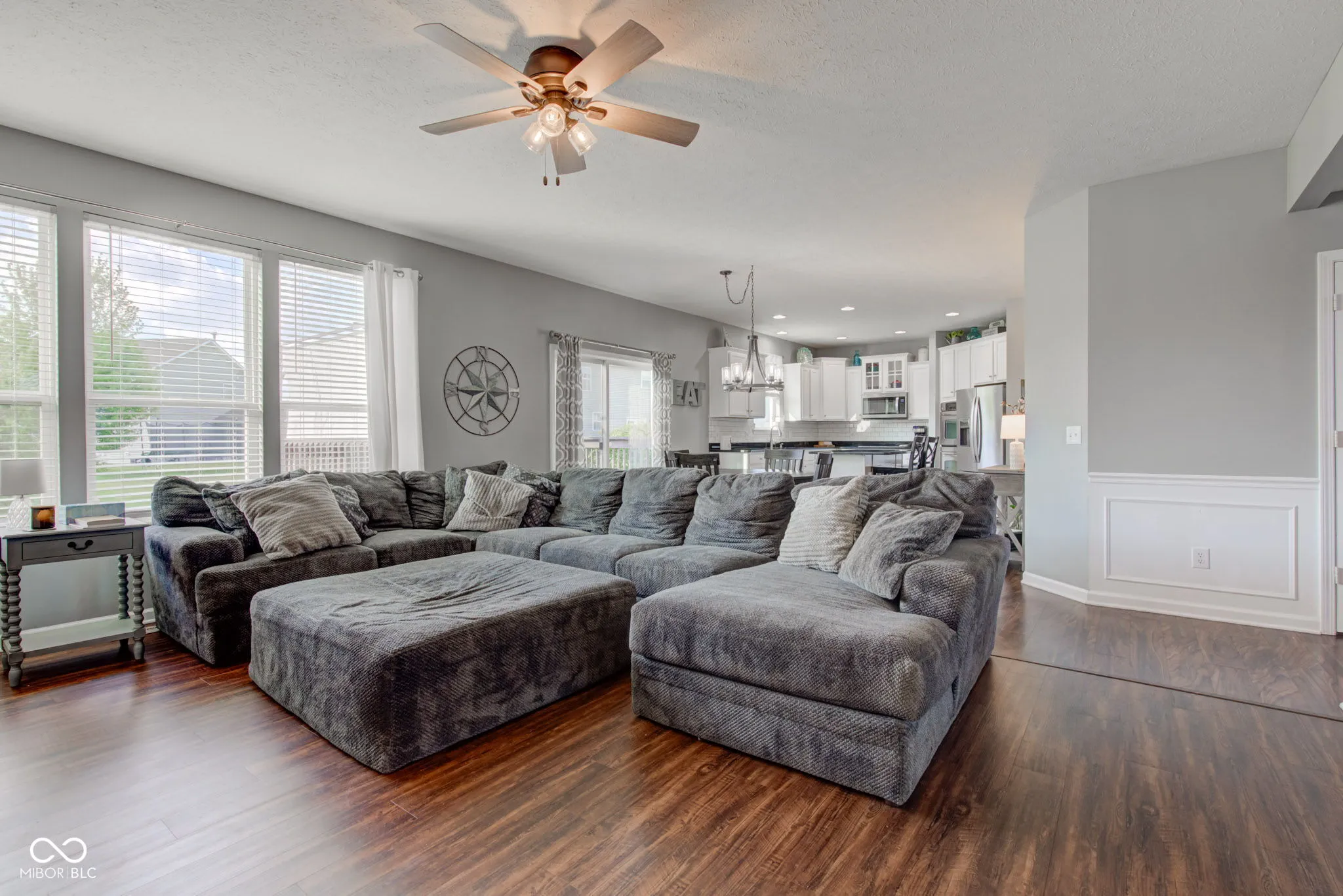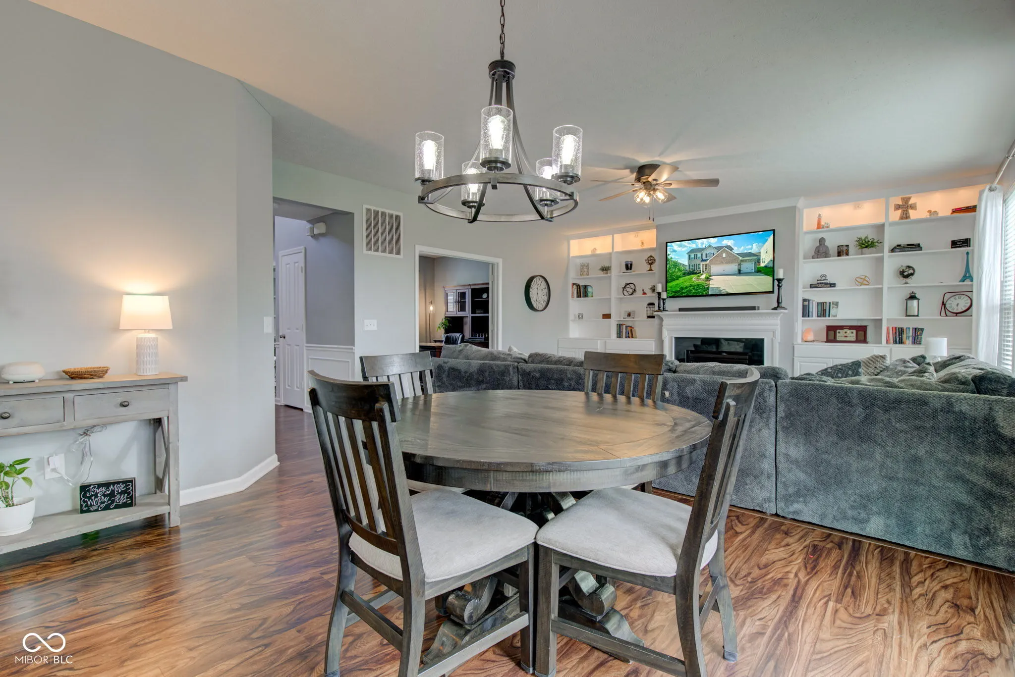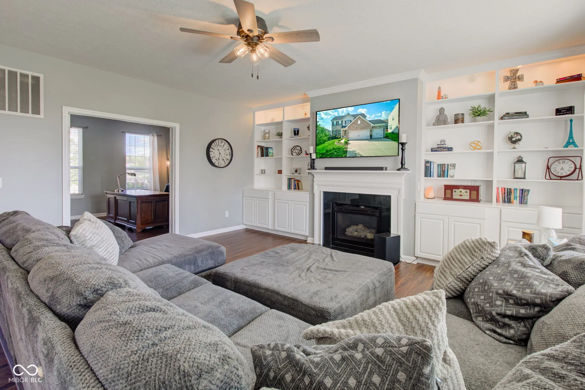 Welcome to this stunning home nestled in the highly sought-after Brookhaven neighborhood. The two-story foyer is a showstopper! It features rich laminate flooring, elegant wainscoting and detailed crown molding, but the focal point is the striking staircase with gorgeous handrailing enhancing the home’s classic charm. The main level boasts a formal dining room, versatile office or bonus room with French doors, and an open concept great room featuring a cozy fireplace and built-in bookshelves. The 10′ ceilings enhance the sense of space and openness throughout the floorplan. The gorgeous gourmet kitchen features updated staggered white cabinets, stunning granite countertops and a charming cast iron undermount sink. You’ll have plenty of space for meal prep or entertaining at the oversized island. Upstairs you will find a beautiful and spacious primary bedroom, walk-in closet and en-suite bathroom featuring a tiled shower, garden tub and double bowl vanity. Three more bedrooms are located at the other end of the hallway featuring spacious walk-in closets, ceiling fans and plenty of natural light. The basement is ready for your finishing touches with two rooms partially finished. An egress window and a plumbing rough in allows for a future bedroom and bathroom. Stepping outside, you’ll find a beautifully landscaped lawn with a generous sized deck to relax, entertain and enjoy! Situated close to Center Grove schools, shopping, restaurants and interstate access, this location is perfect! Recent updates include Roof (Fall 2024), AC (2023), Water Heater (2020), Refrigerator (2022), Dishwasher (2024) and Microwave (2024.) Schedule your showing today!