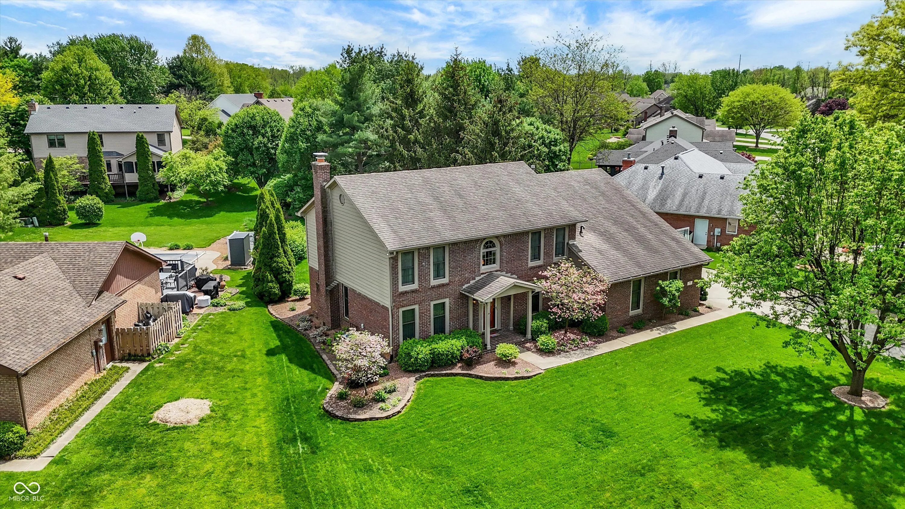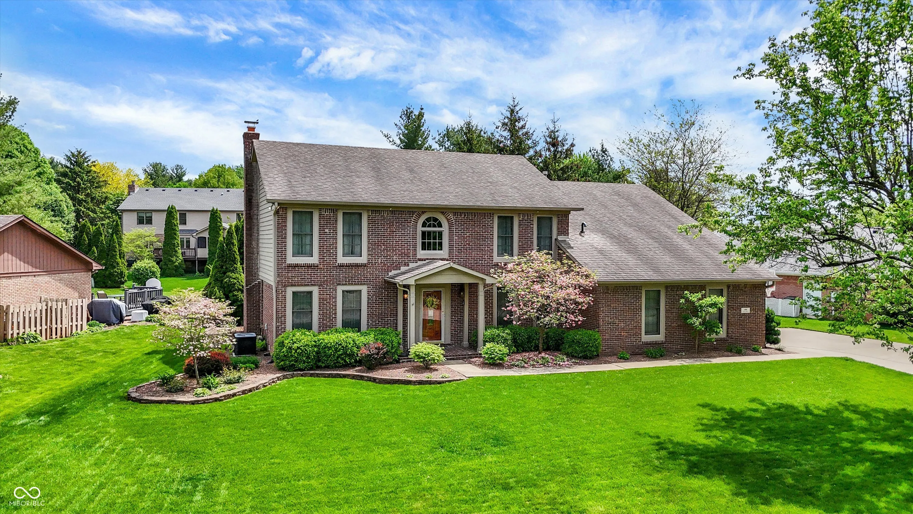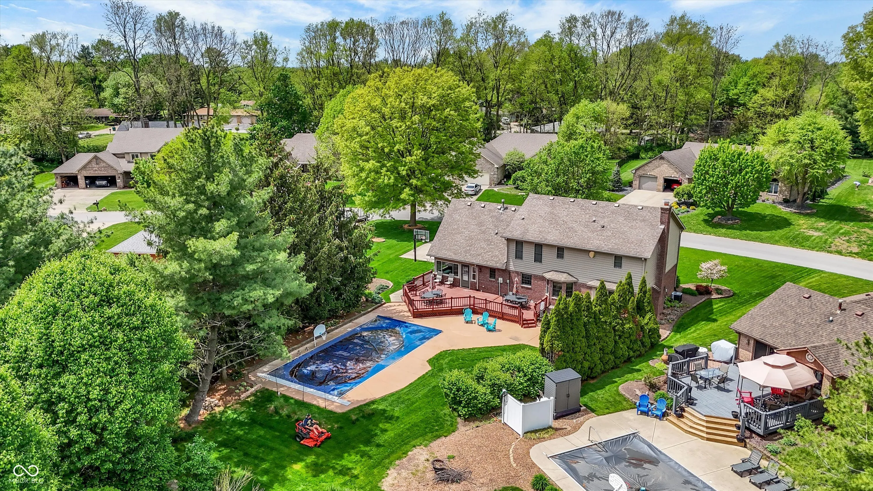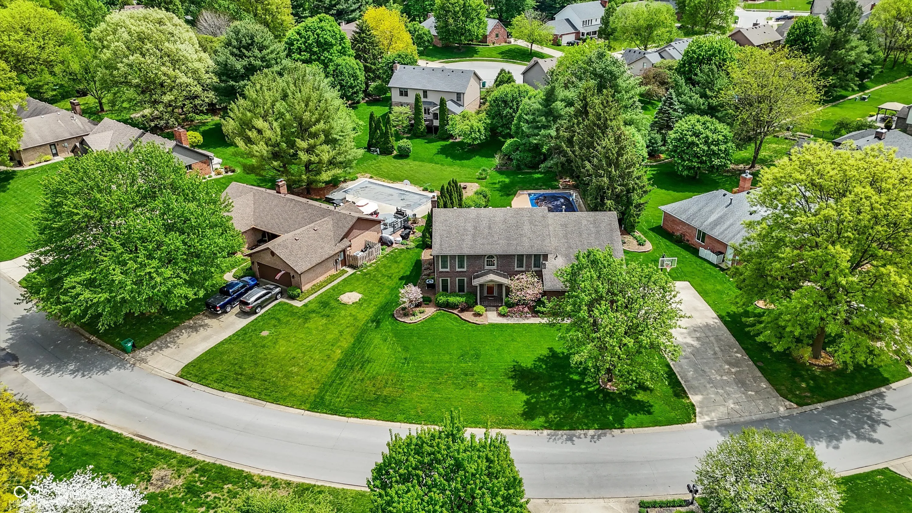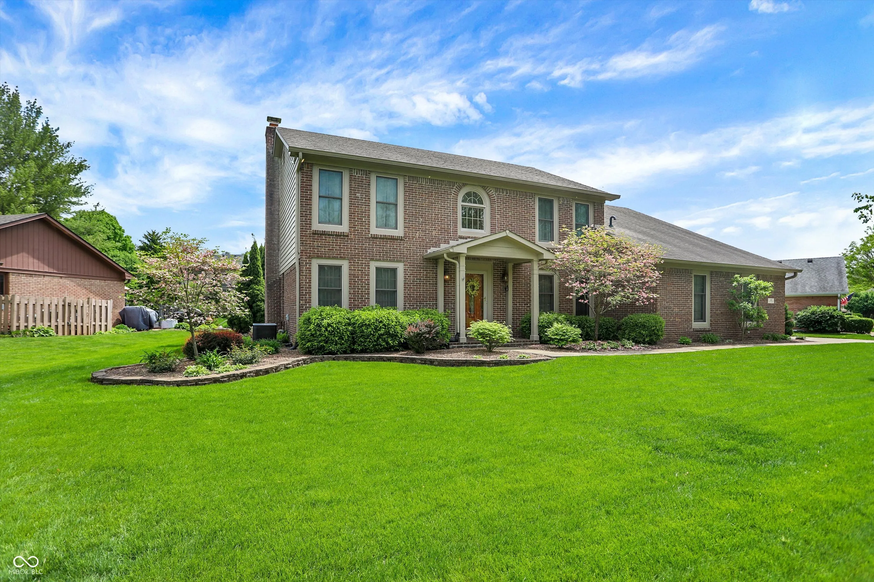 Welcome to this beautifully maintained 4-bedroom, 2.5-bath home situated on a spacious lot in one of Greenwood’s most sought-after neighborhoods AND the Center Grove School District! Featuring incredible curb appeal and a tree-lined backyard oasis, this home offers the perfect blend of comfort, style, and functionality. Step inside to gleaming solid oak floors and a formal dining room highlighted by an elegant tray ceiling and crown molding- ideal for entertaining. The large, eat-in kitchen is a chef’s dream, boasting a center island, ceramic tile flooring, solid surface countertops, included appliances, and a handy command center. Relax in the cozy family room with a floor-to-ceiling brick gas fireplace, or unwind in the bright sunroom-complete with its own refrigerator-leading to your private backyard paradise. Enjoy summer days by the sparkling inground pool (opening May 27th), host gatherings on the expansive deck, or lounge on the concrete patio surrounded by lush, mature trees. The spacious primary suite is a true retreat, offering a remodeled en-suite bath with dual sinks, a walk-in shower, and abundant natural light from two windows. The remodeled guest bath also features dual sinks and a convenient linen closet. A dedicated laundry room with a folding station adds everyday convenience. Additional features include a whole-house water filtration system, a heated and EV-ready garage, and a large yard perfect for outdoor living.