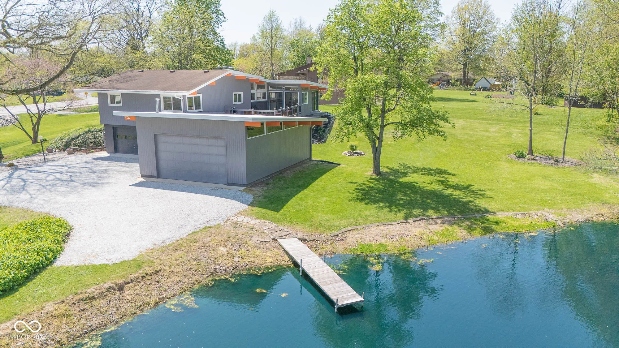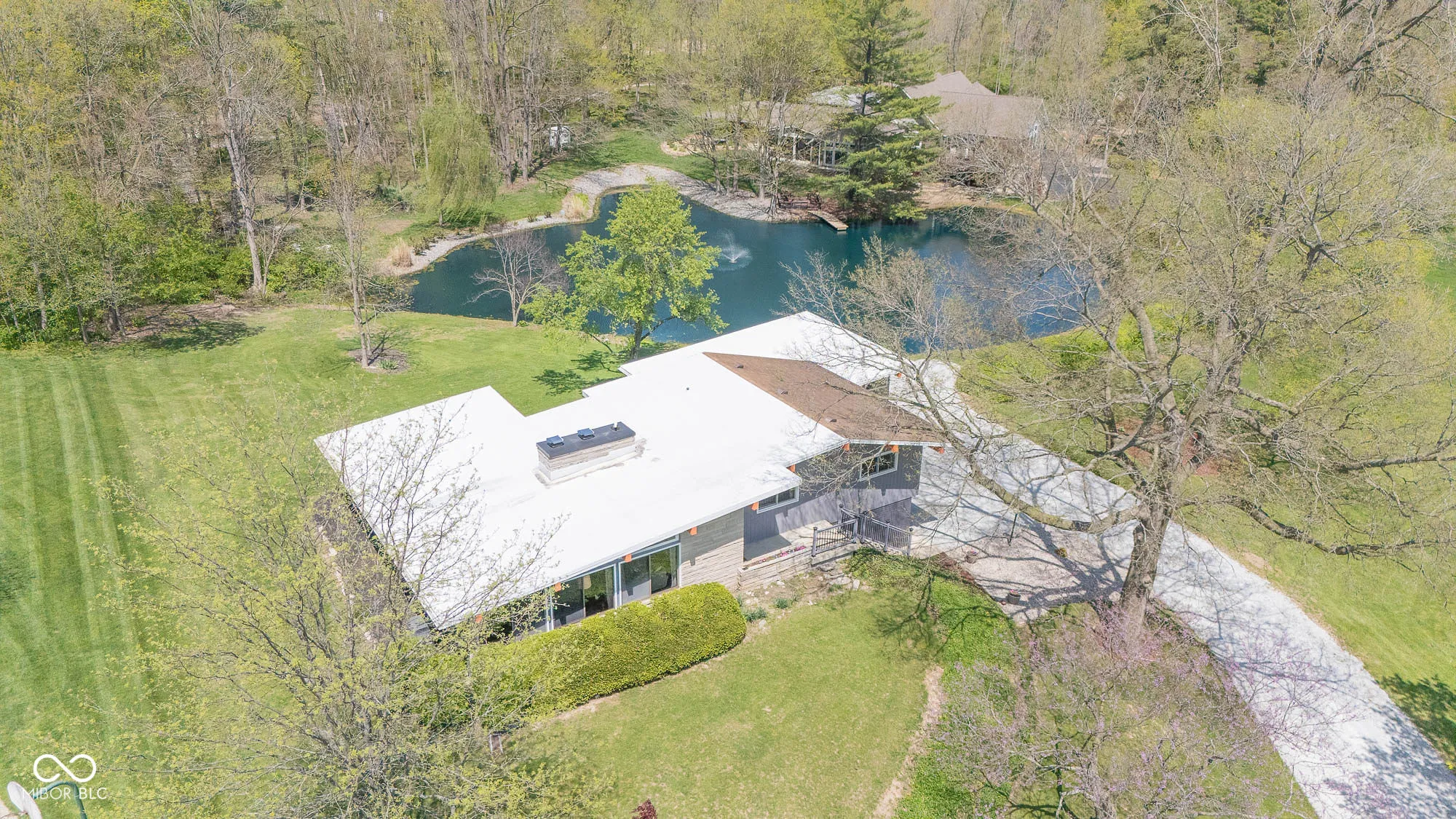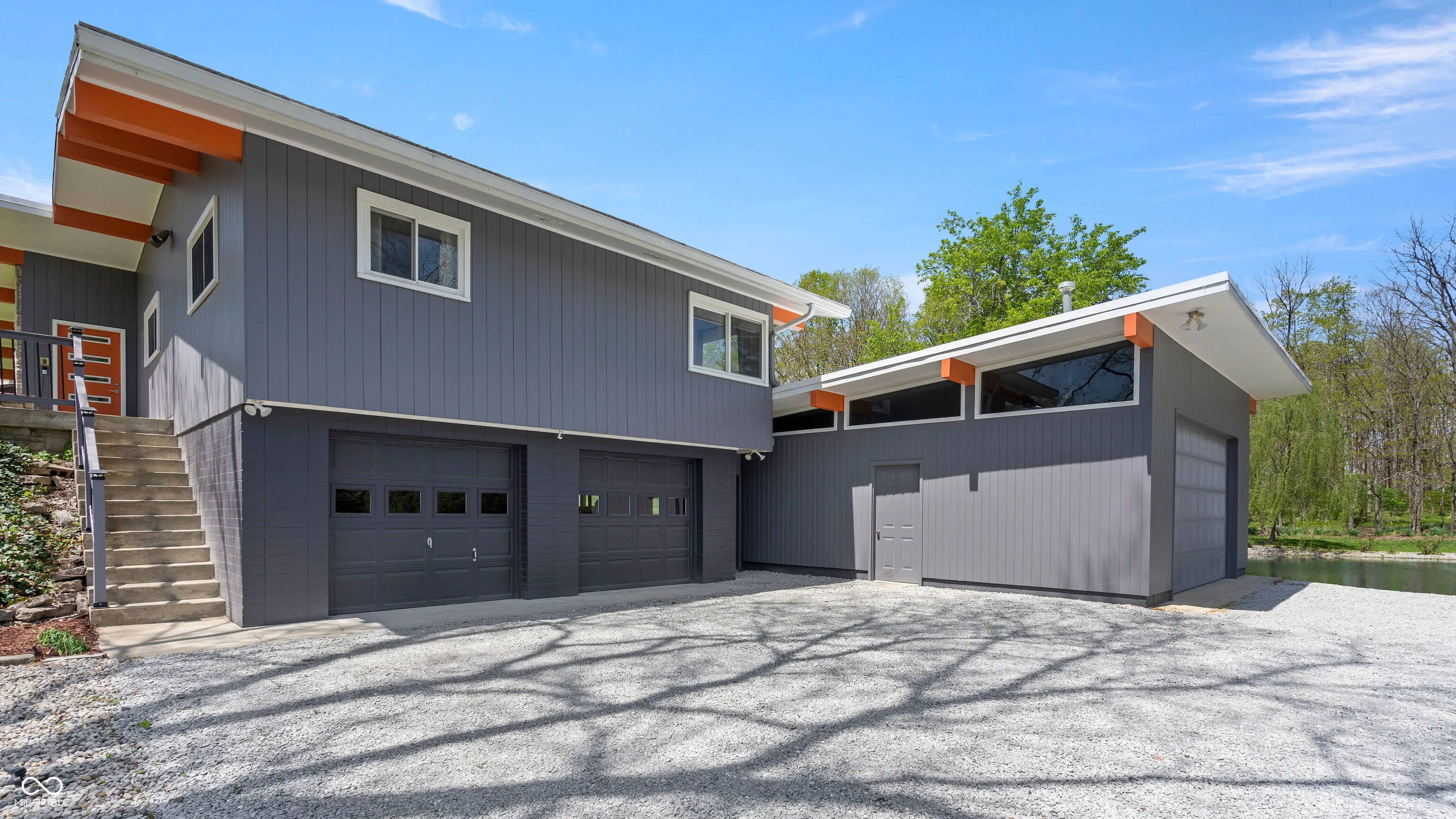 Welcome to this beautifully updated 1960s Mid-Century Modern home, offering timeless style and modern convenience on a serene 1.54-acre lot with a shared pond. The open floor plan features soaring ceilings, a wall of windows brings an abundance of light, beautiful fireplaces, and a newly renovated kitchen and bathrooms. Luxury waterproof vinyl plank flooring runs throughout the home, combining durability with contemporary style. Enjoy stunning views from the expansive back deck. The finished lower level offers flexible living space, perfect for an in-law suite with a living room and bedroom, both with sliding doors to the patio, and a full bath. Car lovers will appreciate the attached two-car garage plus a massive 4-6 car garage/workshop – ideal for vehicles, tools, and hobbies. If you love the outdoors, you’ll enjoy walking or riding on the nearby Buck Creek Trail. A rare opportunity to own a Mid-Century Modern gem in a park-like setting!