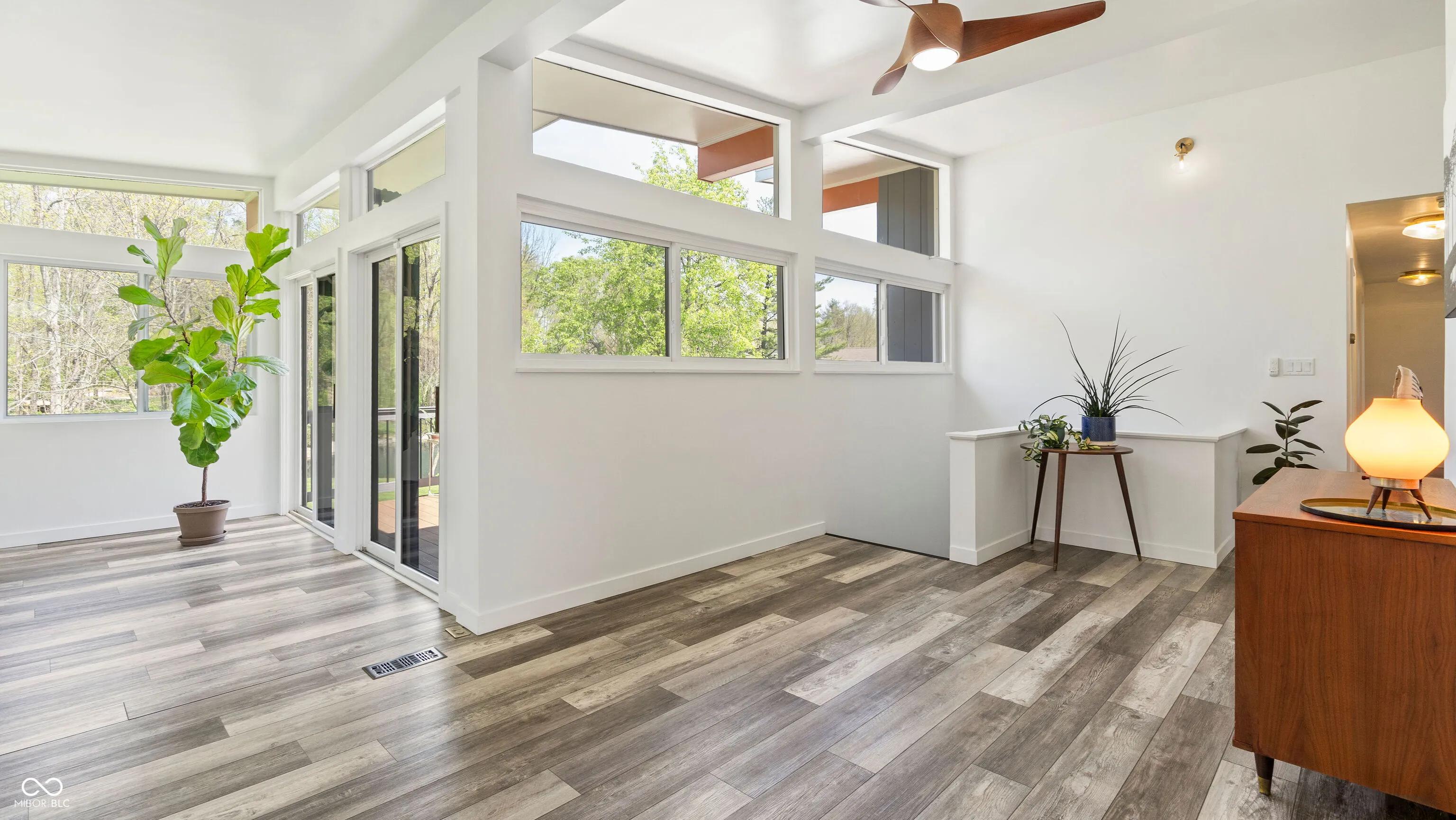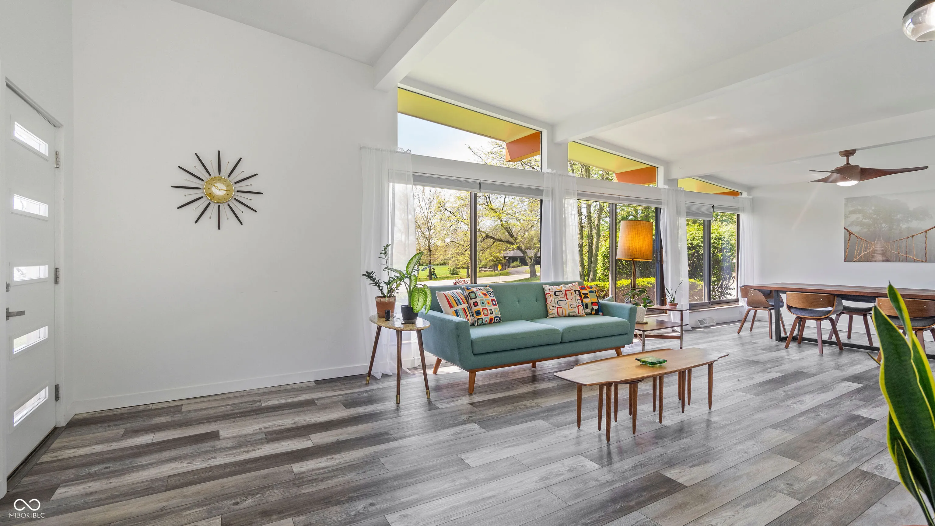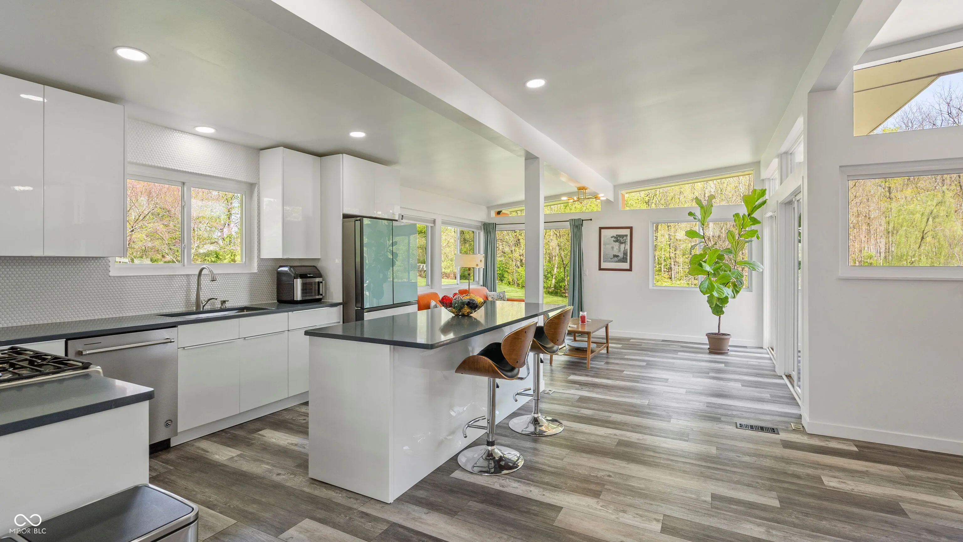 Welcome to this beautifully updated 1960s Mid-Century Modern home, offering timeless style and modern convenience on a serene 1.54-acre lot with a shared pond. The open floor plan features soaring ceilings, a wall of windows brings an abundance of light, beautiful fireplaces, and a newly renovated kitchen and bathrooms. Luxury waterproof vinyl plank flooring runs throughout the home, combining durability with contemporary style. Enjoy stunning views from the expansive back deck. The finished lower level offers flexible living space, perfect for an in-law suite with a living room and bedroom, both with sliding doors to the patio, and a full bath. Car lovers will appreciate the attached two-car garage plus a massive 4-6 car garage/workshop – ideal for vehicles, tools, and hobbies. If you love the outdoors, you’ll enjoy walking or riding on the nearby Buck Creek Trail. A rare opportunity to own a Mid-Century Modern gem in a park-like setting!