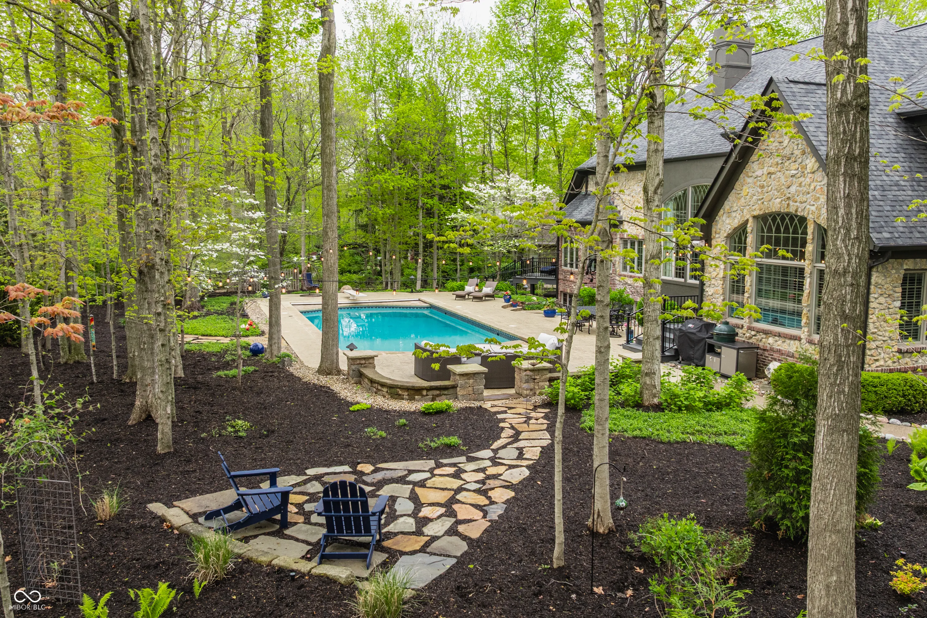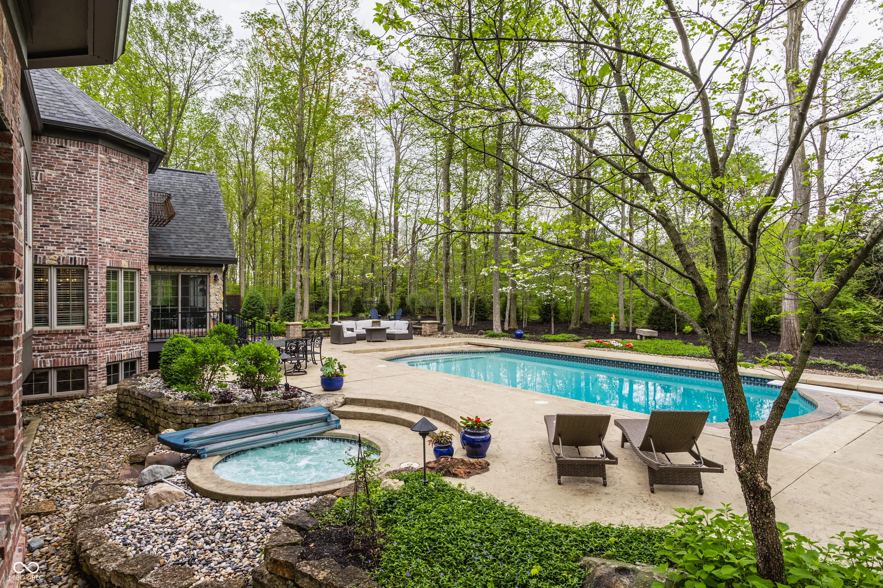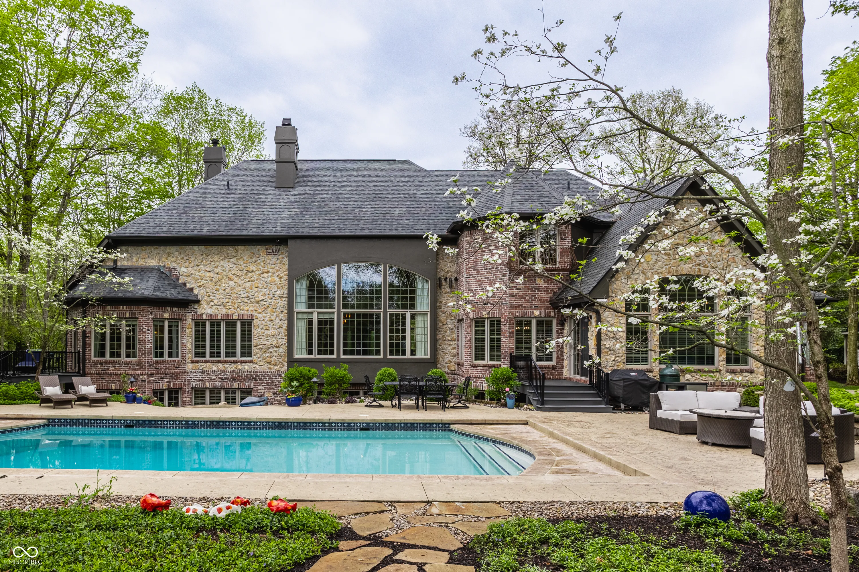 Tucked away on a serene, wooded lot, this exquisite French-inspired home is a true private oasis. Lush landscaping, newly added privacy trees, and thoughtful plantings surround a beautiful pool and hot tub. Whether you’re relaxing on the Trex deck off the sunroom and primary suite or entertaining guests on the expansive patio, outdoor living has never looked better. Inside, the home is filled with timeless charm and luxurious updates. The newly updated kitchen features elegant marble countertops and all-new hardware. The main-level primary suite is a sanctuary of style and comfort, offering a fully renovated spa-like bathroom with porcelain tile on the floors and walls, a marble shower floor, updated fixtures, quartz countertops with dual sinks, and a frameless glass shower enclosure. A dual-sided fireplace adds warmth and sophistication, and a spiral staircase leads to the beautifully finished lower level. Upstairs, you’ll find three spacious bedrooms, while the lower level boasts a wine cellar, a family room with fireplace, an office, a fifth bedroom, and an exercise room complete with a sauna. Every detail of this home is thoughtfully designed for luxury, comfort, and timeless appeal.