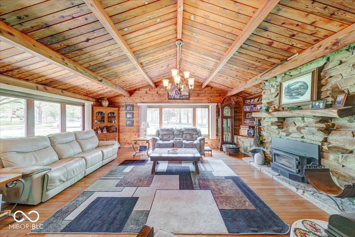 Country living at its best!! This 15.8 acre property offers a spacious 3 bedroom 2 bath home, nestled among mature trees. The 2628SF home offers beautiful wood beams and open floor plan, to include kitchen and dining area, opening up to a spacious great room. Stunning stone fireplace and mantel in the great room for cozy family gatherings. Spacious Primary bedroom is located on first floor with en-suite bathroom, secondary bedroom as well. Upstairs features huge family/recreation room(Pool table included), third bedroom which has a large sauna! This room can be your own private gym, office, or playroom. Along with this beautiful home and acreage, there are two stocked ponds and three additional outbuildings. The24x48 workshop has concrete floor, electric and wood stove. The 34×44 steel barn has electric, concrete floors, offering plenty of storage for cars, tractors, four wheelers, dirt bikes, and additional equipment and the smaller mini barn is 12×26. There is an additional covered pavilion for family gatherings and barbecues it features a concrete floor and electric. This property offers a combination of rustic charm and all of the feature comforts to enjoy in country living. An outdoorsman’s dream property! You must see to appreciate it.