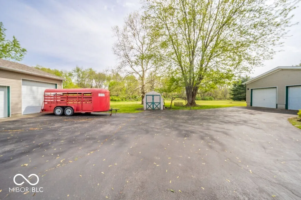 Enjoy Nature! 3 bed, 2 bath home on 3.31 acres; attached 2-car garage & detached 3-car garage with RV door. Spacious 15×24 sunroom with a wood-burning stove and back deck with beautiful views of Little Blue. Beyond the detached garage is RV parking with a concrete patio and separate RV septic. This property offers privacy, extra garage space, & country living convenient to New Castle, Muncie & beyond.