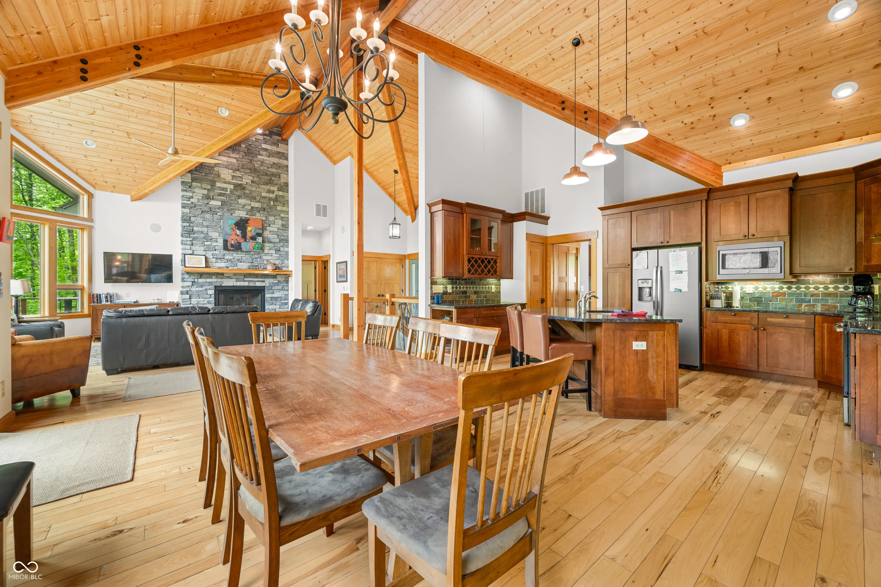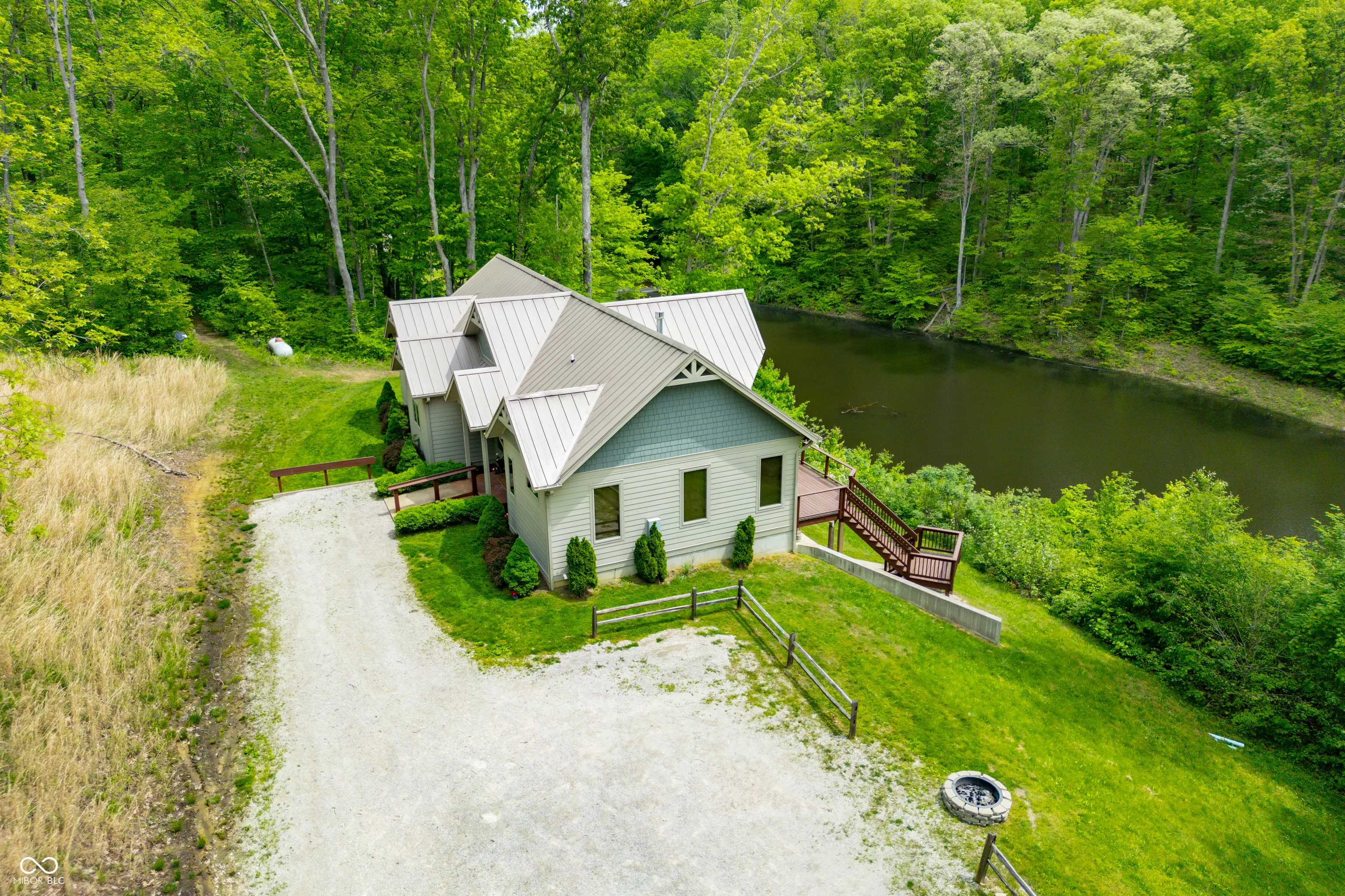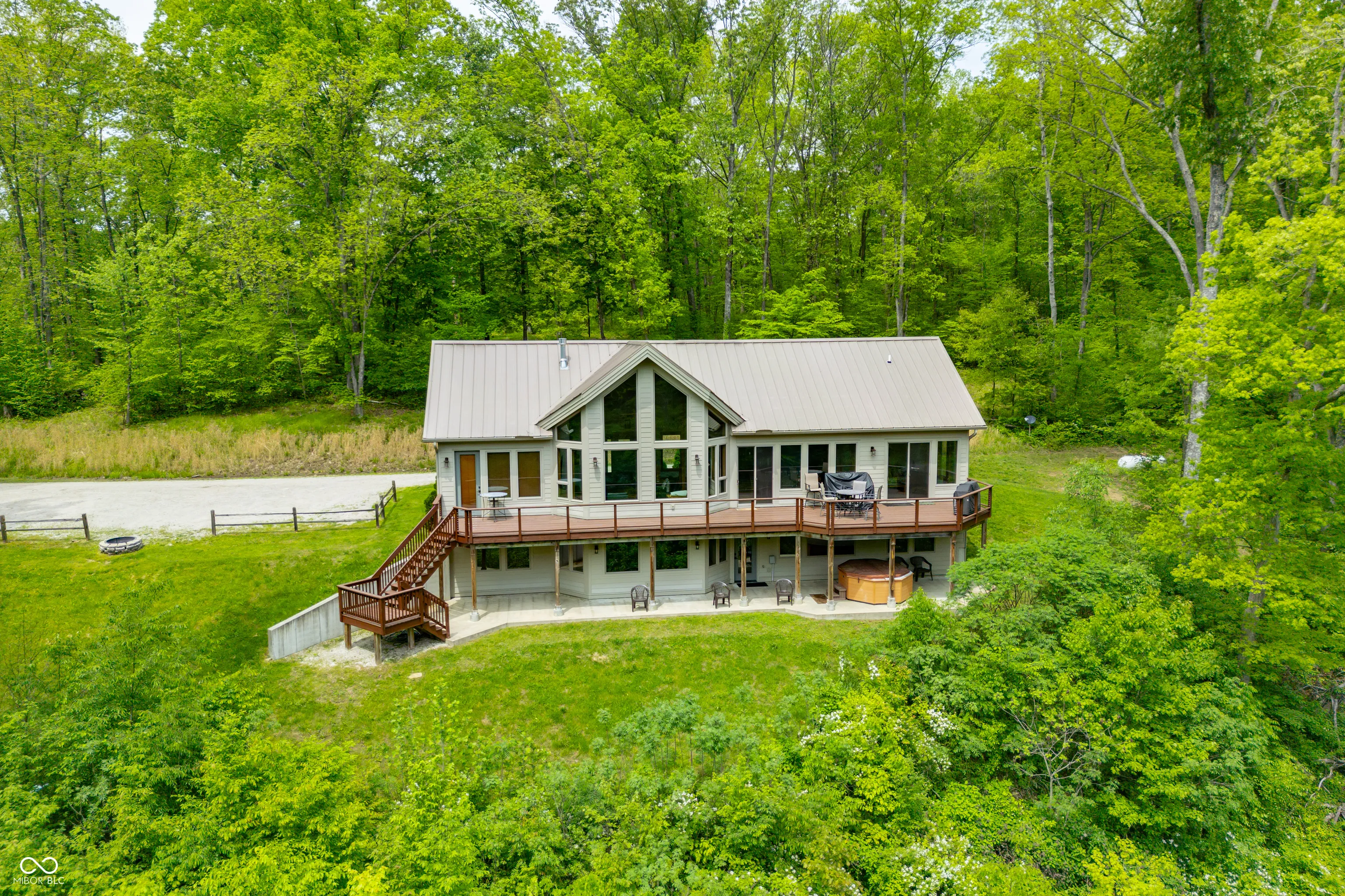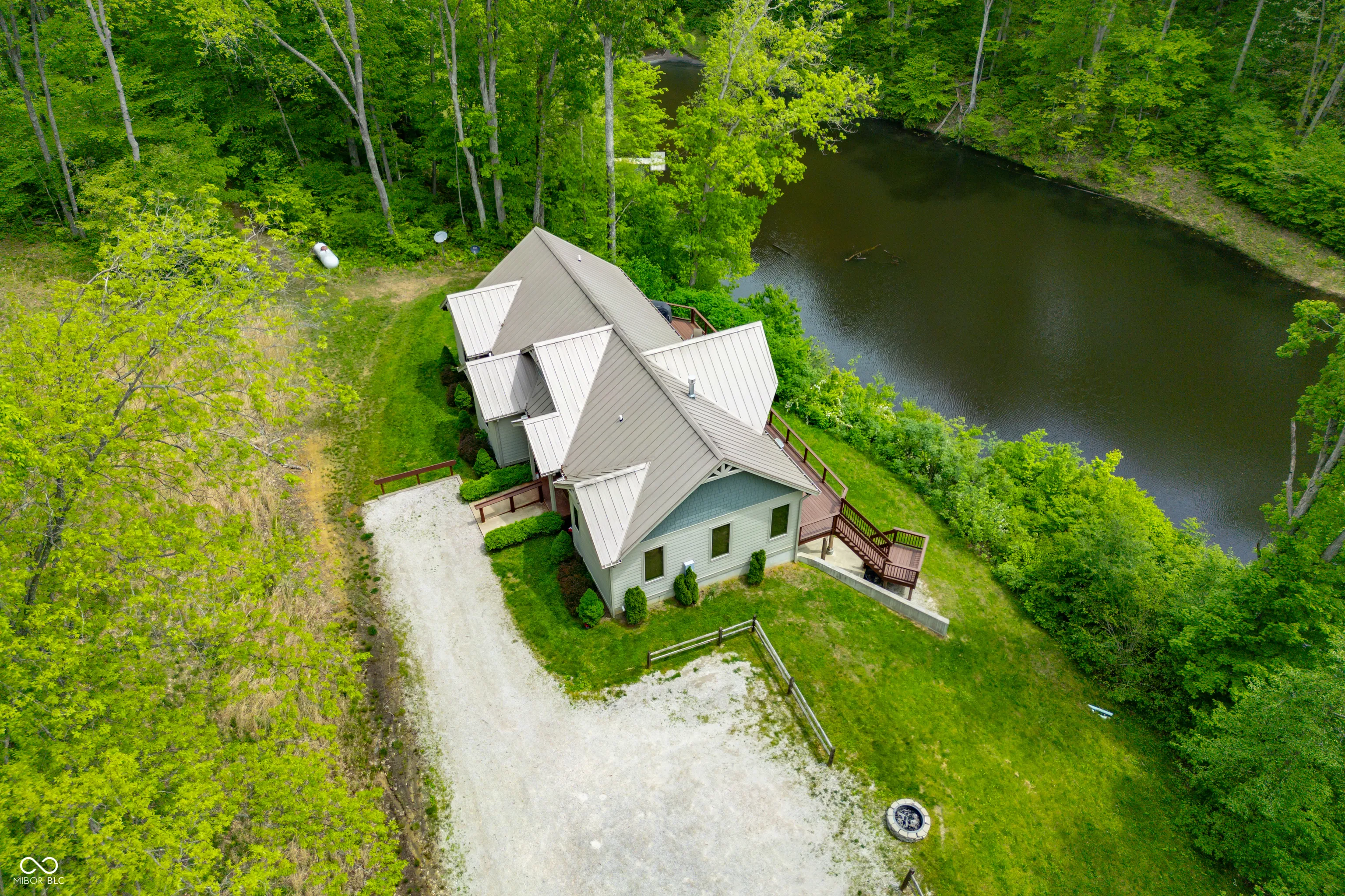 “Lake Forest Cabin” is a stunning 4-bedroom, 3.5-bath timber frame retreat perched at the edge of a serene, 3-acre stocked lake on 12.26 acres of land. Nestled at the end of a quiet, county-maintained road bordered by Brown County State Park and Sycamore Land Trust. This property holds a special exception for overnight tourist rental, making it a turnkey opportunity for both personal enjoyment and income-generating potential – approved for up to 8 guests. Inside, the main level boasts soaring ceilings, rich hickory hardwood and ceramic tile flooring, and breathtaking lake views through expansive windows that flood the space with natural light. The master suite and a second bedroom offer comfort and privacy, while the spacious kitchen – featuring cherry cabinetry, a center island with seating, and ample granite countertop space – is ideal for entertaining. The great room’s gas-log fireplace and adjacent dining area create a warm, inviting atmosphere, while the sunroom provides a peaceful spot to unwind. A full-length deck spans the lake side of the home, offering panoramic views and plenty of room for outdoor dining or relaxation. Custom ironwork railings lead you to the finished walk-out lower level, where you’ll find two additional bedrooms, a generous recreation and family room with wet bar, a full bath with double vanities, and several versatile bonus and storage rooms. Step out to the covered lower-level patio and enjoy the private hot tub. Efficiency and comfort come together with a lake-looped geothermal HVAC system, two tankless water heaters, dual 200-amp electric panels, and high-speed fiber optic internet. The home also includes numerous handicap-accessible features, ensuring ease of access for all. As an added opportunity, the adjoining property at 468 Upper Schooner Rd – also a licensed tourist rental – is available for purchase (See BLC #22037147 for details.)