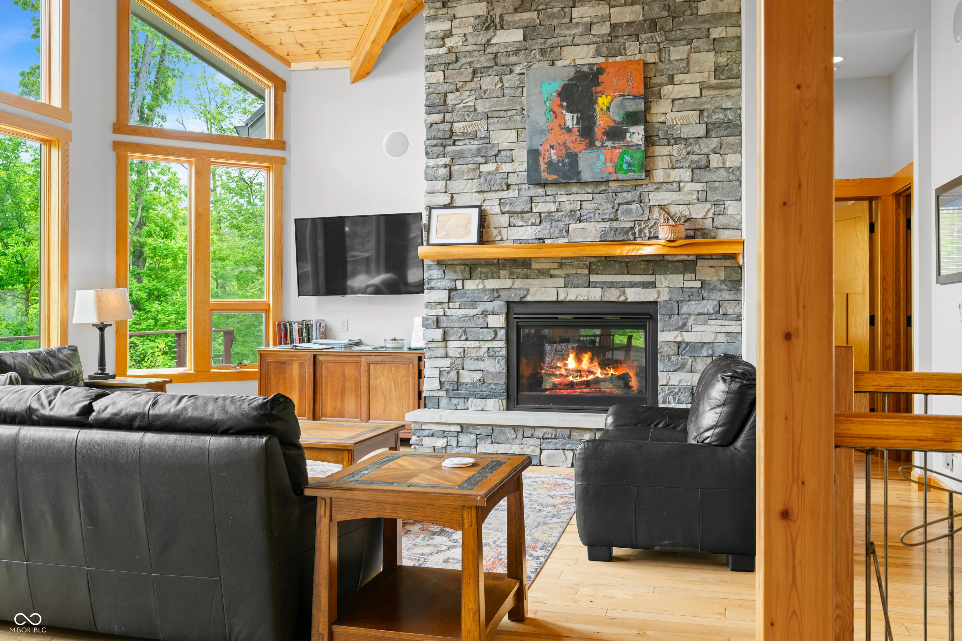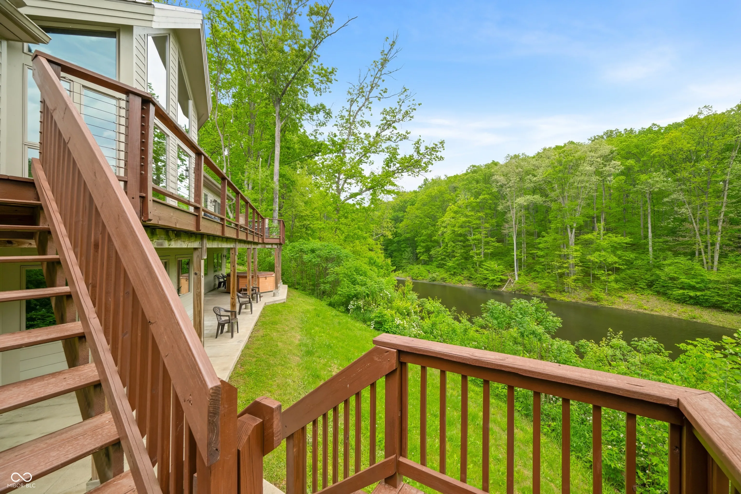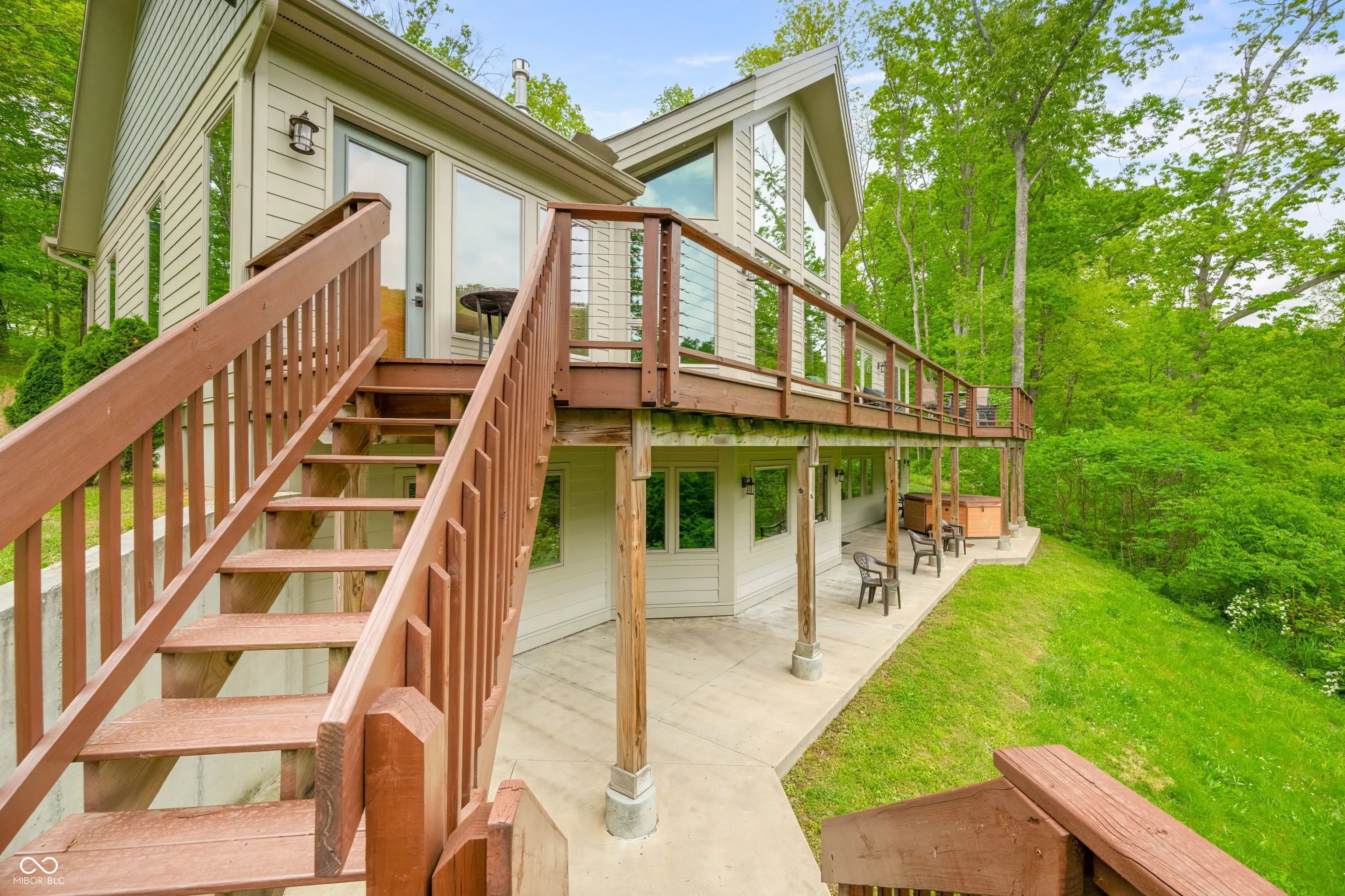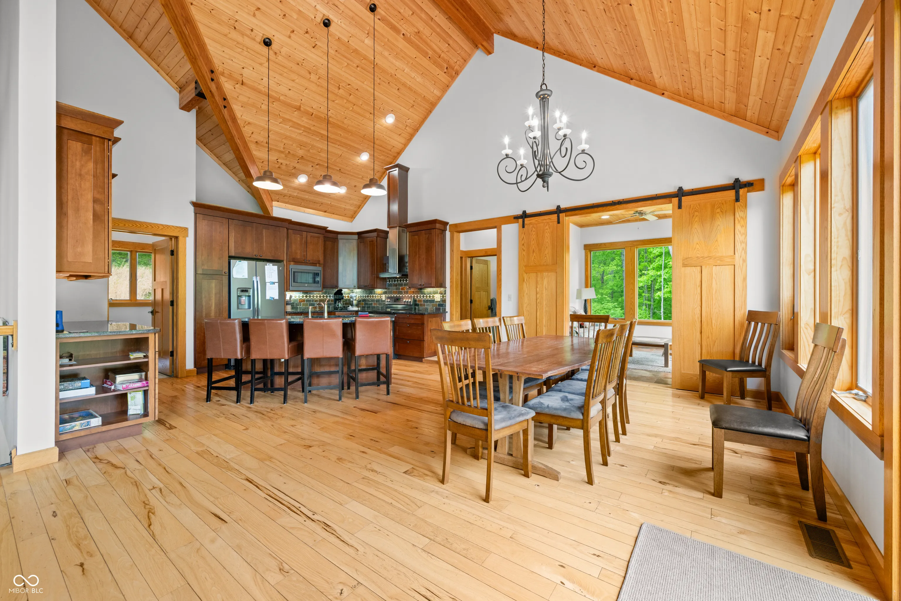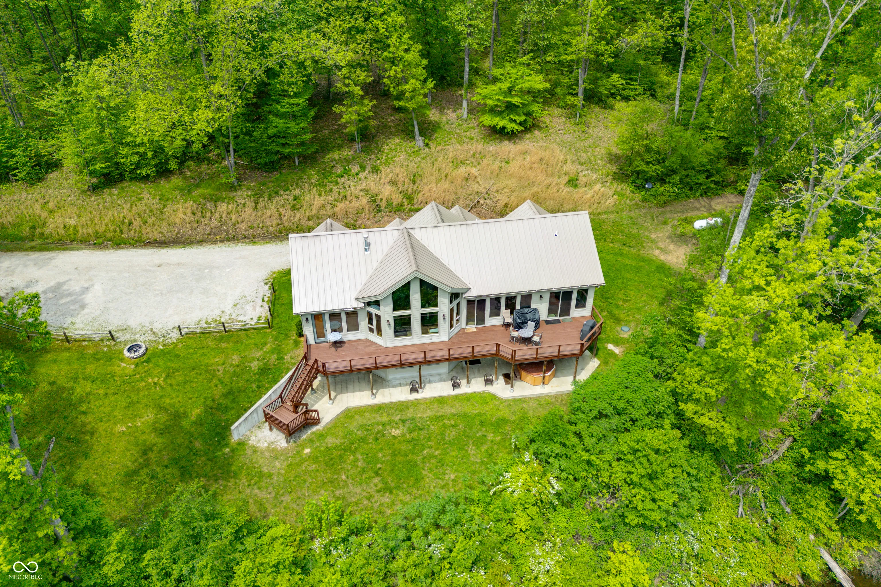 “Lake Forest Cabin” is a stunning 4-bedroom, 3.5-bath timber frame retreat perched at the edge of a serene, 3-acre stocked lake on 12.26 acres of land. Nestled at the end of a quiet, county-maintained road bordered by Brown County State Park and Sycamore Land Trust. This property holds a special exception for overnight tourist rental, making it a turnkey opportunity for both personal enjoyment and income-generating potential – approved for up to 8 guests. Inside, the main level boasts soaring ceilings, rich hickory hardwood and ceramic tile flooring, and breathtaking lake views through expansive windows that flood the space with natural light. The master suite and a second bedroom offer comfort and privacy, while the spacious kitchen – featuring cherry cabinetry, a center island with seating, and ample granite countertop space – is ideal for entertaining. The great room’s gas-log fireplace and adjacent dining area create a warm, inviting atmosphere, while the sunroom provides a peaceful spot to unwind. A full-length deck spans the lake side of the home, offering panoramic views and plenty of room for outdoor dining or relaxation. Custom ironwork railings lead you to the finished walk-out lower level, where you’ll find two additional bedrooms, a generous recreation and family room with wet bar, a full bath with double vanities, and several versatile bonus and storage rooms. Step out to the covered lower-level patio and enjoy the private hot tub. Efficiency and comfort come together with a lake-looped geothermal HVAC system, two tankless water heaters, dual 200-amp electric panels, and high-speed fiber optic internet. The home also includes numerous handicap-accessible features, ensuring ease of access for all. As an added opportunity, the adjoining property at 468 Upper Schooner Rd – also a licensed tourist rental – is available for purchase (See BLC #22037147 for details.)