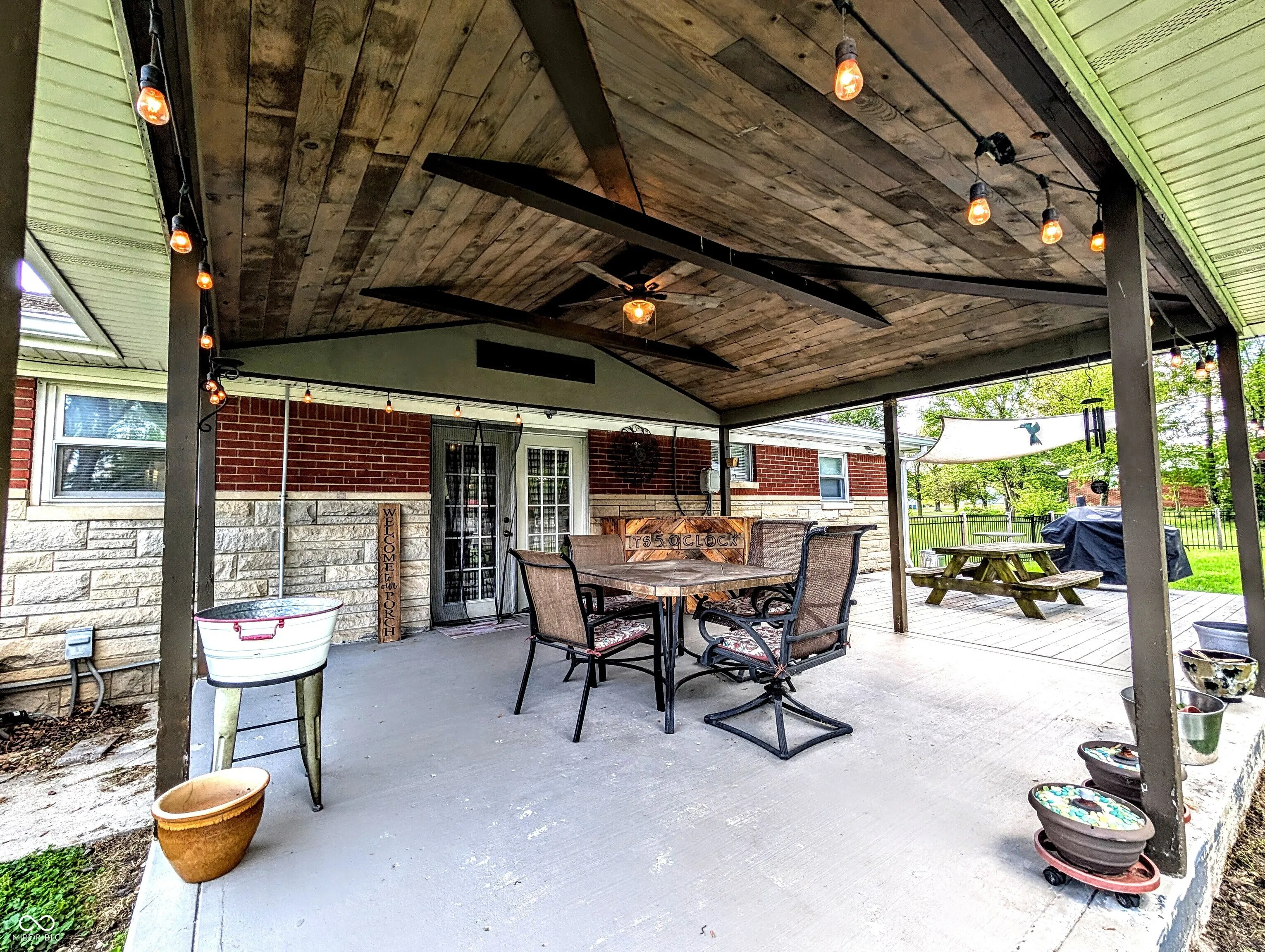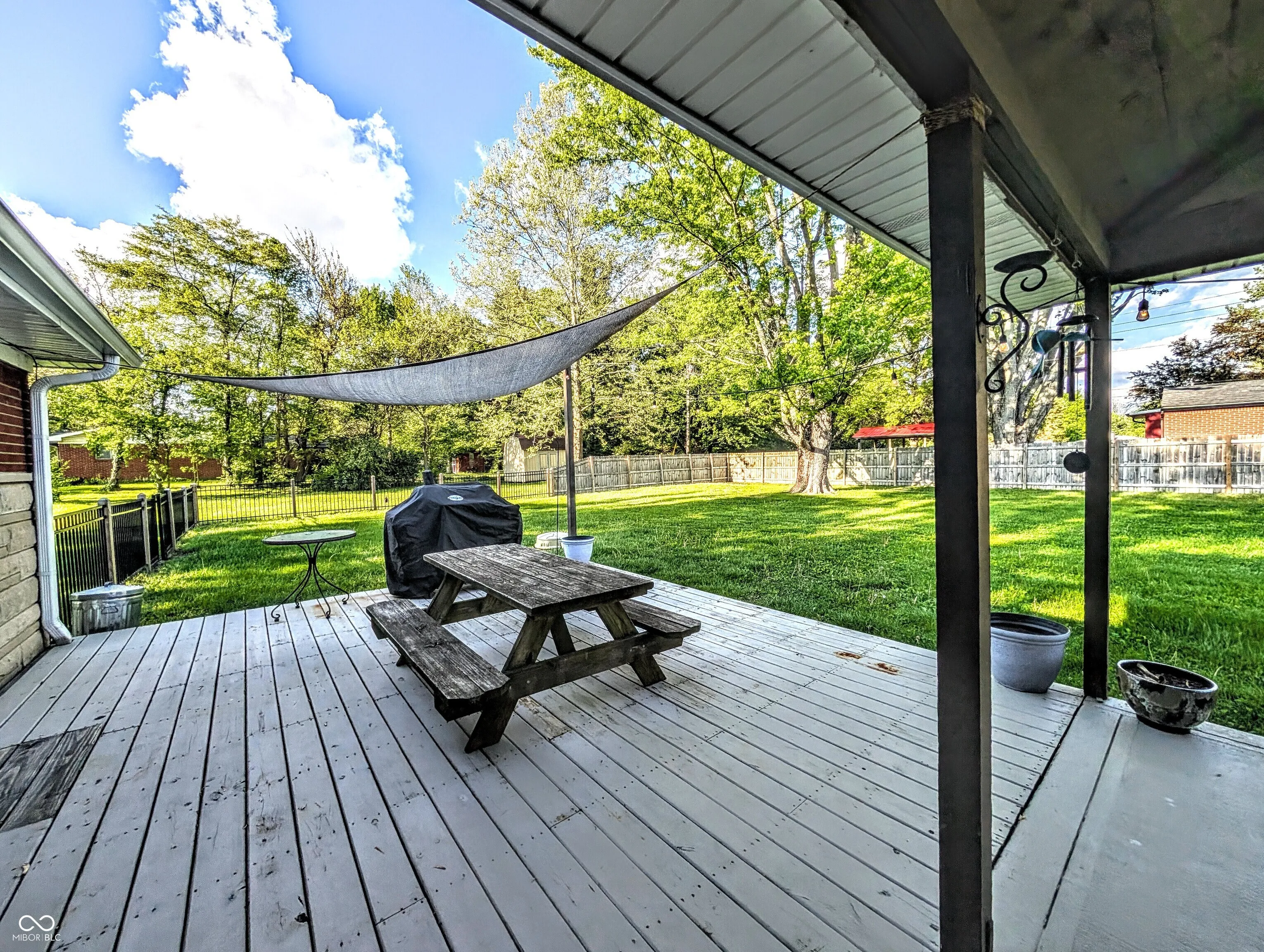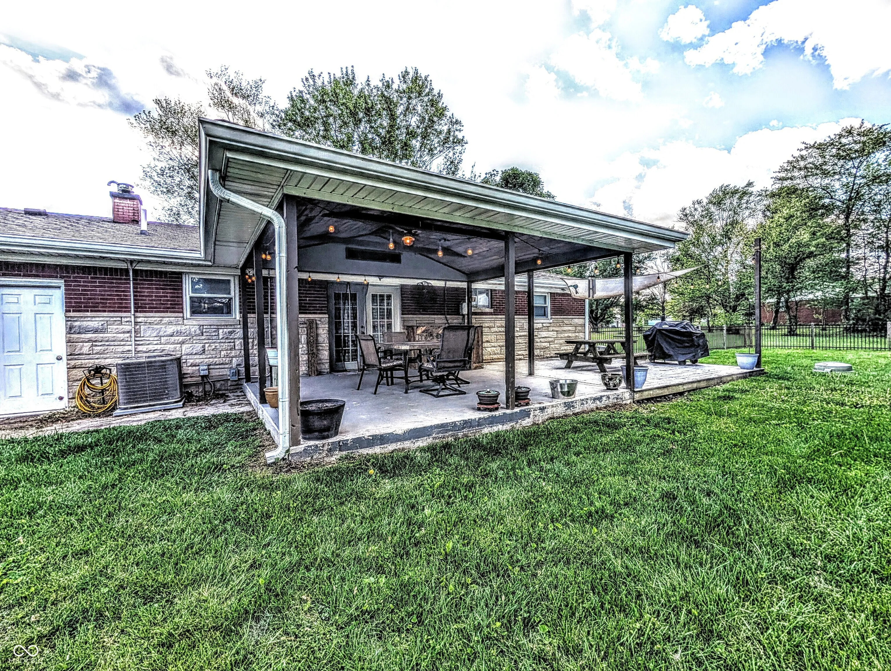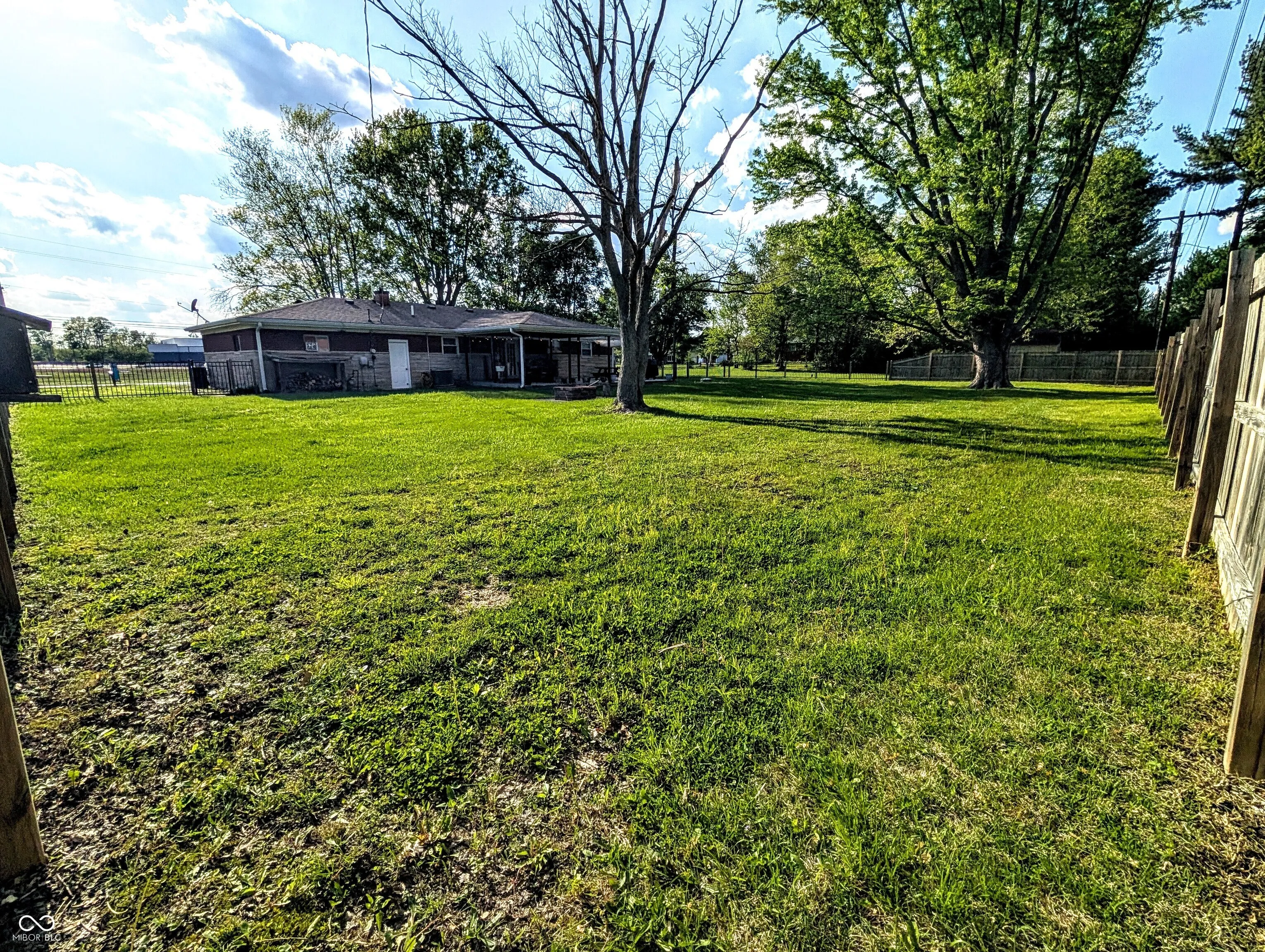 Come see this beautiful brick ranch home that sits on almost one full acre and without an HOA!!! The yard is a must see!!! This home boasts of a large fenced in yard with dual gates, mature trees, and a mini barn. Inside the fence you have more mature trees, a solid brick firepit, a covered patio, deck with sun awning, and access to kitchen. The patio features decorative lighting, a sound bar, electrical fan with lights. The deck expands the patio allowing for grilling, and a place to eat, party, have guests. The Driveway is accessible from both streets with a U turn built in to allow for ample parking and easy access to either road. Across the street is a huge church with playground, walking trails and more! The home has an attached 2.5 car garage with laundry, windows, and a huge workbench that stays with the home. The home has solid hardwood floors throughout the home, tile in the kitchen and bathrooms, and carpet laid over the hardwood in 2 of the bedrooms. The home is a 3-bedroom, 2 full bath and is 1066 square feet.