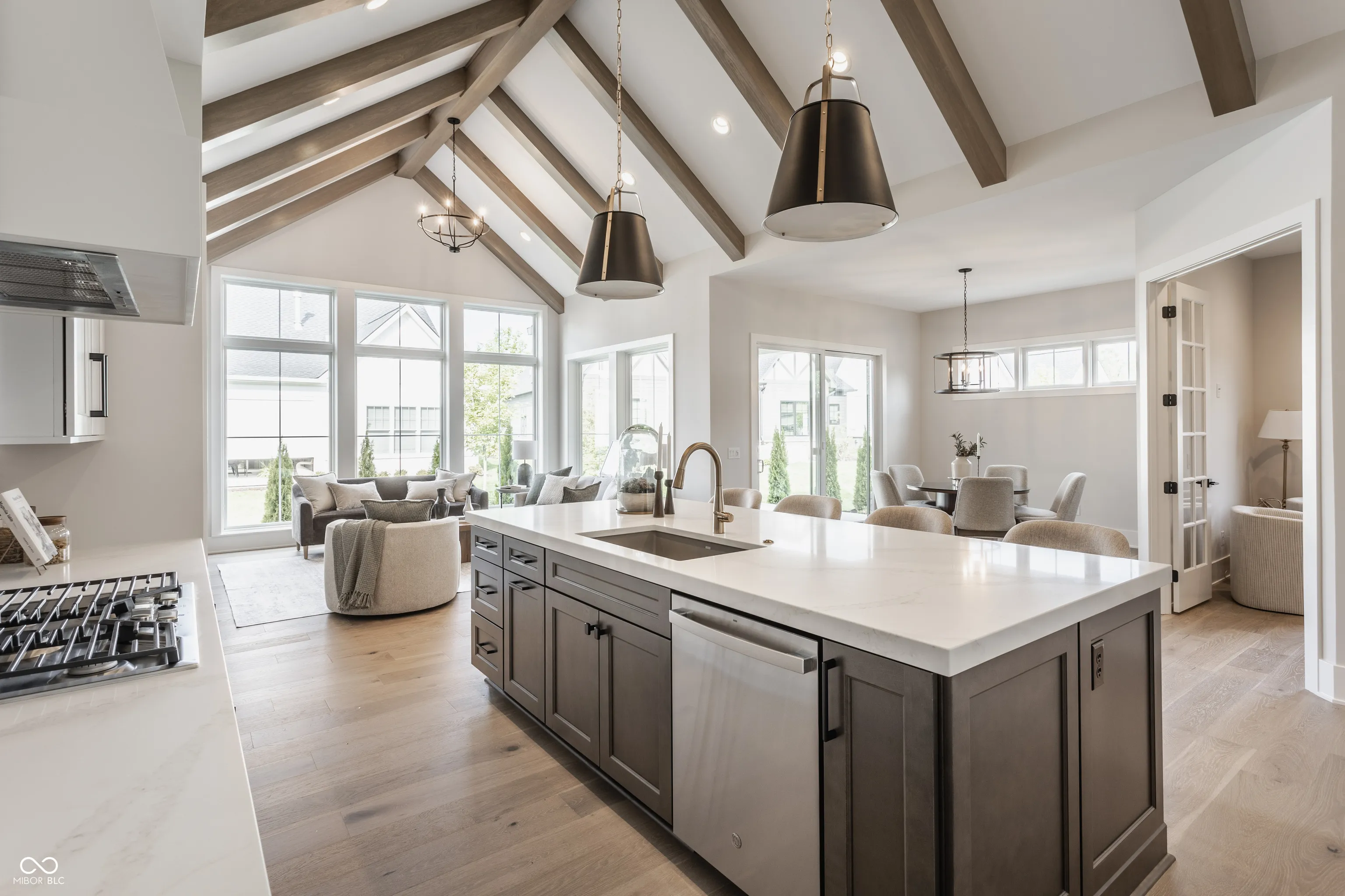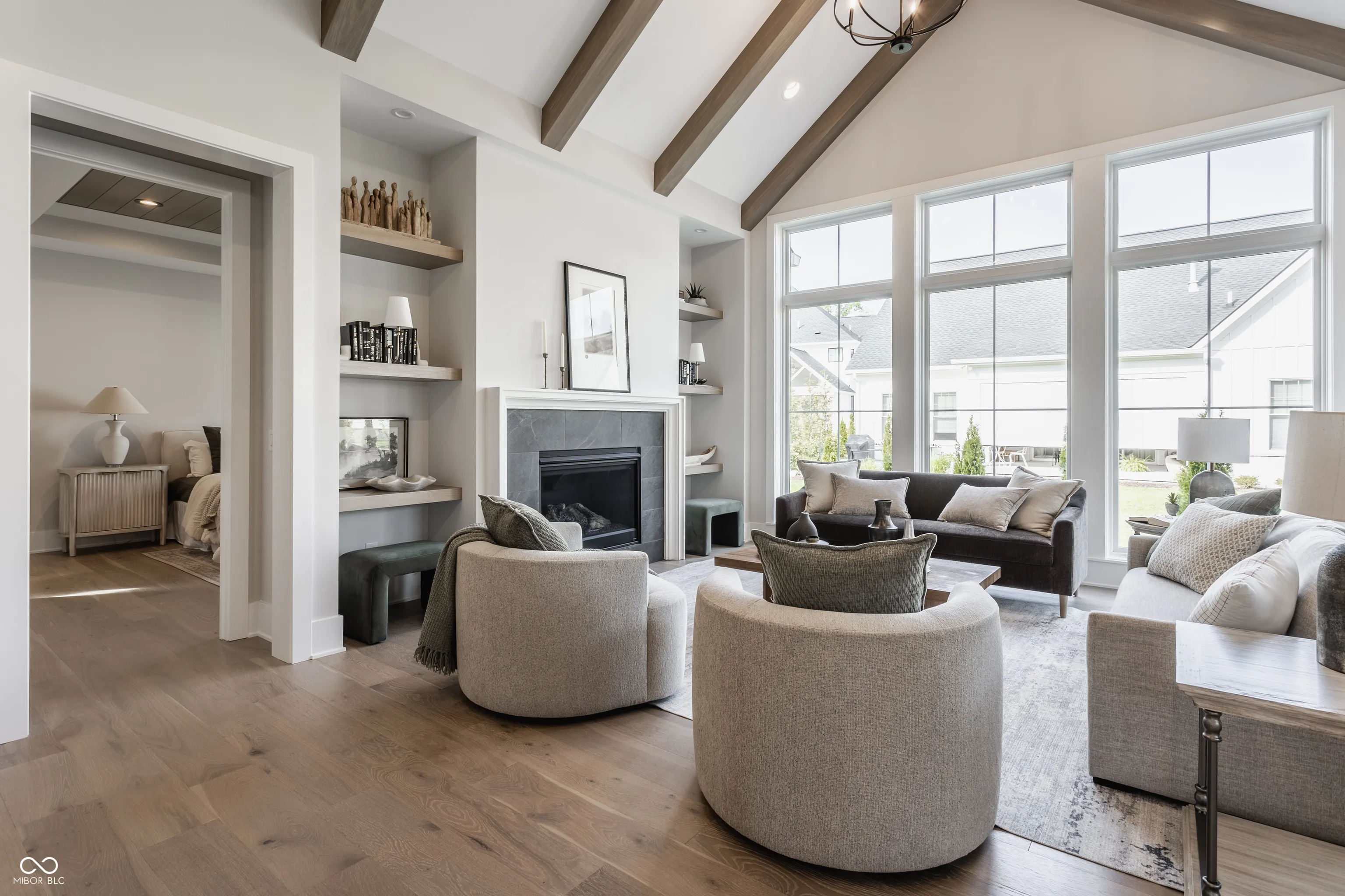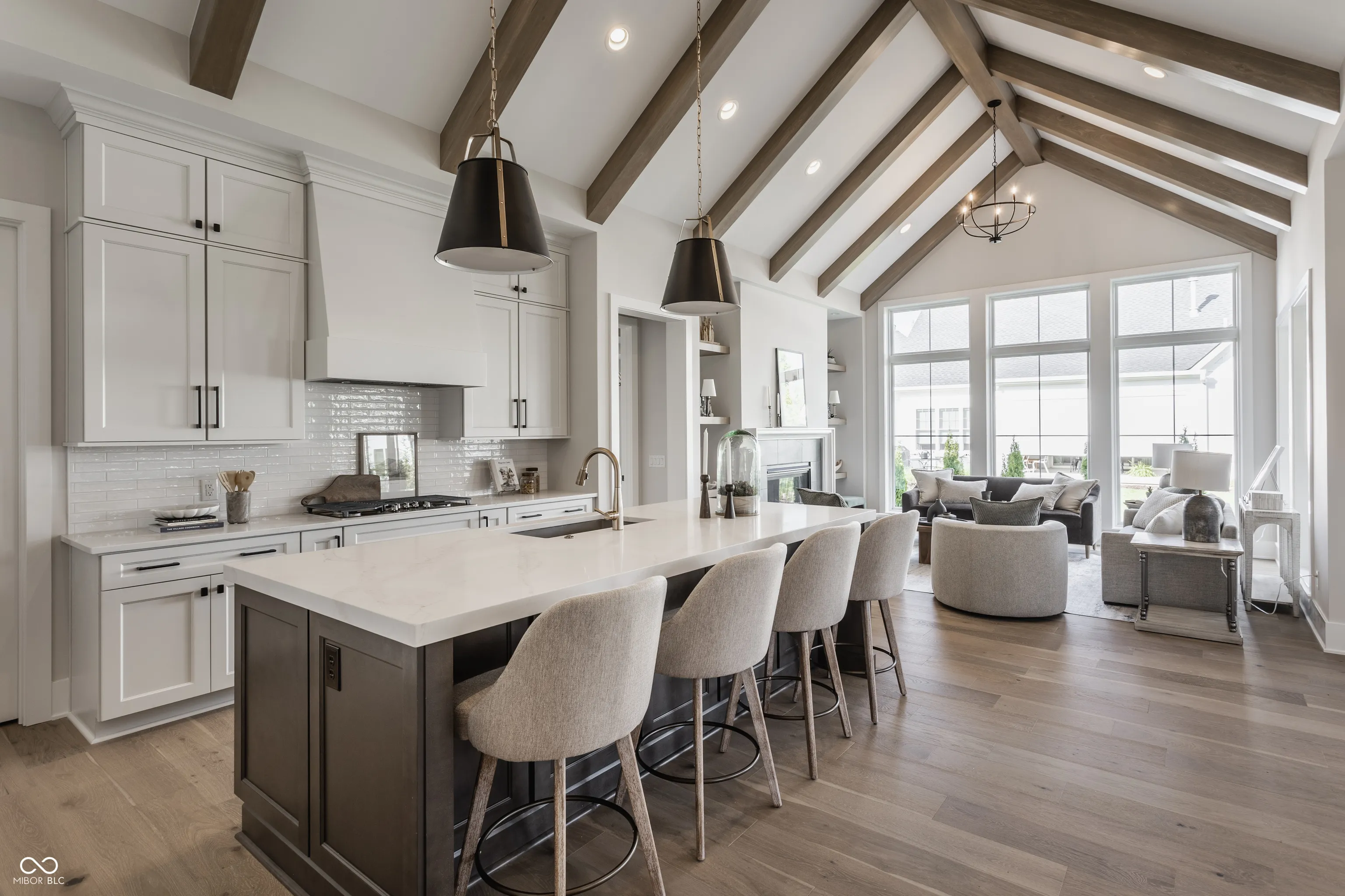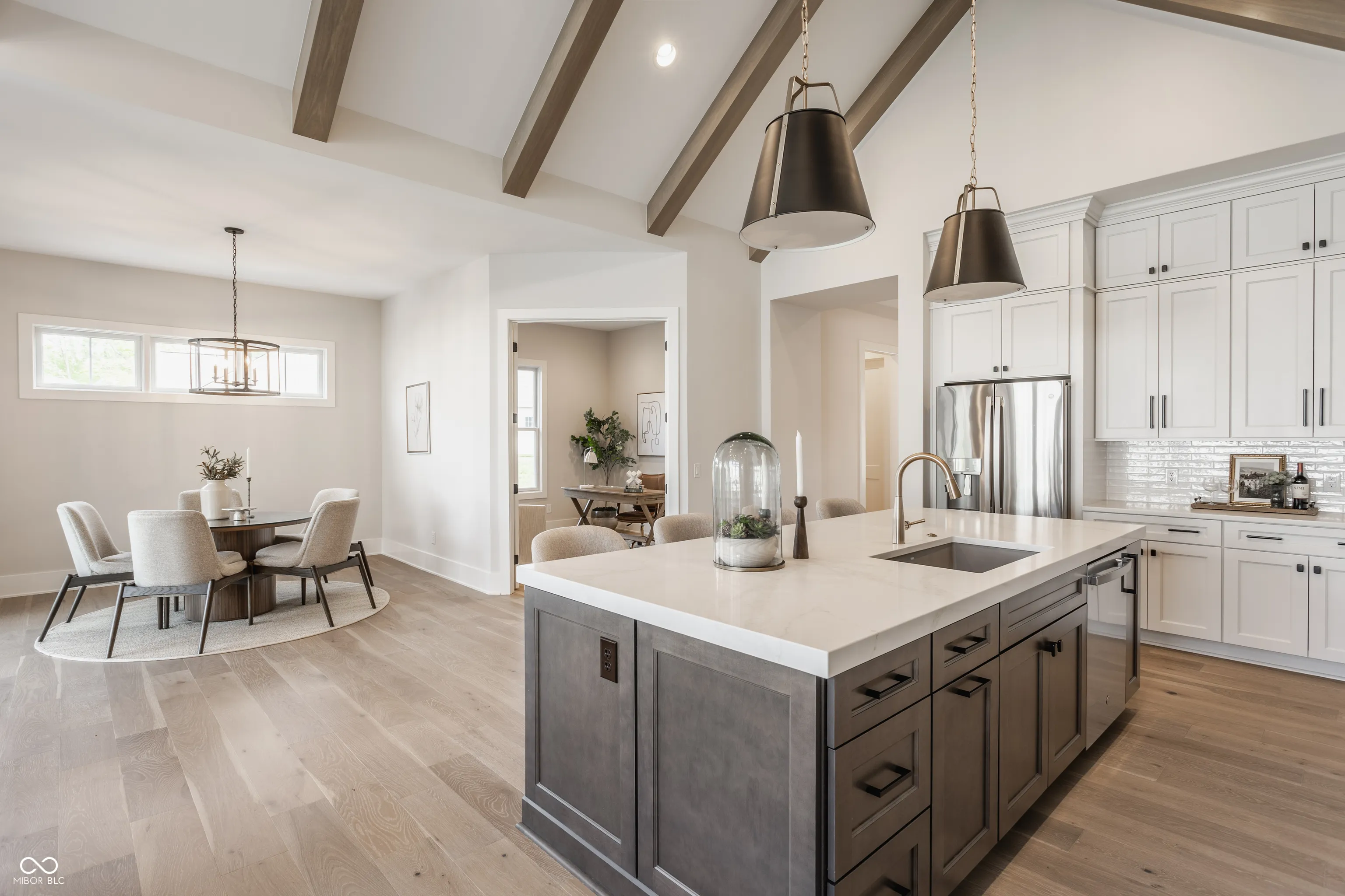 Tucked away on a quiet cul-de-sac in one of Zionsville’s most coveted neighborhoods, this custom ranch home strikes the perfect balance between elevated design and everyday ease. From the moment you step inside, it’s clear this home was thoughtfully crafted-every space intentional, every finish timeless. The great room is a showstopper with soaring vaulted ceilings, wood beams, and a striking fireplace that anchors the open layout. Natural light floods in through oversized windows, highlighting the warm textures and architectural detail throughout. The kitchen is truly the heart of the home-centered around a stunning Calacatta Vivo quartz island, flanked by floor-to-ceiling custom cabinetry and top-tier appliances that make hosting feel effortless. The main level is refined yet livable. The primary suite feels like a retreat, with beautiful natural light, a spa-like bath, dual vanities, and a walk-in closet. A second bedroom on the main floor offers versatility. A separate den creates the ideal work-from-home setup. Downstairs, the finished lower level offers more room to live and gather. A large rec area can flex for movie nights, play space, or entertaining, while two additional bedrooms give options for a guest suite, home gym, or creative studio-both served by a beautifully finished bath. Additional features include designer lighting, wide-plank hardwoods, custom trim details, and tray ceilings with wood detail. Every inch of this home reflects quality, care, and elevated living. All of this set within the gates of Holliday Farms-Zionsville’s premier lifestyle community with championship golf, resort-style amenities, nature trails, and a sense of connection that’s hard to find.