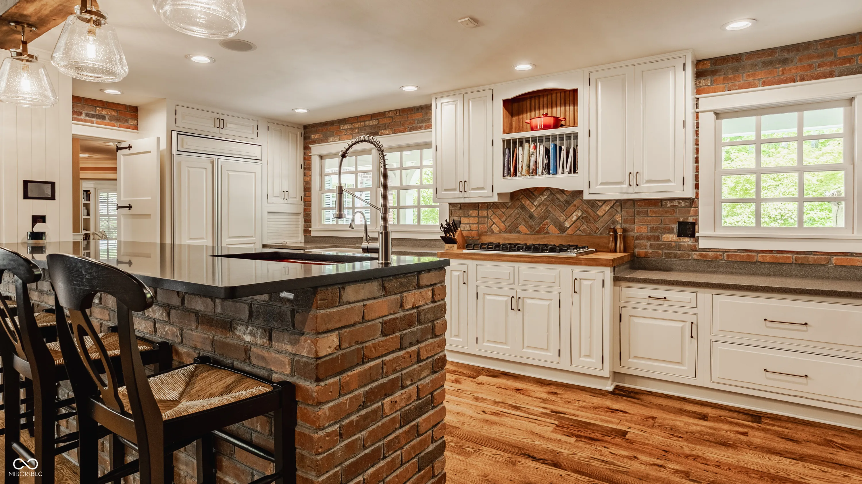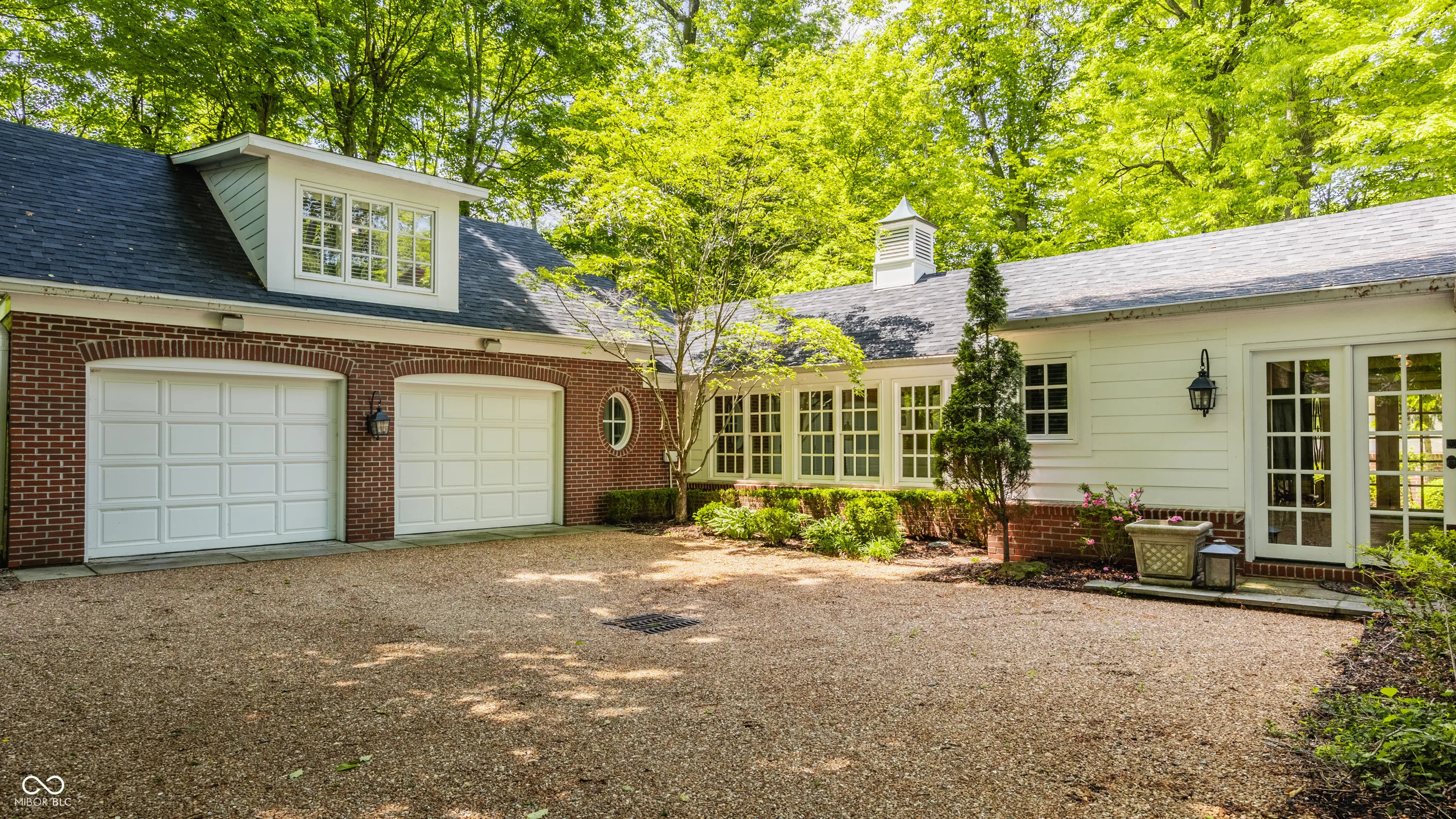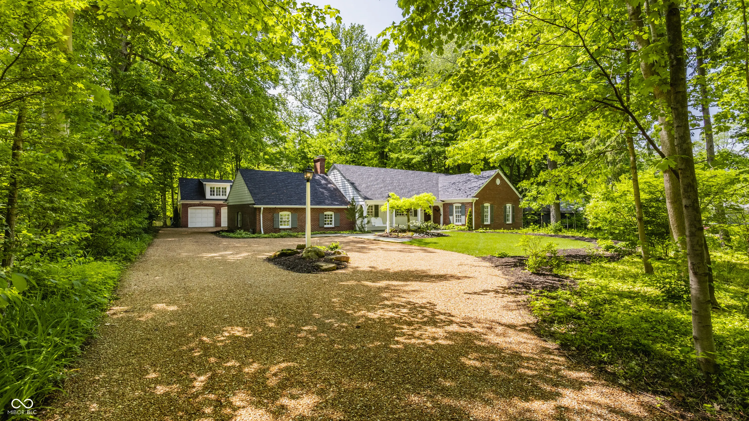 A true sanctuary in the city, this sprawling ranch rests along a quiet cul-de-sac in Washington Township one might miss if you don’t look carefully. Tucked among tall trees and lush landscaping this red brick ranch blends organically with its beautiful surroundings. The long red gravel drive gives way to a blue stone walk and charming covered front porch. Inside you’ll find a home styled with a more Mountain West influence with wide wide plank wood floors, exposed beams bracing the ceilings, and brick accents in floors and walls throughout the home. The open kitchen is set with high-end Viking appliances, ample counters, and a large pantry creating a functional and beautiful space. Open to the handsome great room and dining room, it is easy to see how enjoyable entertaining might be in these spaces. Beyond the great room rests doors to the rear break patio. The private rear yard is lined with mature trees creating a retreat like setting. A built-in fire pit and a spa will take the chill out of fall and winter evenings here. The primary bedroom accesses the spa via private doors. This bedrooms vaulted ceilings, ensuite bath, and large hall custom closet are unique and impressive. With three additional bedrooms each with large closets and adjacent full baths, there is plenty of space inside. Lastly the home enjoys two large spaces for additional entertainment or play, a large rec/family room near the kitchen and dining rooms, as well as a spacious bonus room above the garage. There is much to love inside and out this lovely Washington Township home!