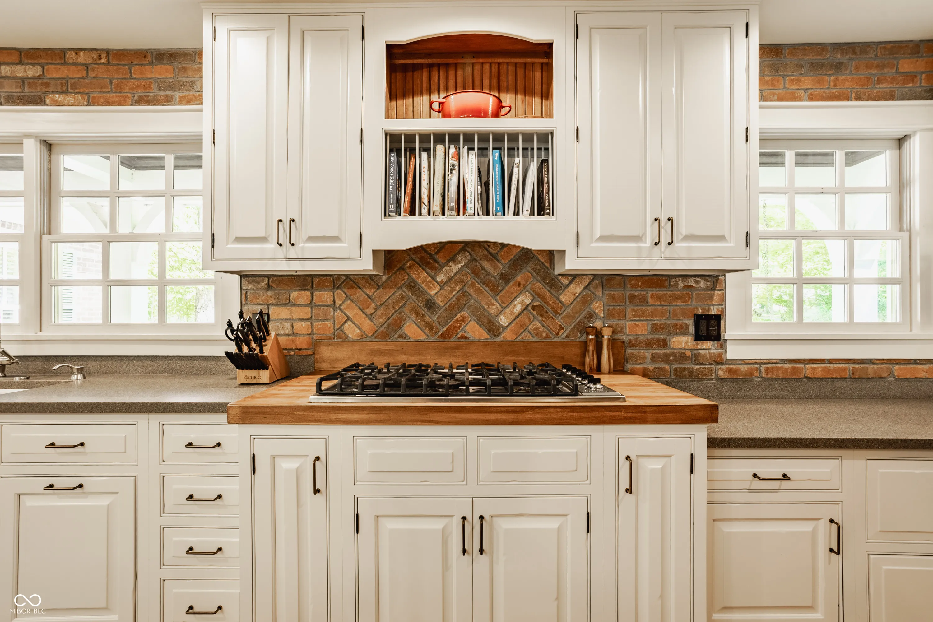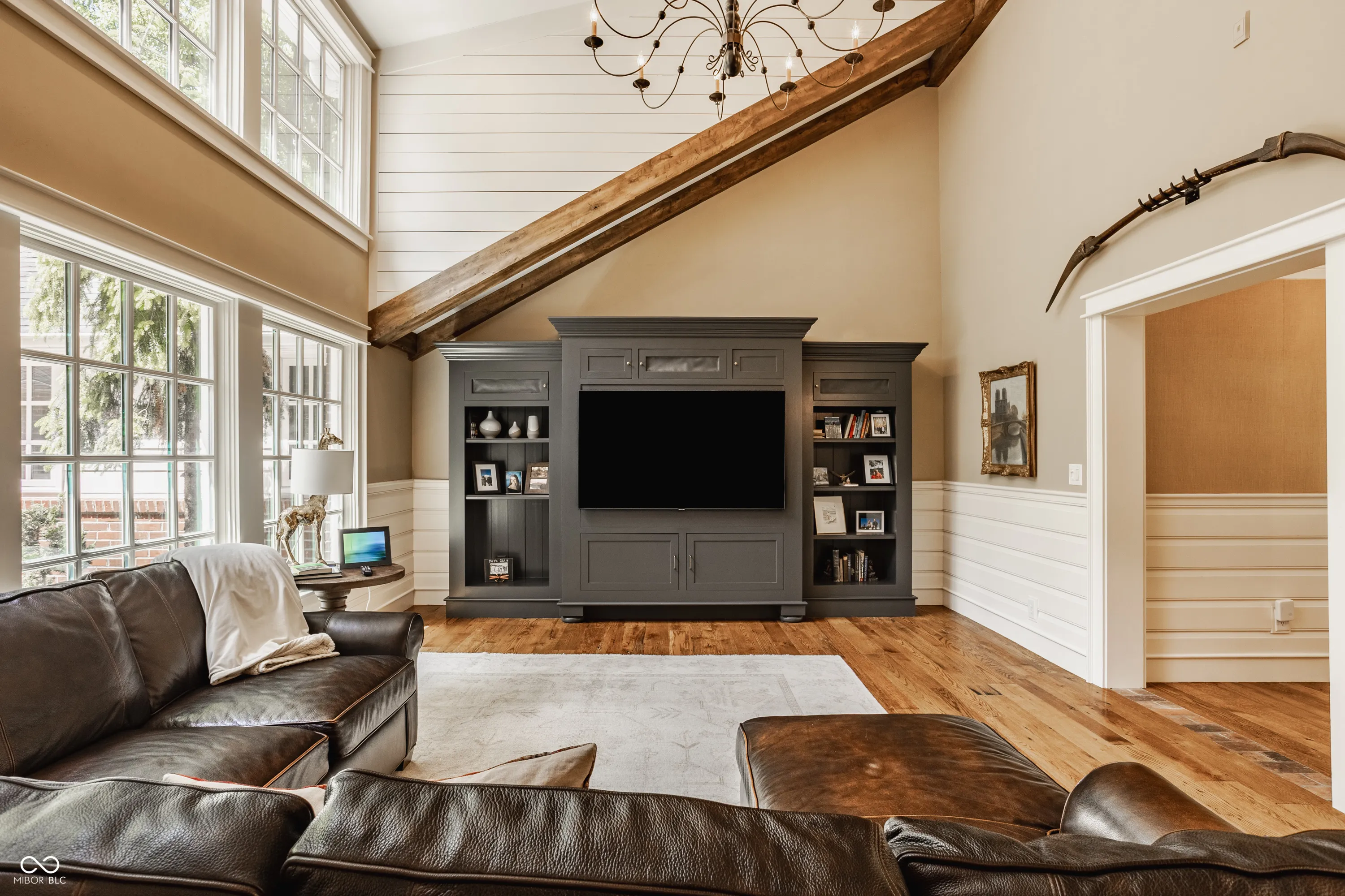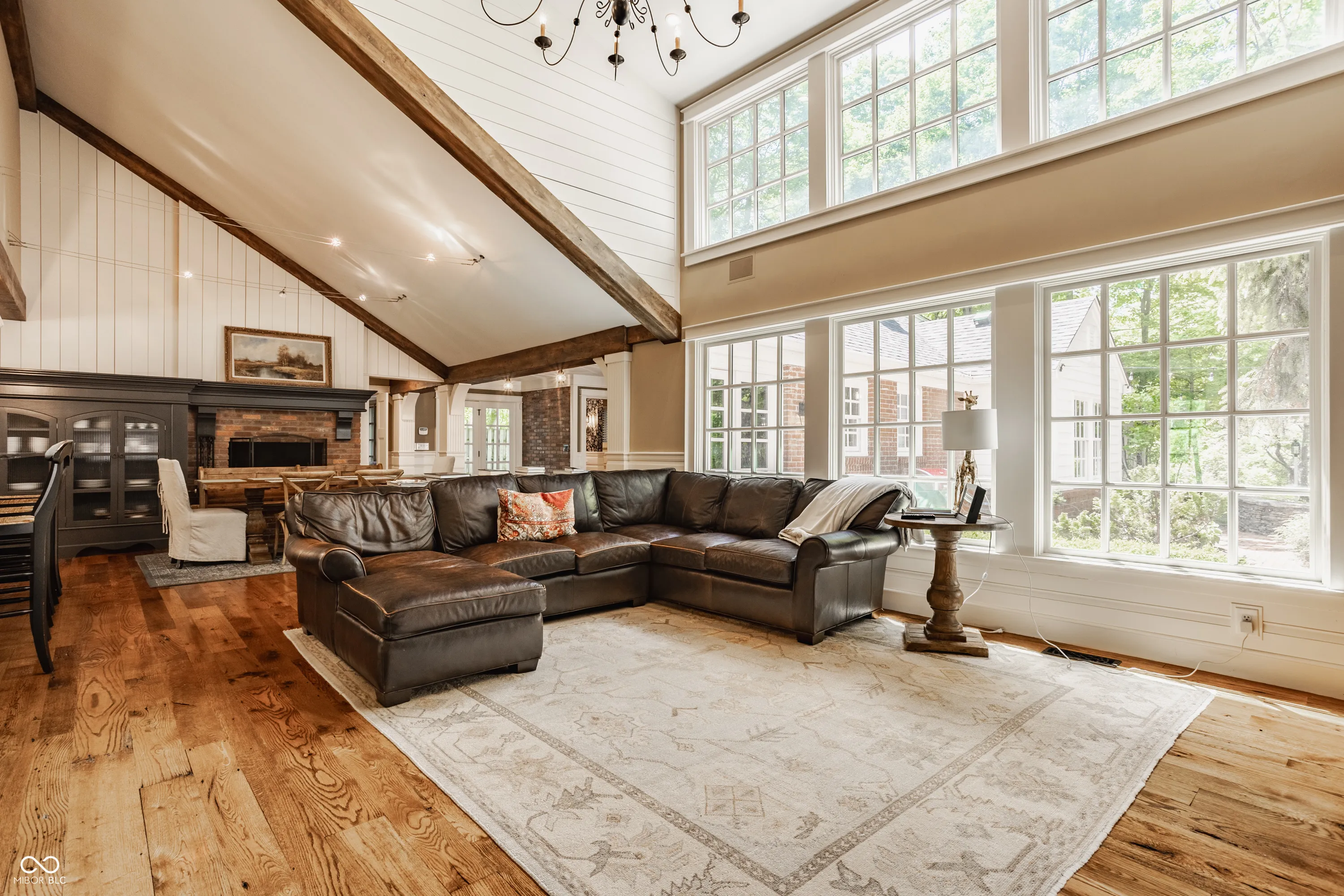 A true sanctuary in the city, this sprawling ranch rests along a quiet cul-de-sac in Washington Township one might miss if you don’t look carefully. Tucked among tall trees and lush landscaping this red brick ranch blends organically with its beautiful surroundings. The long red gravel drive gives way to a blue stone walk and charming covered front porch. Inside you’ll find a home styled with a more Mountain West influence with wide wide plank wood floors, exposed beams bracing the ceilings, and brick accents in floors and walls throughout the home. The open kitchen is set with high-end Viking appliances, ample counters, and a large pantry creating a functional and beautiful space. Open to the handsome great room and dining room, it is easy to see how enjoyable entertaining might be in these spaces. Beyond the great room rests doors to the rear break patio. The private rear yard is lined with mature trees creating a retreat like setting. A built-in fire pit and a spa will take the chill out of fall and winter evenings here. The primary bedroom accesses the spa via private doors. This bedrooms vaulted ceilings, ensuite bath, and large hall custom closet are unique and impressive. With three additional bedrooms each with large closets and adjacent full baths, there is plenty of space inside. Lastly the home enjoys two large spaces for additional entertainment or play, a large rec/family room near the kitchen and dining rooms, as well as a spacious bonus room above the garage. There is much to love inside and out this lovely Washington Township home!
