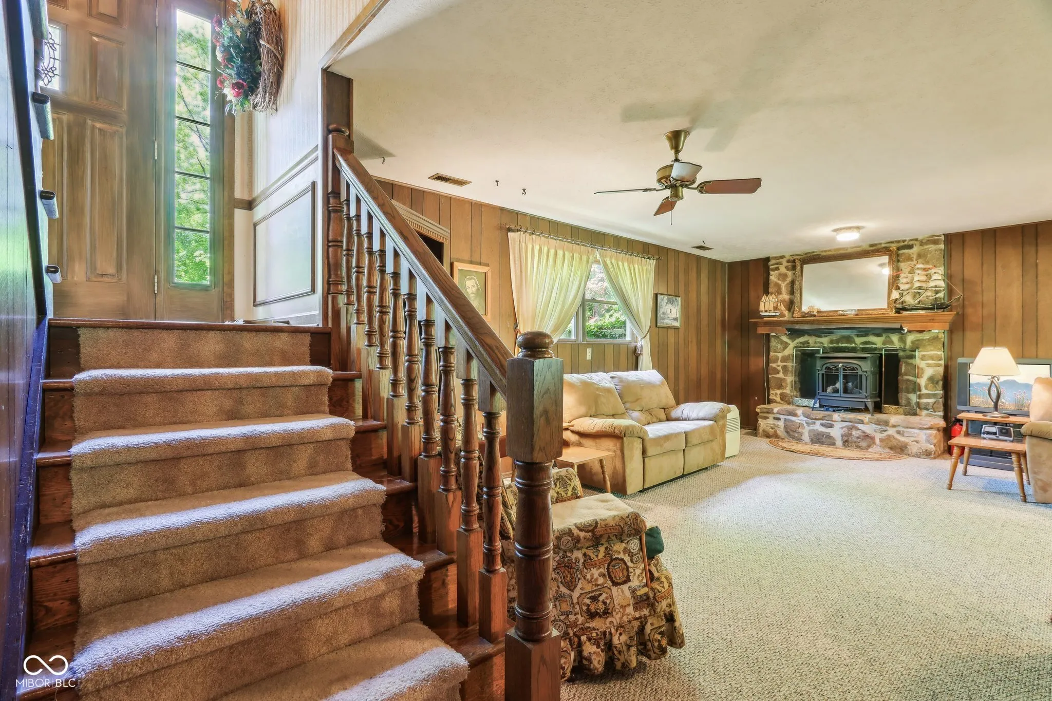 Nestled at 9240 E Woodview DR, BLOOMINGTON, IN, this single-family residence offers an inviting home that is ready to move into. Upon entry, the stunning woodwork draws you in. Imagine relaxing in the living room, where a warm fireplace casts a comforting glow across the space, highlighting the elegant crown molding, attractive built-in shelves, and distinctive wood wall. The kitchen features both a kitchen bar and a kitchen peninsula, offering versatile spaces for casual dining and entertaining. The bathroom provides a double vanity and convenient walk in shower all in close proximity to two bedrooms. The primary bedroom features crown molding and its own spacious ensuite bathroom, along with a den/library and deck creating a private and comfortable retreat. The lower level offers a warm and cozy atmosphere, complete with a second fireplace, ample space for recreation and a walkout feature, leading to the peaceful outdoor space with room for a firepit, outdoor dining and basking in the serenity this quiet neighborhood offers. The property includes a shed, sunroom, deck, and patio, offering abundant opportunities to enjoy the outdoors. The generous 34848 square feet lot area provides ample space for recreation and relaxation. This 2813 square feet, 3-bedroom residence, built in 1971 and spanning two stories, provides a wonderful opportunity to experience comfortable living on a remarkable lot.
